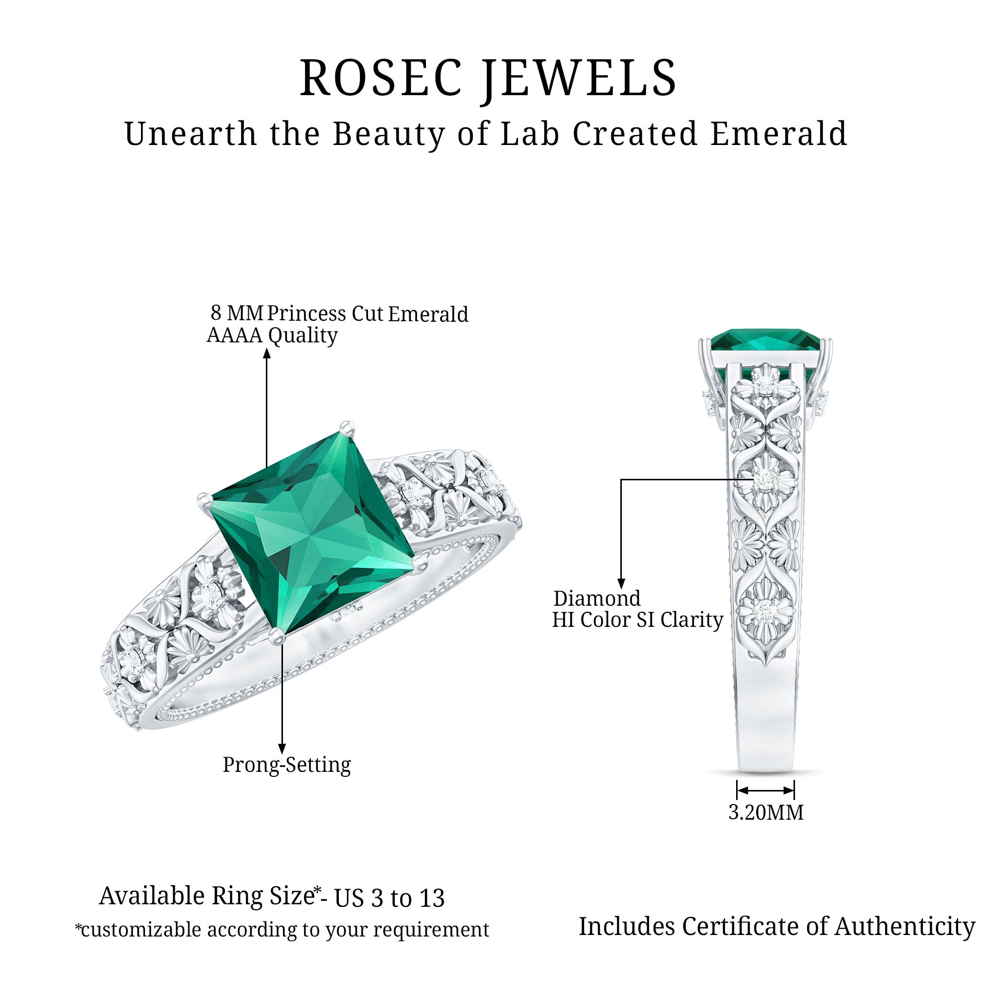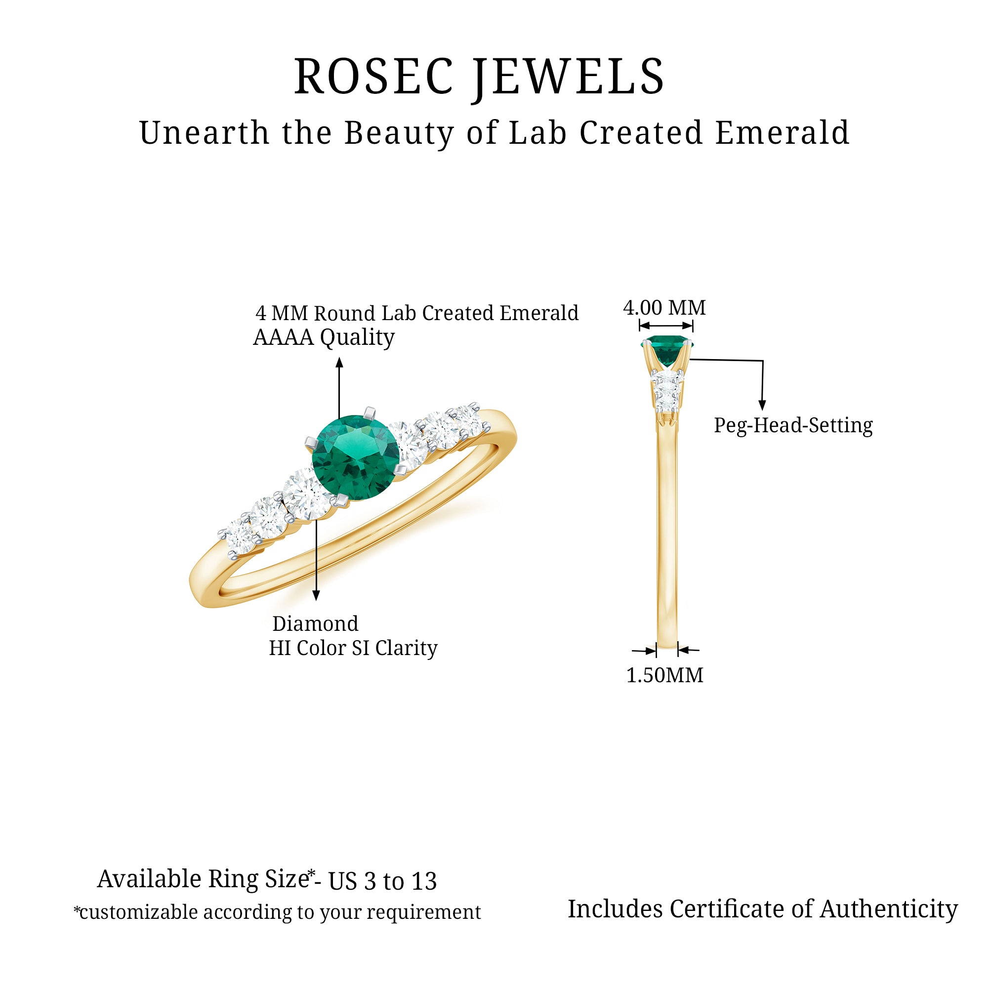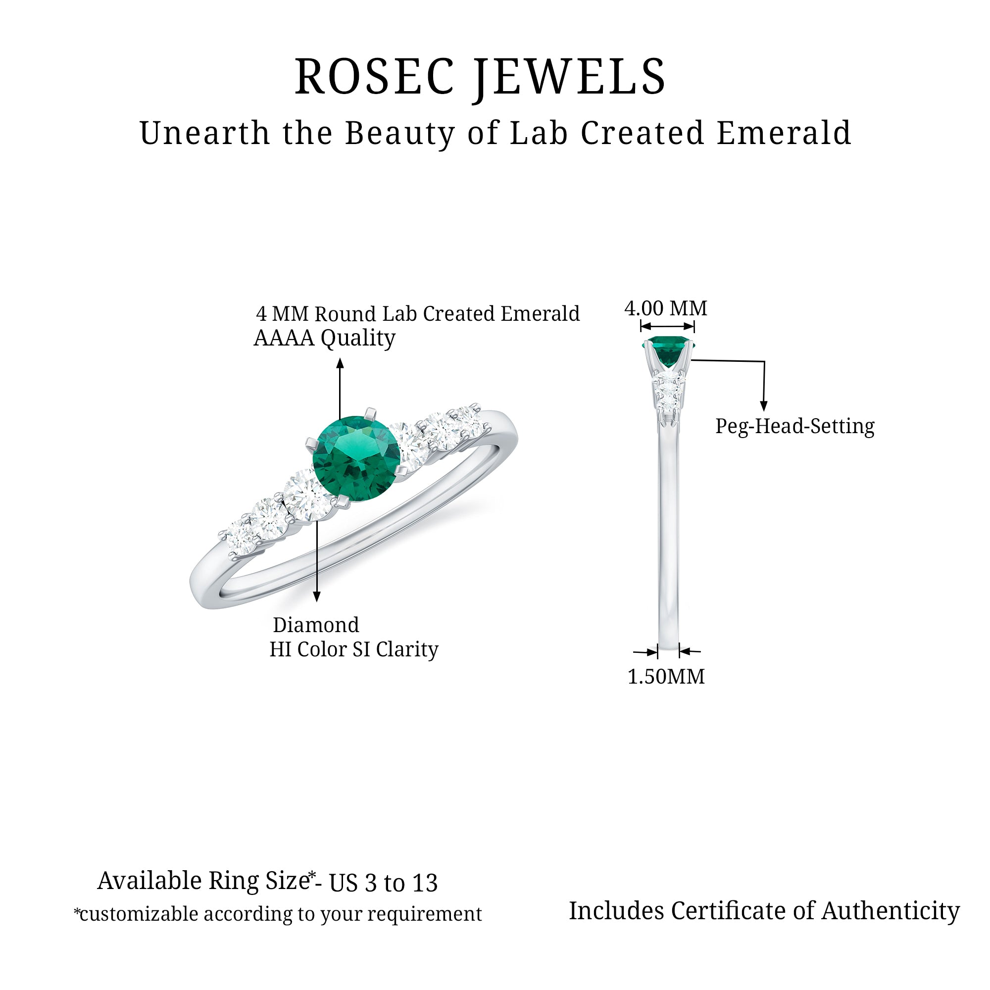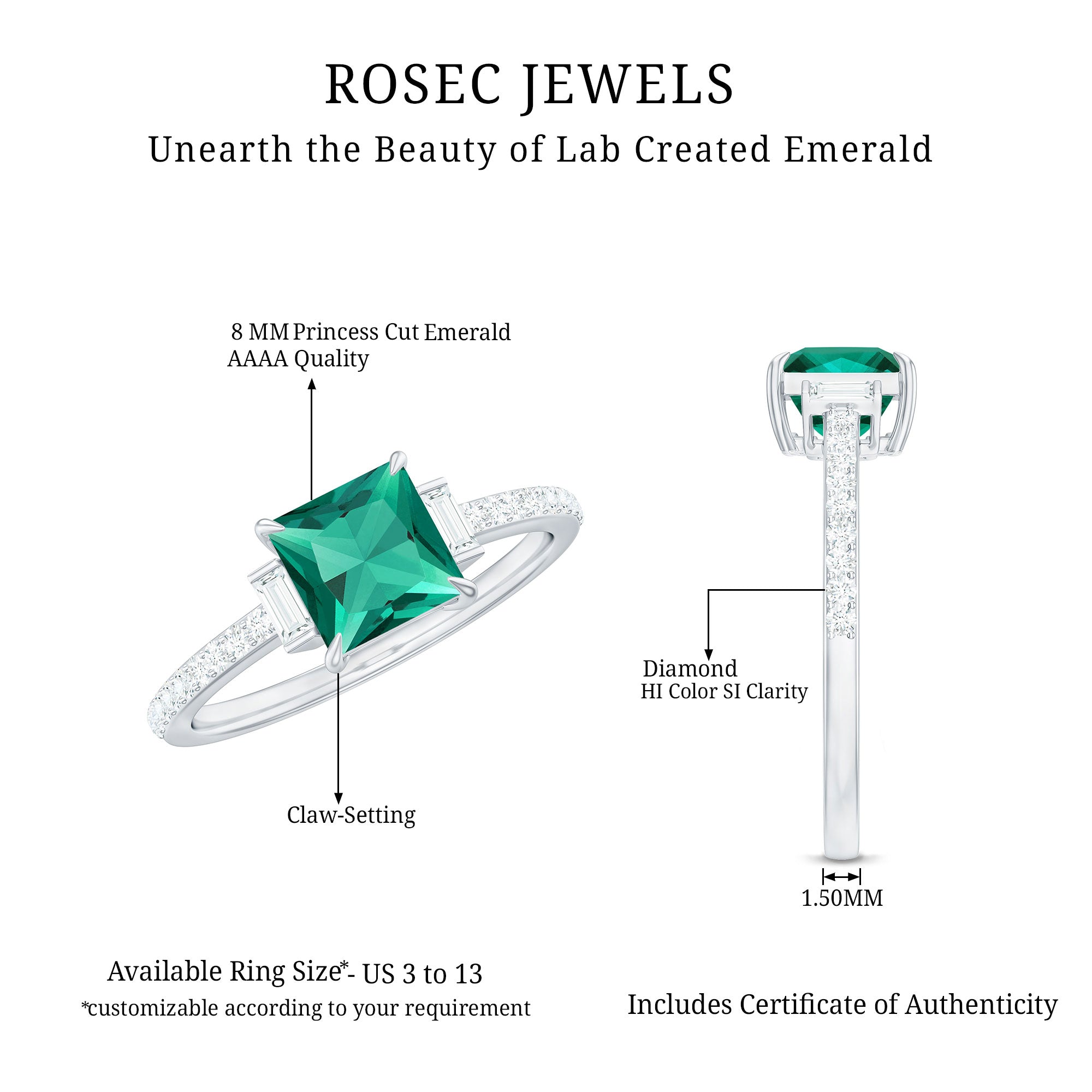At Rosec Jewels, every piece is crafted with a focus on lasting wear and refined design. For lab grown emerald rings, we prioritize setting security and balanced proportions across everyday and statement styles. We provide our own certificate of stone authenticity/details with purchase.