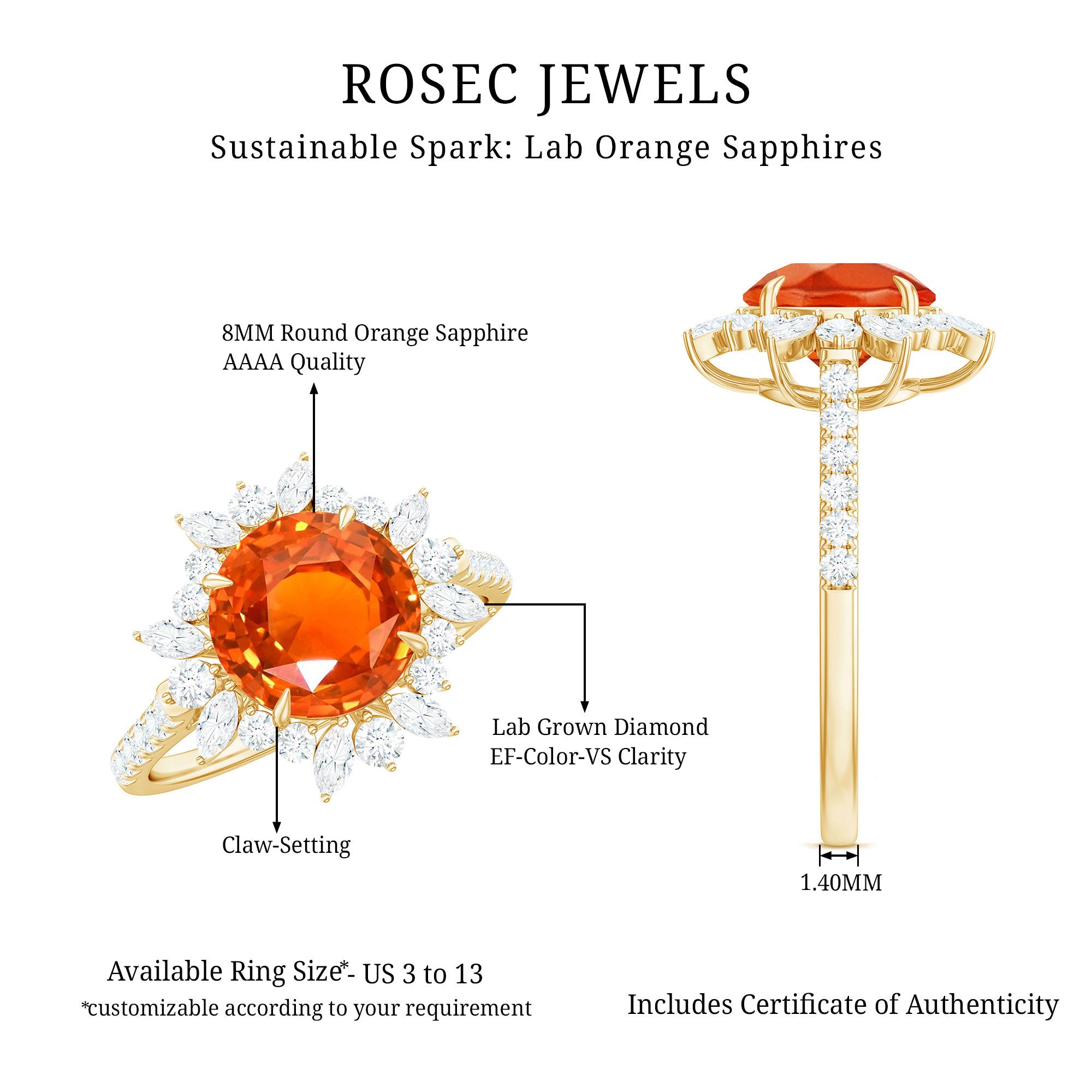Stylish Rings for Everyday Elegance: Lab-created orange sapphires are strong enough to withstand daily wear and tear. A lab created orange sapphire engagement ring is not only a vibrant and appealing choice, but it’s also a durable and practical one.