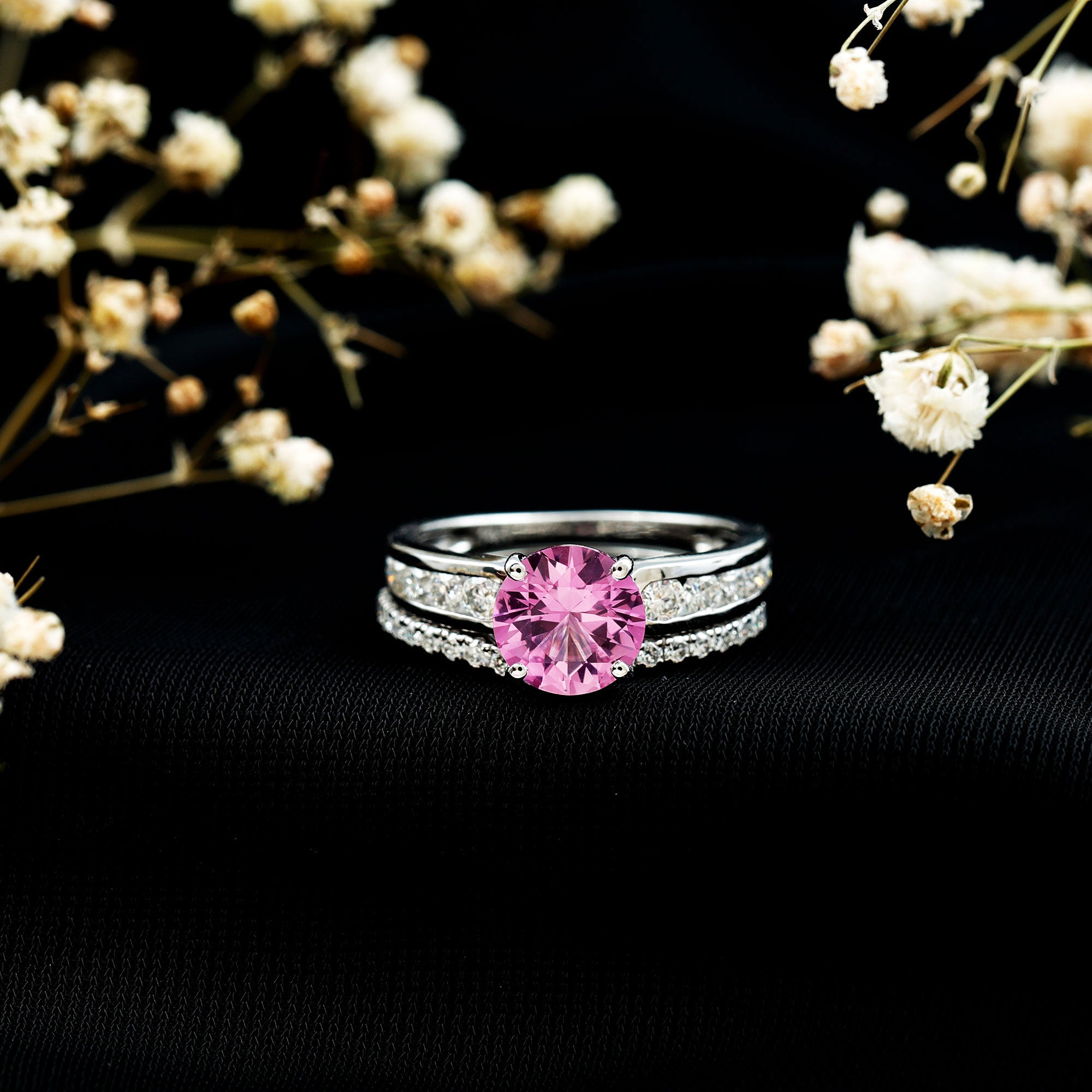 Creates extra sparkle and frames the pink center stone for a more defined, “statement” look.