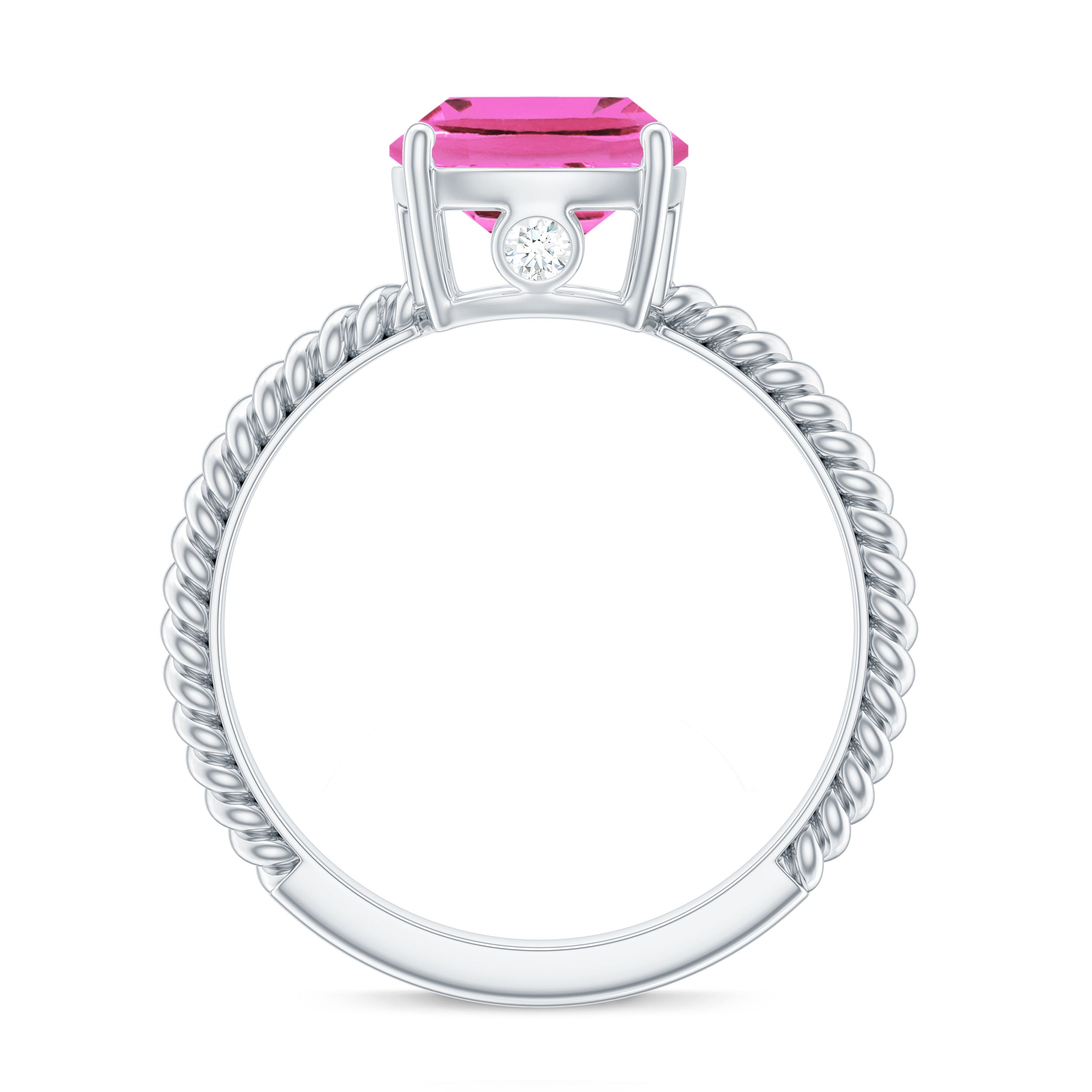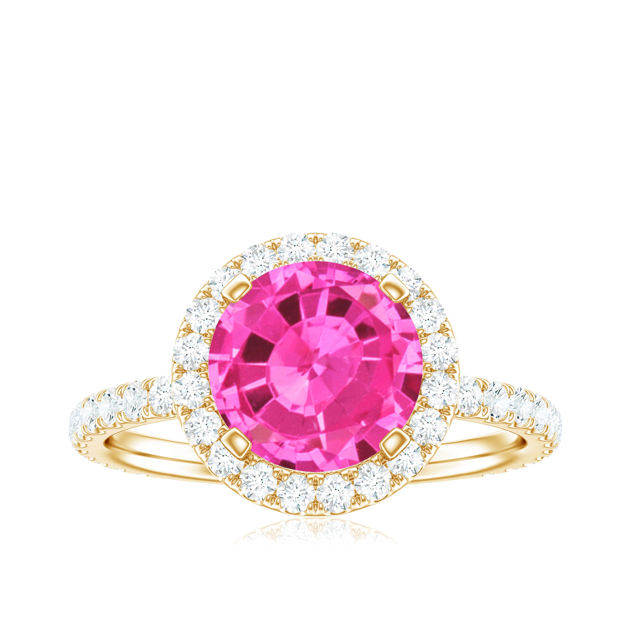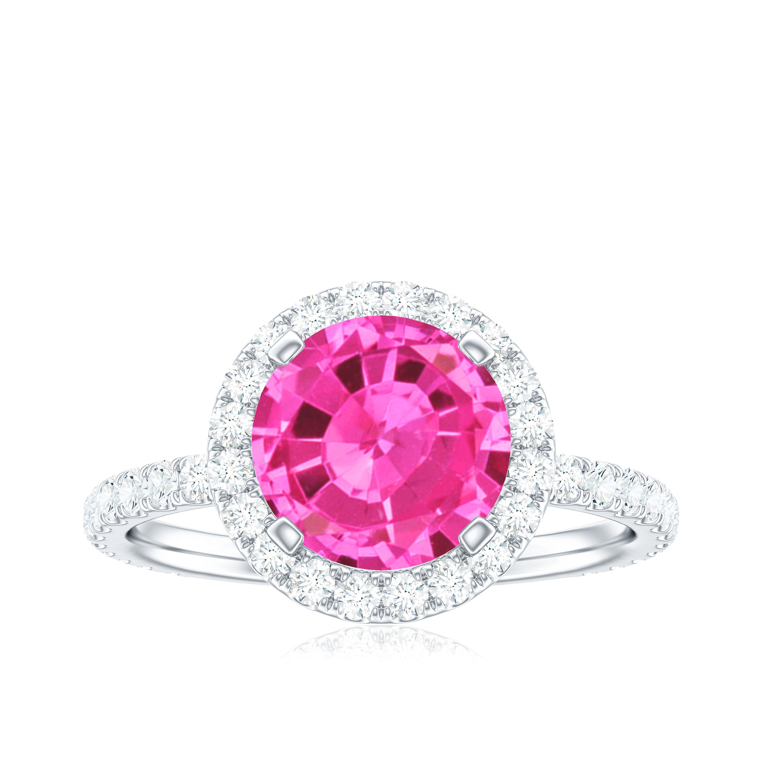 Popular settings for lab created pink sapphire rings are prong for maximum sparkle, bezel, channel, bar for maximum protection, and halo for endless brilliance.