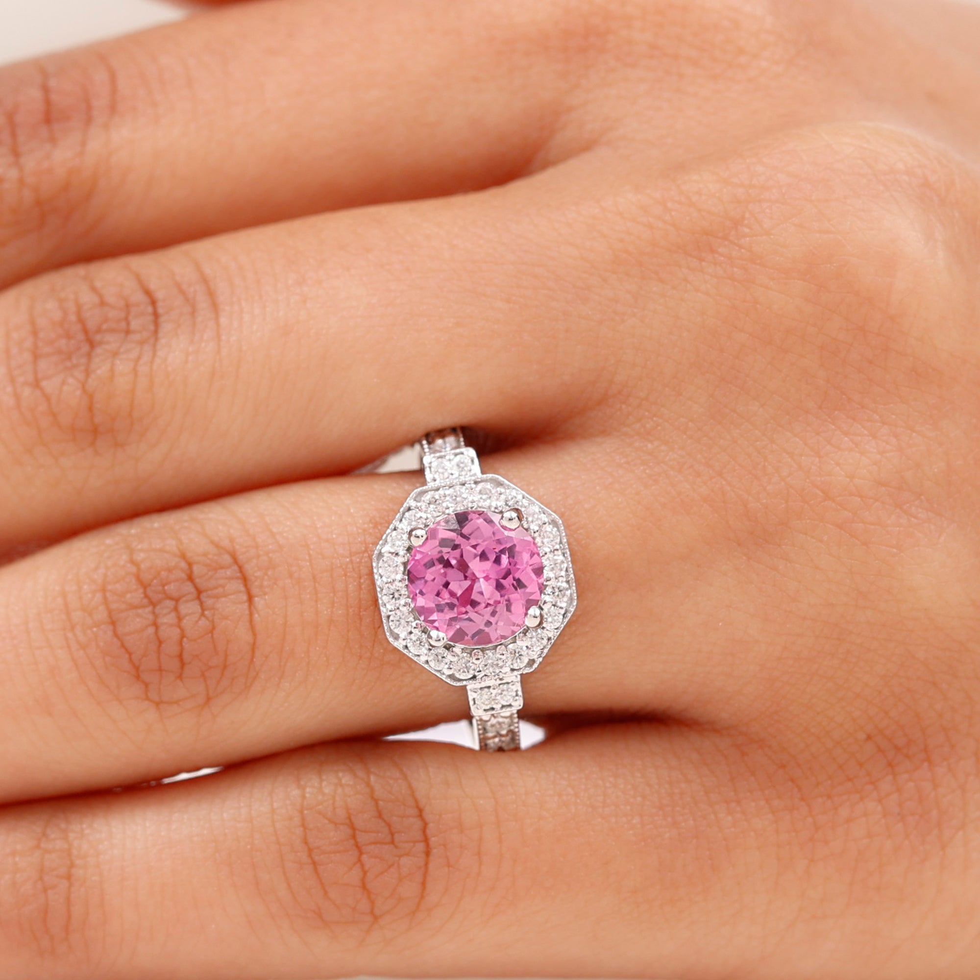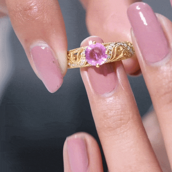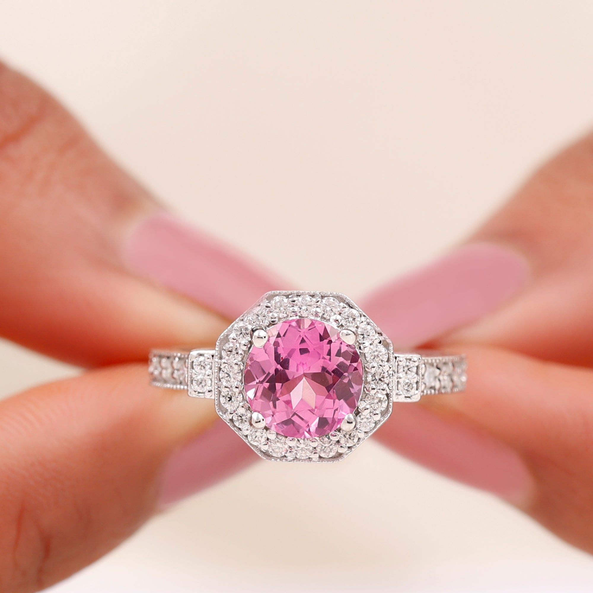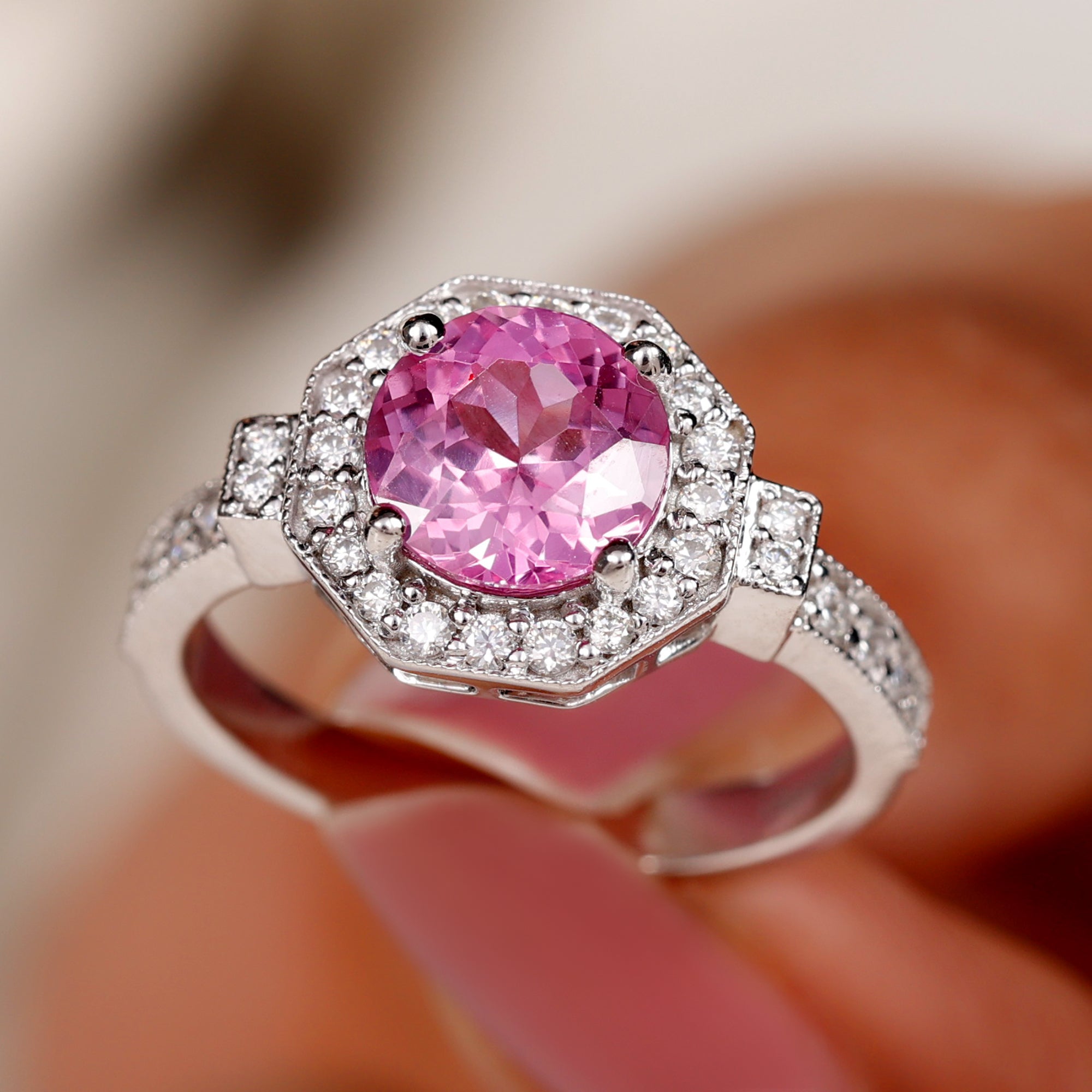 If you love classic ring pieces with a stylish touch then you must check our vintage inspired lab created pink sapphire rings in solitaire and halo styles. Different gemstone shapes and metal settings give each piece a unique story to tell.