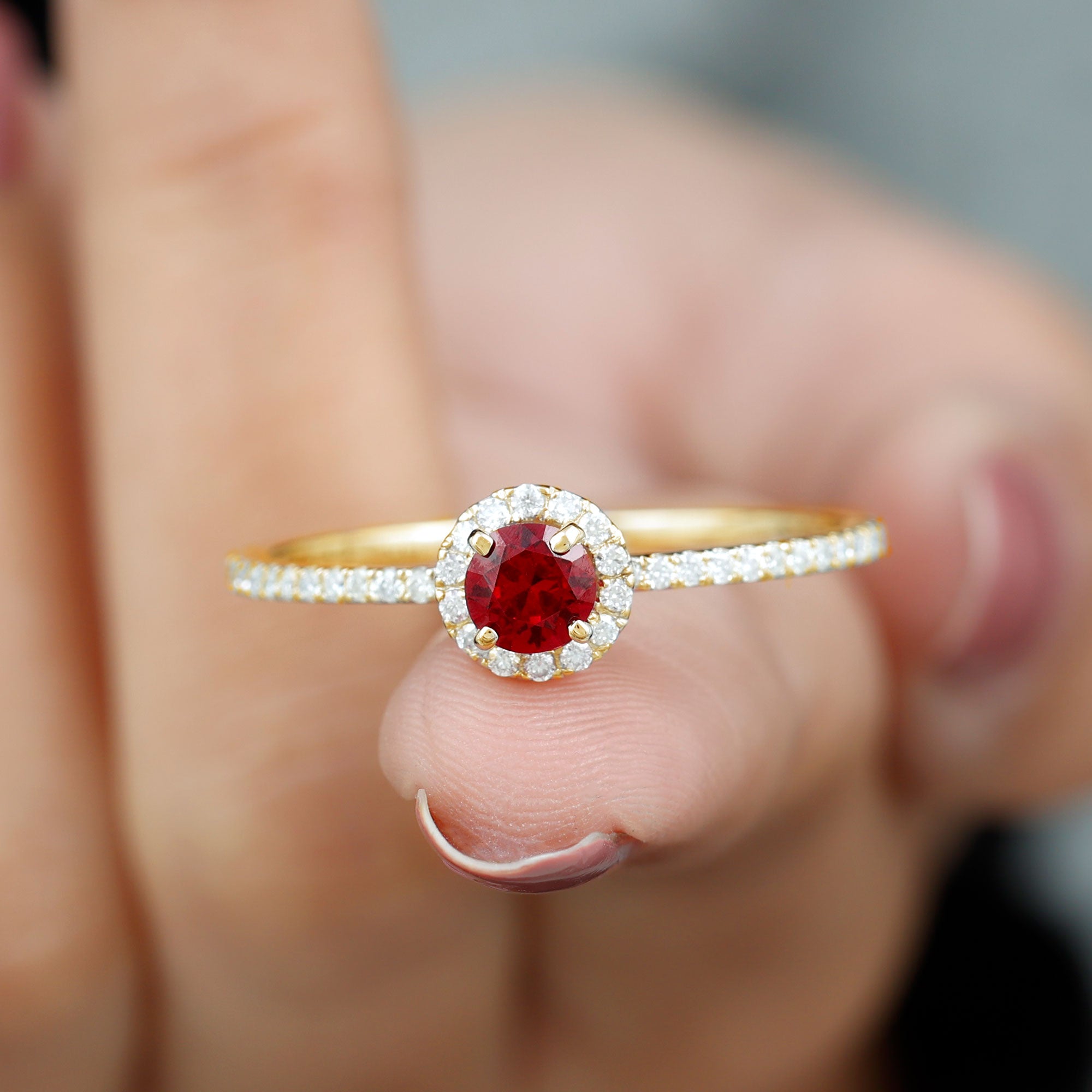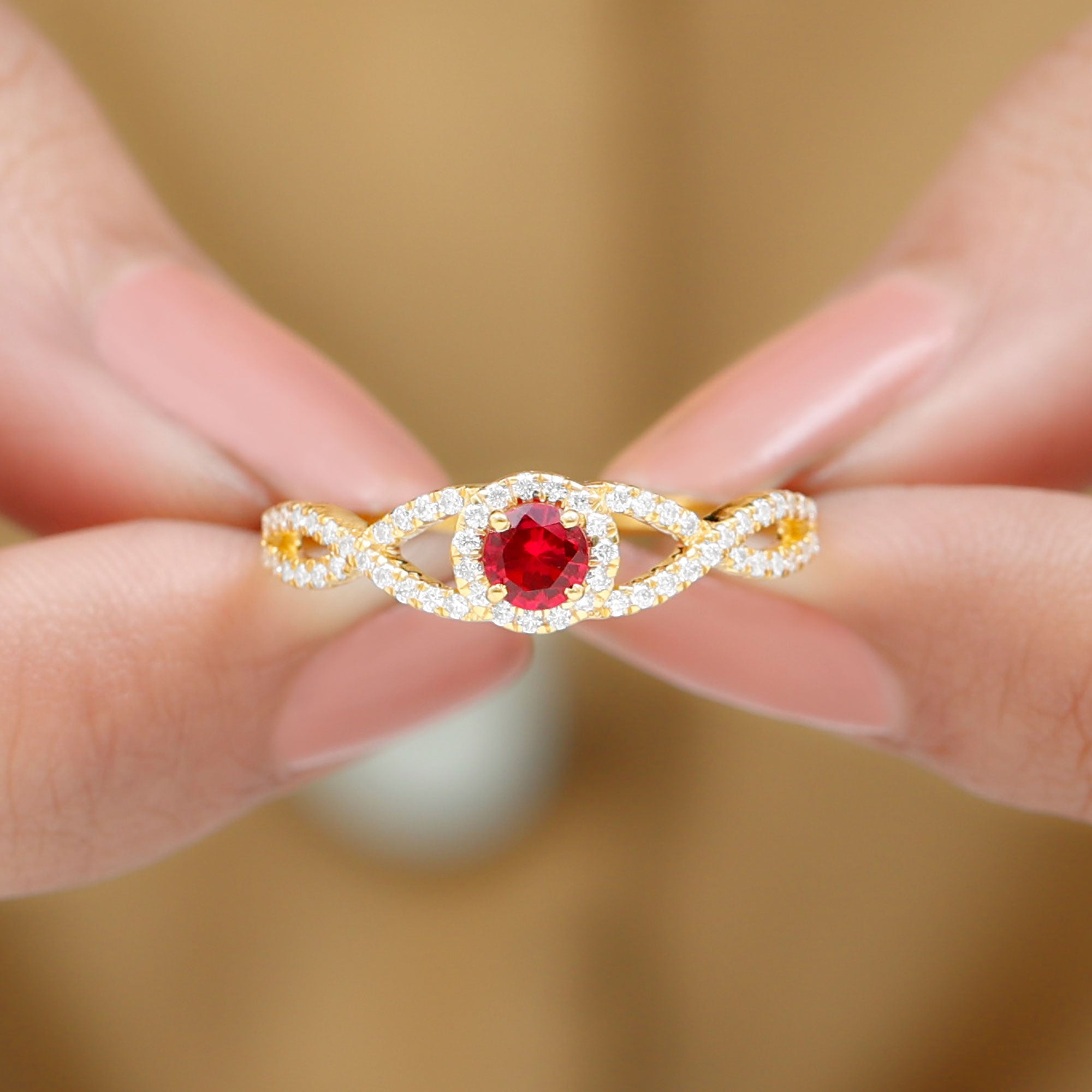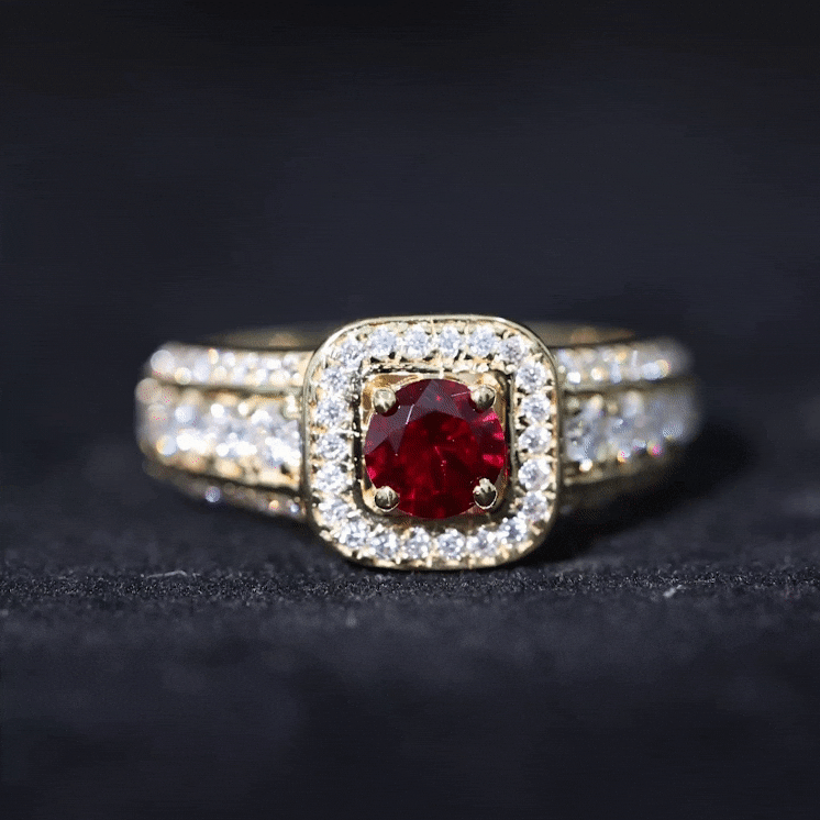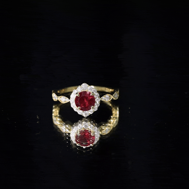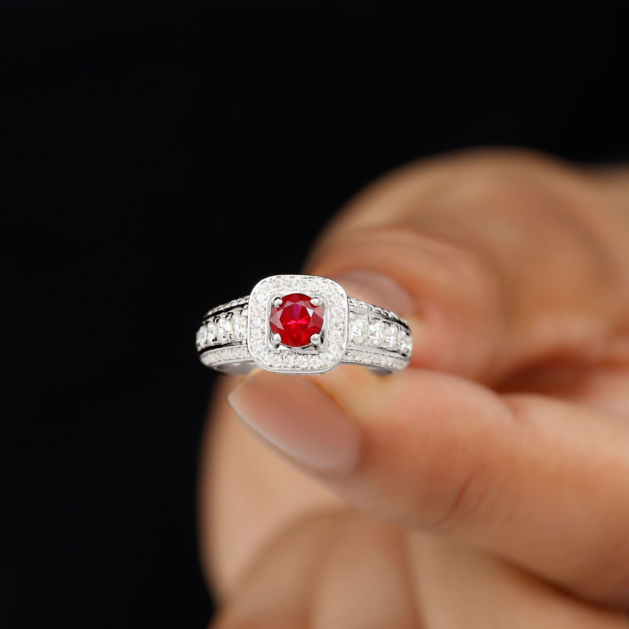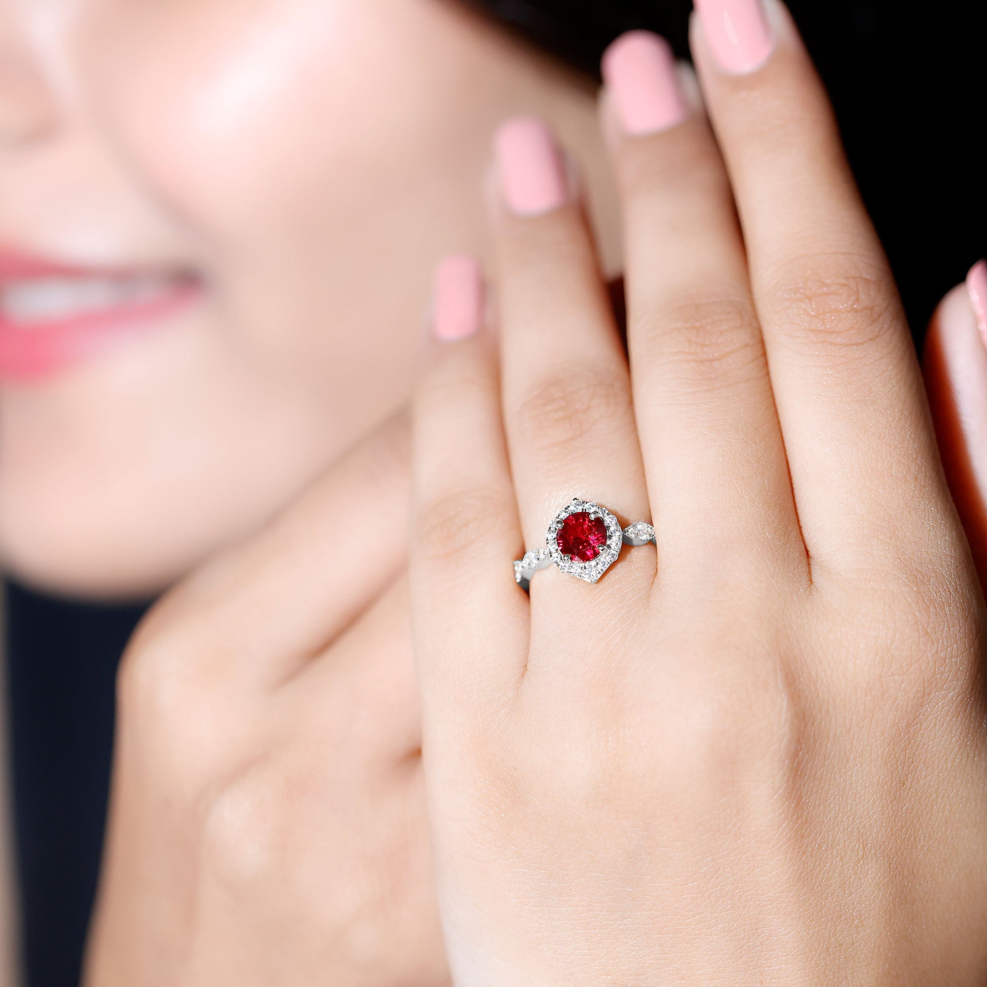 Halo Ruby Rings: A lab ruby surrounded by a circle of smaller diamonds or other colored gemstones for adding sparkle and brilliance. The halo makes the ruby gemstone stone appear larger and dazzling in a lab created ruby and diamond ring.