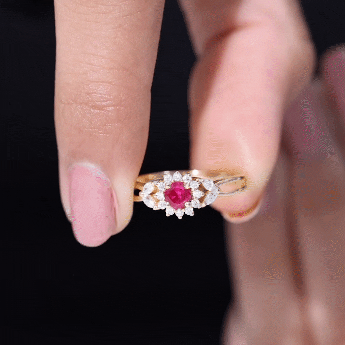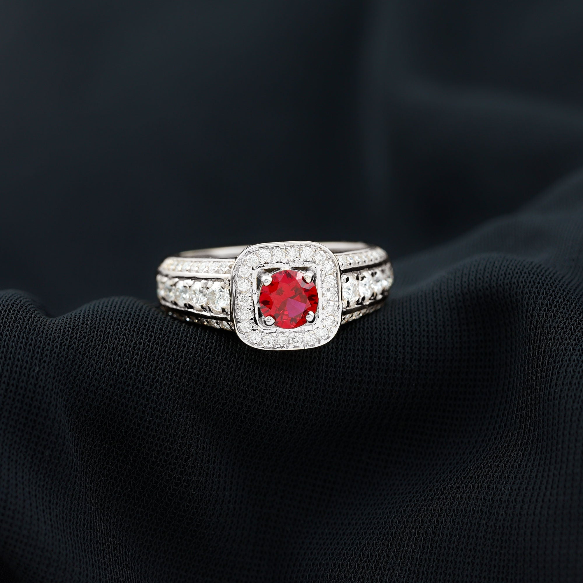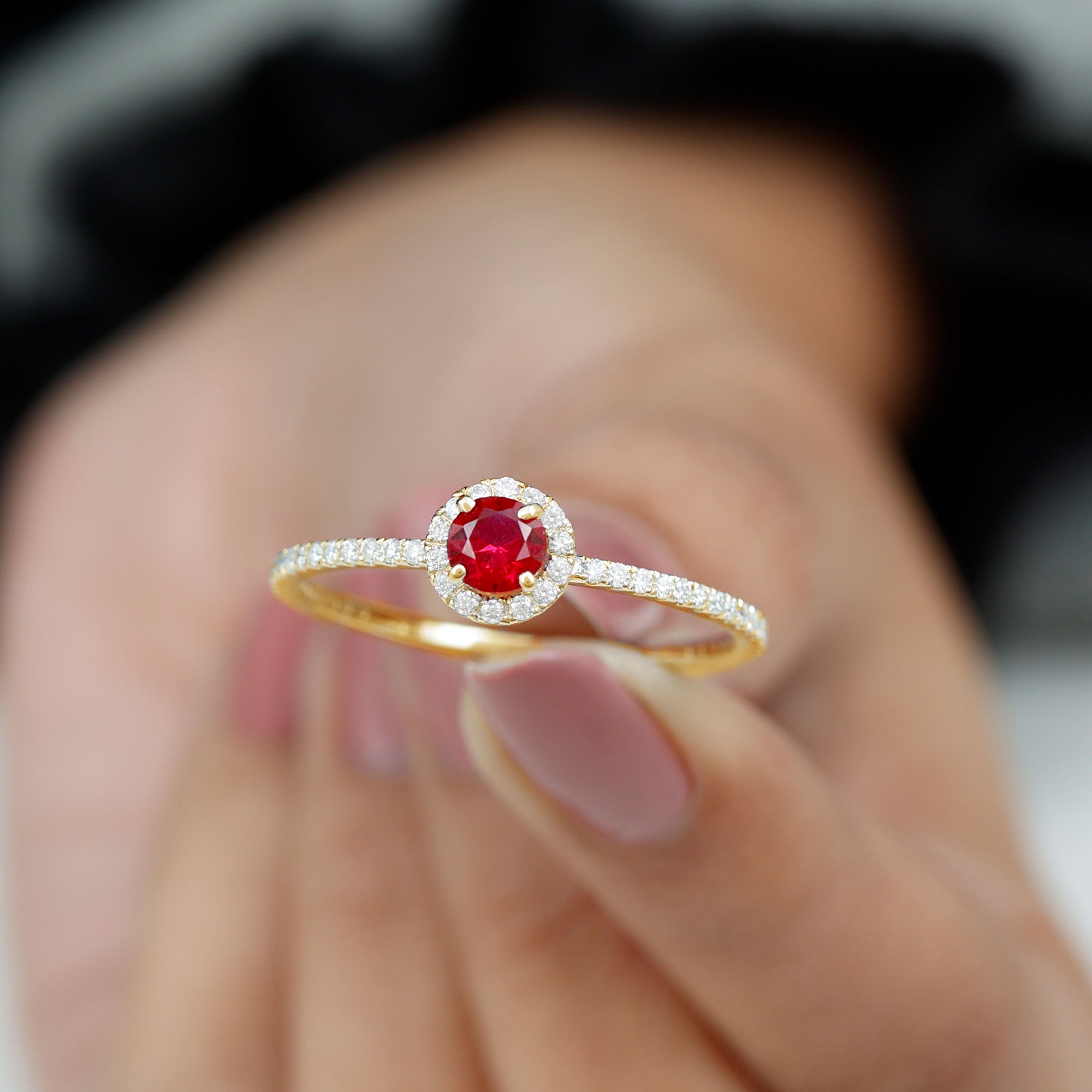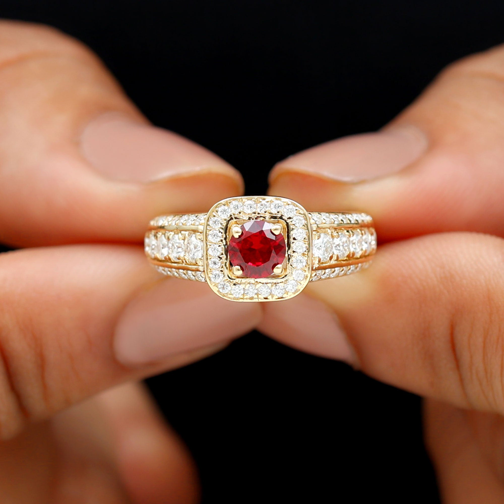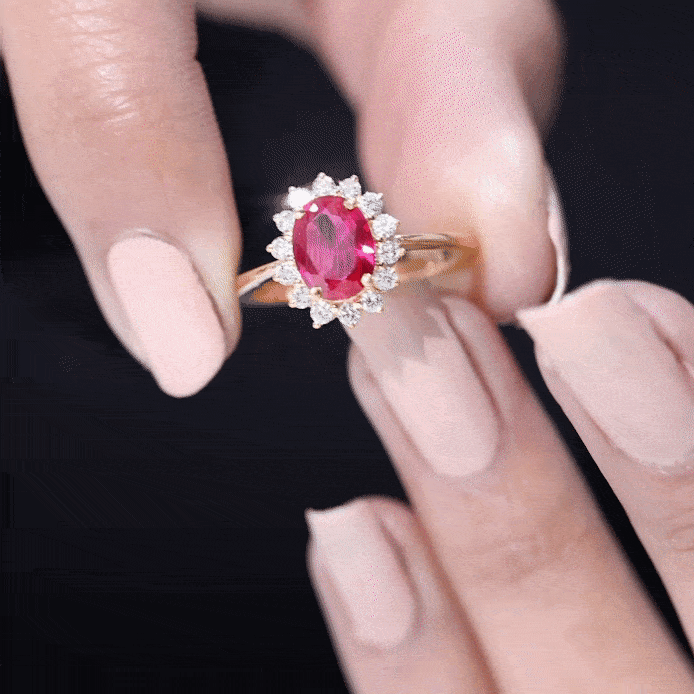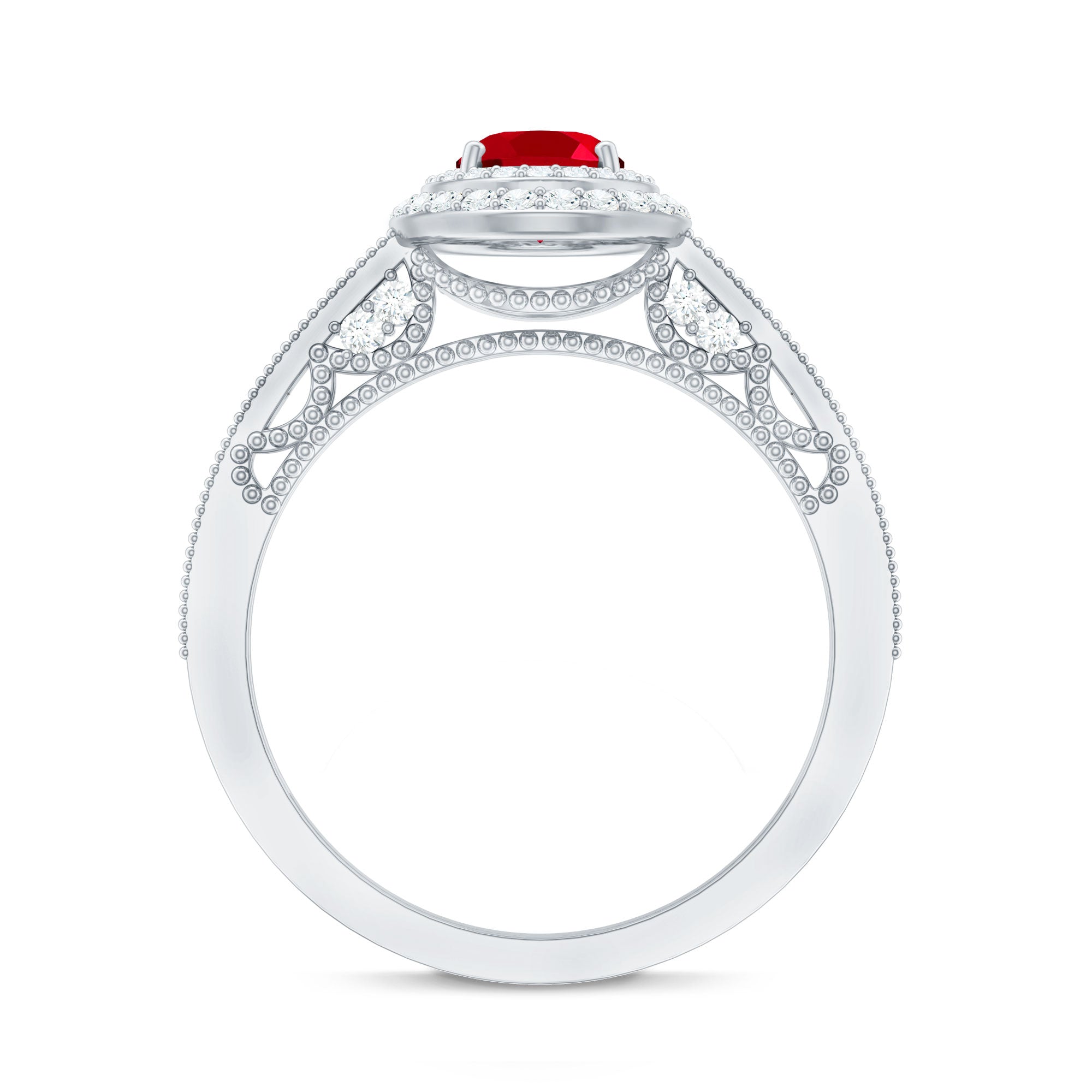 Halo Ruby Rings: A lab ruby surrounded by a circle of smaller diamonds or other colored gemstones for adding sparkle and brilliance. The halo makes the ruby gemstone stone appear larger and dazzling in a lab created ruby and diamond ring.