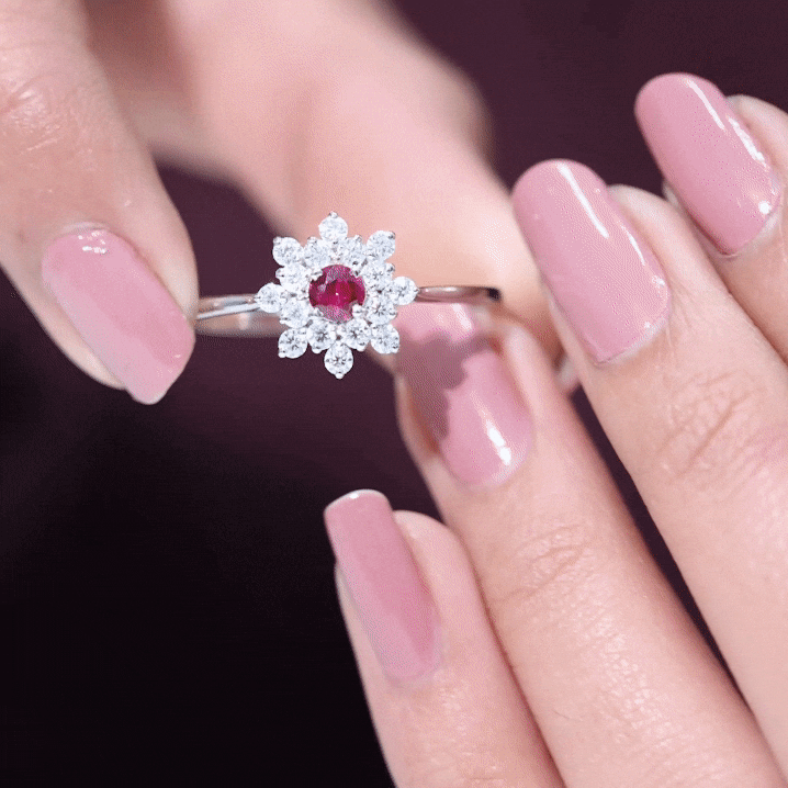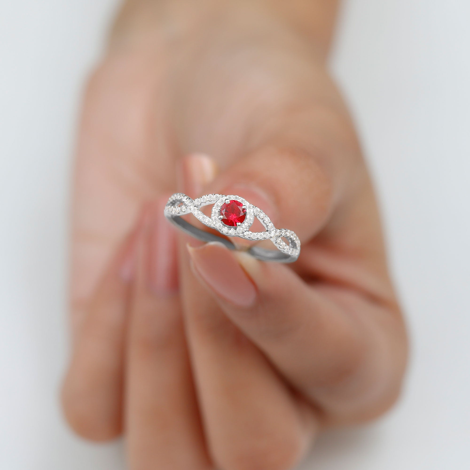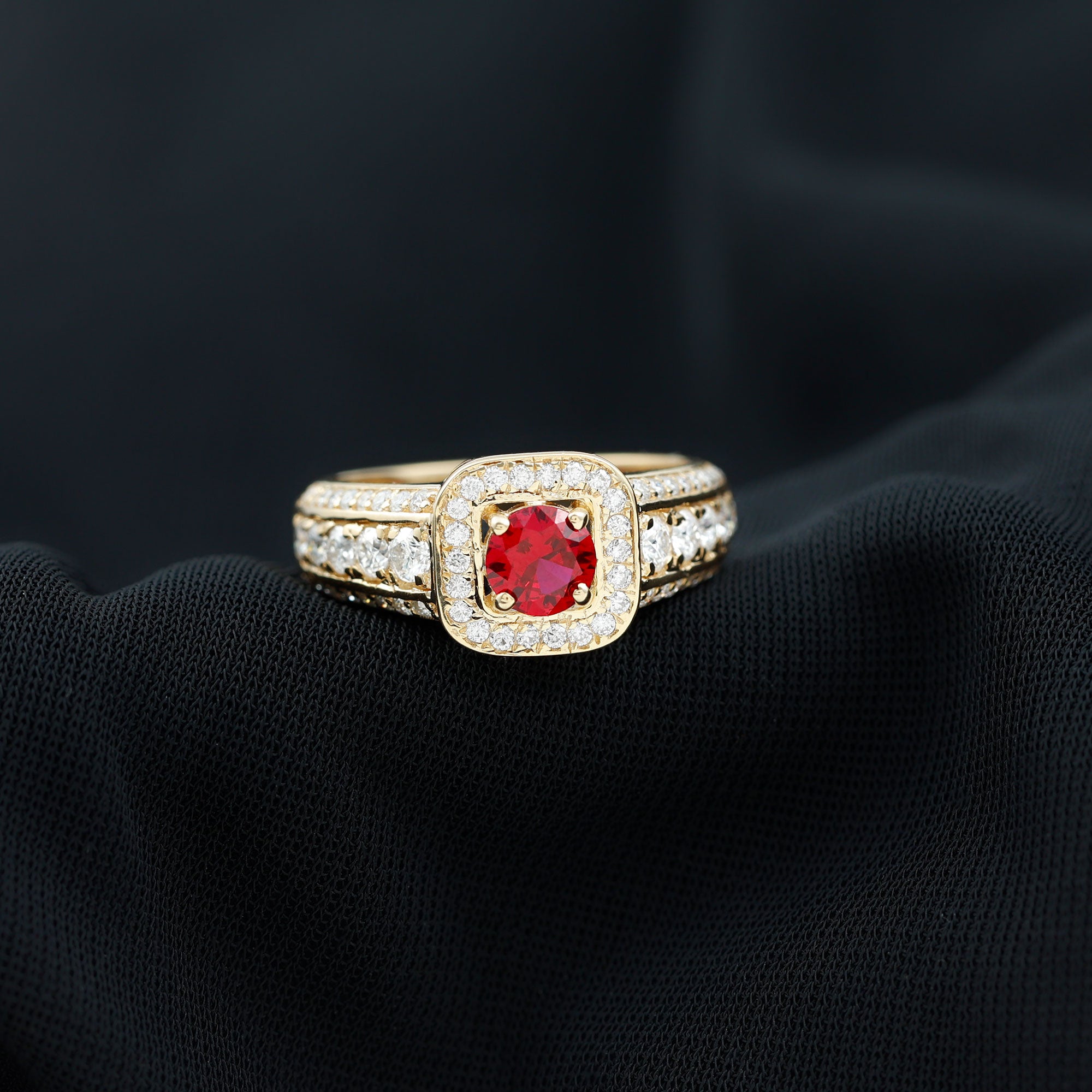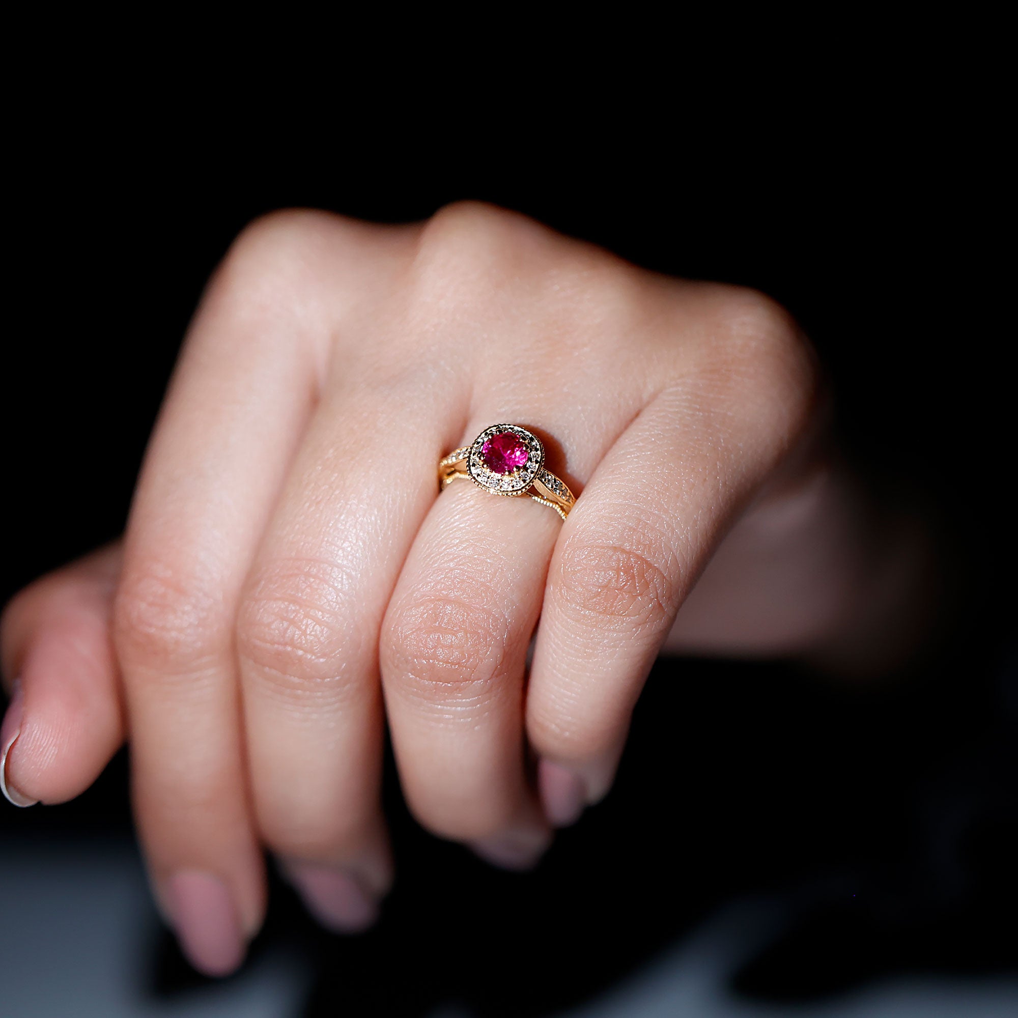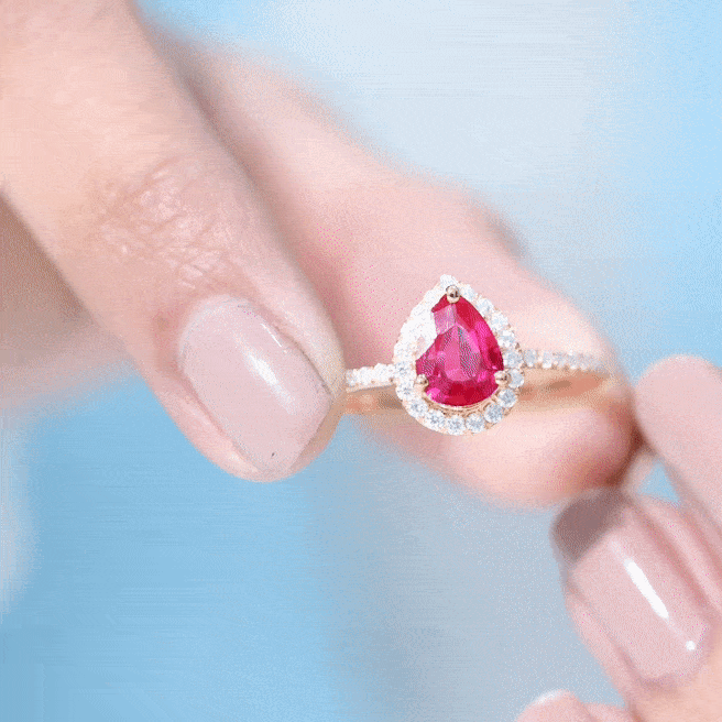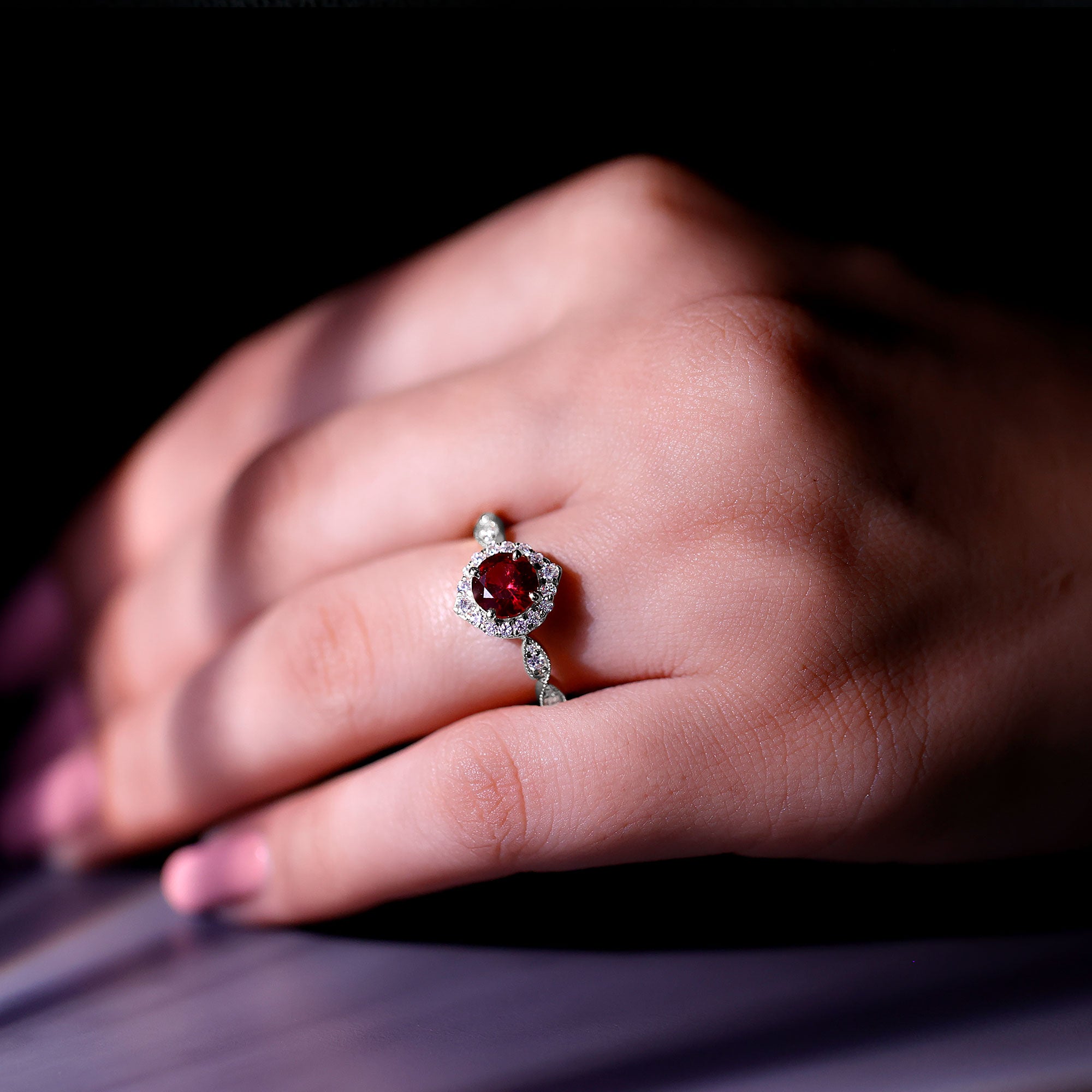 Halo Ruby Rings: A lab ruby surrounded by a circle of smaller diamonds or other colored gemstones for adding sparkle and brilliance. The halo makes the ruby gemstone stone appear larger and dazzling in a lab created ruby and diamond ring.