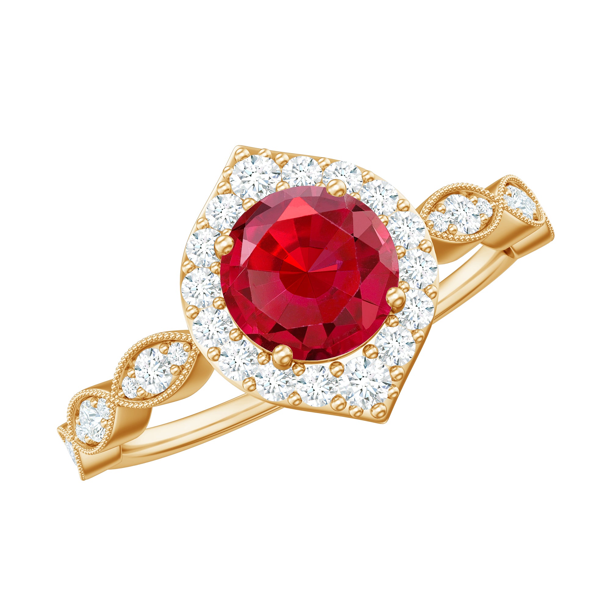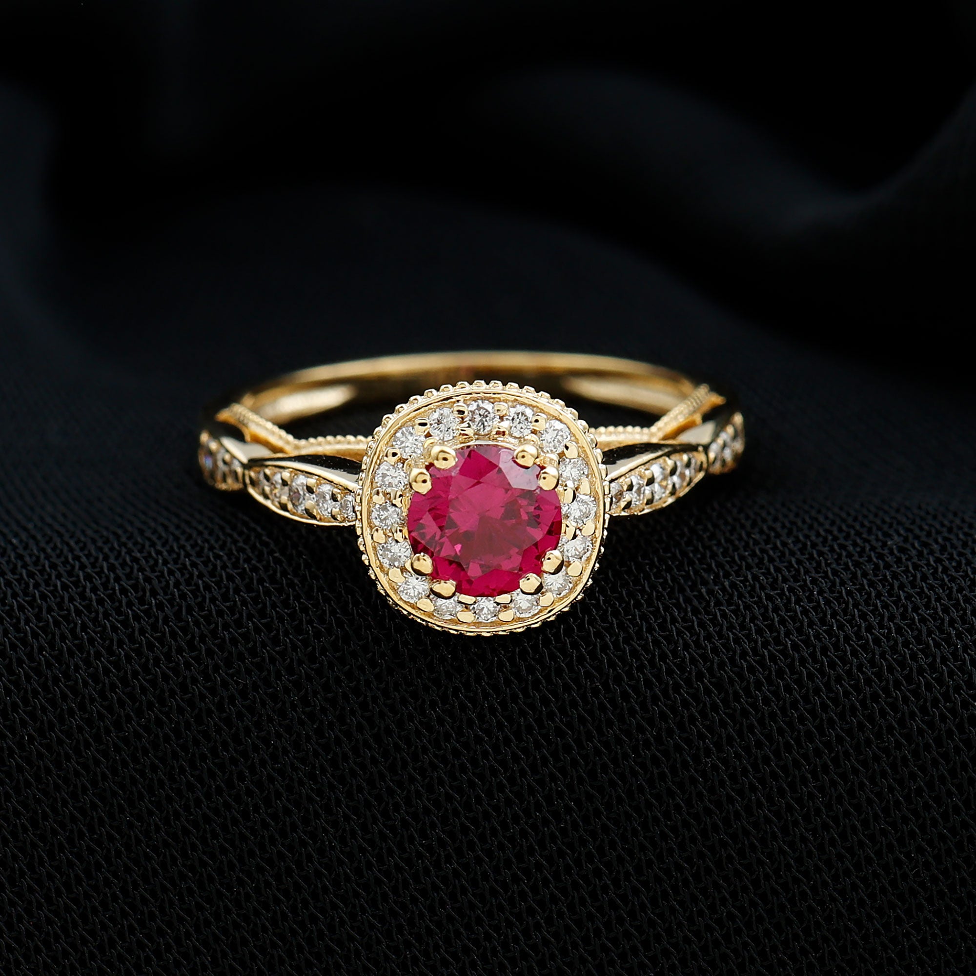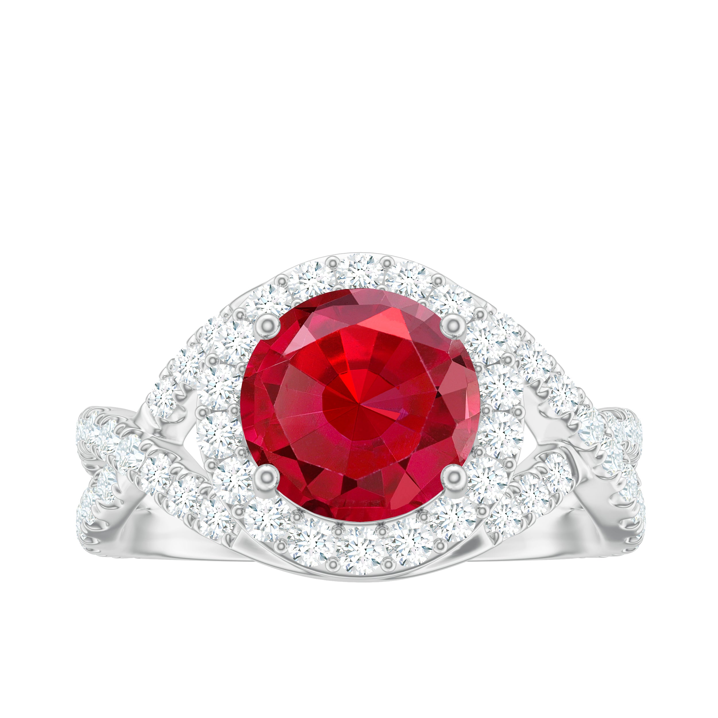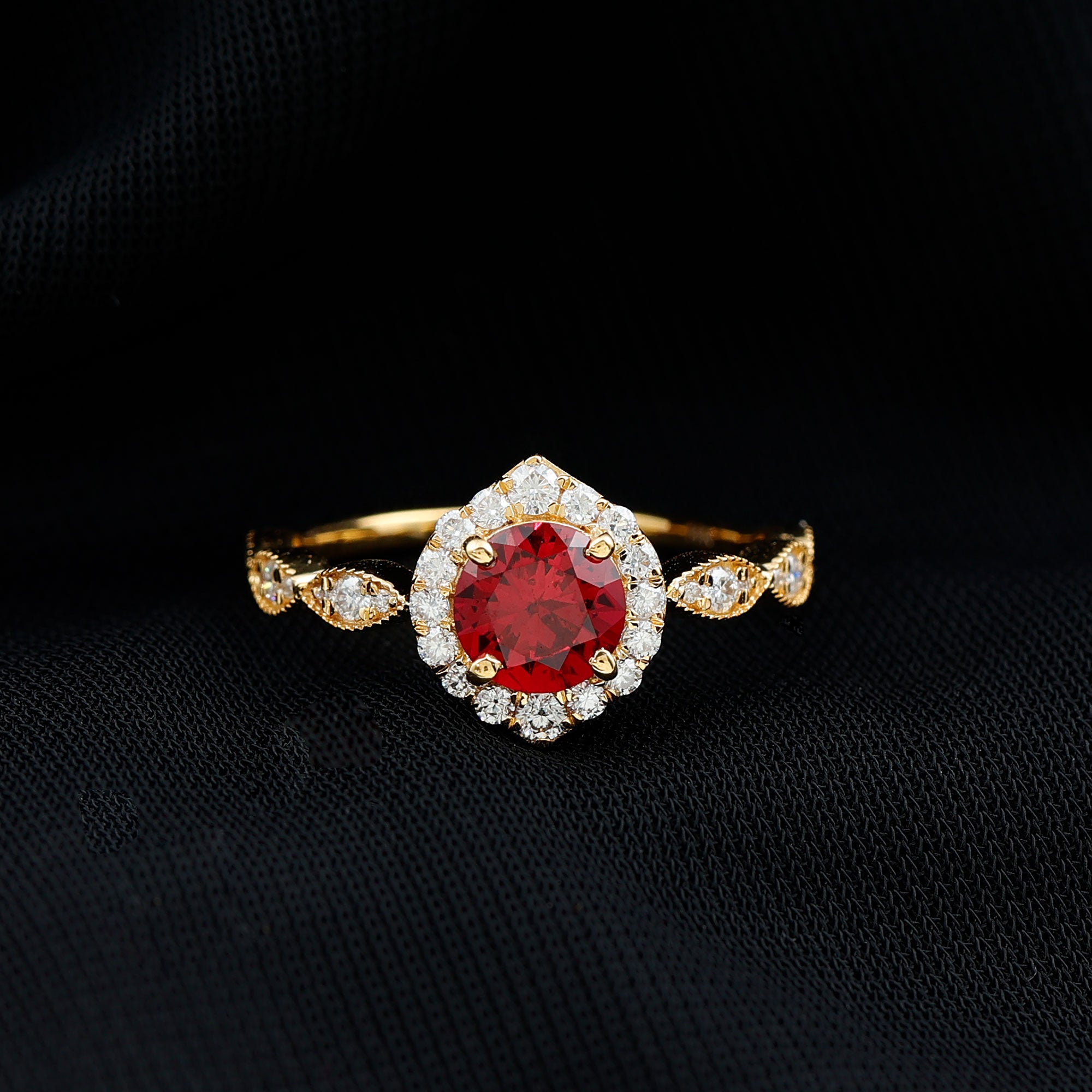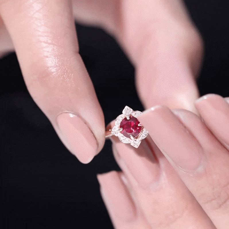 Halo Ruby Rings: A lab ruby surrounded by a circle of smaller diamonds or other colored gemstones for adding sparkle and brilliance. The halo makes the ruby gemstone stone appear larger and dazzling in a lab created ruby and diamond ring.