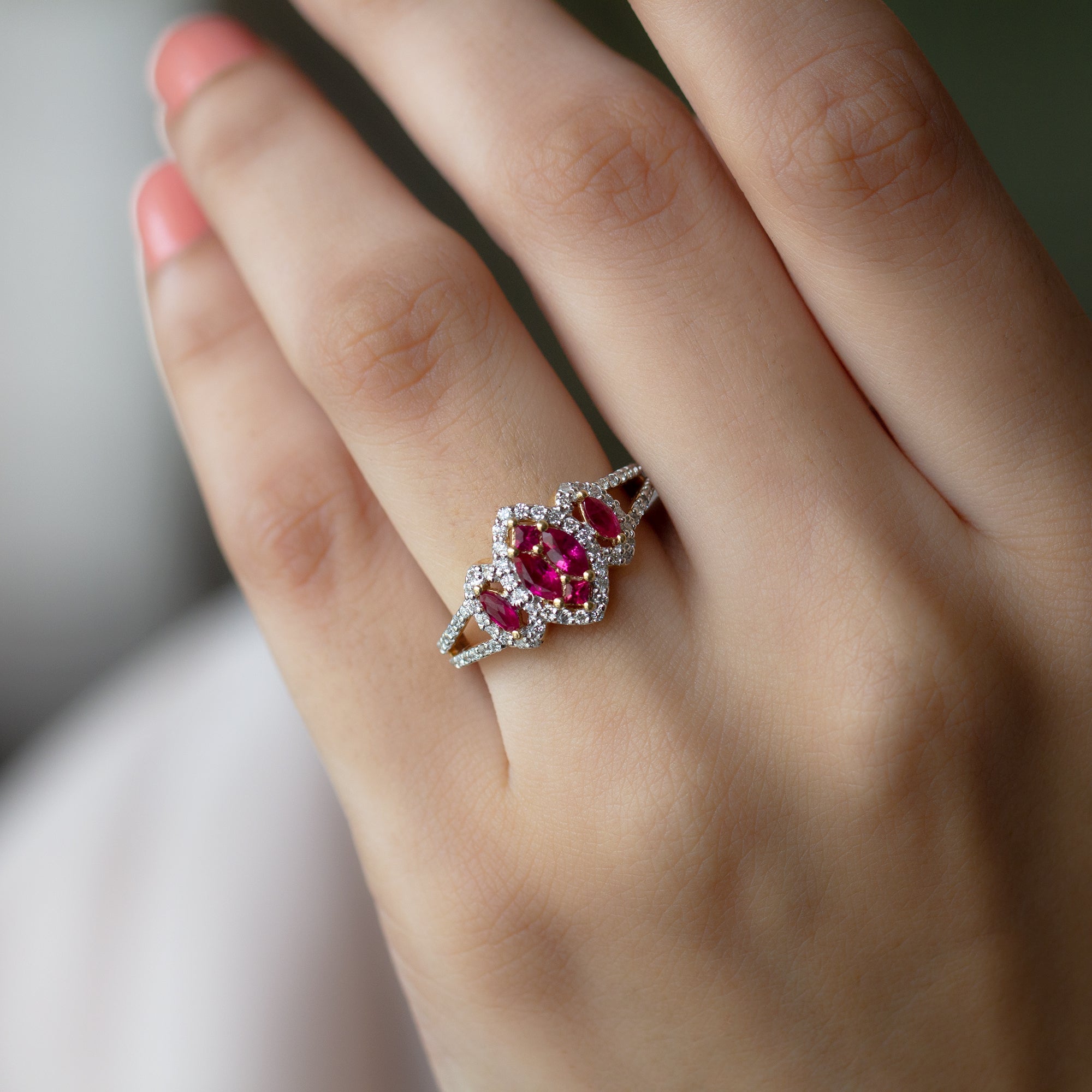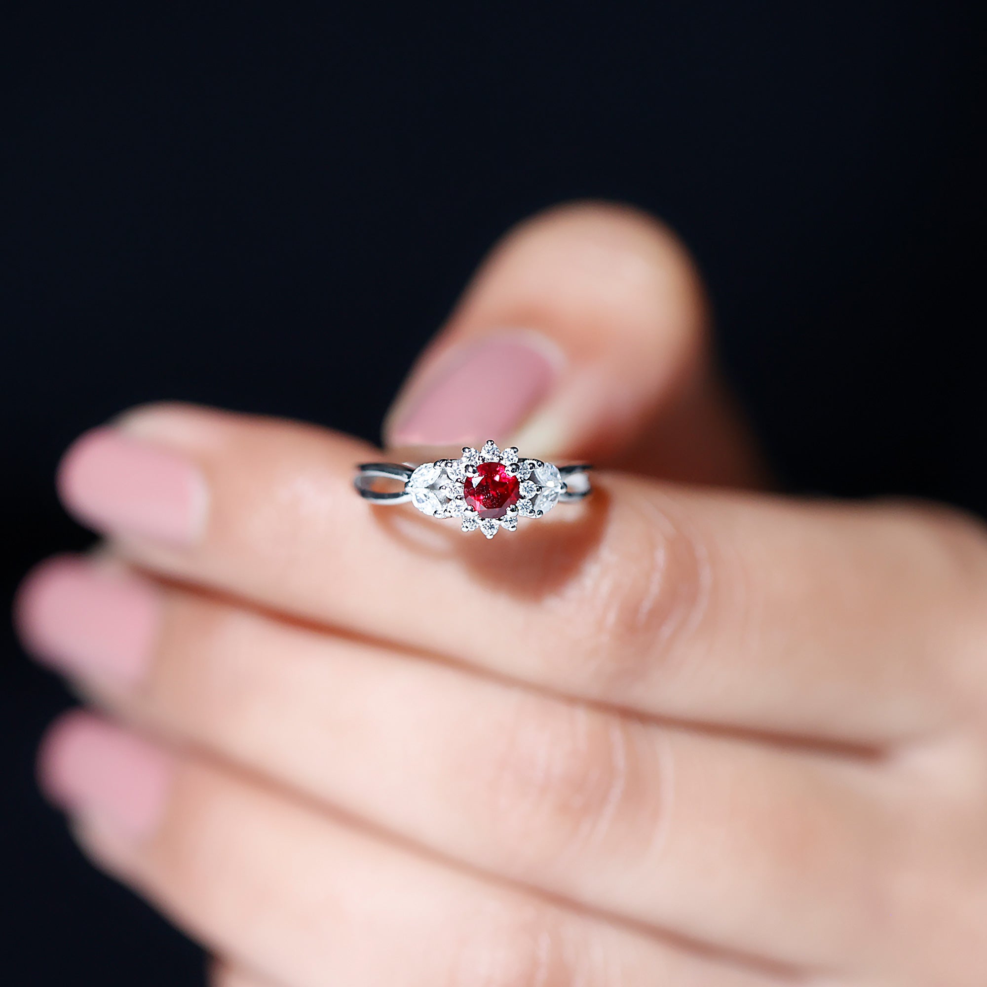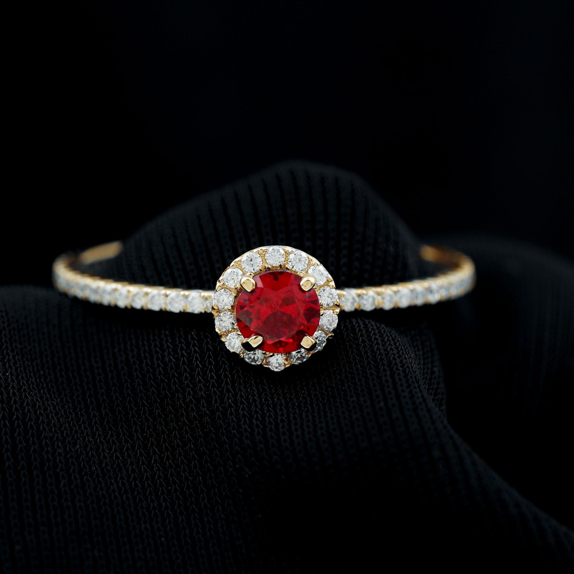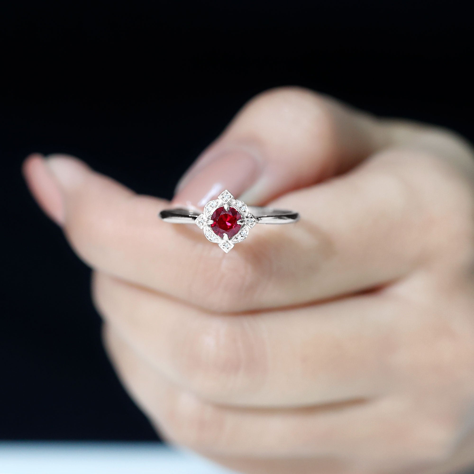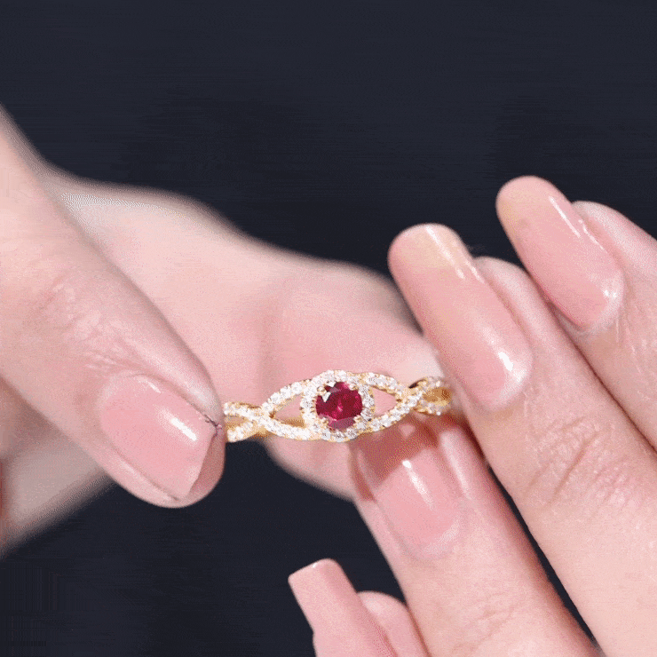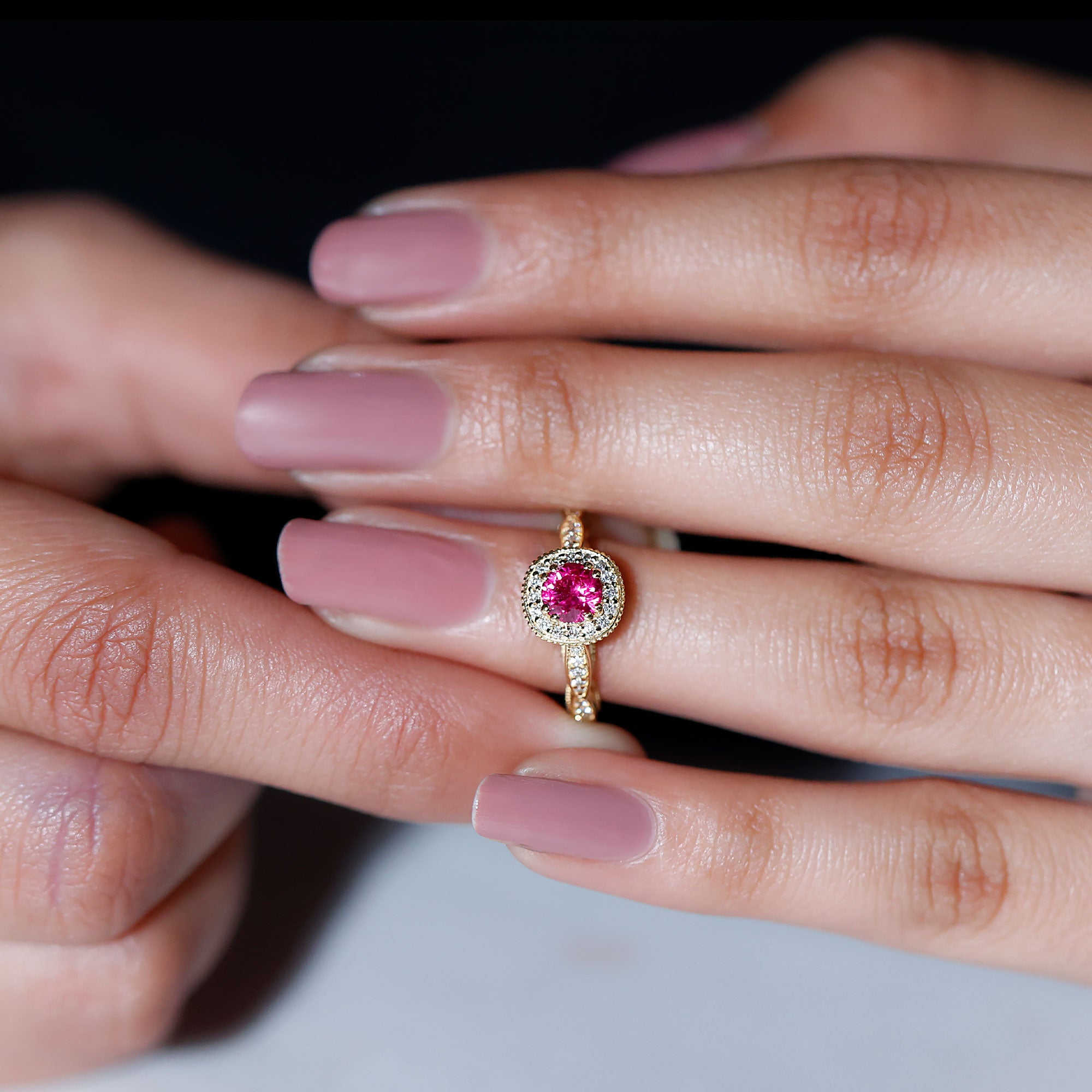 Halo Ruby Rings: A lab ruby surrounded by a circle of smaller diamonds or other colored gemstones for adding sparkle and brilliance. The halo makes the ruby gemstone stone appear larger and dazzling in a lab created ruby and diamond ring.