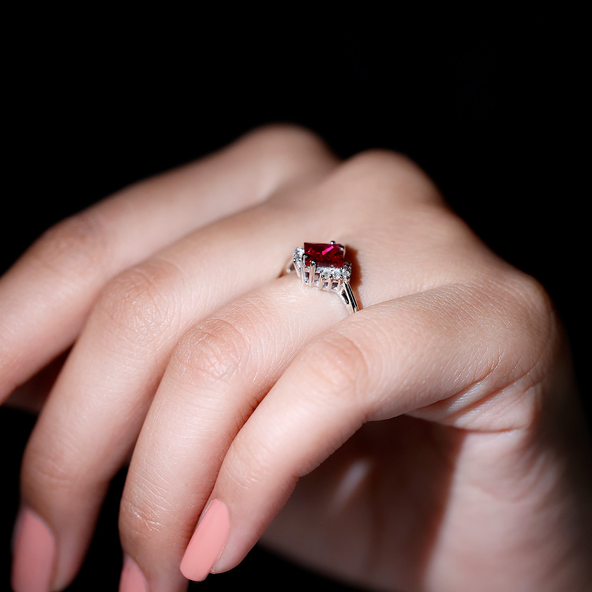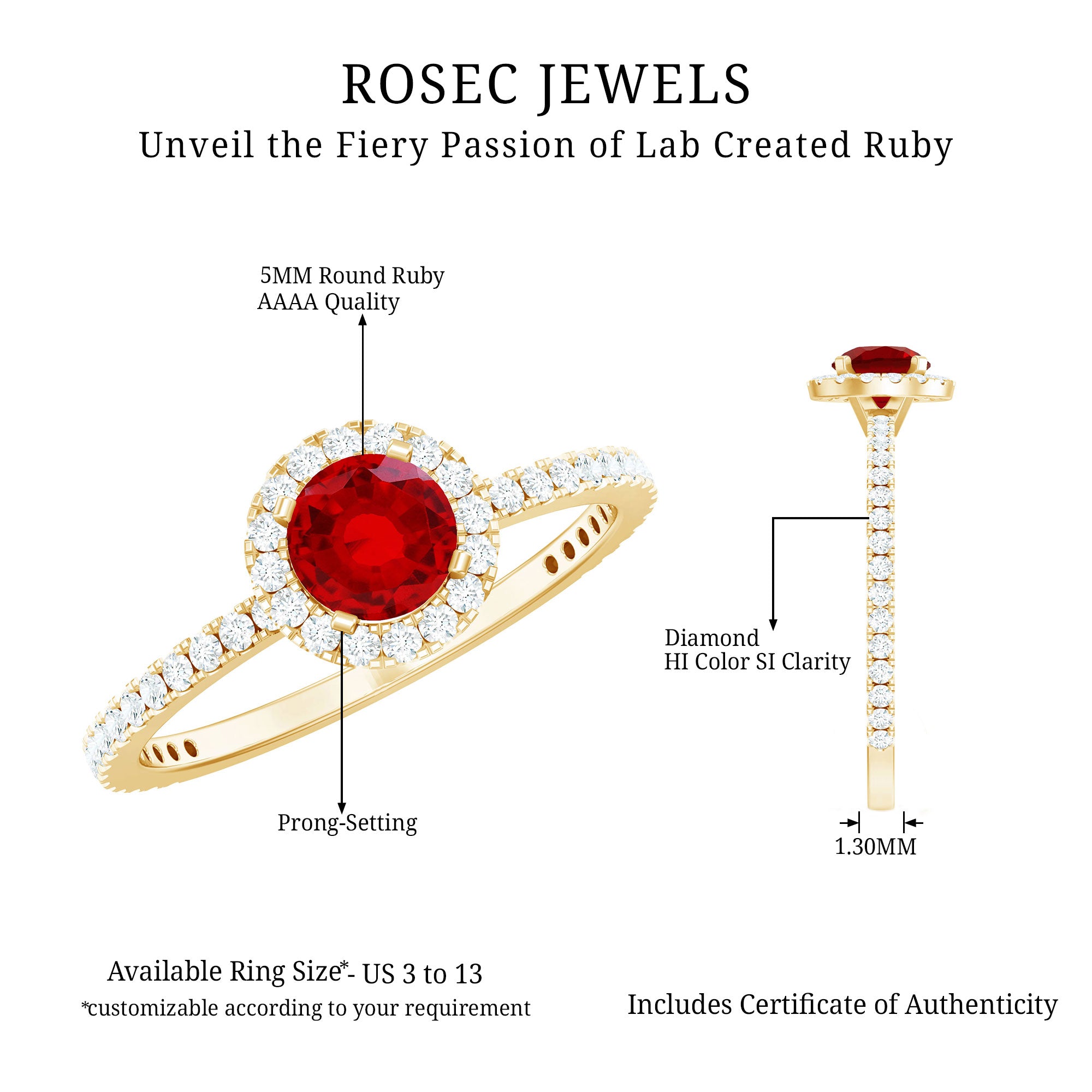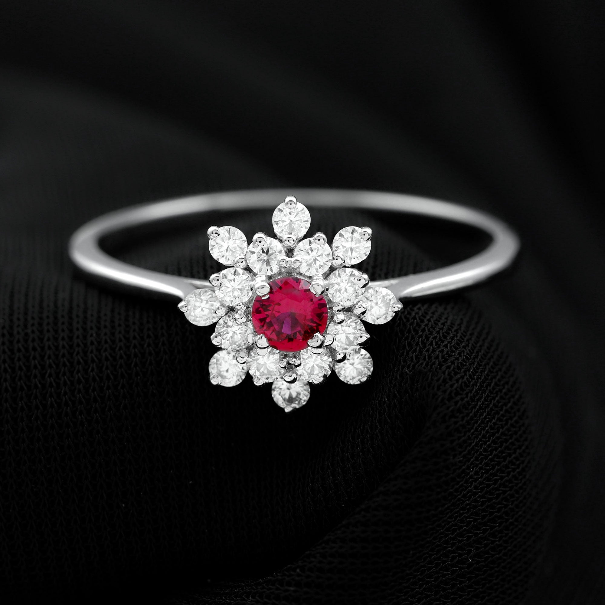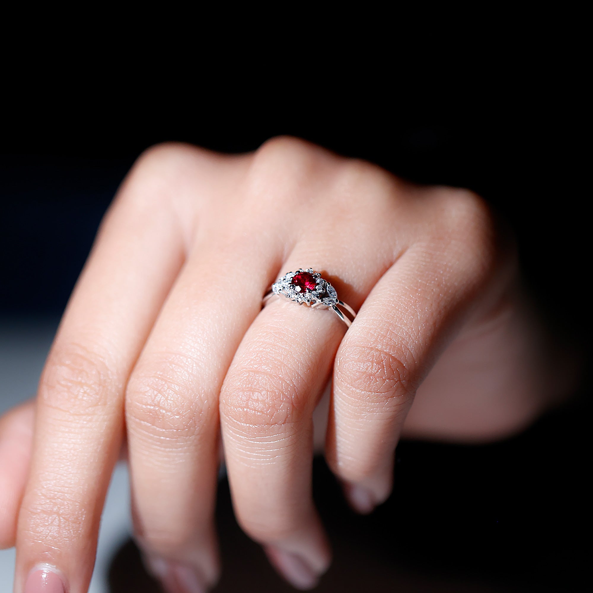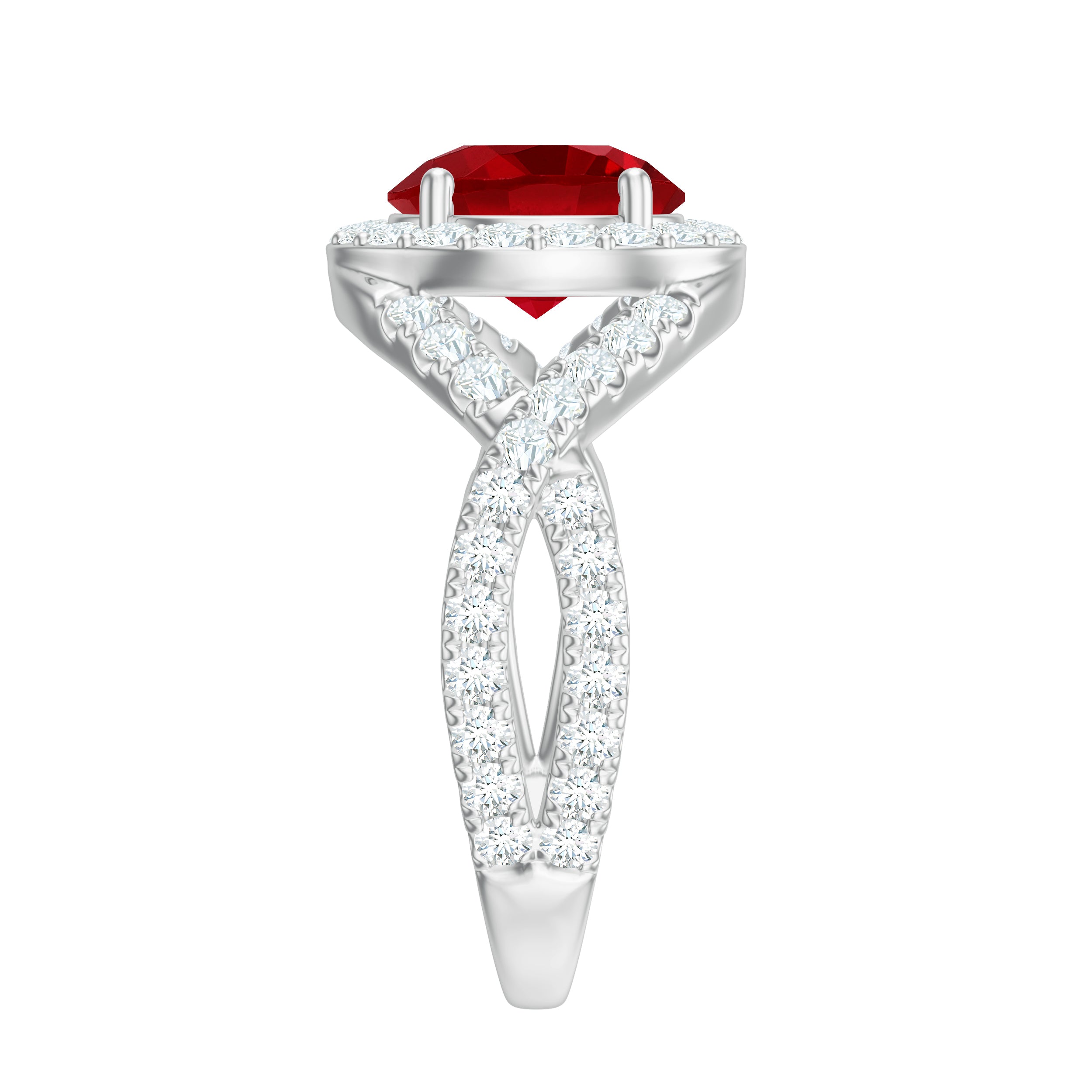 Halo Ruby Rings: A lab ruby surrounded by a circle of smaller diamonds or other colored gemstones for adding sparkle and brilliance. The halo makes the ruby gemstone stone appear larger and dazzling in a lab created ruby and diamond ring.