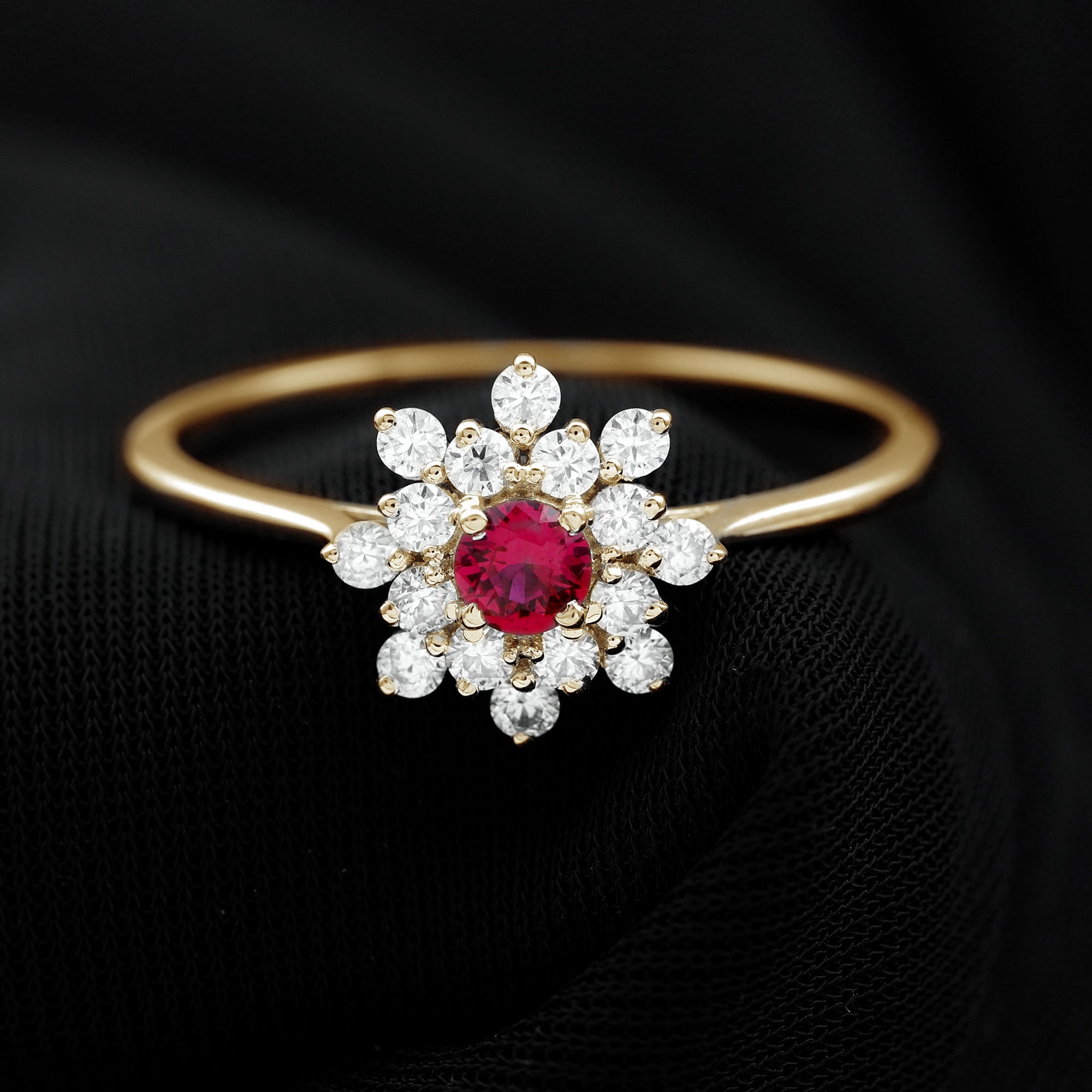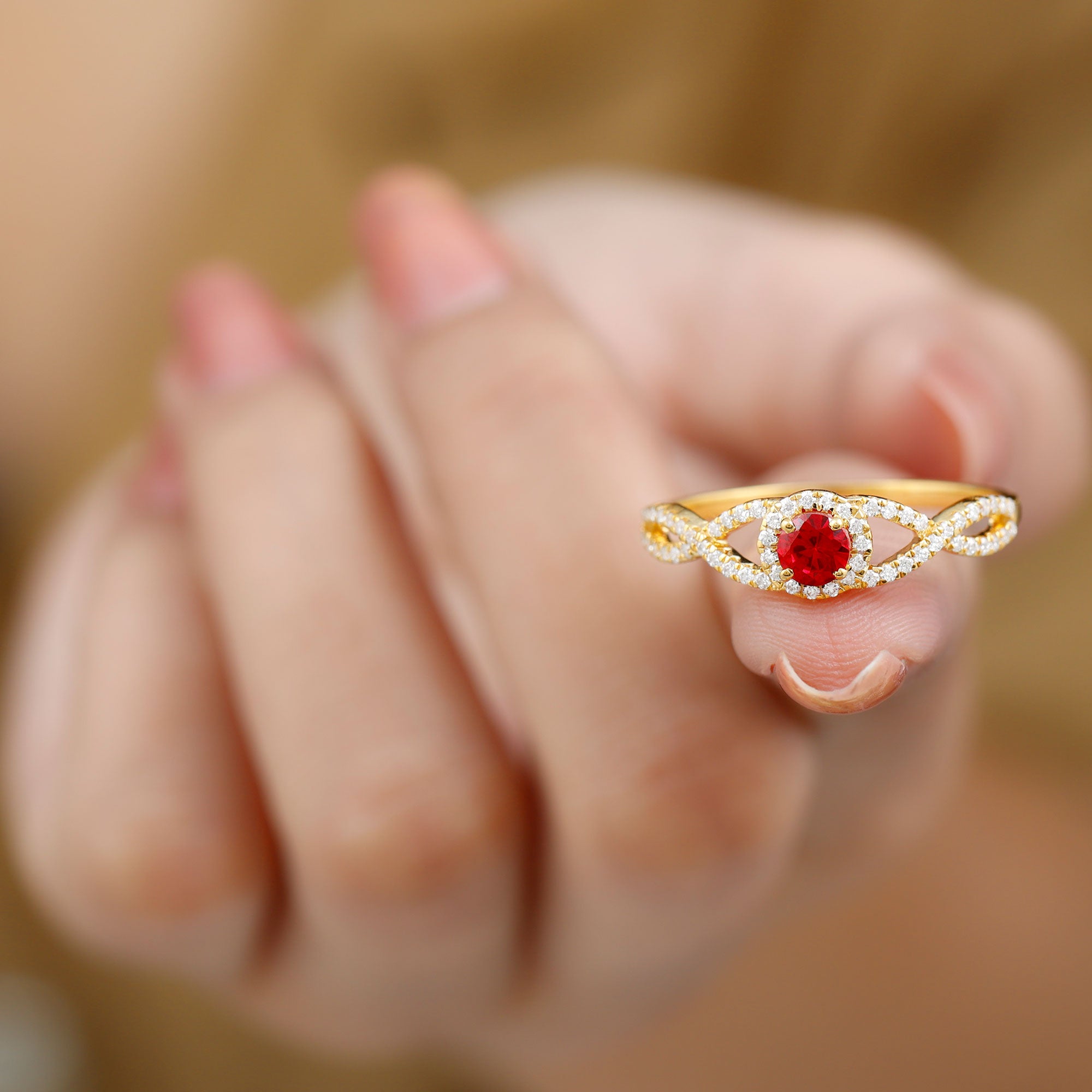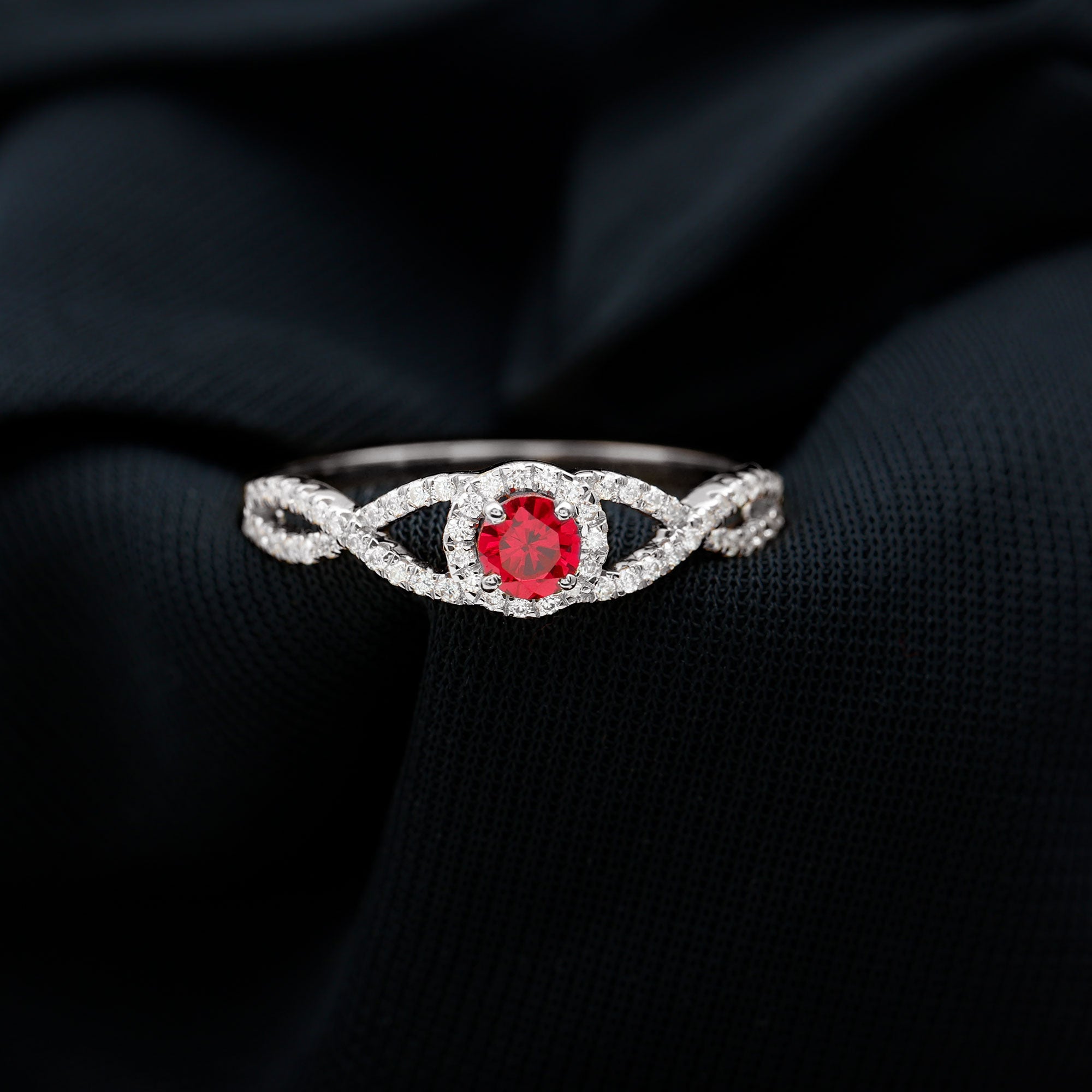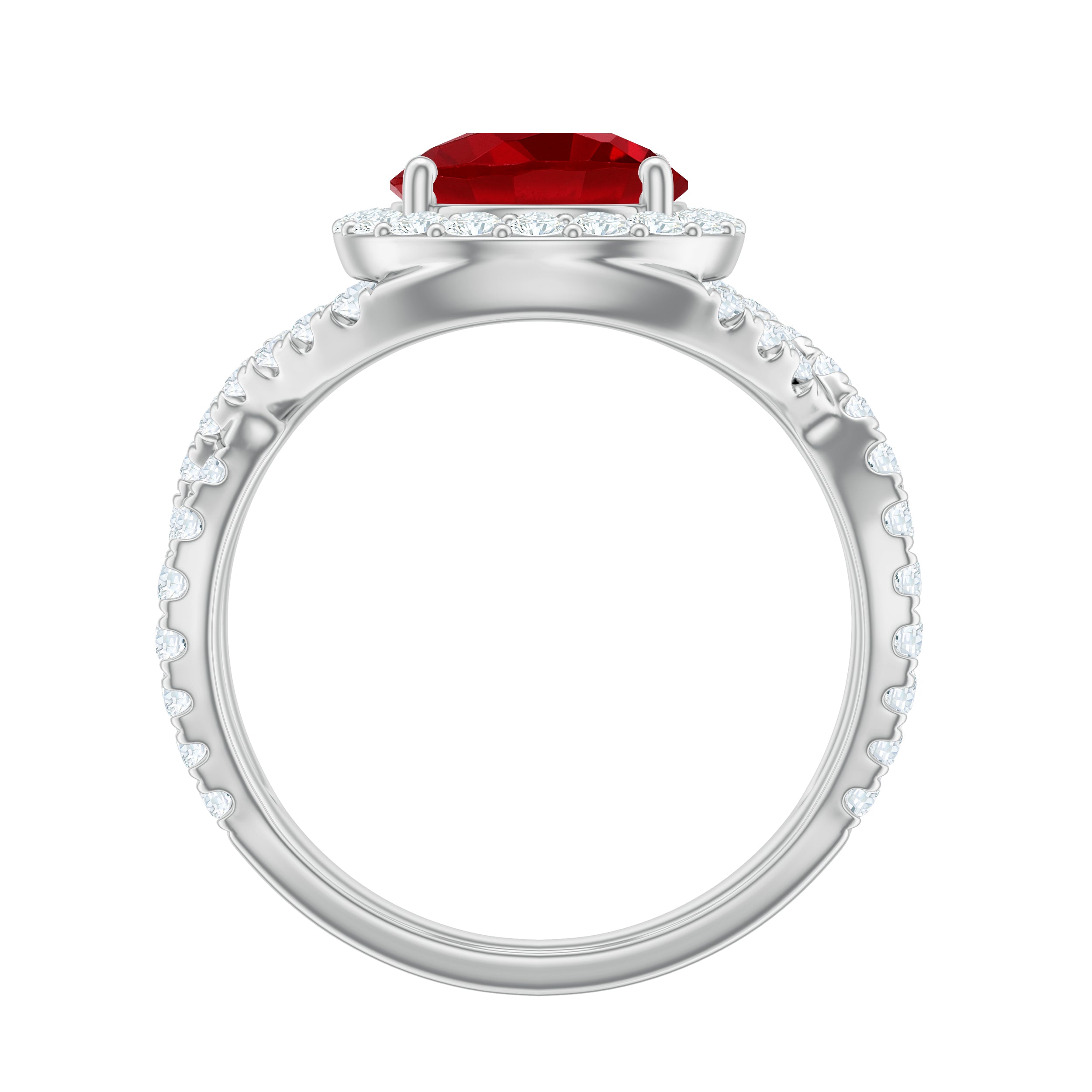 Halo Ruby Rings: A lab ruby surrounded by a circle of smaller diamonds or other colored gemstones for adding sparkle and brilliance. The halo makes the ruby gemstone stone appear larger and dazzling in a lab created ruby and diamond ring.