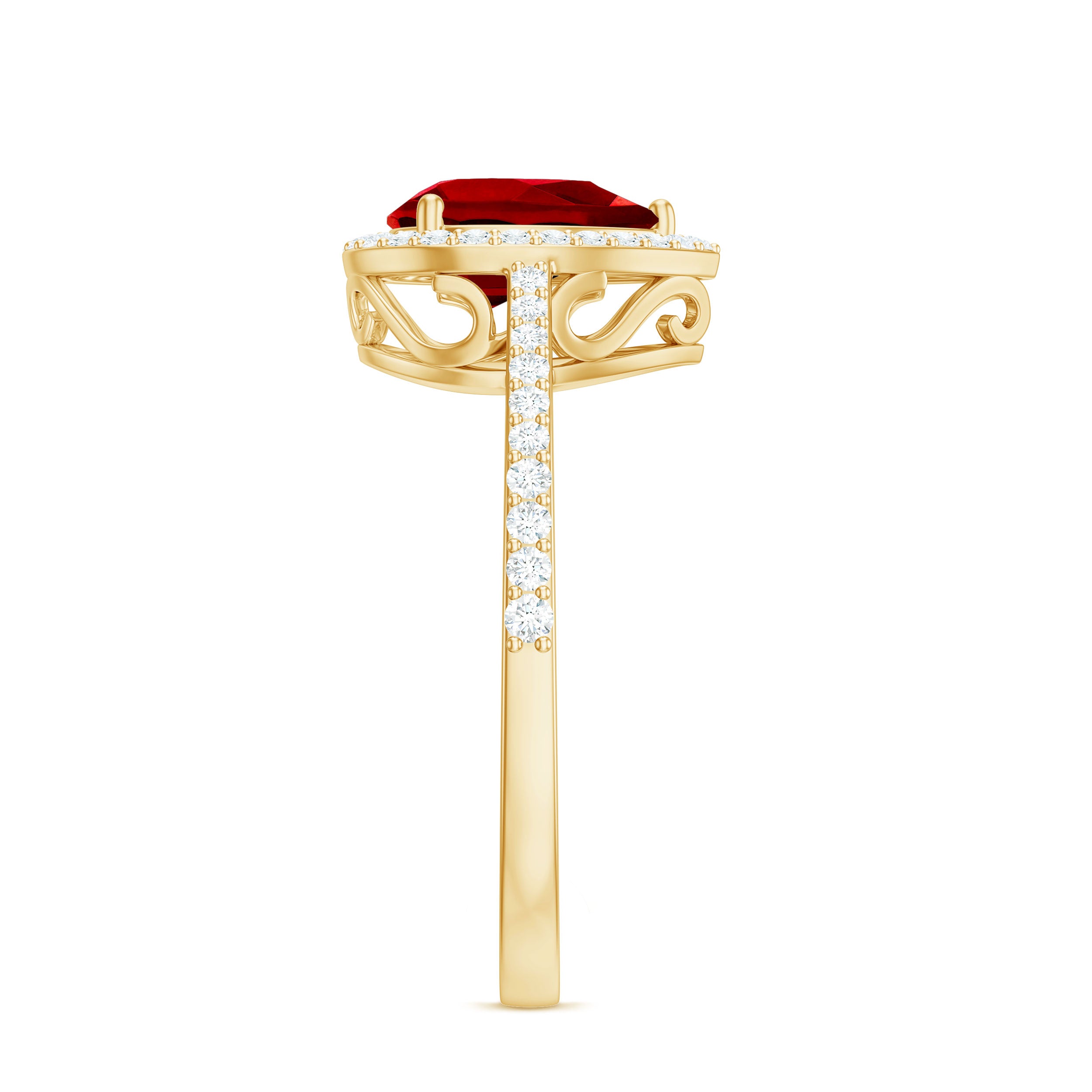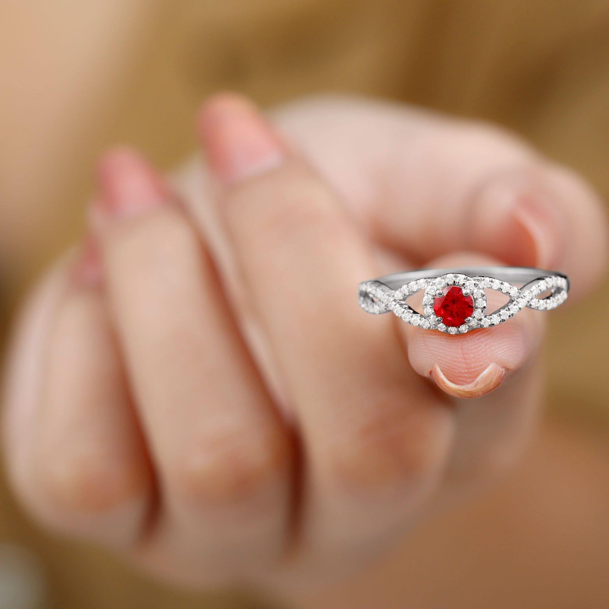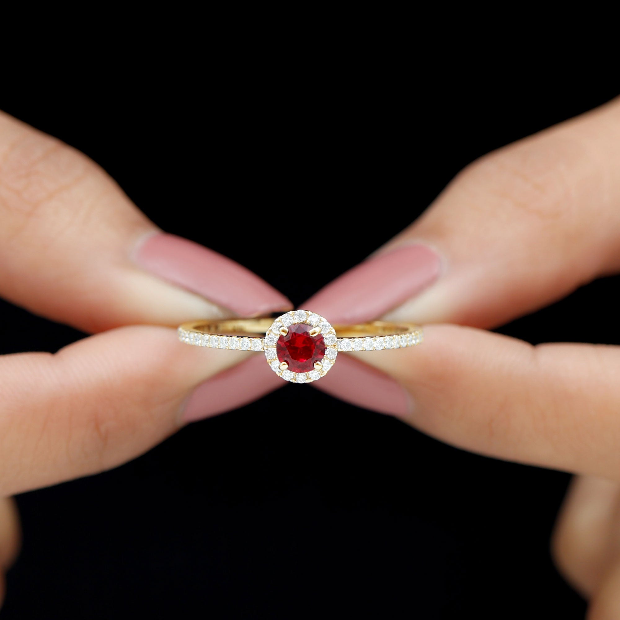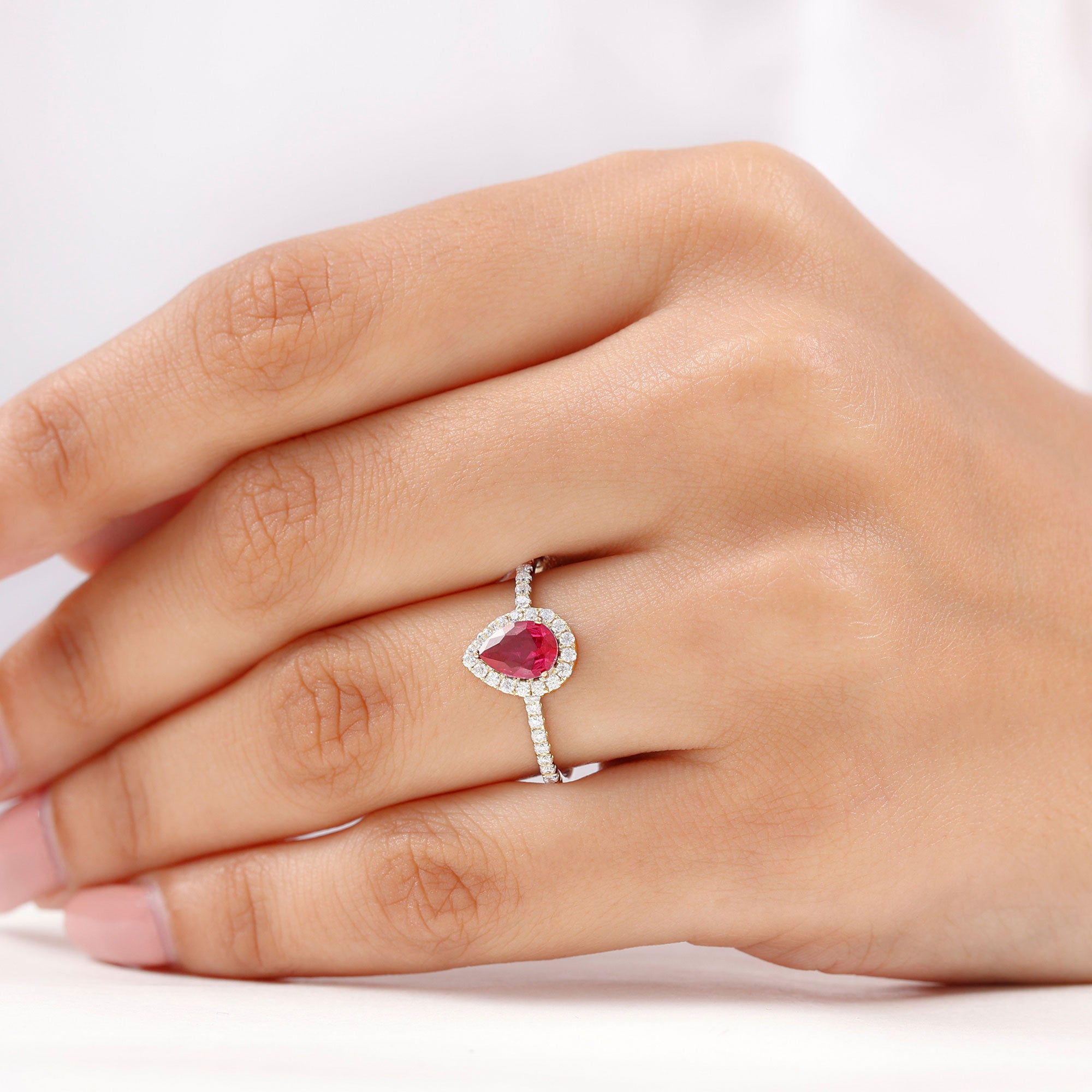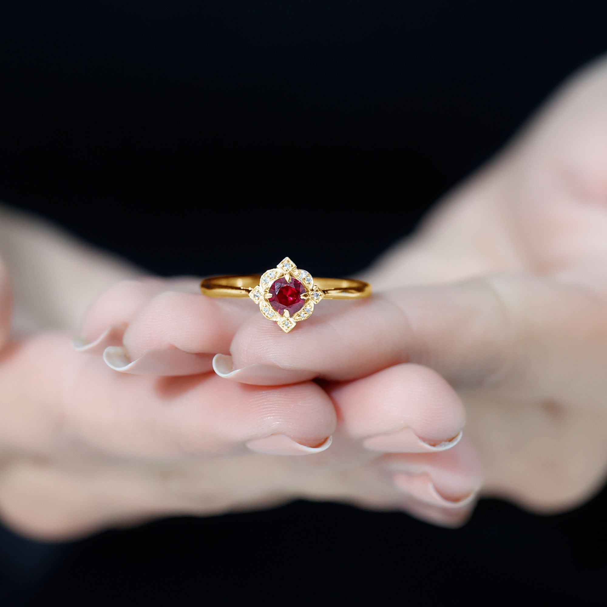 Halo Ruby Rings: A lab ruby surrounded by a circle of smaller diamonds or other colored gemstones for adding sparkle and brilliance. The halo makes the ruby gemstone stone appear larger and dazzling in a lab created ruby and diamond ring.