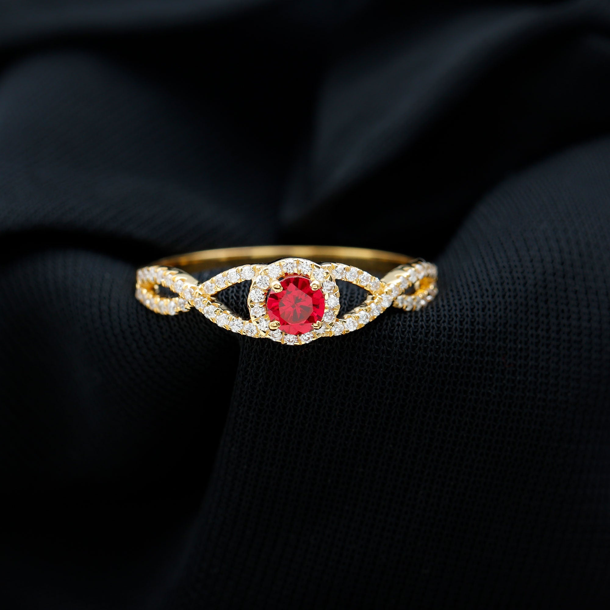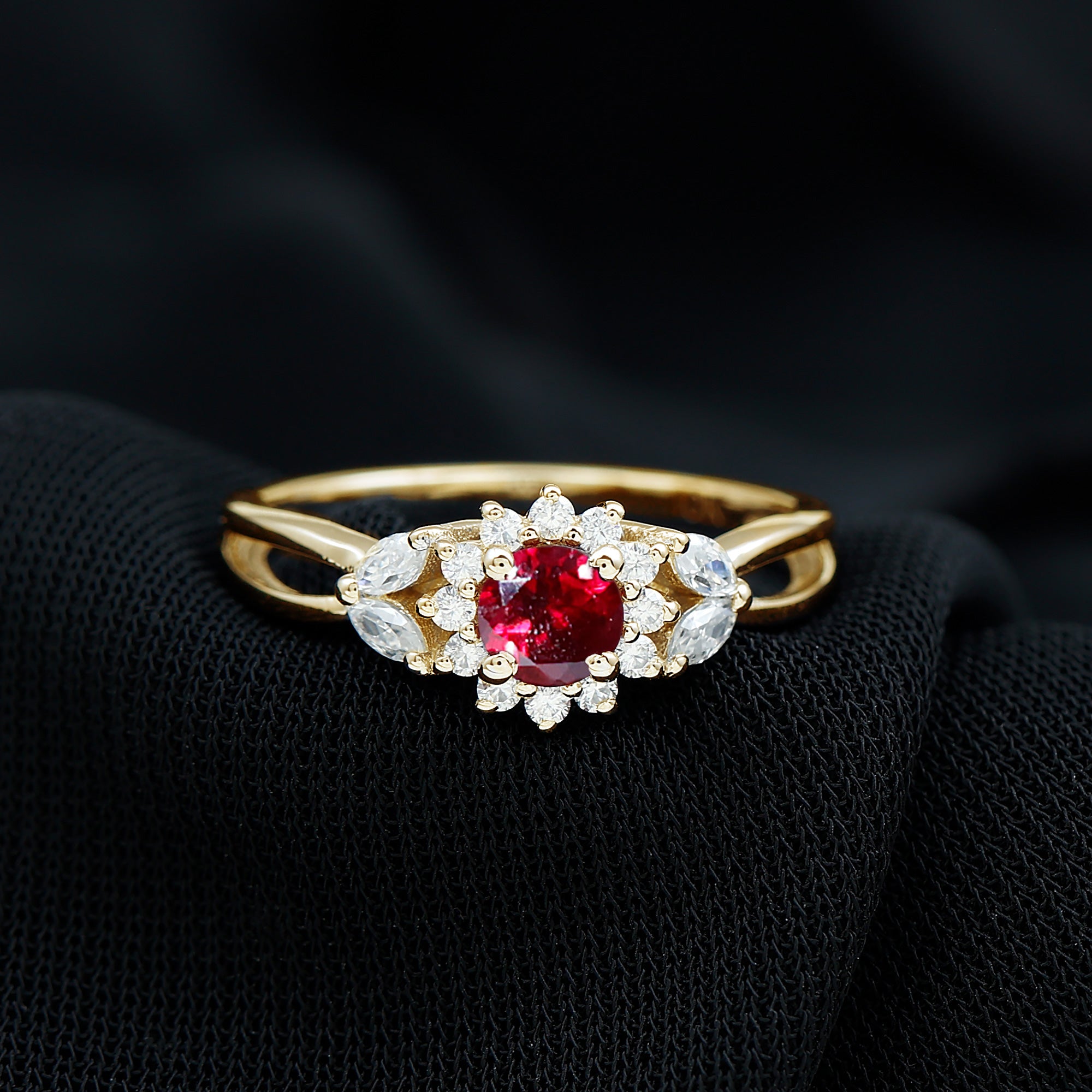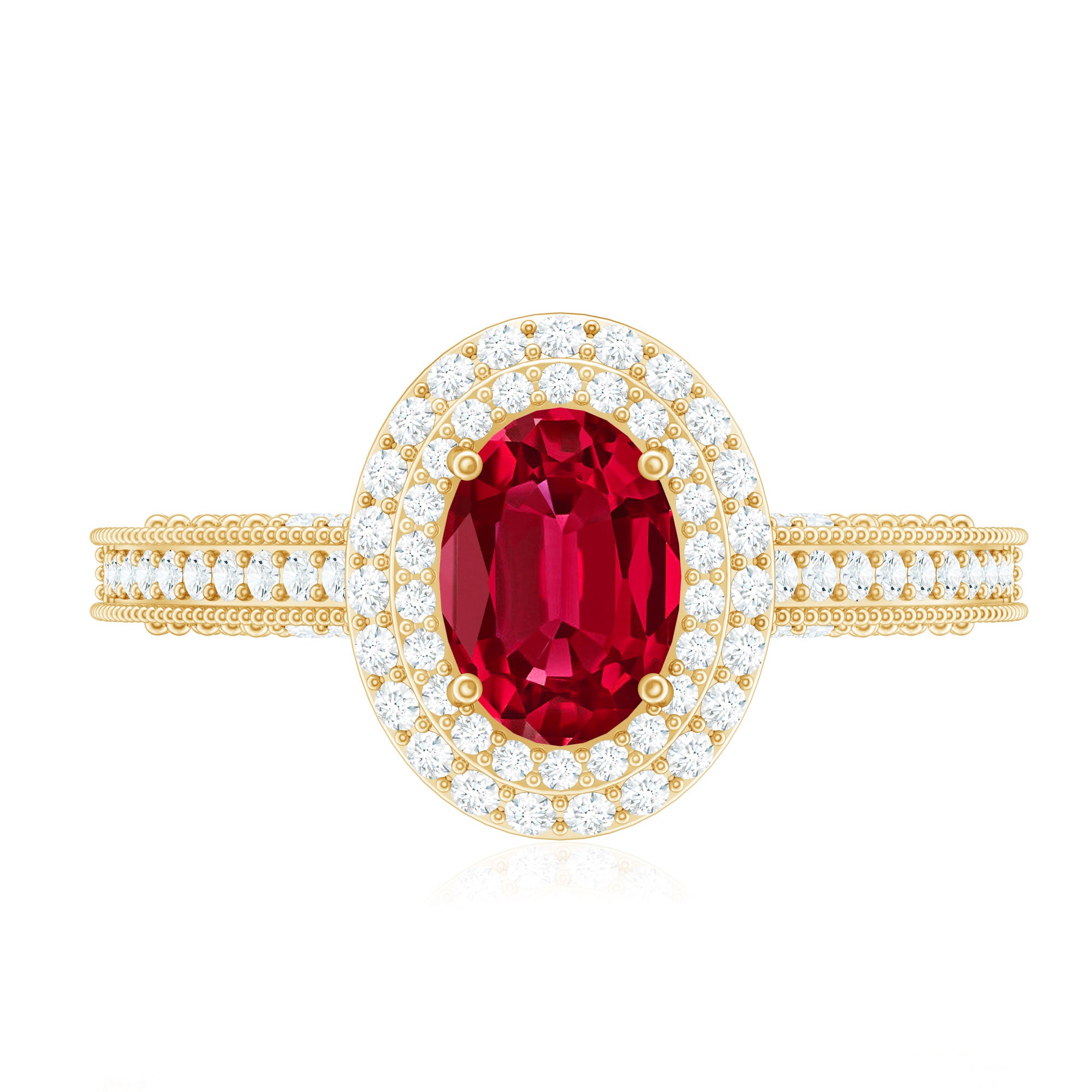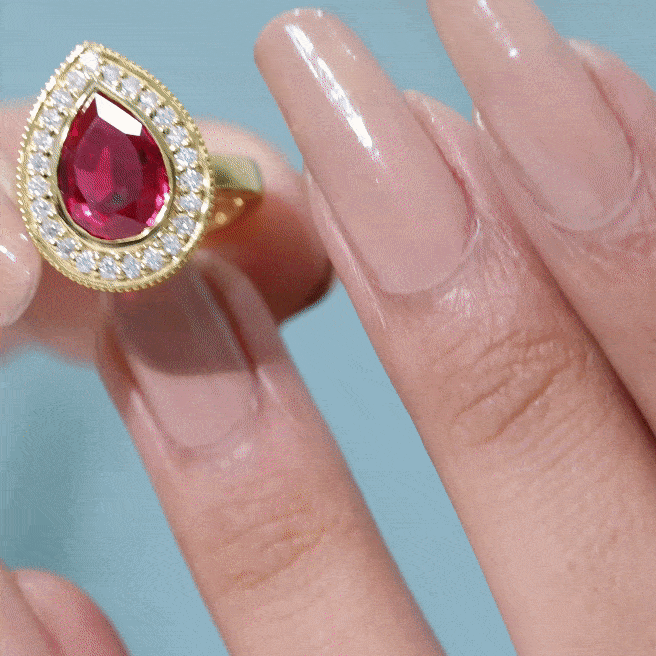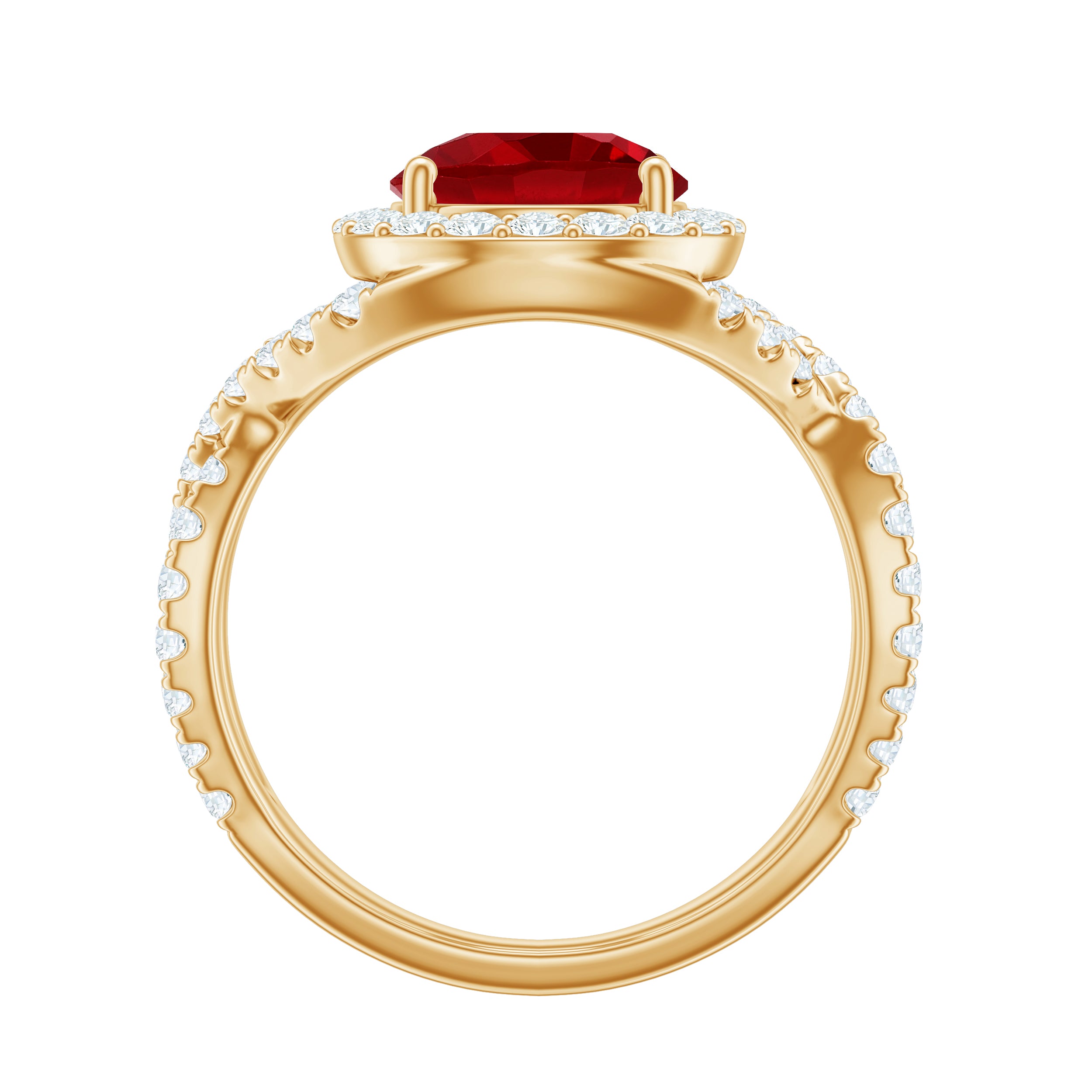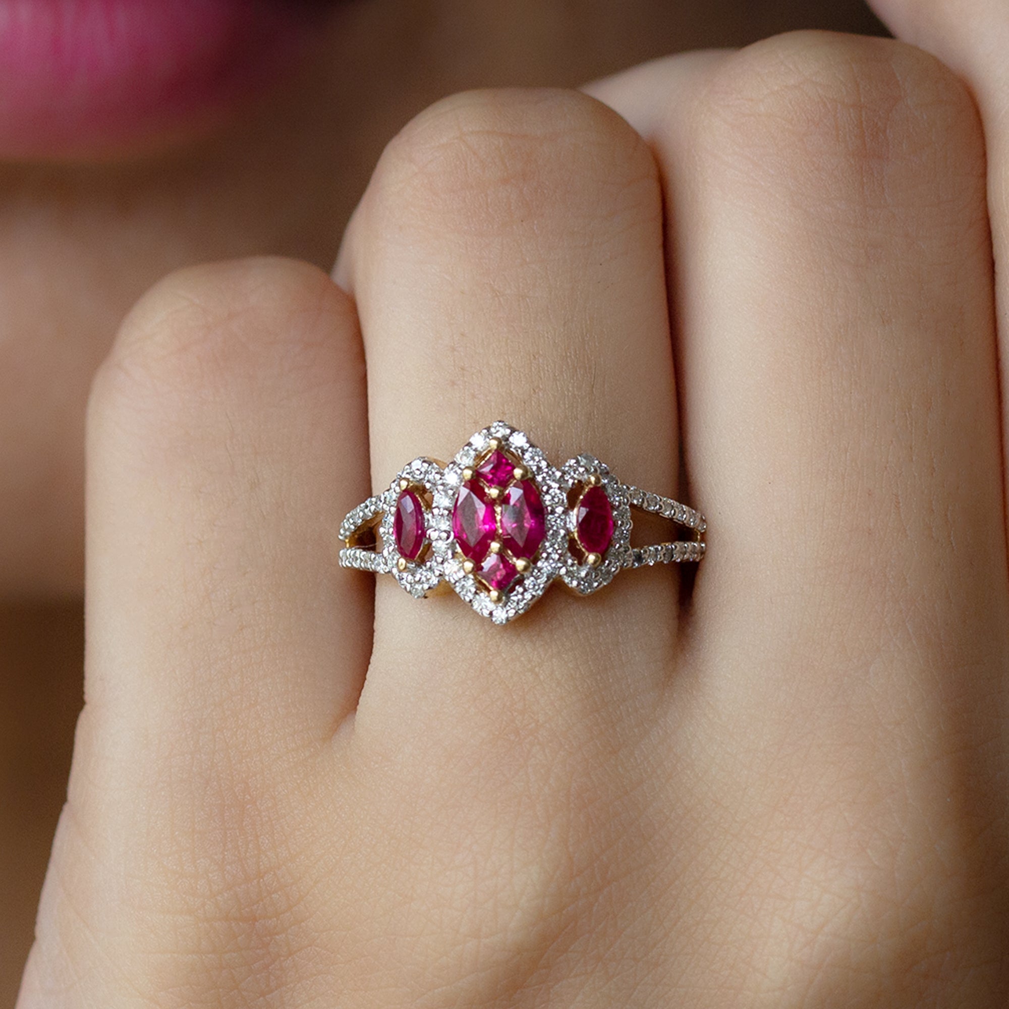 Halo Ruby Rings: A lab ruby surrounded by a circle of smaller diamonds or other colored gemstones for adding sparkle and brilliance. The halo makes the ruby gemstone stone appear larger and dazzling in a lab created ruby and diamond ring.