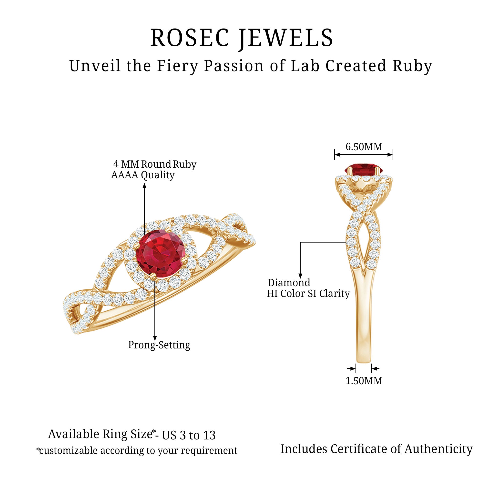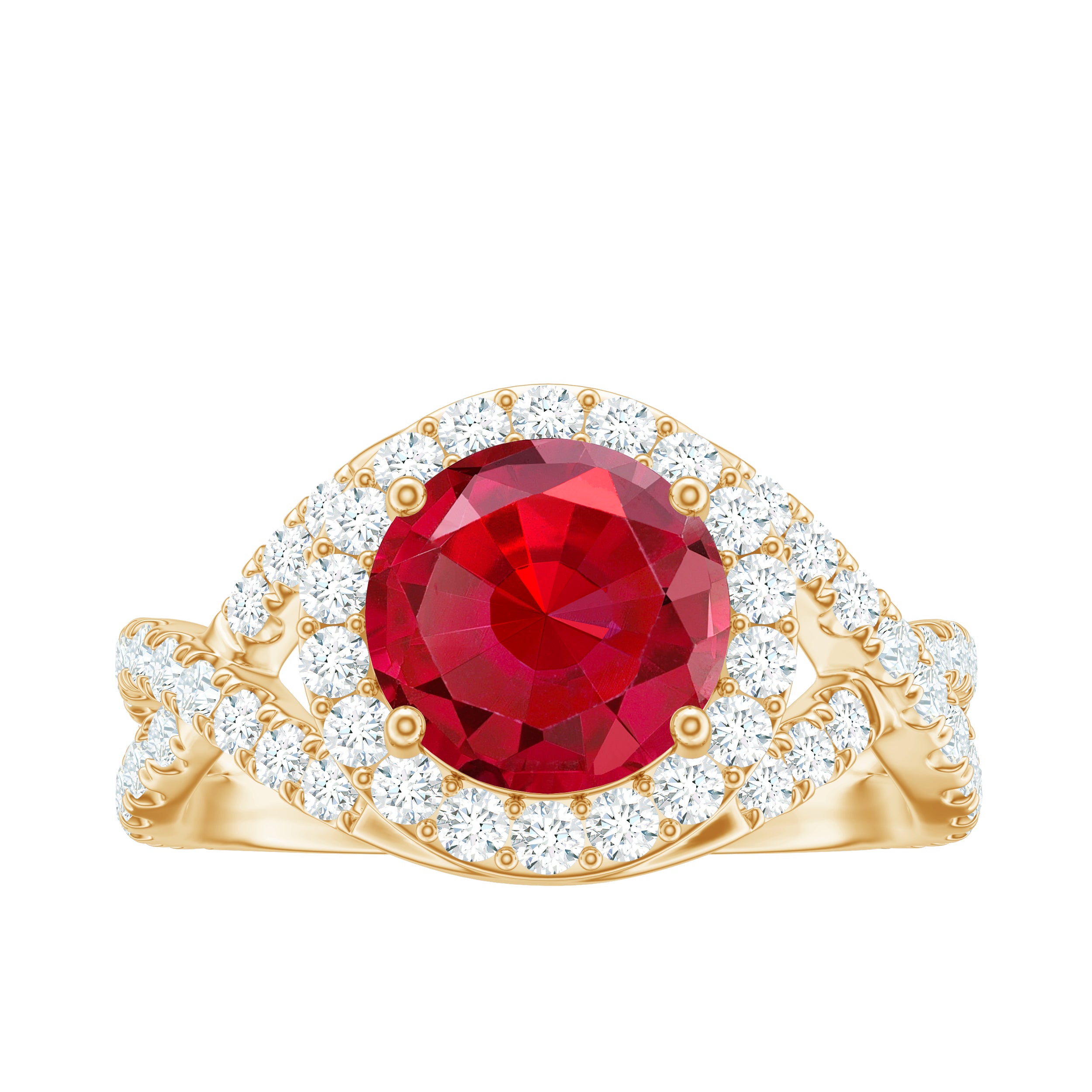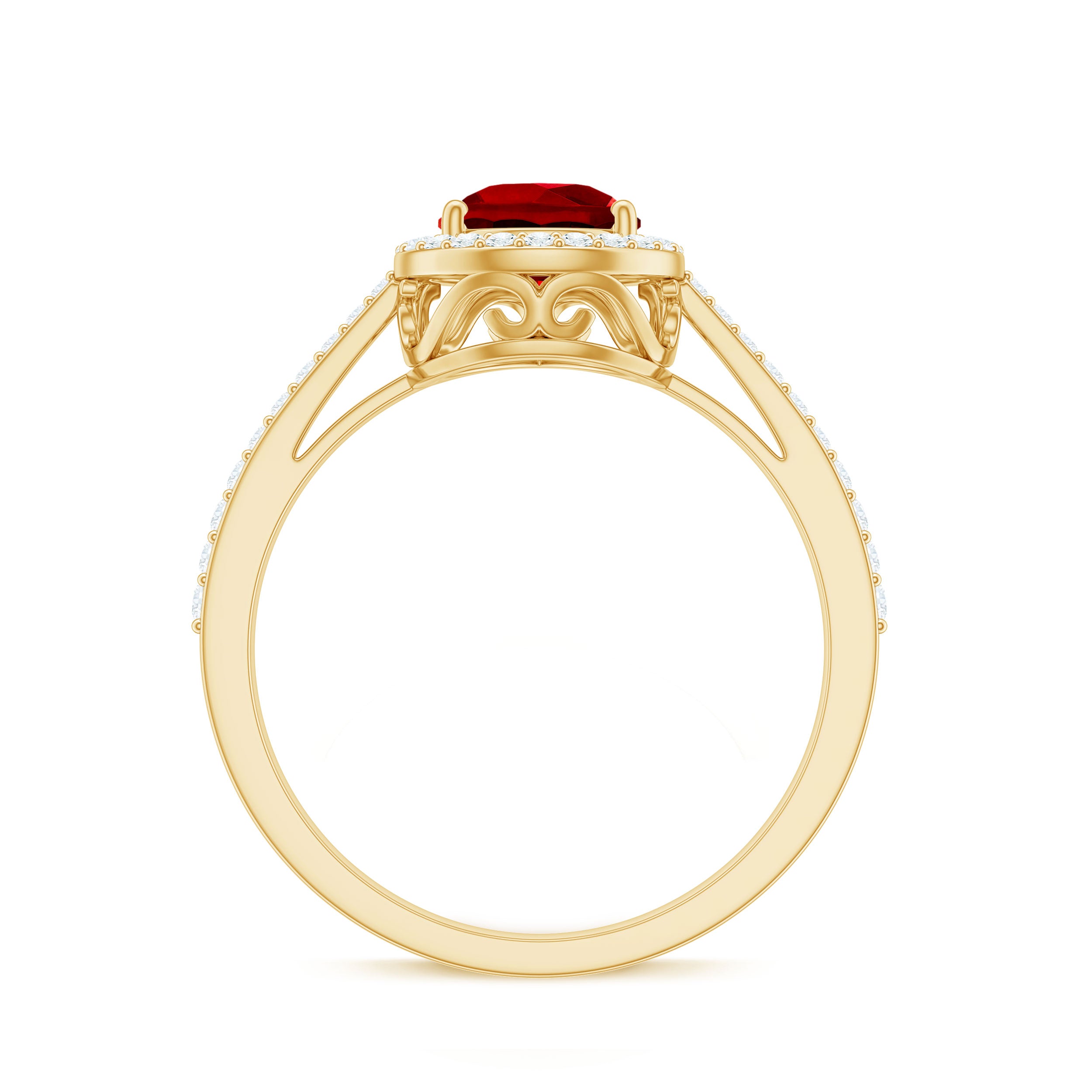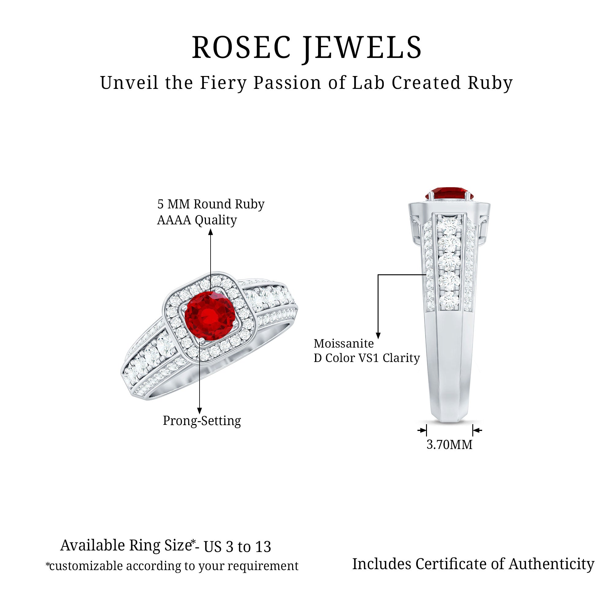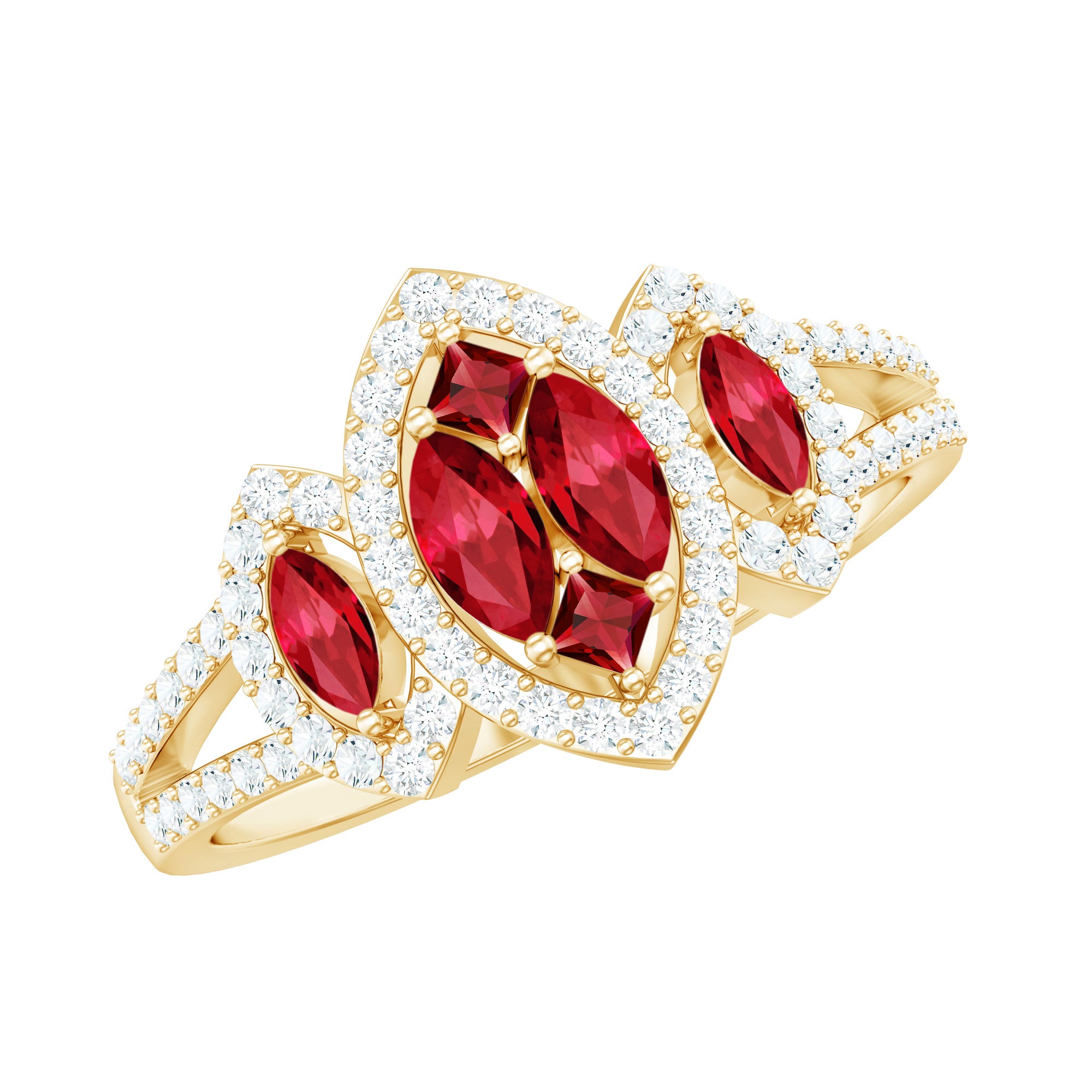 Halo Ruby Rings: A lab ruby surrounded by a circle of smaller diamonds or other colored gemstones for adding sparkle and brilliance. The halo makes the ruby gemstone stone appear larger and dazzling in a lab created ruby and diamond ring.