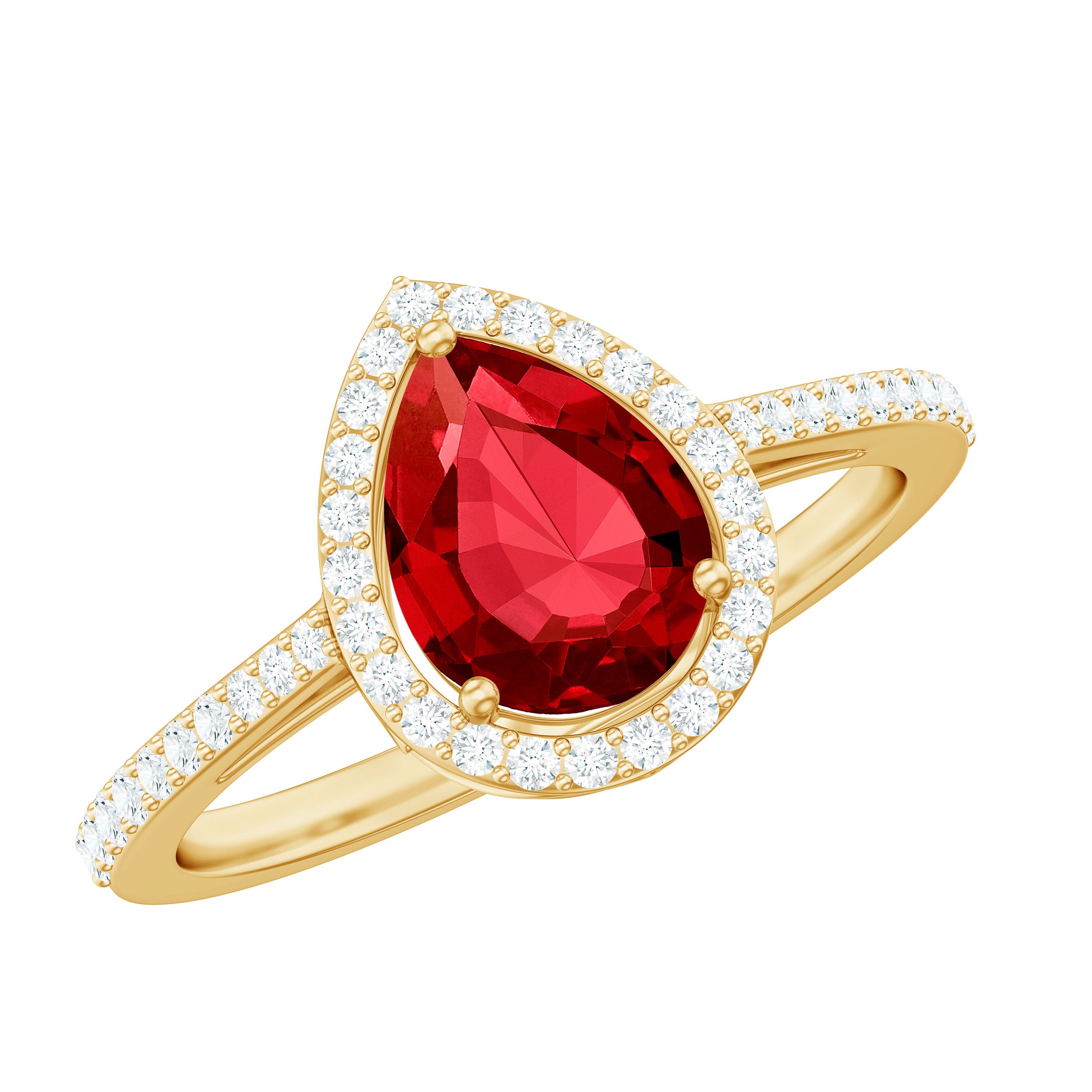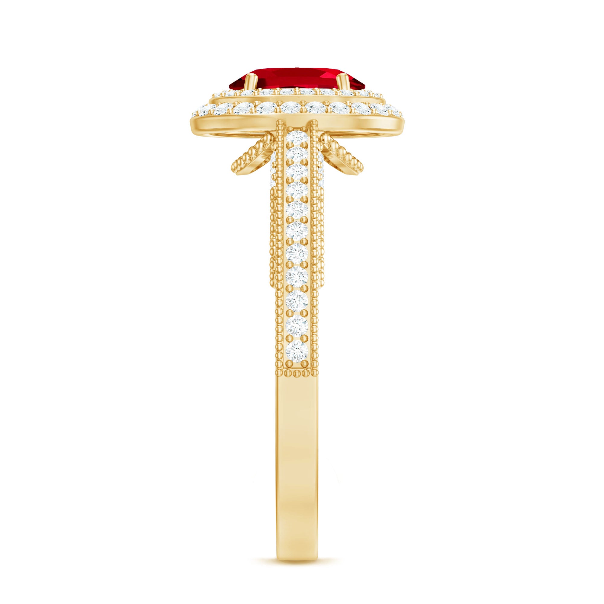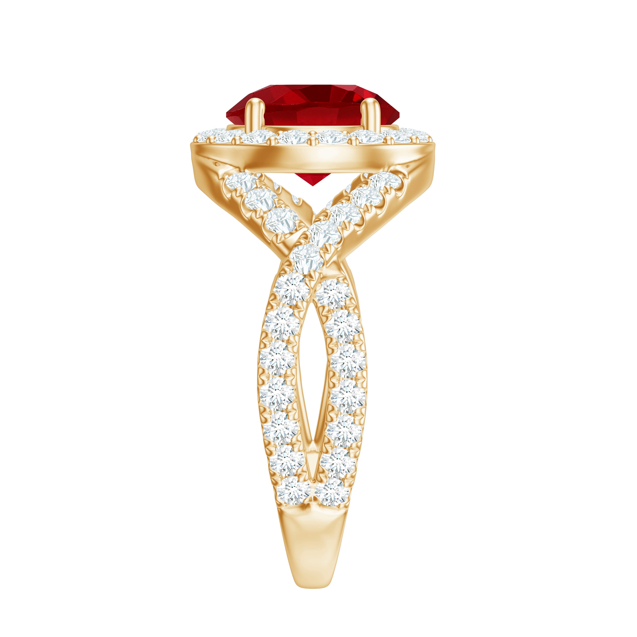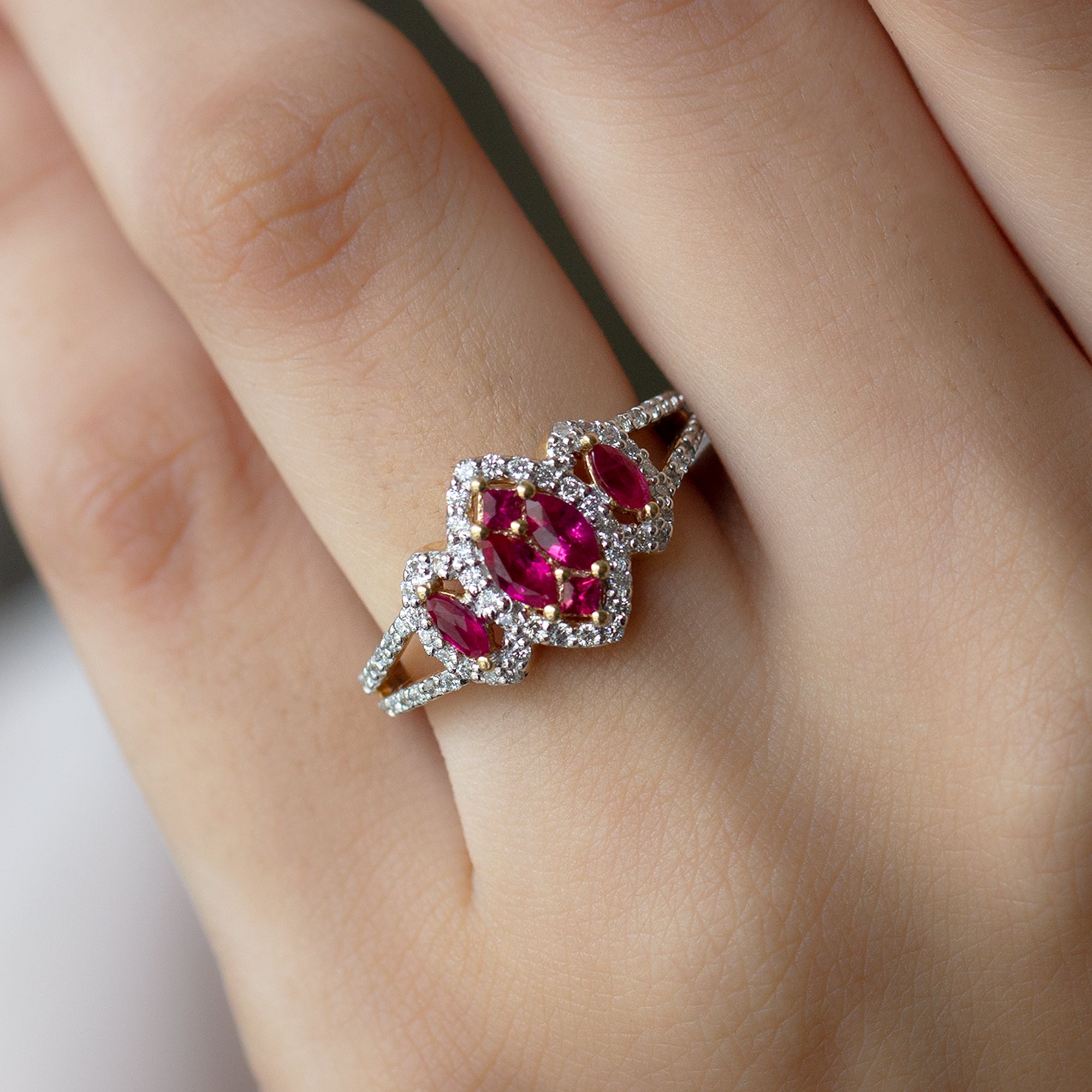 Halo Ruby Rings: A lab ruby surrounded by a circle of smaller diamonds or other colored gemstones for adding sparkle and brilliance. The halo makes the ruby gemstone stone appear larger and dazzling in a lab created ruby and diamond ring.