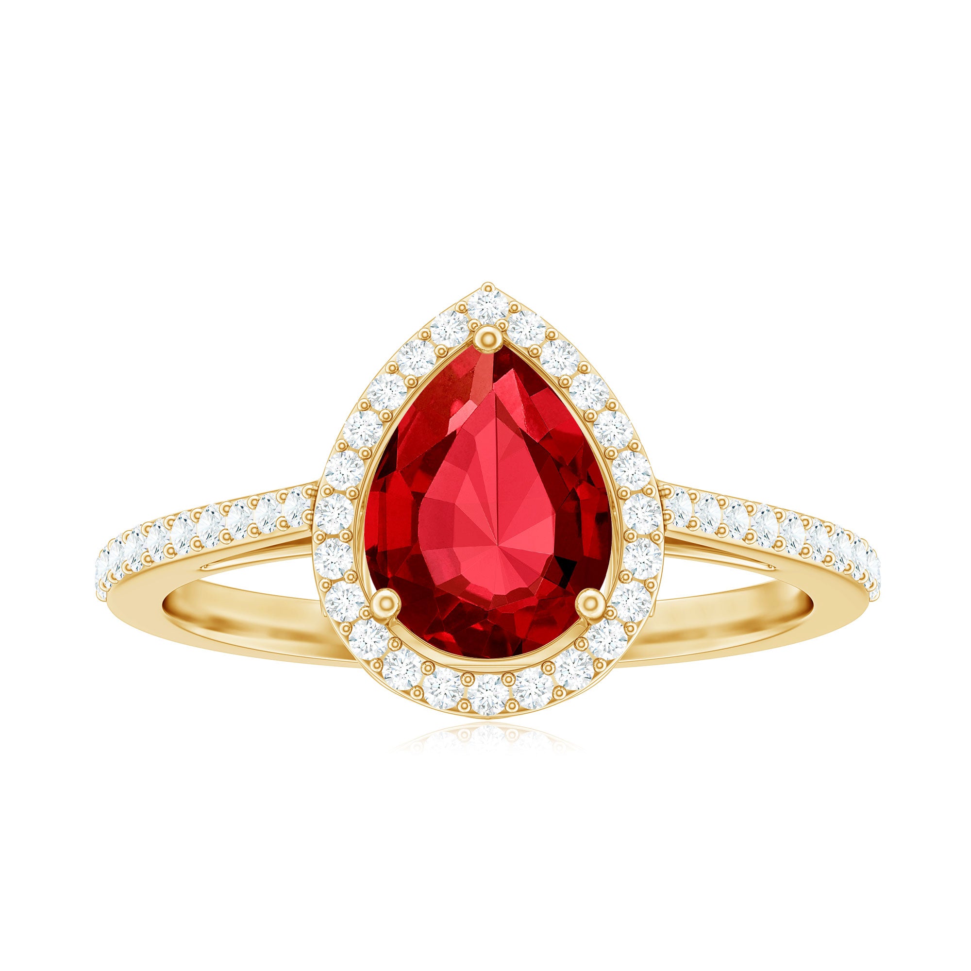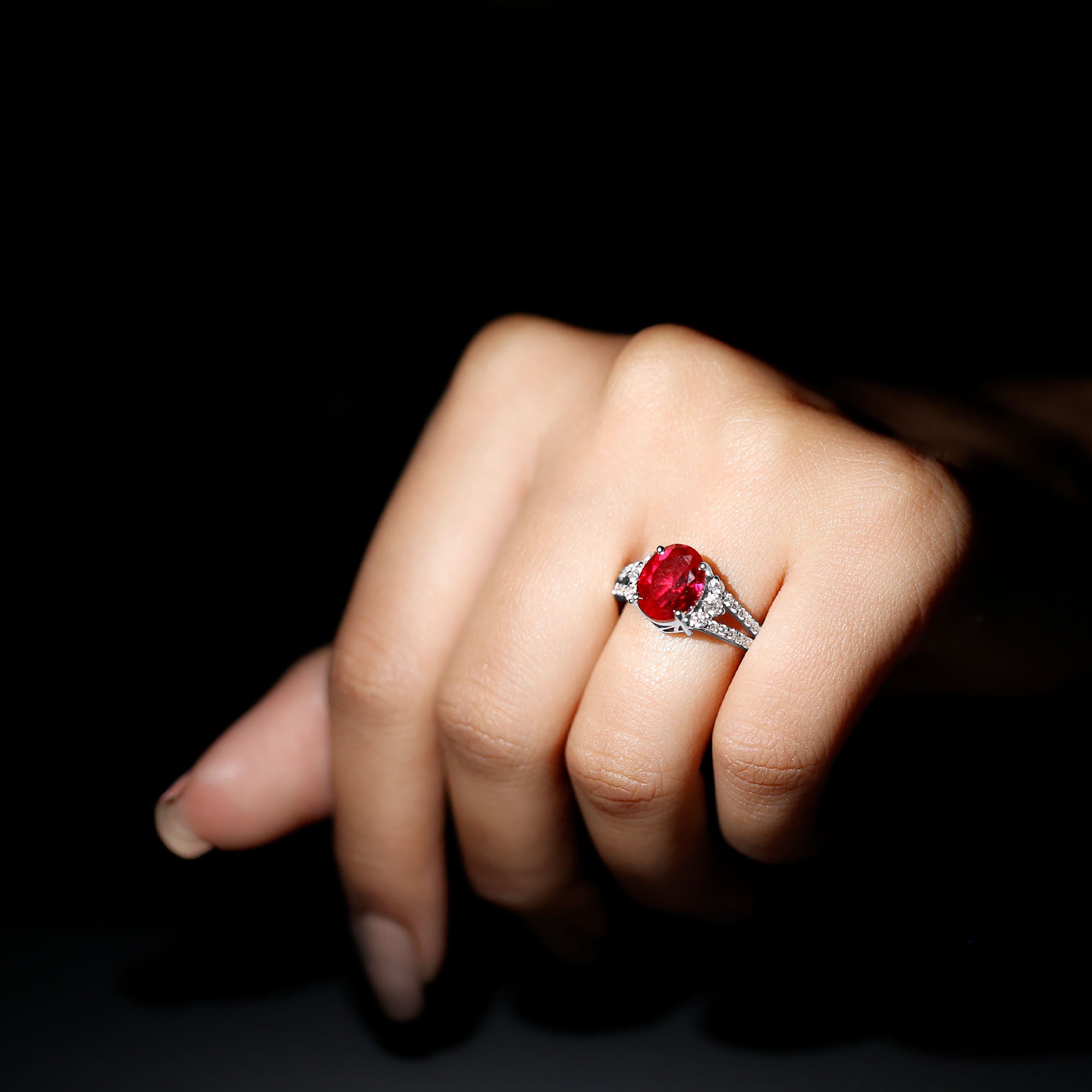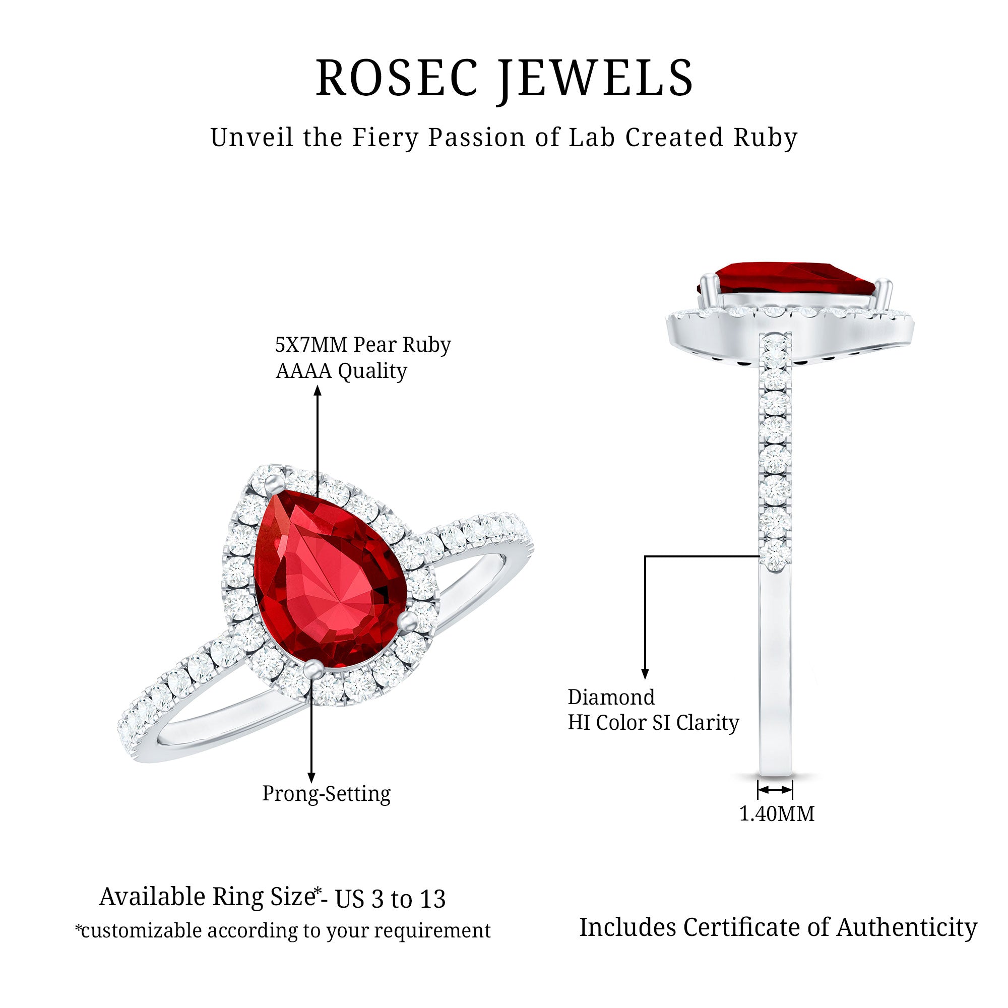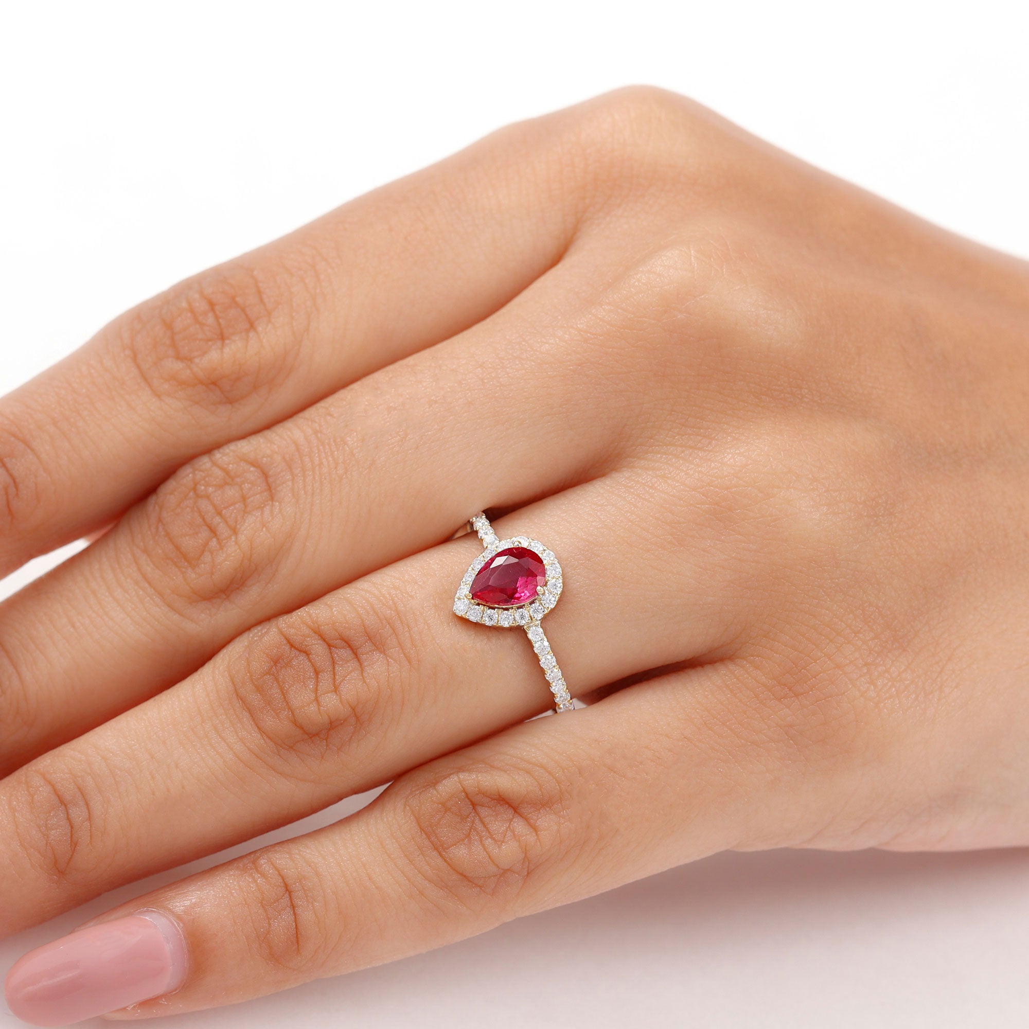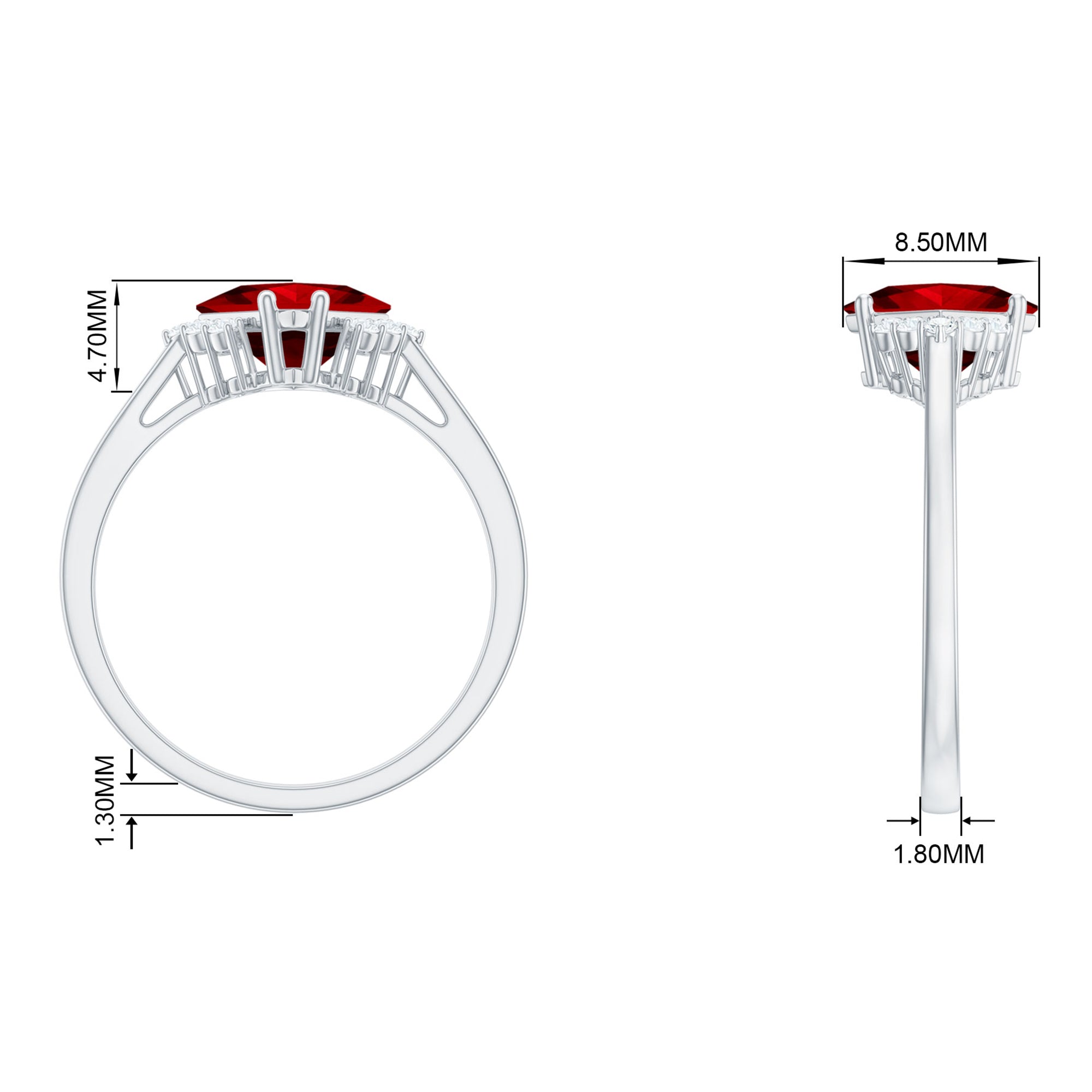 Halo Ruby Rings: A lab ruby surrounded by a circle of smaller diamonds or other colored gemstones for adding sparkle and brilliance. The halo makes the ruby gemstone stone appear larger and dazzling in a lab created ruby and diamond ring.