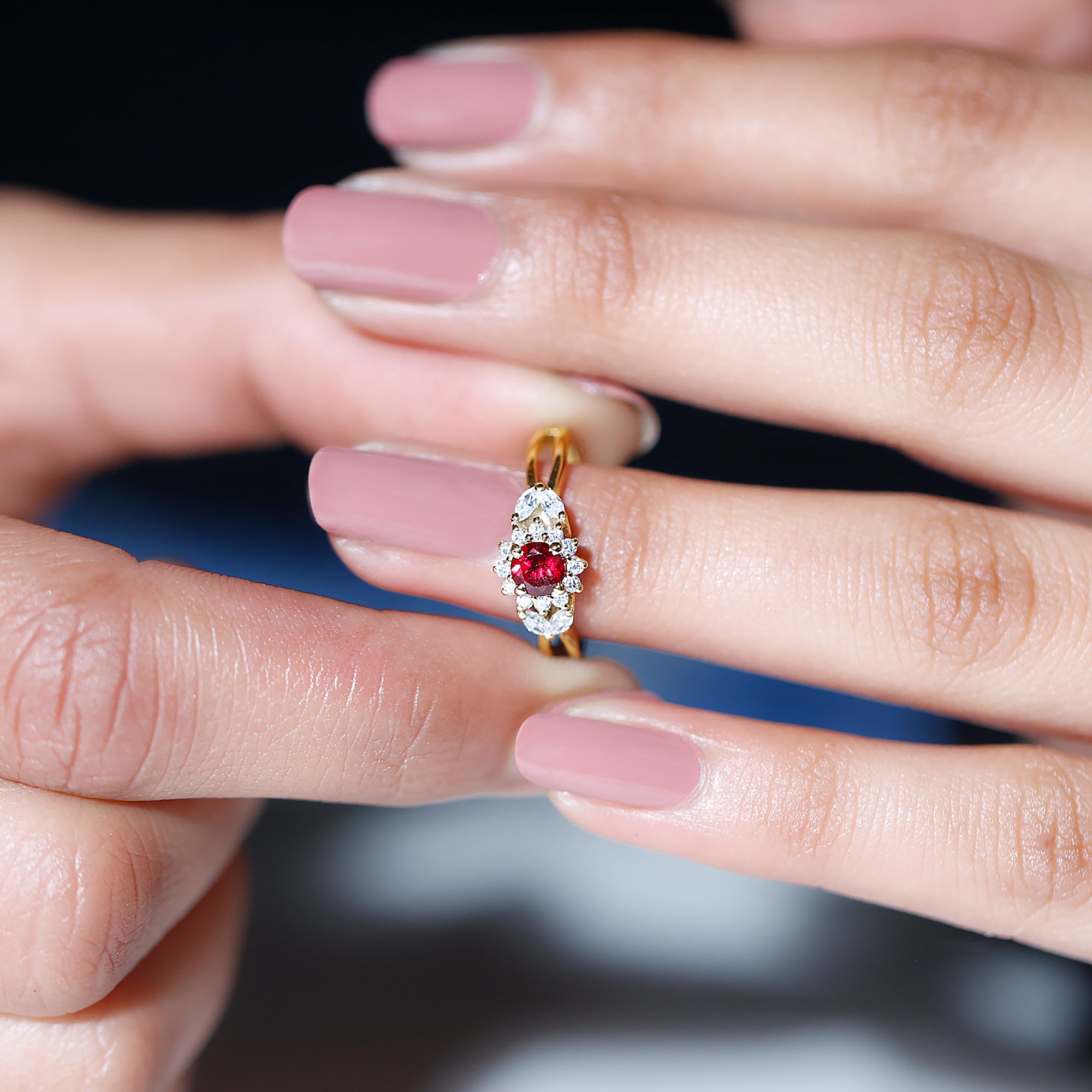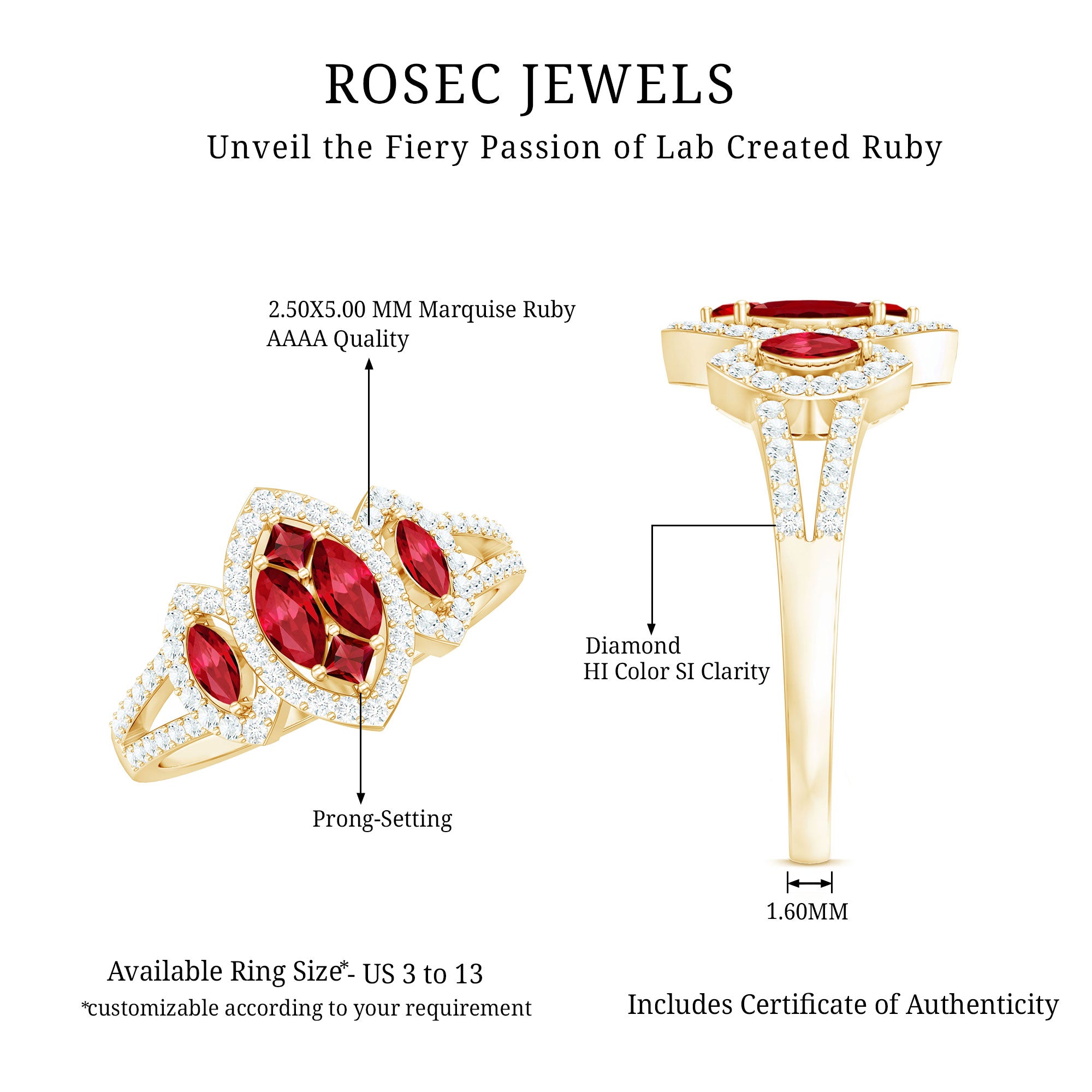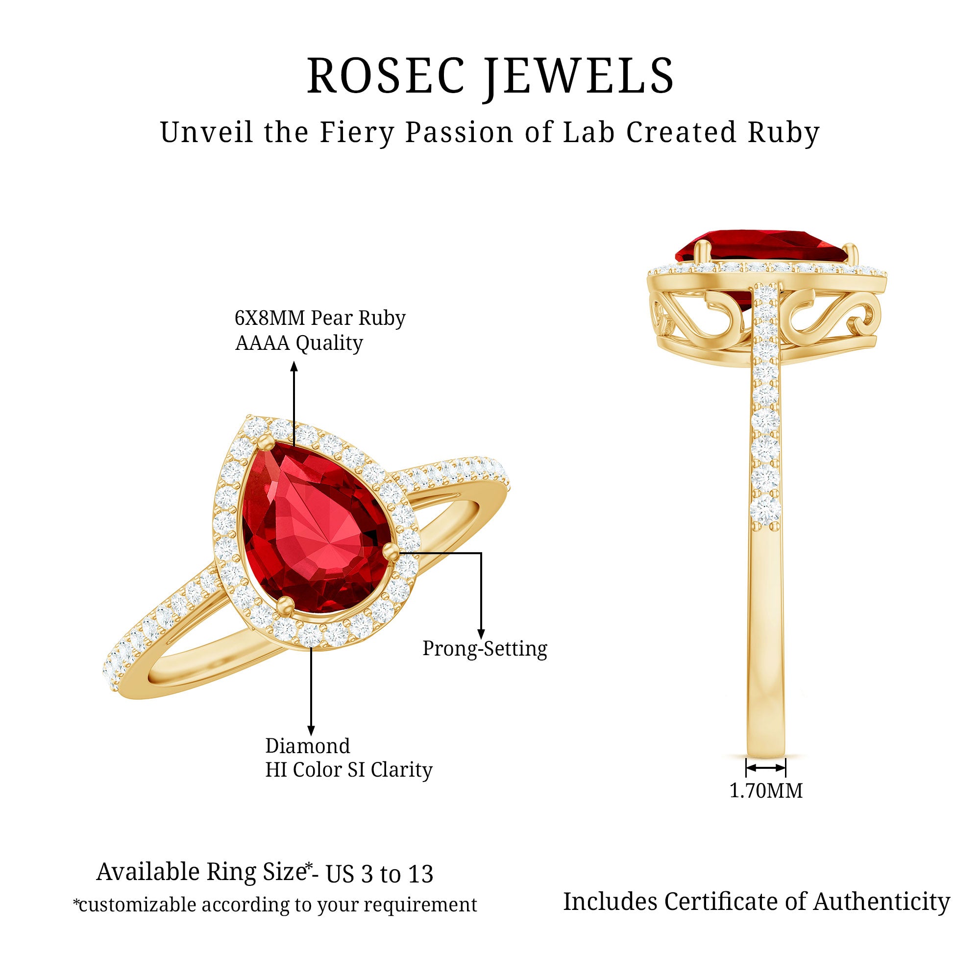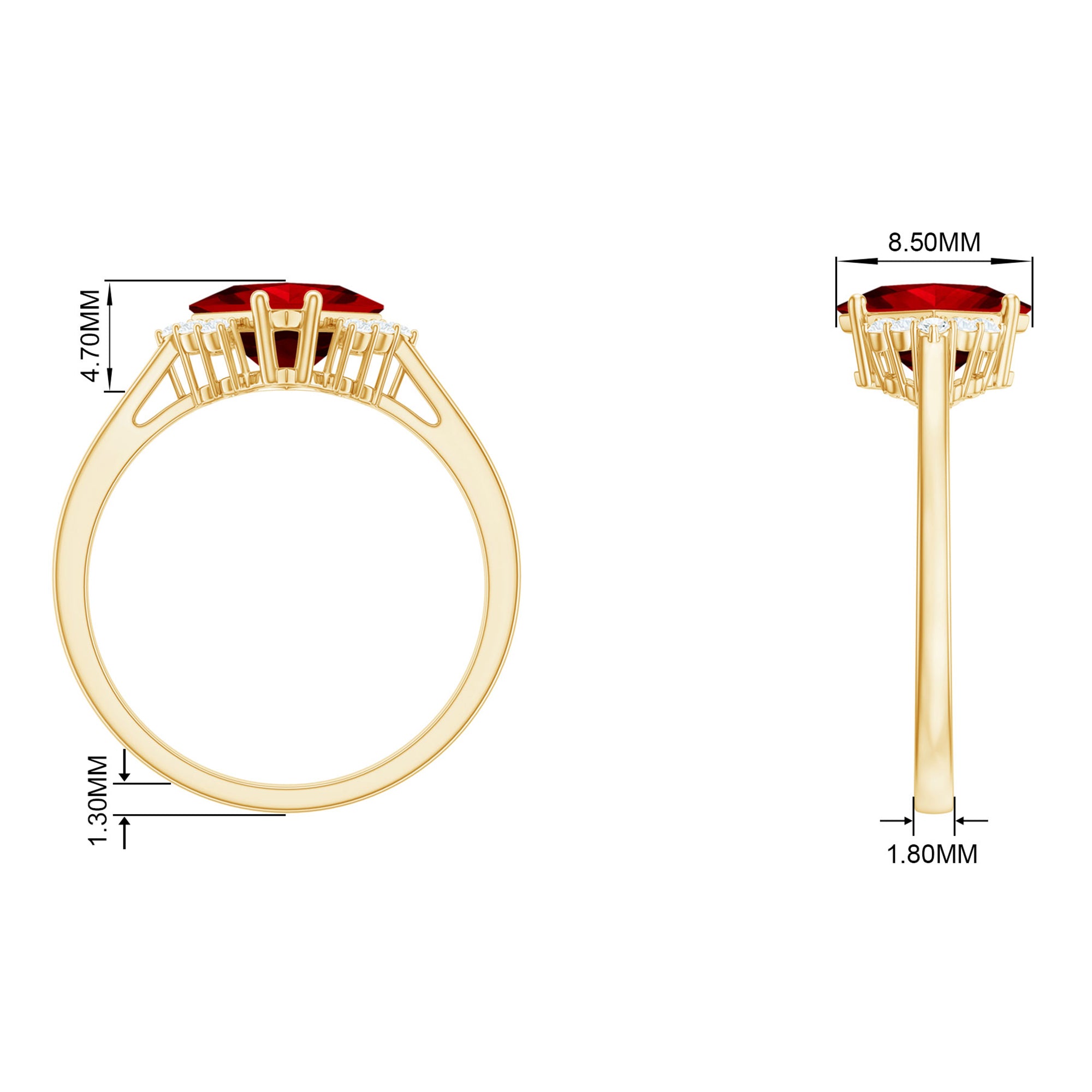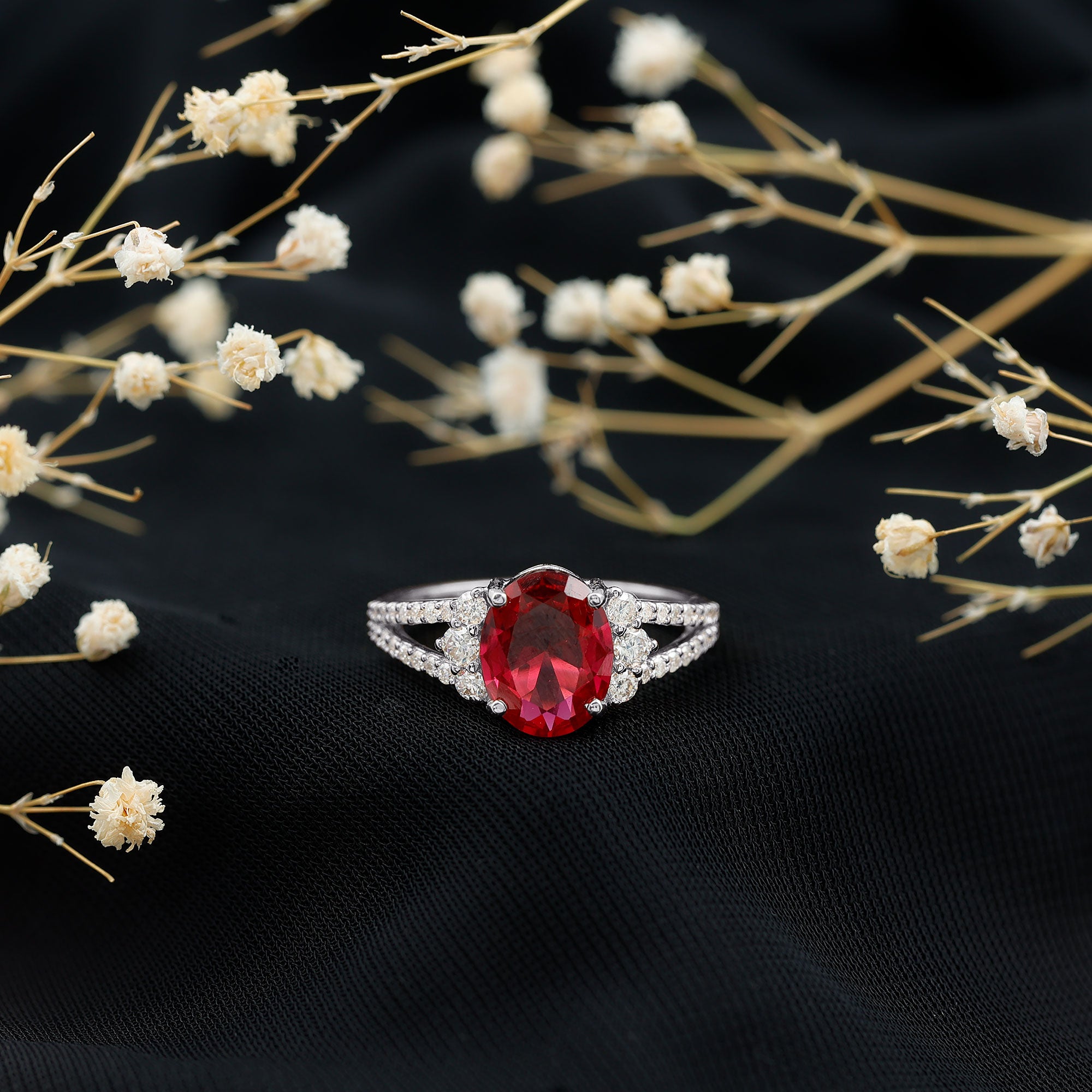 Halo Ruby Rings: A lab ruby surrounded by a circle of smaller diamonds or other colored gemstones for adding sparkle and brilliance. The halo makes the ruby gemstone stone appear larger and dazzling in a lab created ruby and diamond ring.