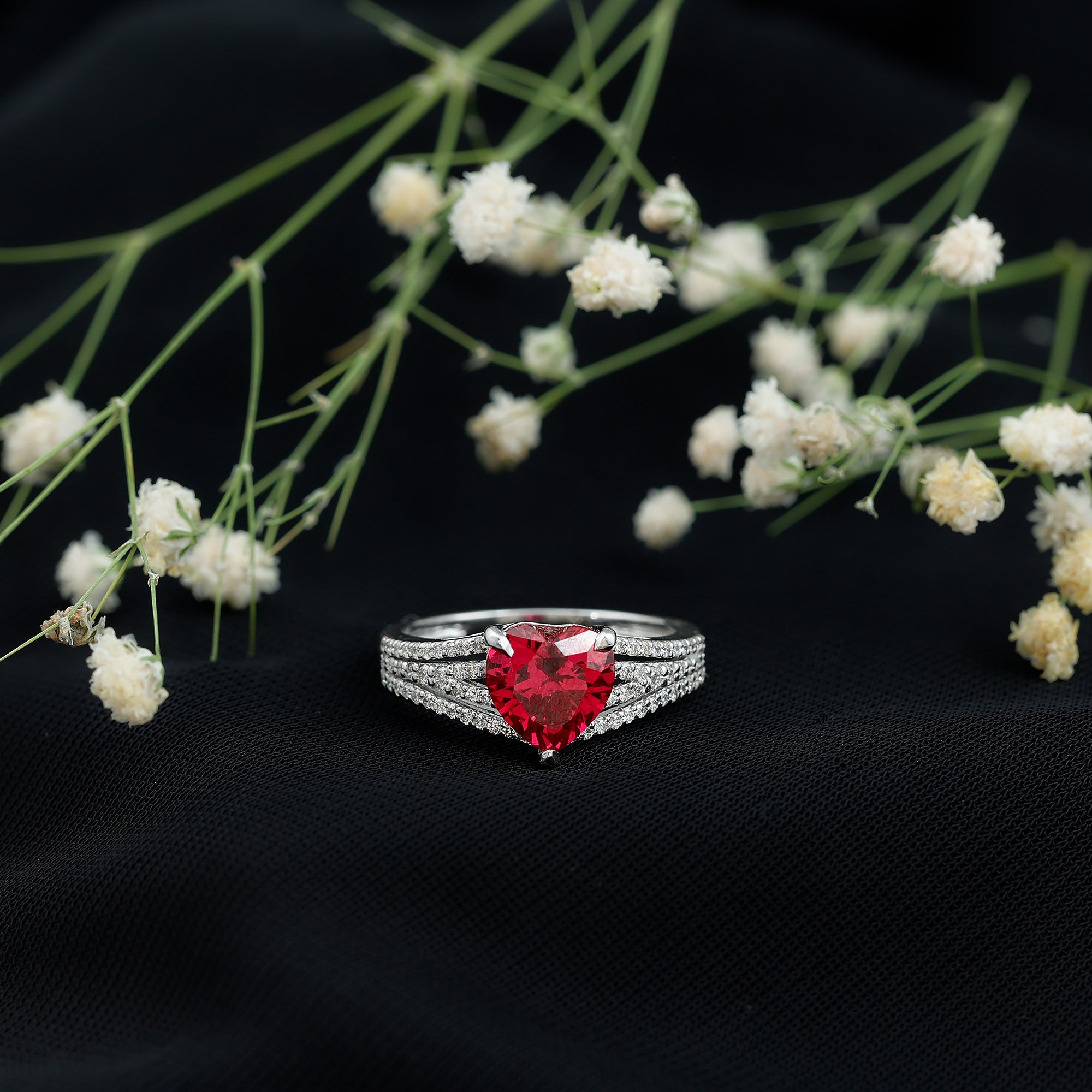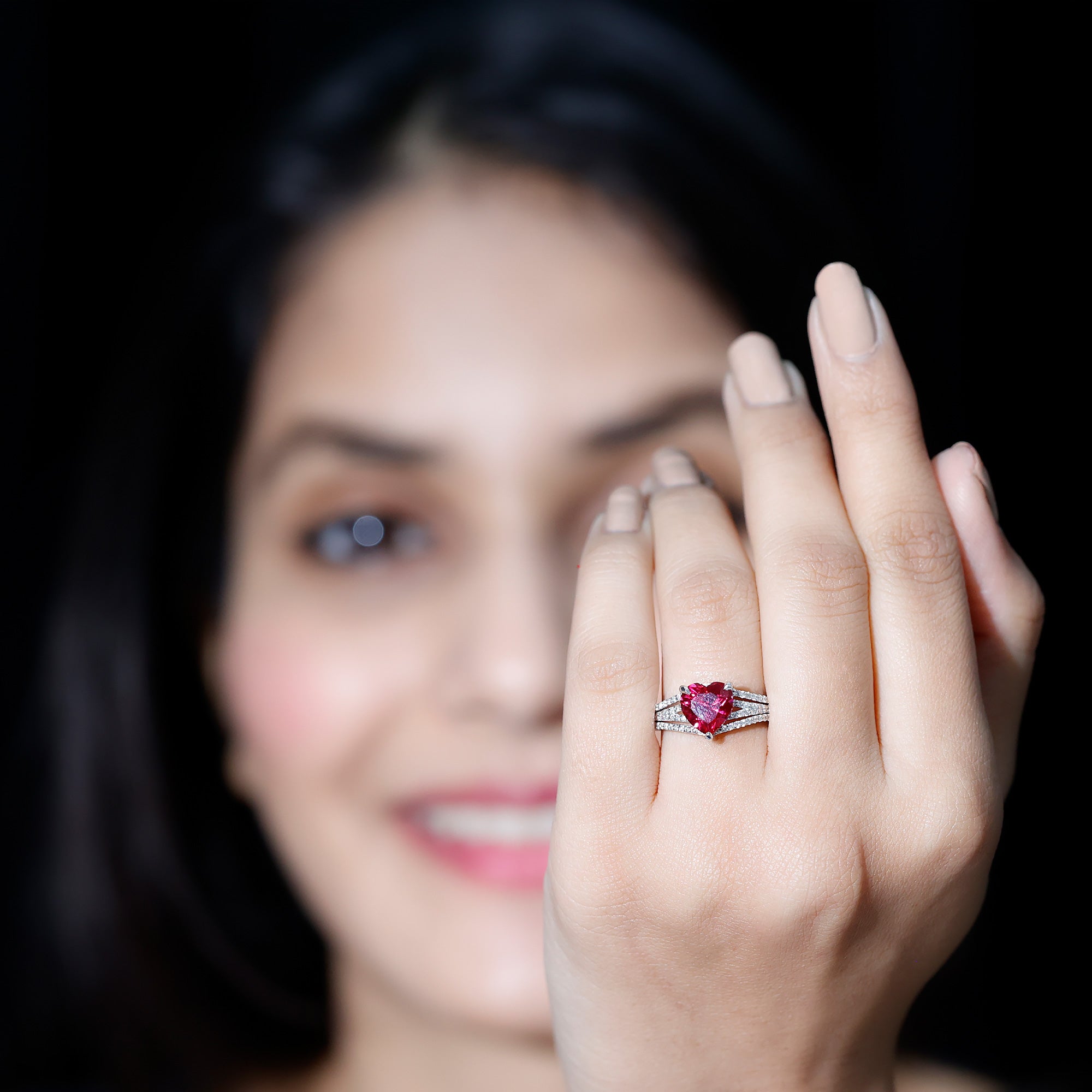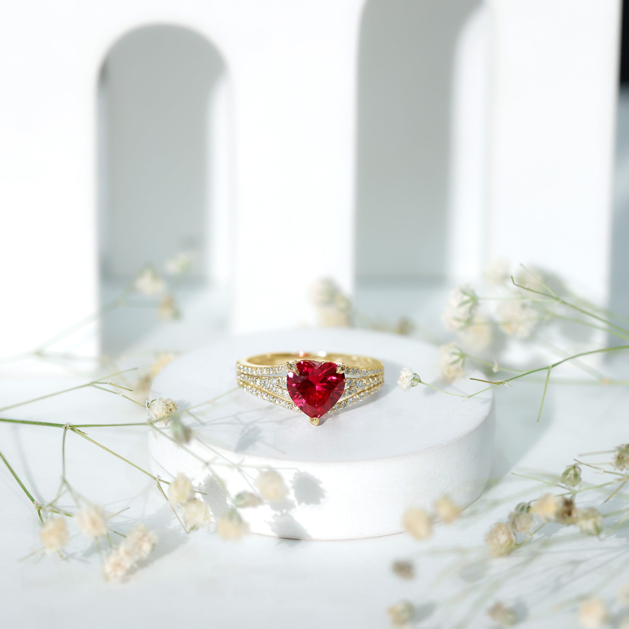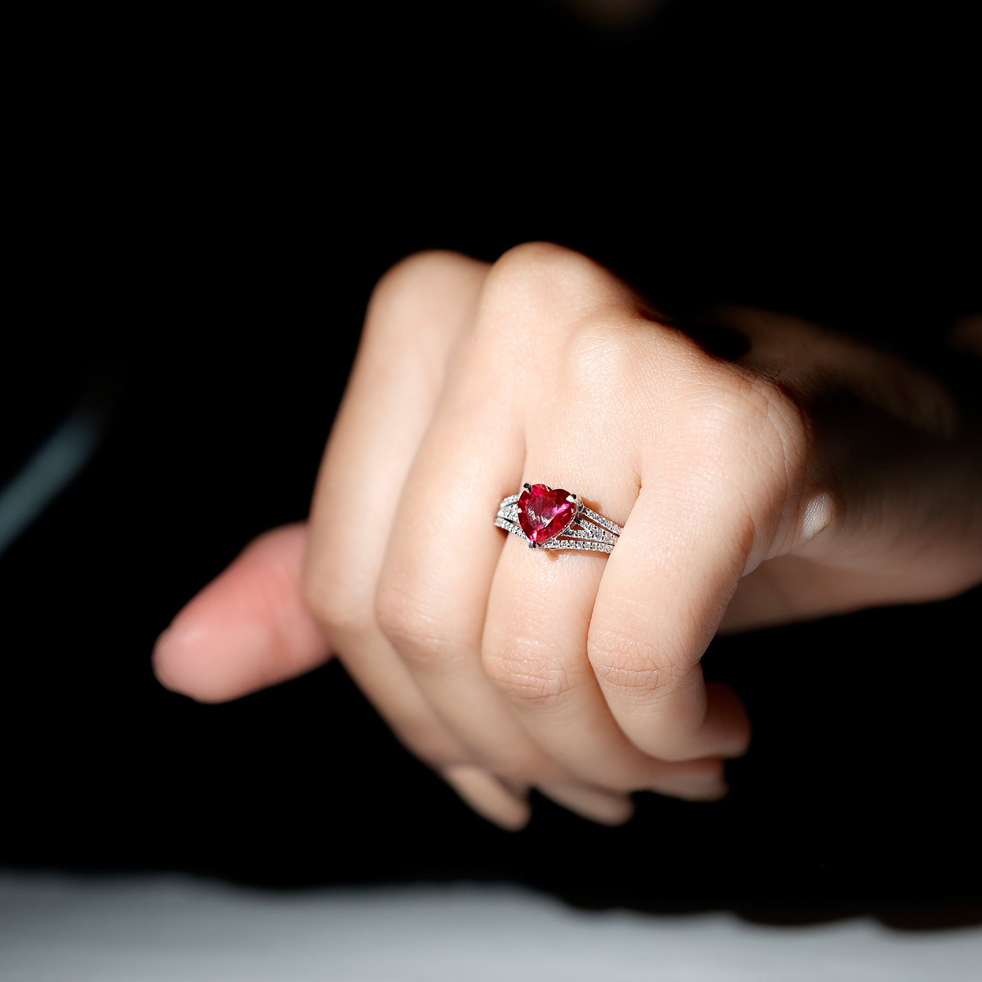 Heart Ruby Engagement Rings: Heart shaped ruby rings express your deep love and emotional connection. Crafted with prongs or protected by halo, your heart in ruby rings shines at its best with romance in every glance.