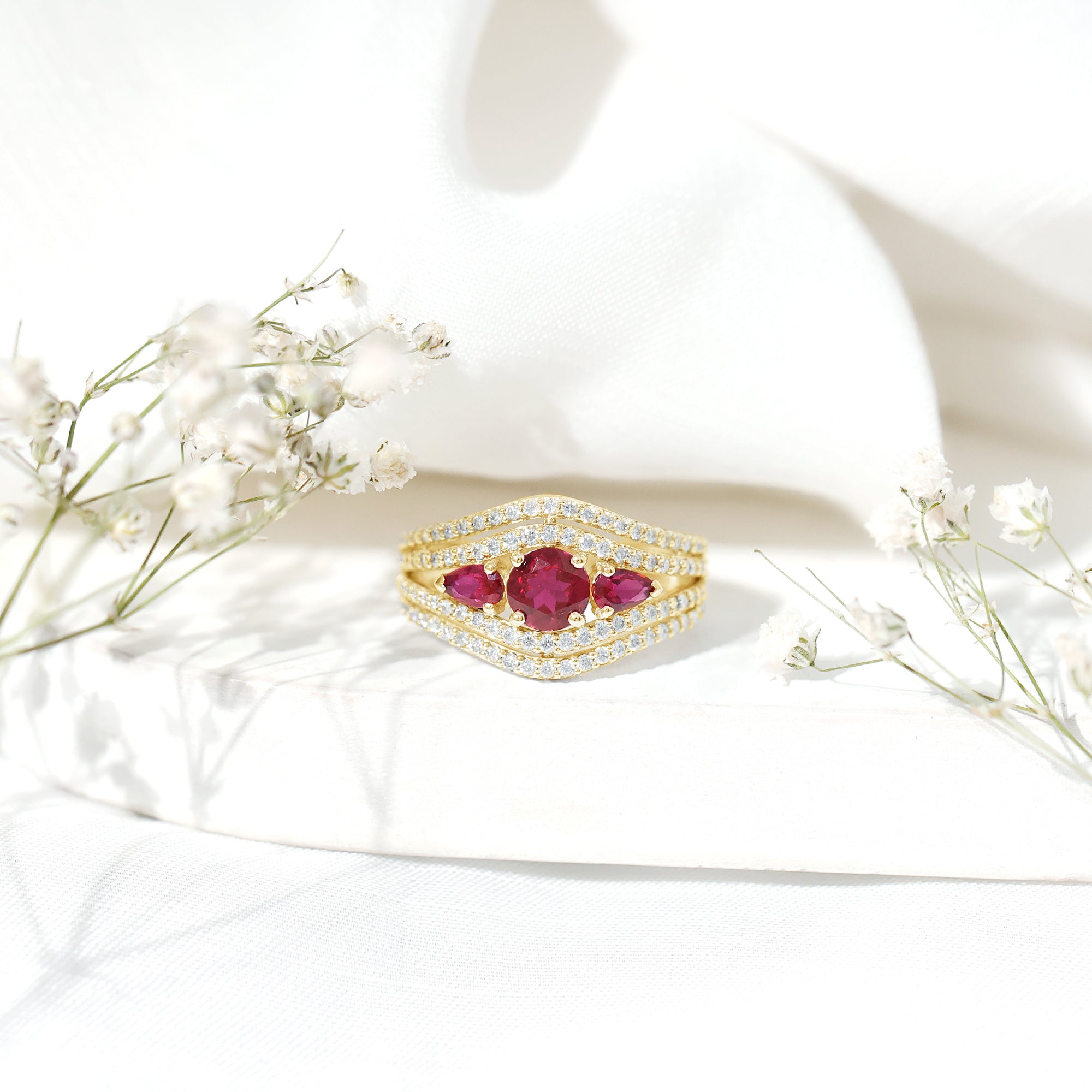 Three-Stone Ruby Rings: Past, present, and future of couples relationship is beautifully presented through these three stones of ruby rings. These can be similar or different stones placed closed together. The center ruby stone symbolizes the present moment, while the side stones are associated with past and future journeys.
