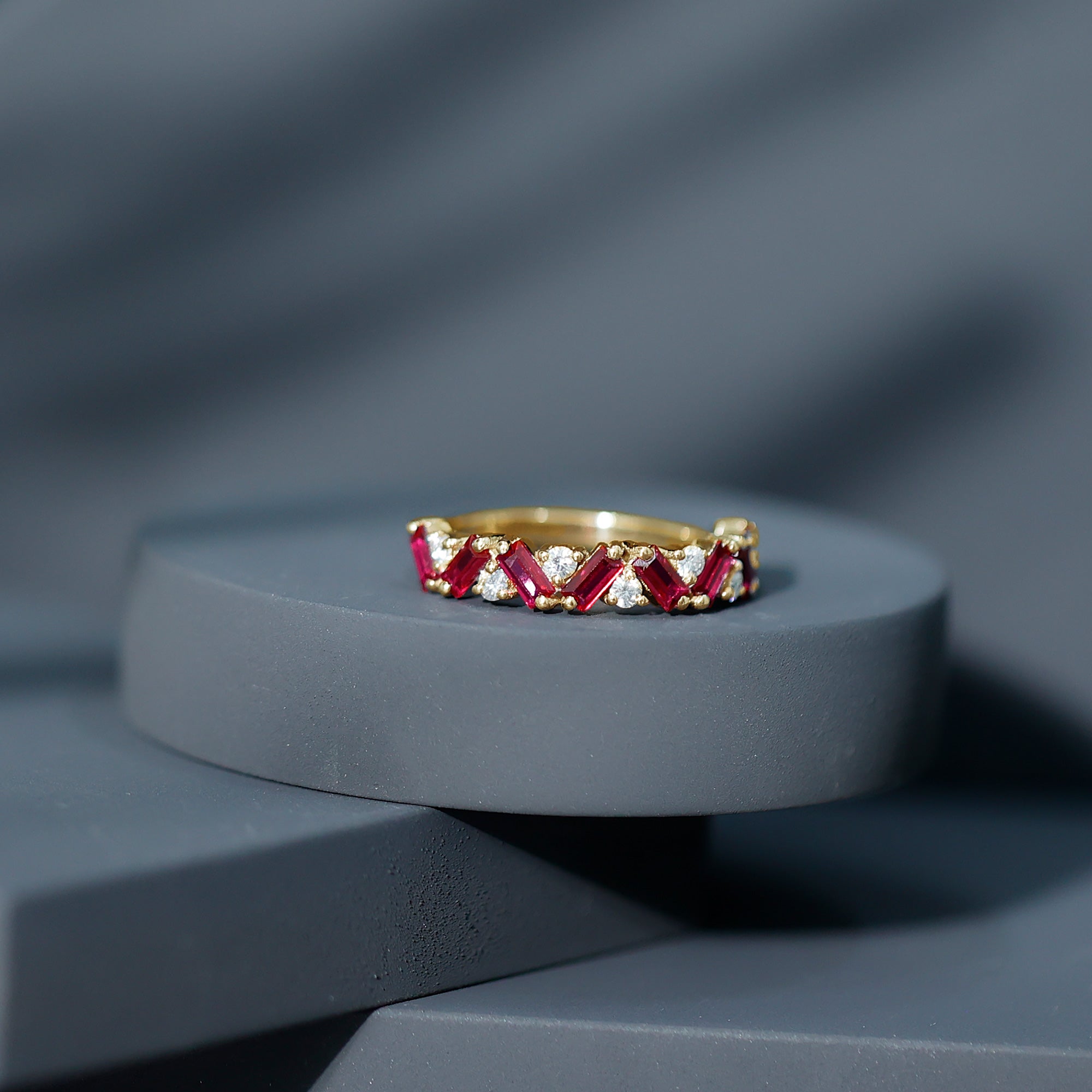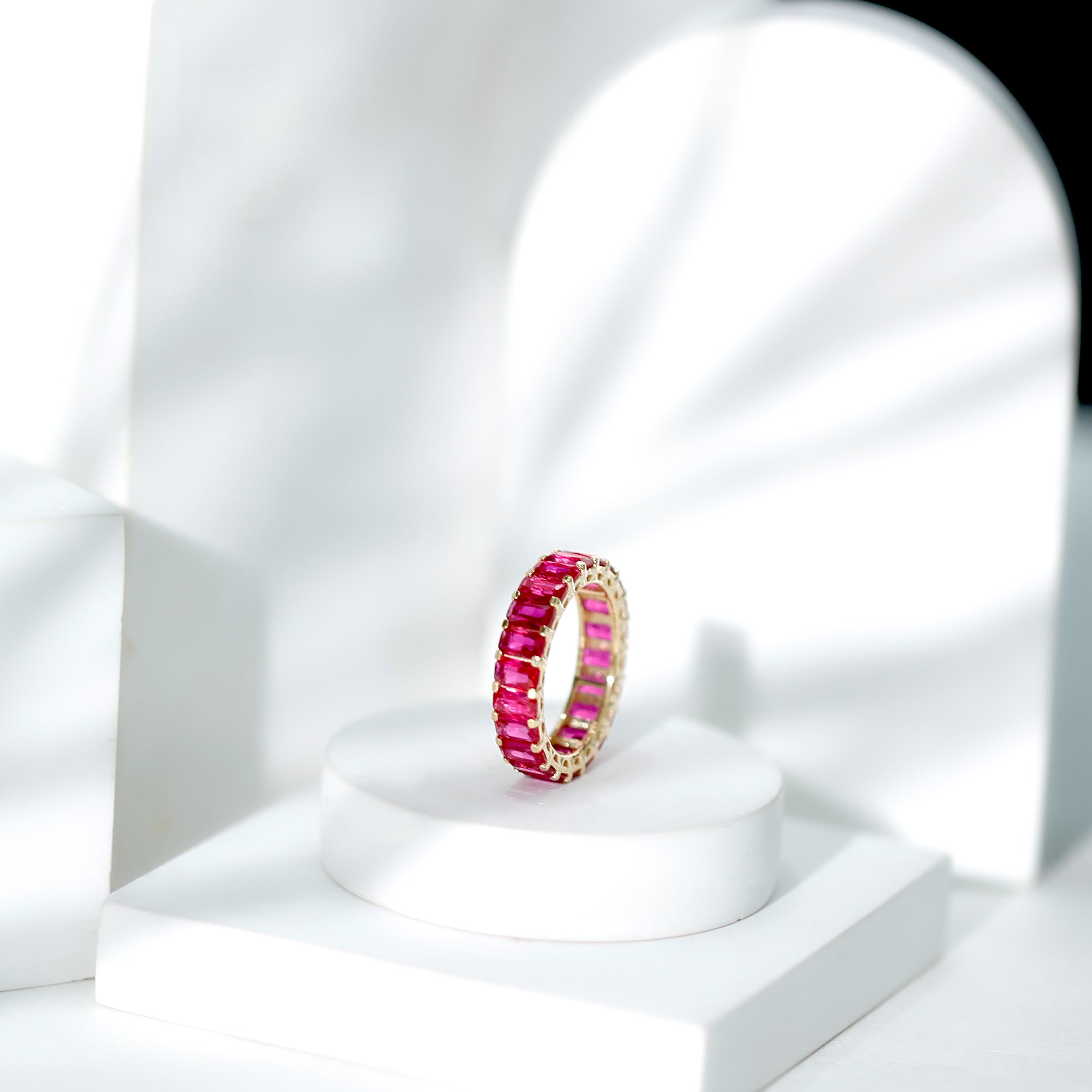Eternity Rings: Eternity rings are complete circles of precious metals and lab-grown rubies without any endpoints. Eternity rings are popular choices for major milestones like anniversaries and weddings. the presence of lab-grown ruby all the way round to synthetic ruby ring with identical shape looks appealing.