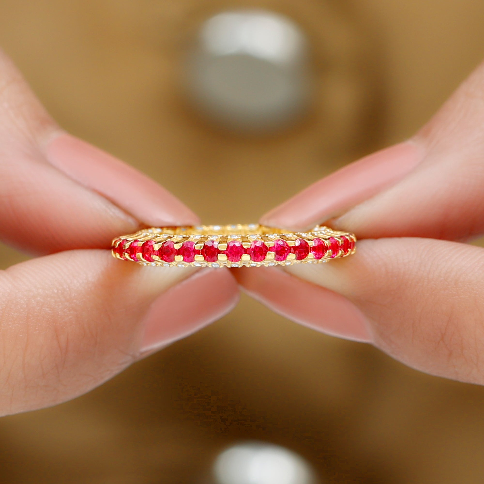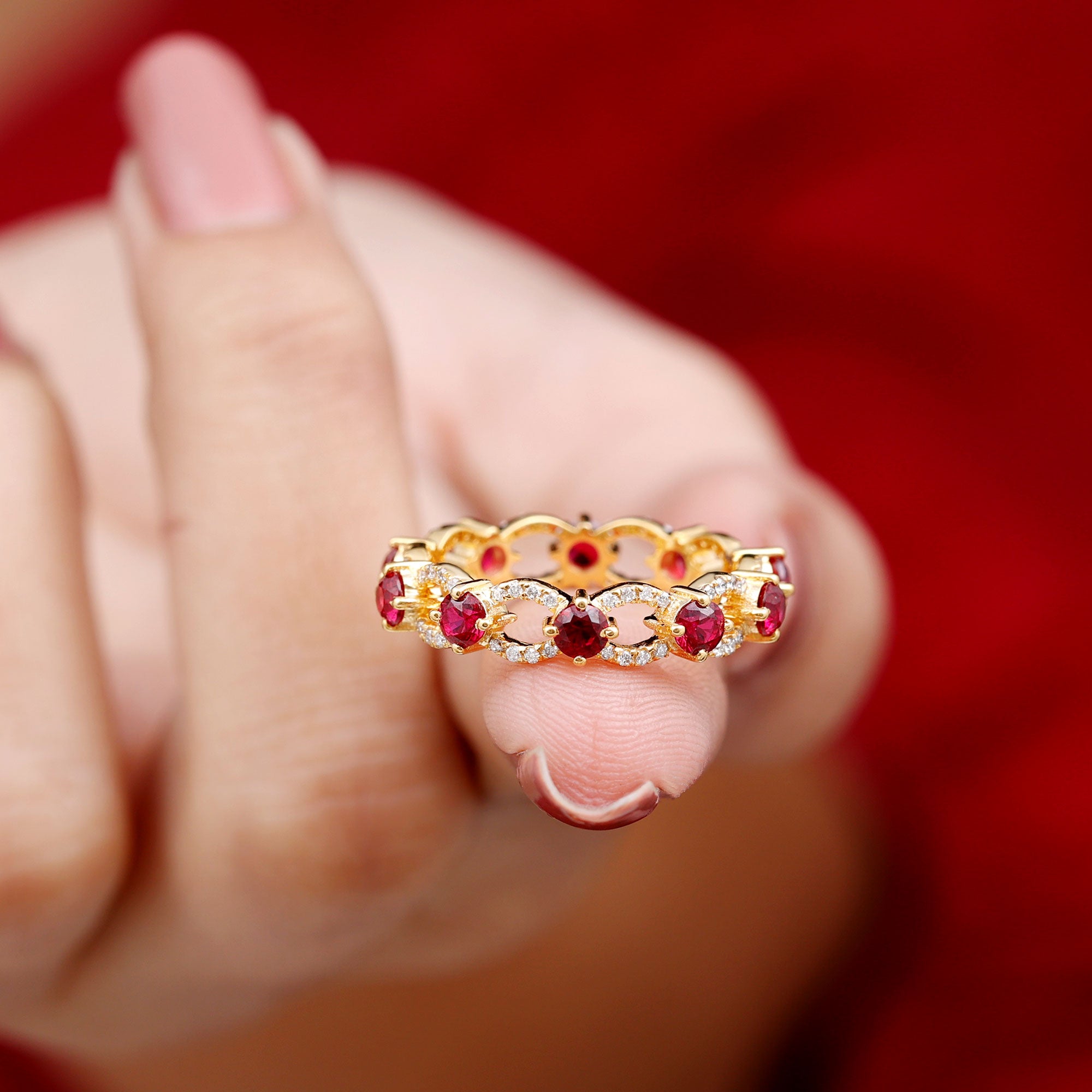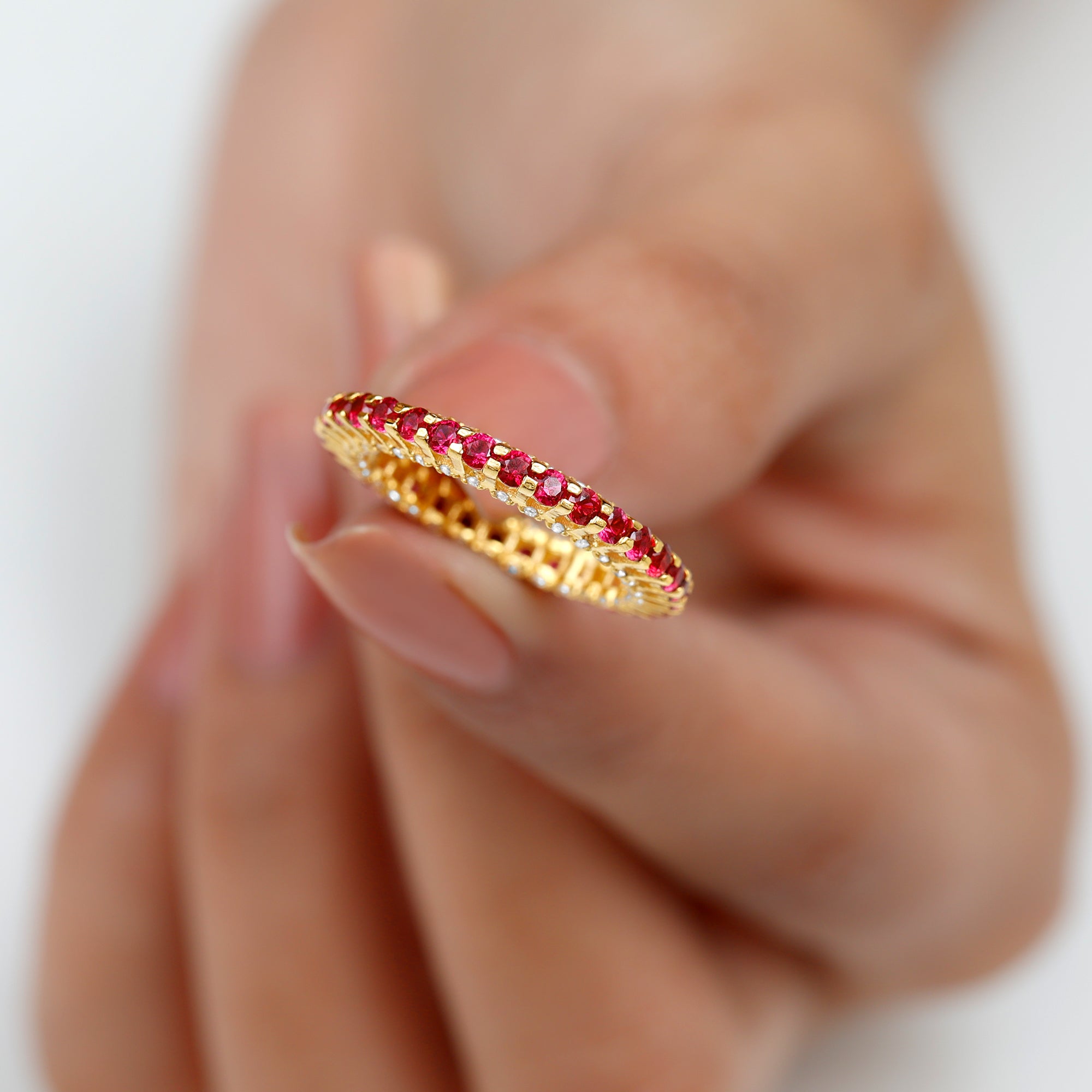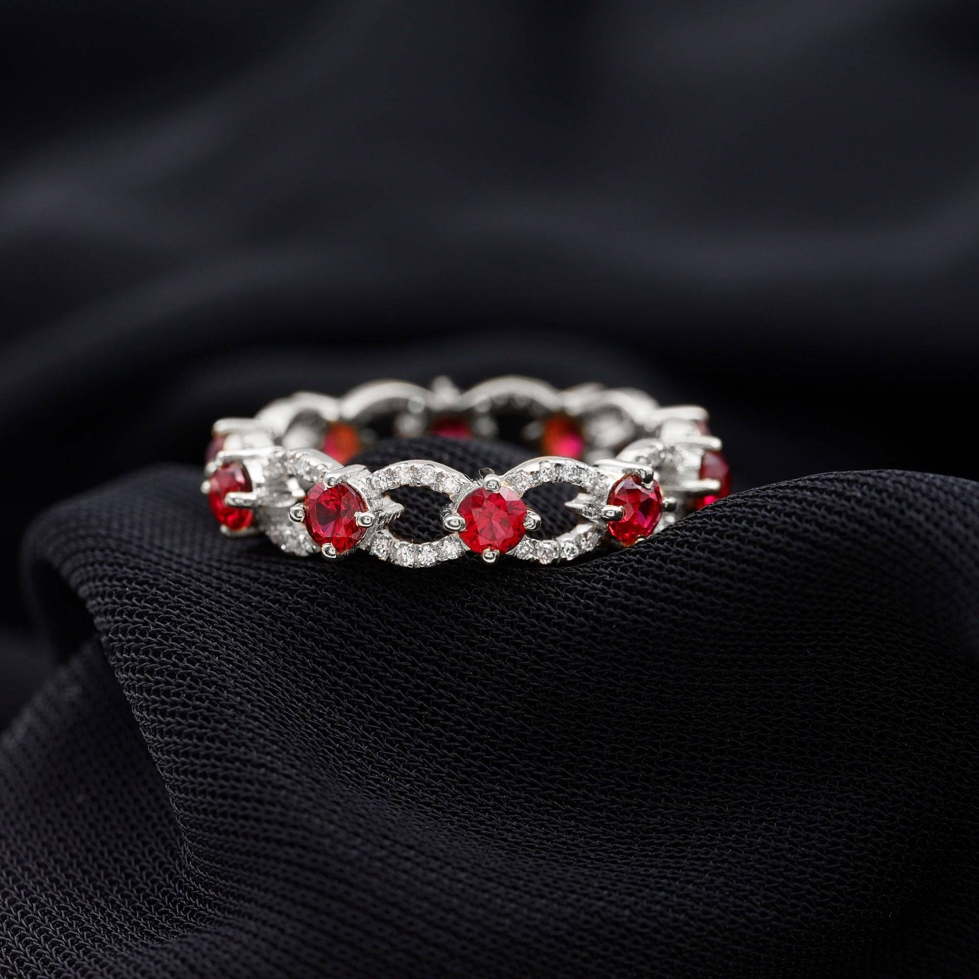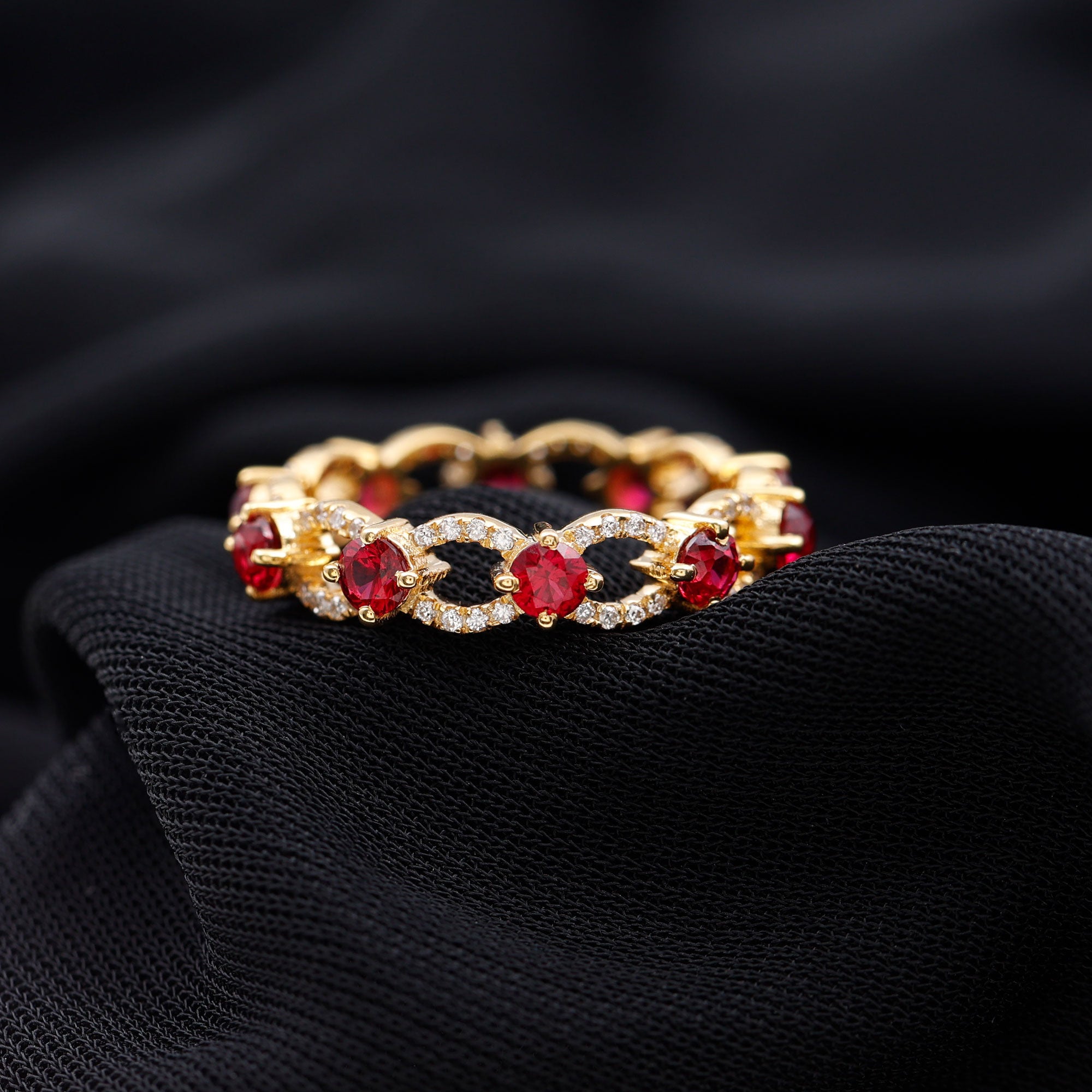 1. Eternity Rings: Eternity rings are complete circles of precious metals and lab-grown rubies without any endpoints. Eternity rings are popular choices for major milestones like anniversaries and weddings. the presence of lab-grown ruby all the way round to synthetic ruby ring with identical shape looks appealing.