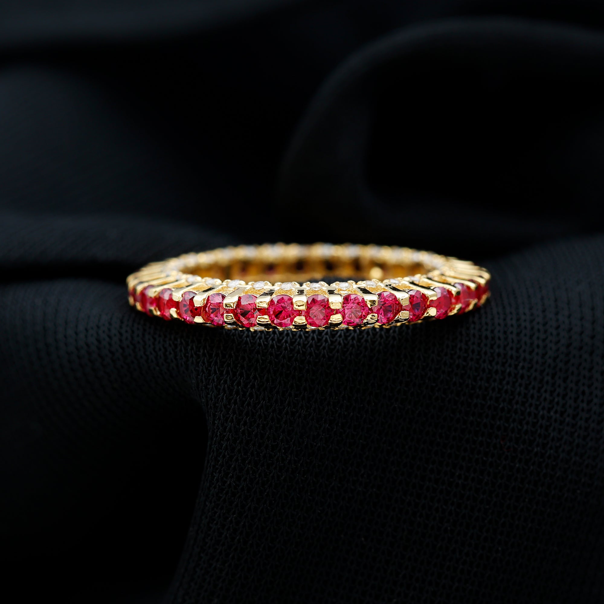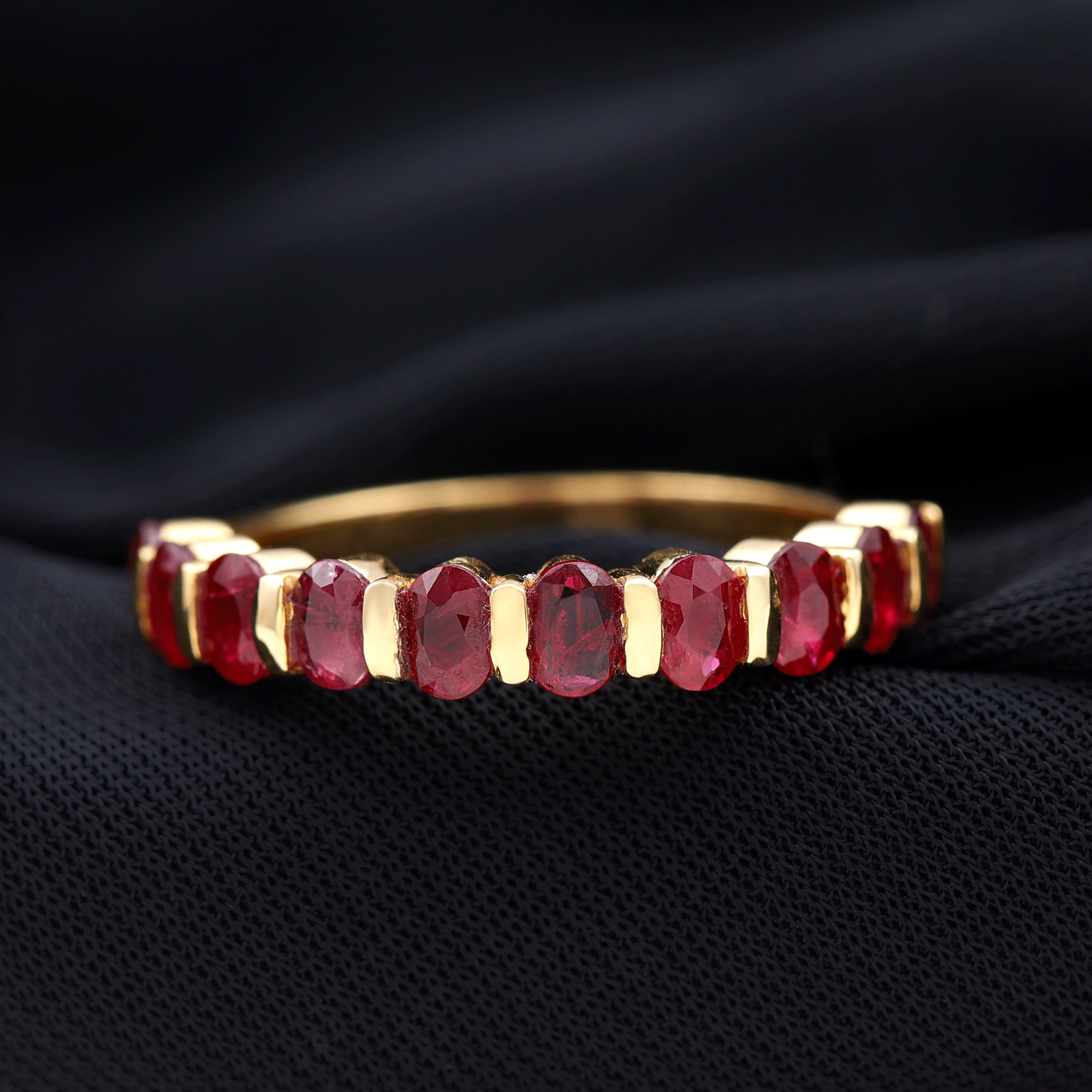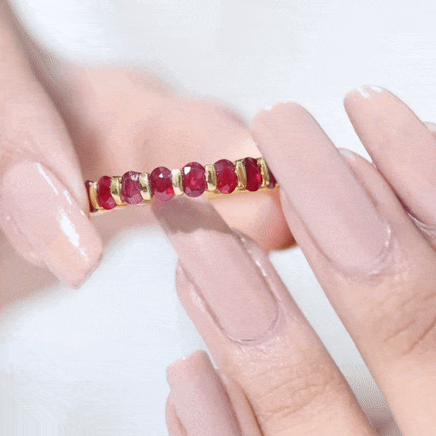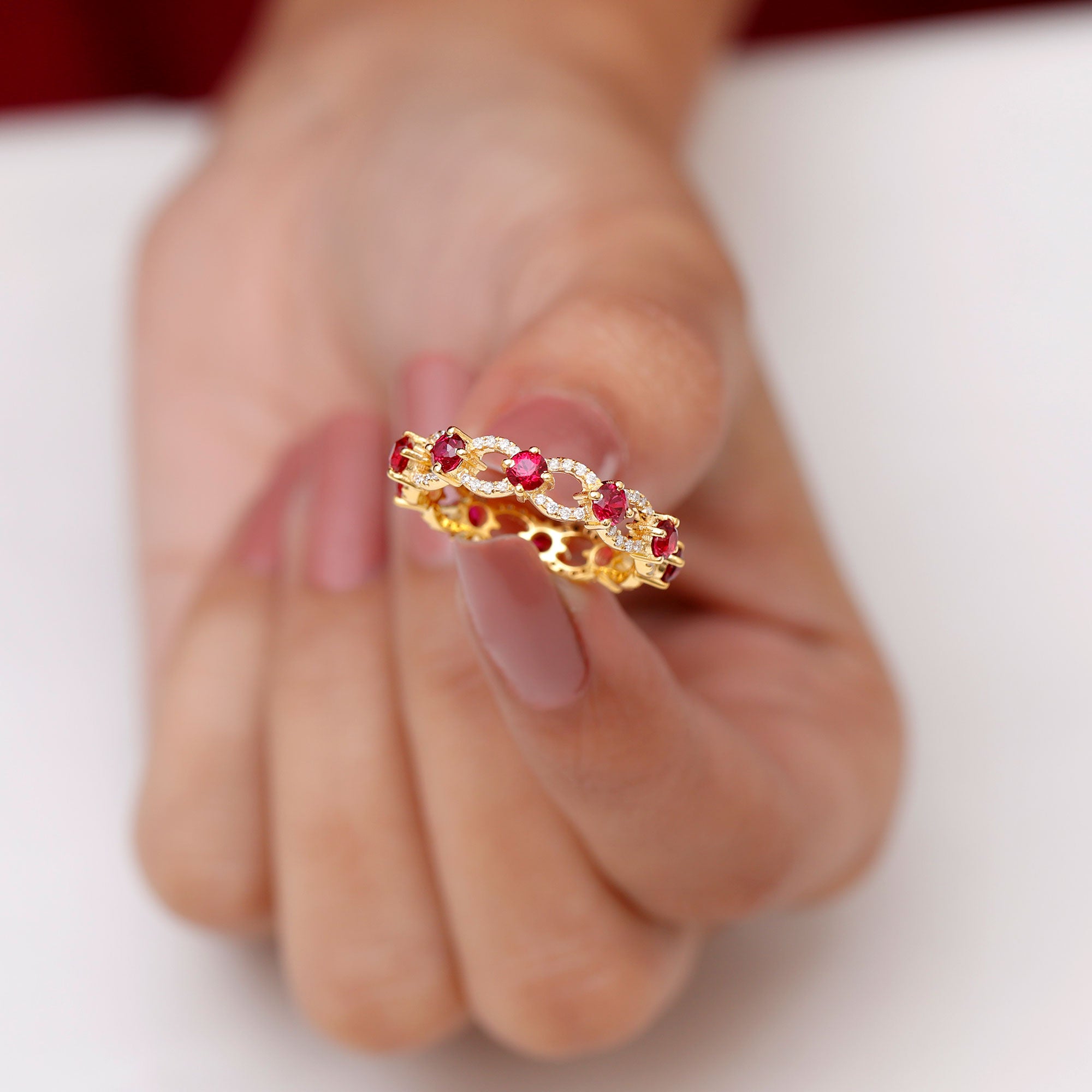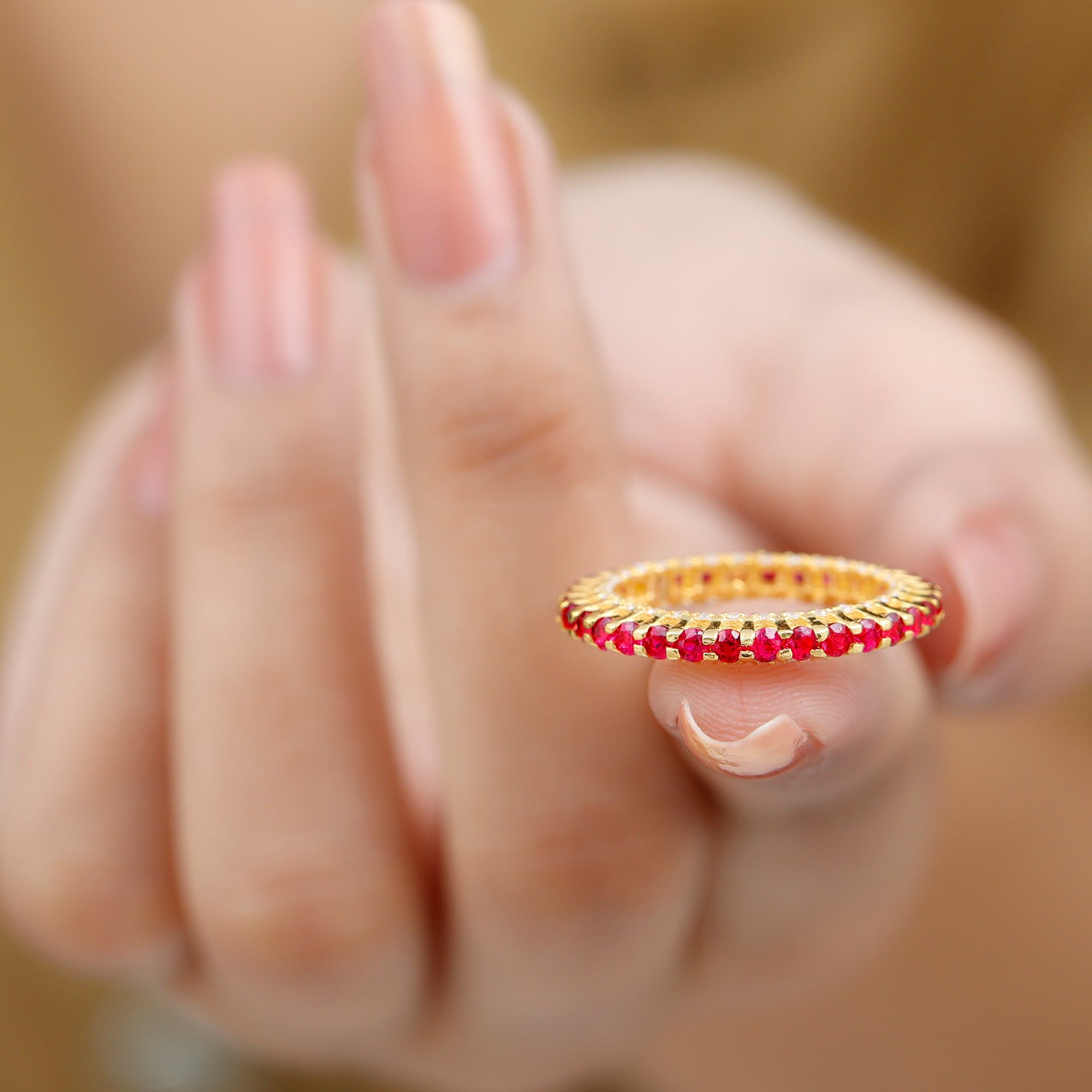 1. Eternity Rings: Eternity rings are complete circles of precious metals and lab-grown rubies without any endpoints. Eternity rings are popular choices for major milestones like anniversaries and weddings. the presence of lab-grown ruby all the way round to synthetic ruby ring with identical shape looks appealing.