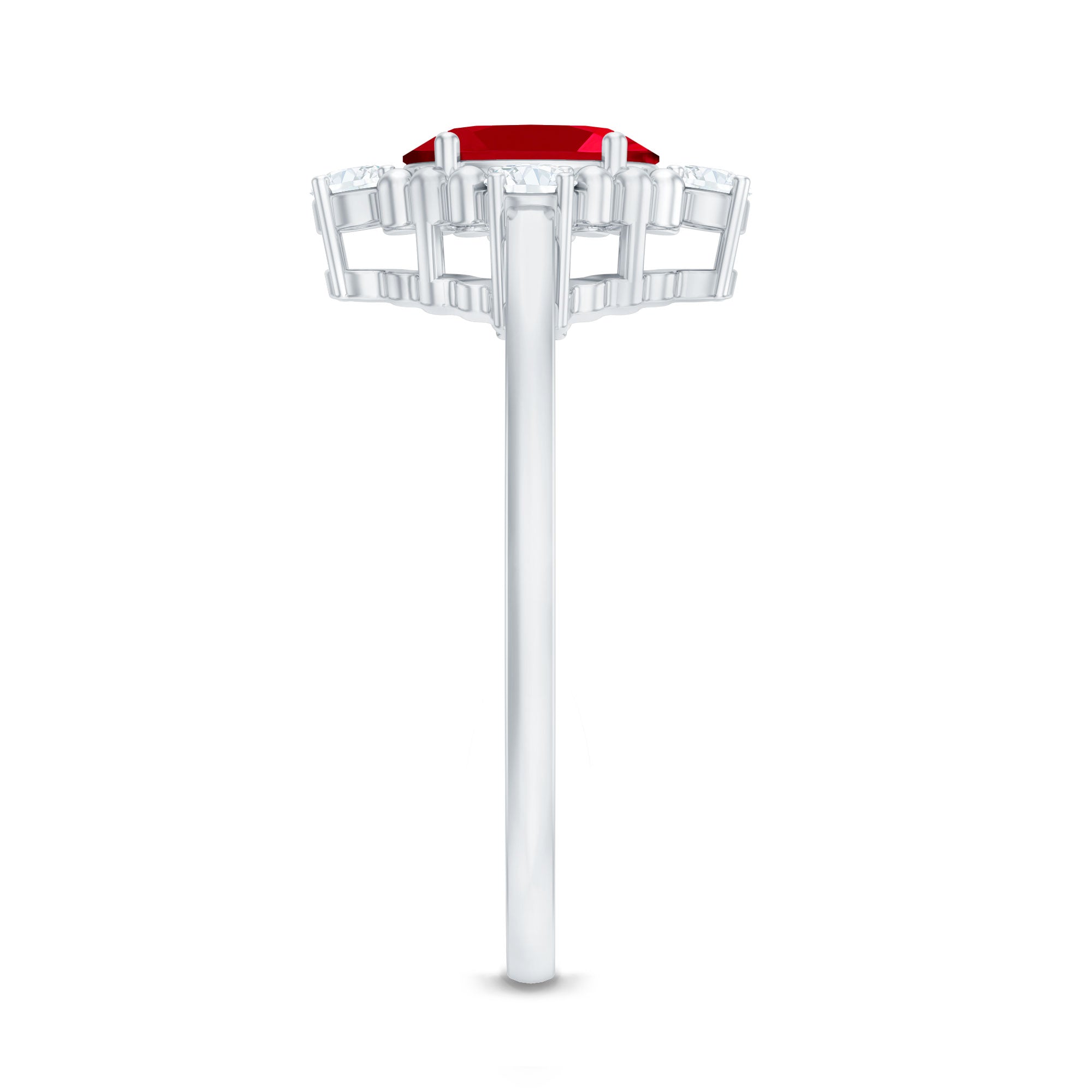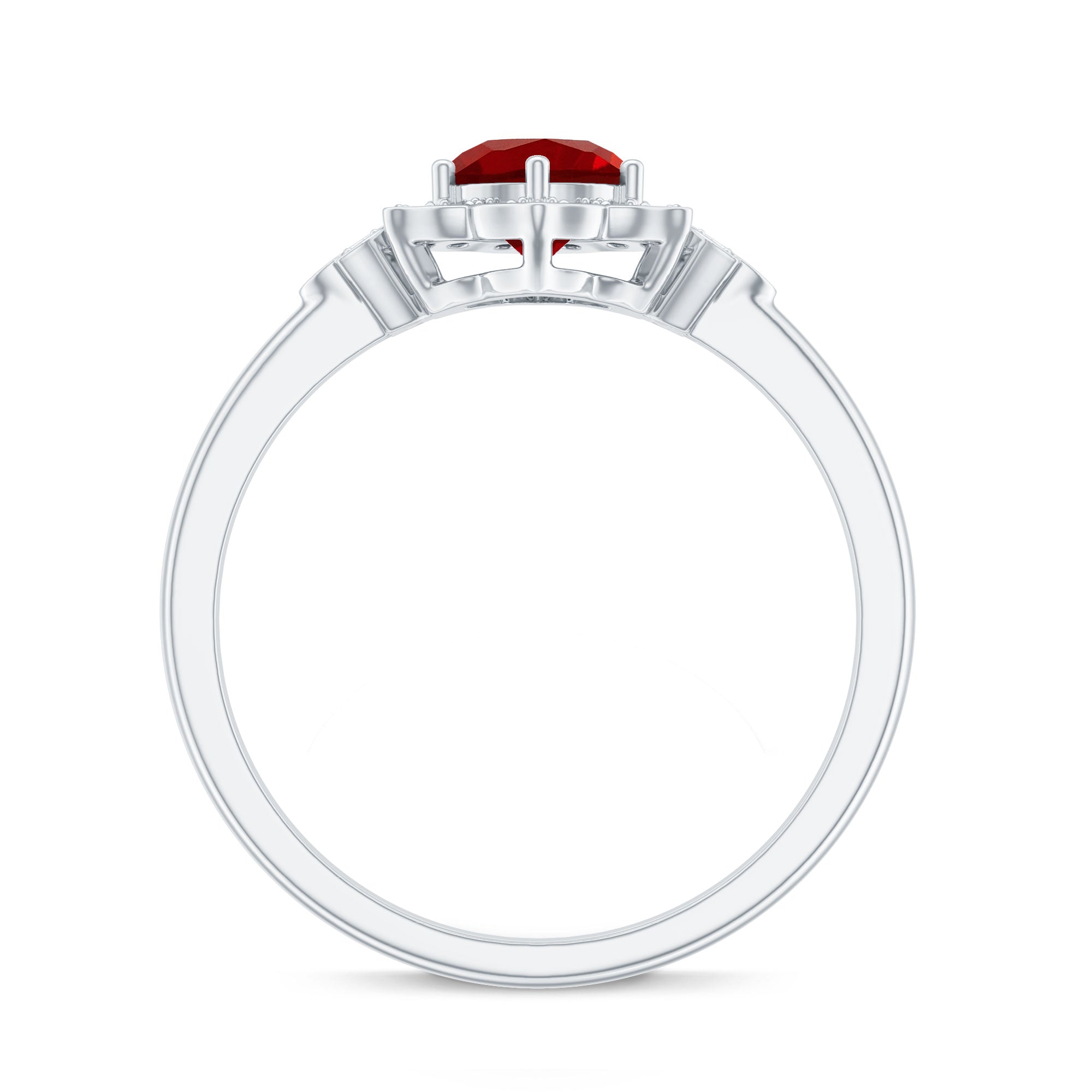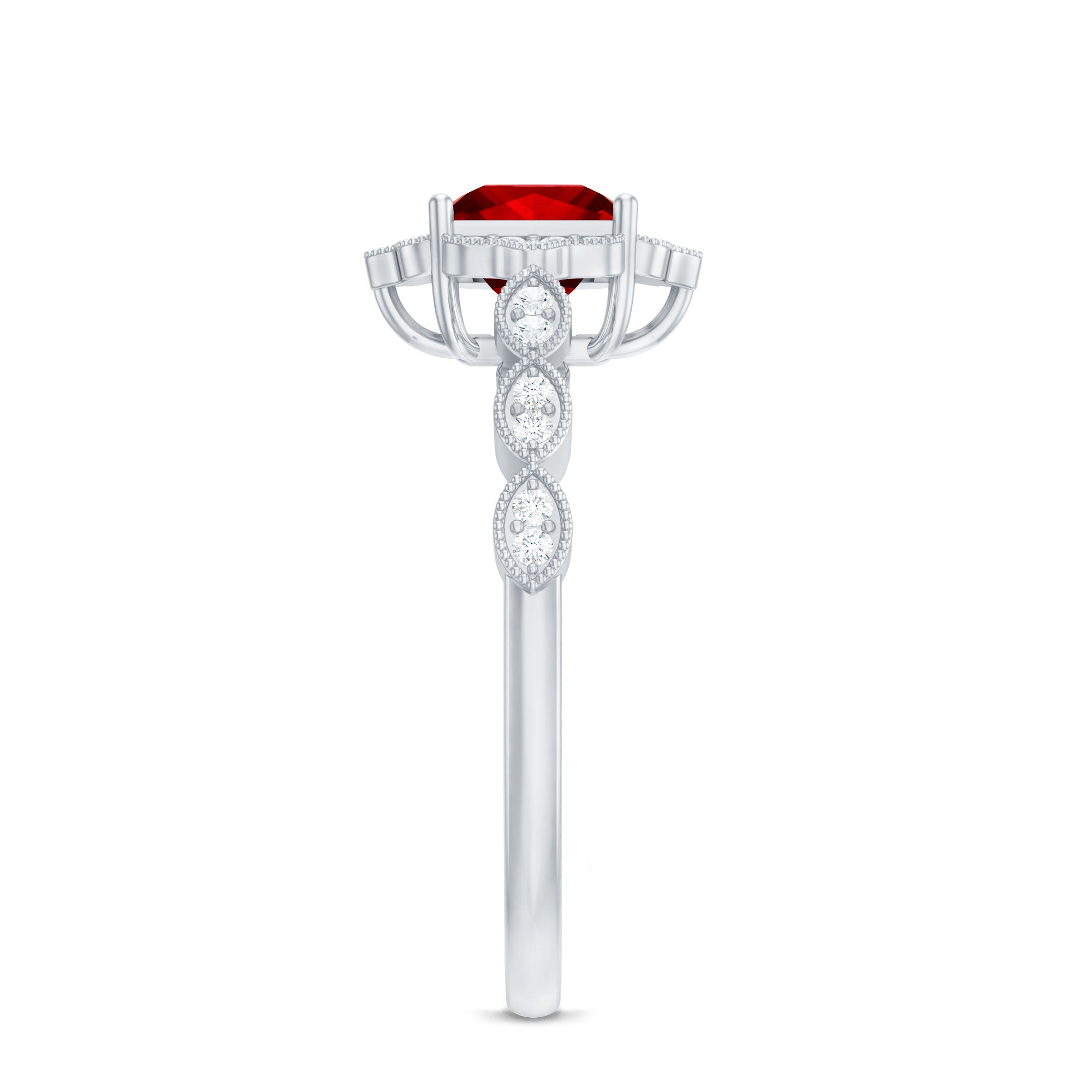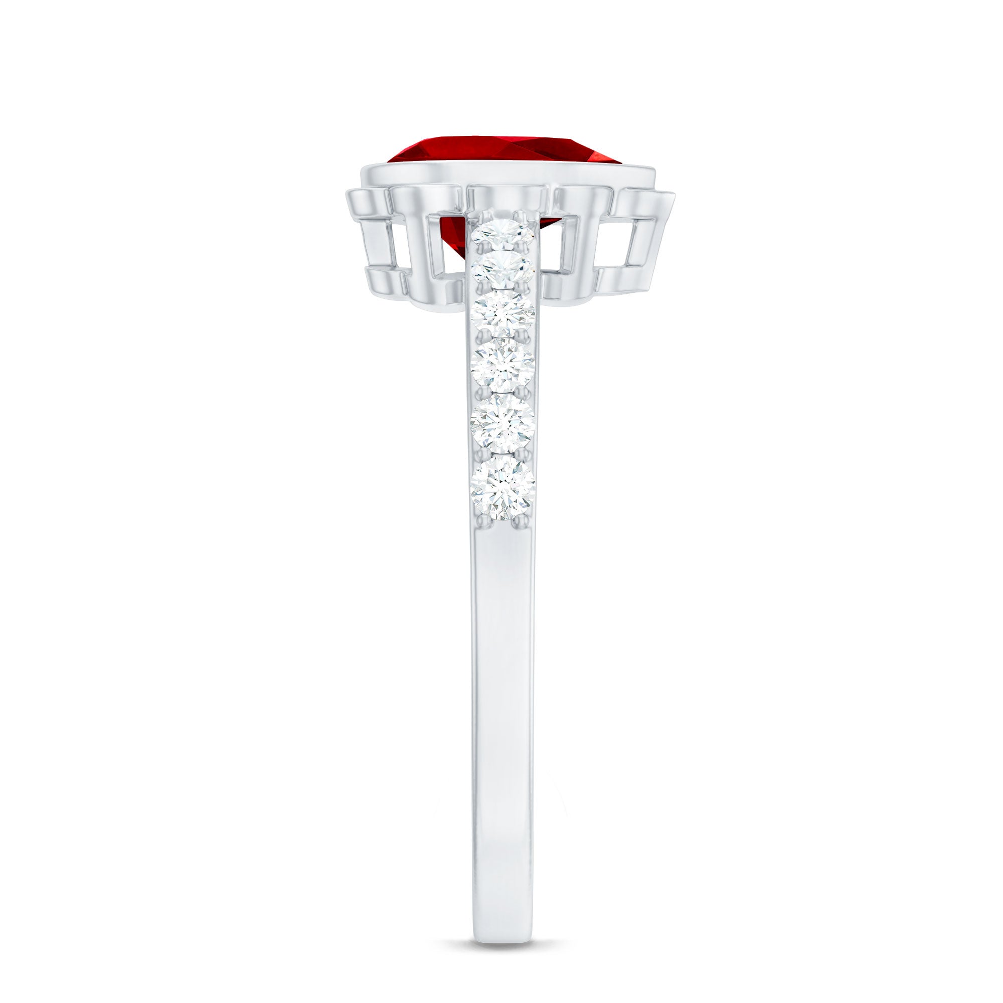 Halo Engagement Rings are beautiful designs for those looking for an affordable alternative to solitaire rings. Small solitaire ruby gemstones are placed between a circle of small gemstones, creating beautiful designs. The side stones may be rubies, diamond accents, or other gemstones, opening design options in artificial ruby rings.