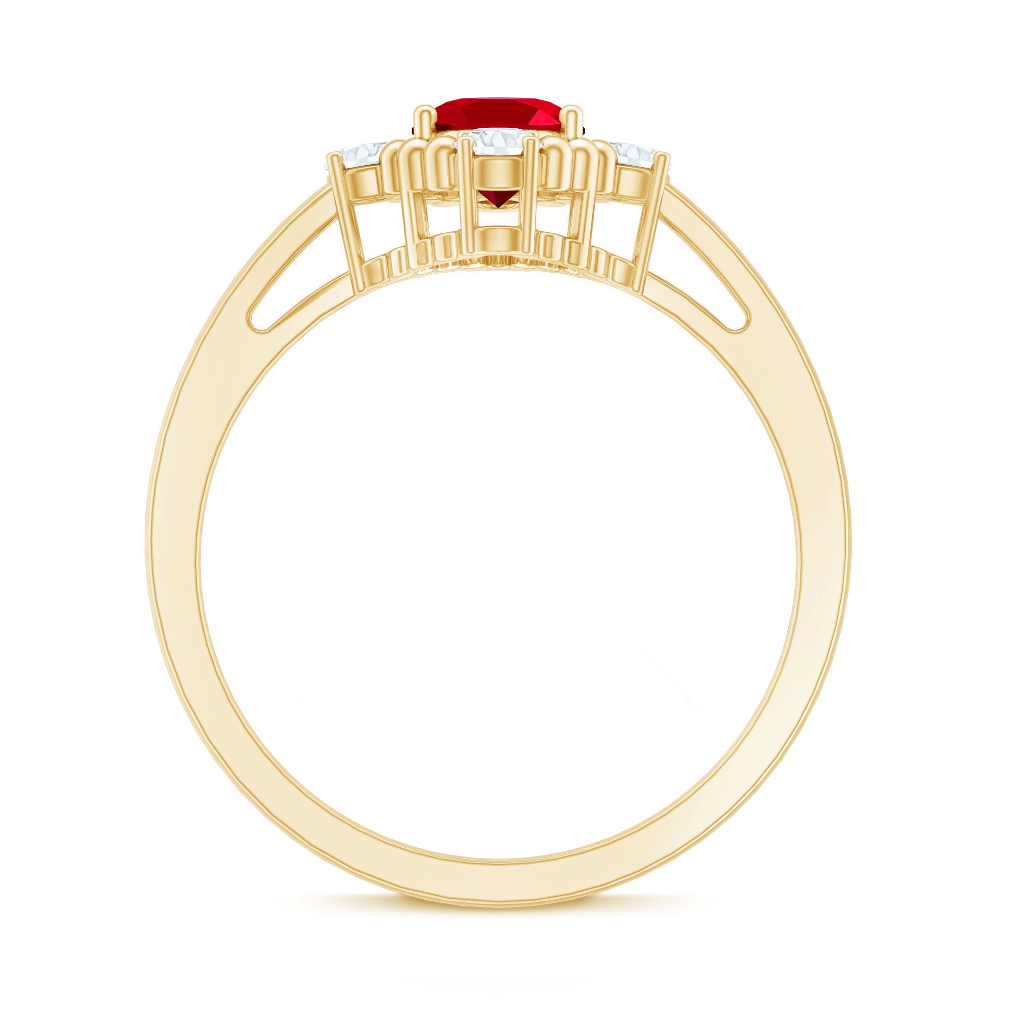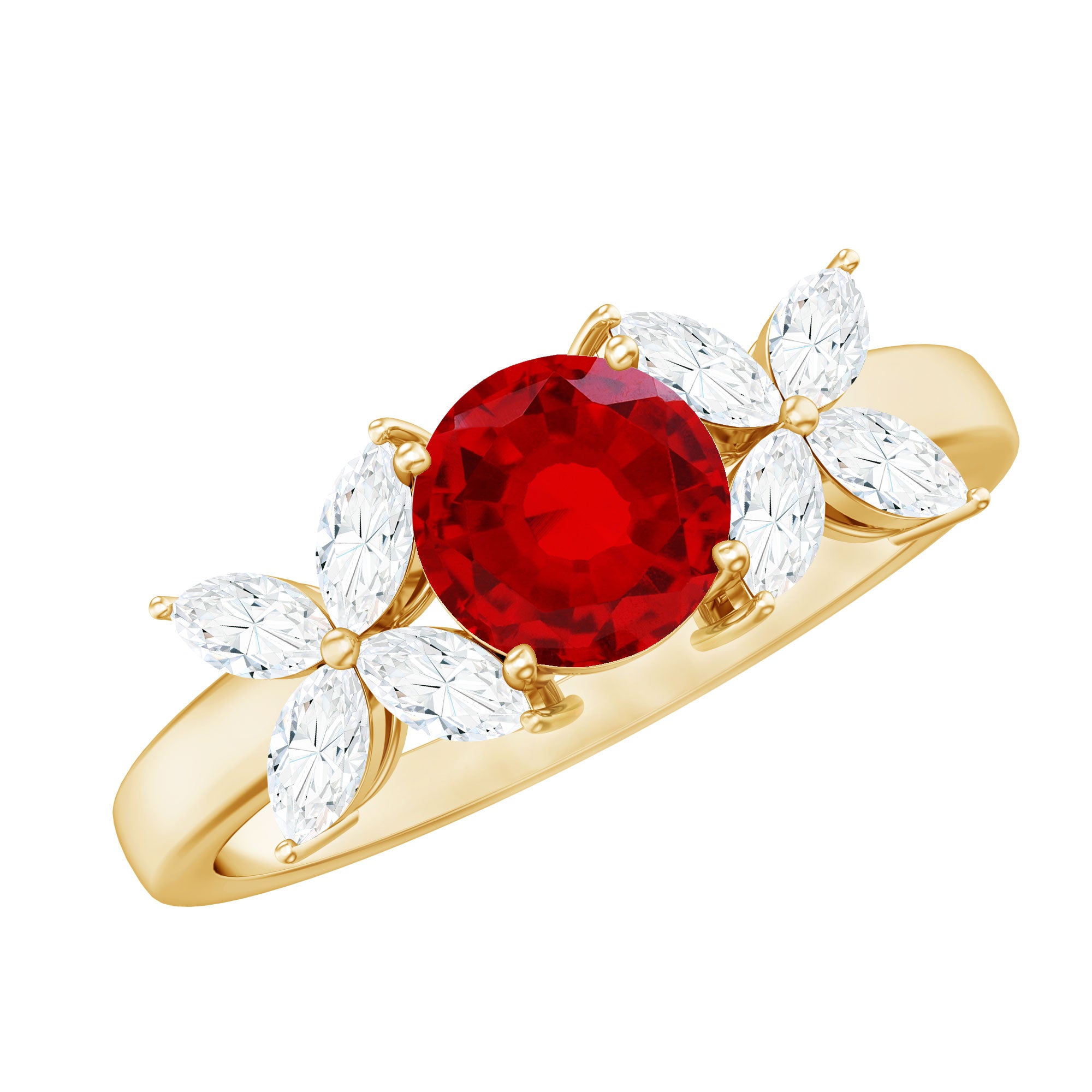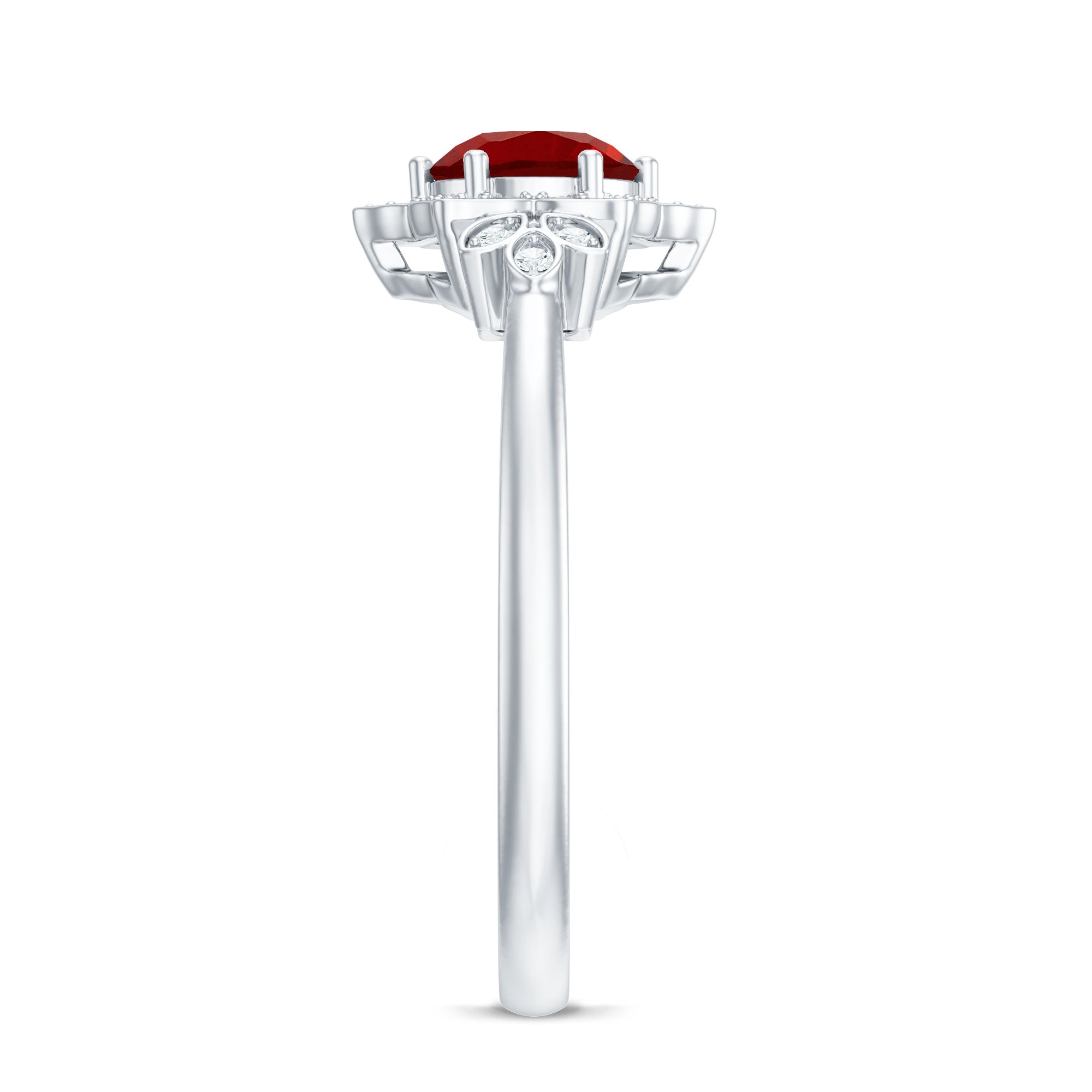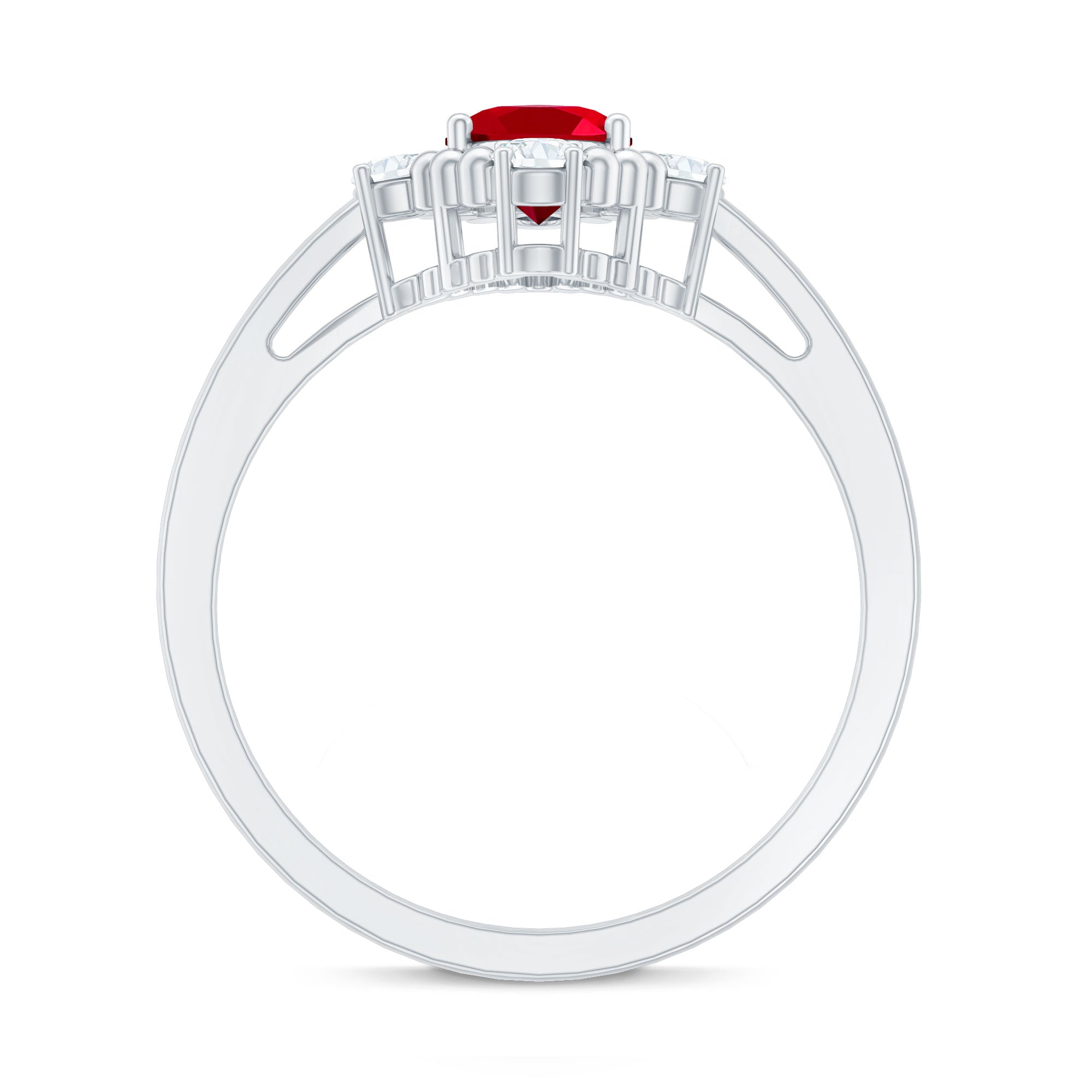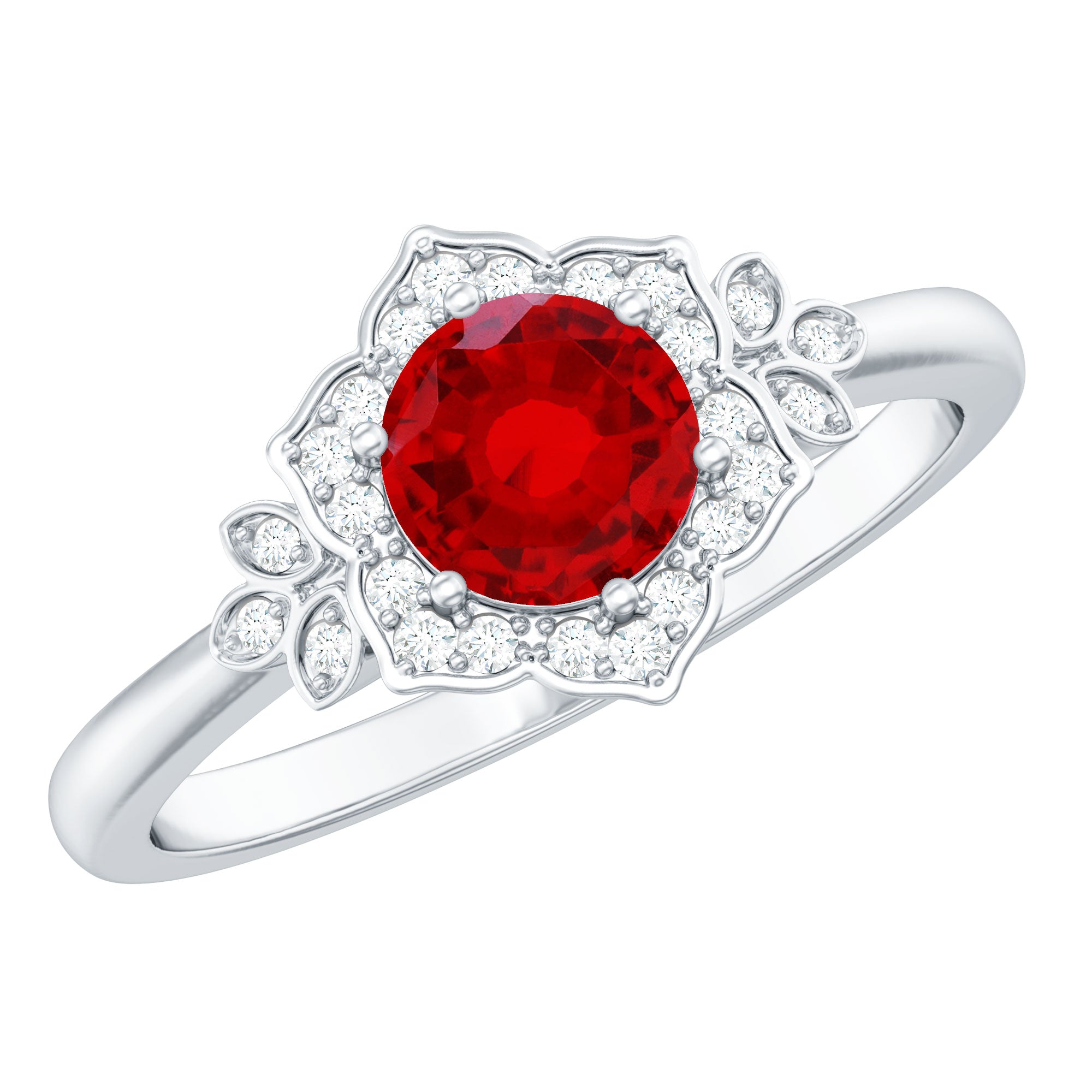 Halo Engagement Rings are beautiful designs for those looking for an affordable alternative to solitaire rings. Small solitaire ruby gemstones are placed between a circle of small gemstones, creating beautiful designs. The side stones may be rubies, diamond accents, or other gemstones, opening design options in artificial ruby rings.