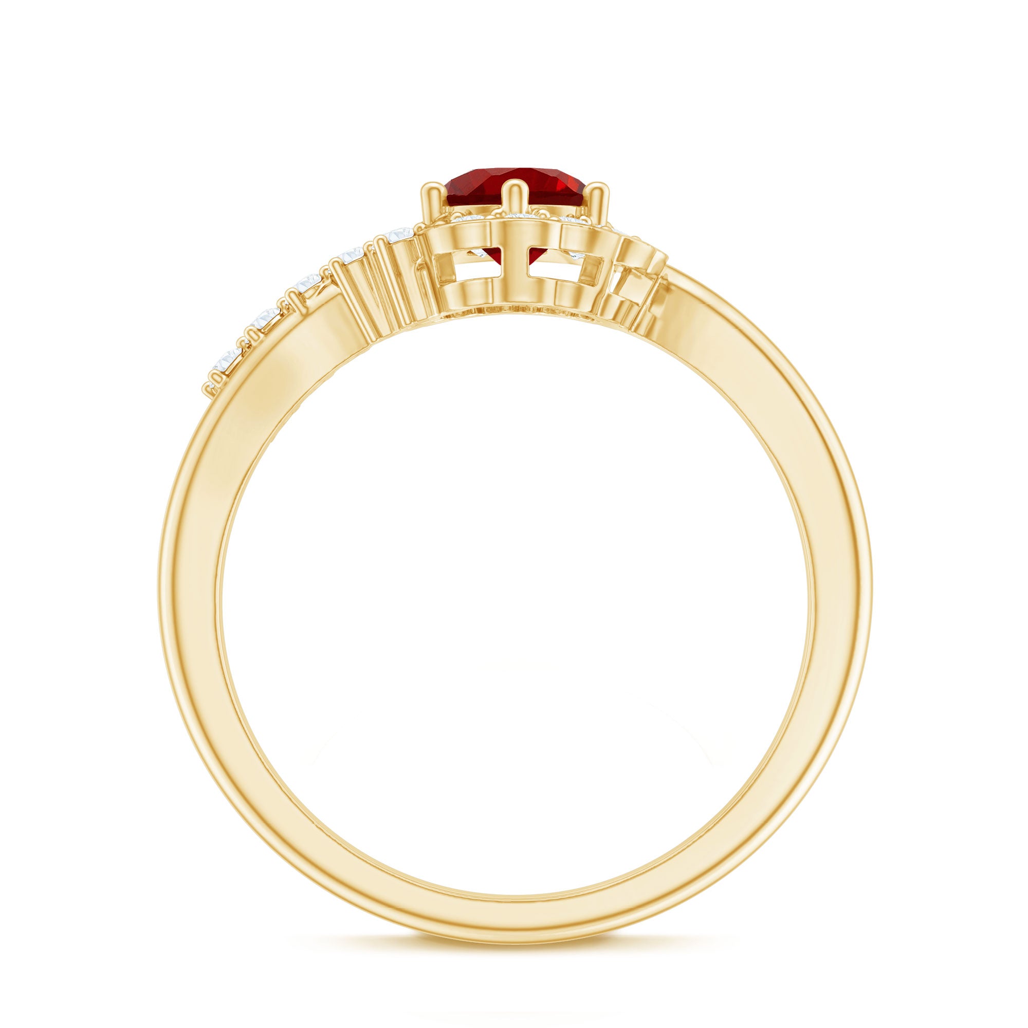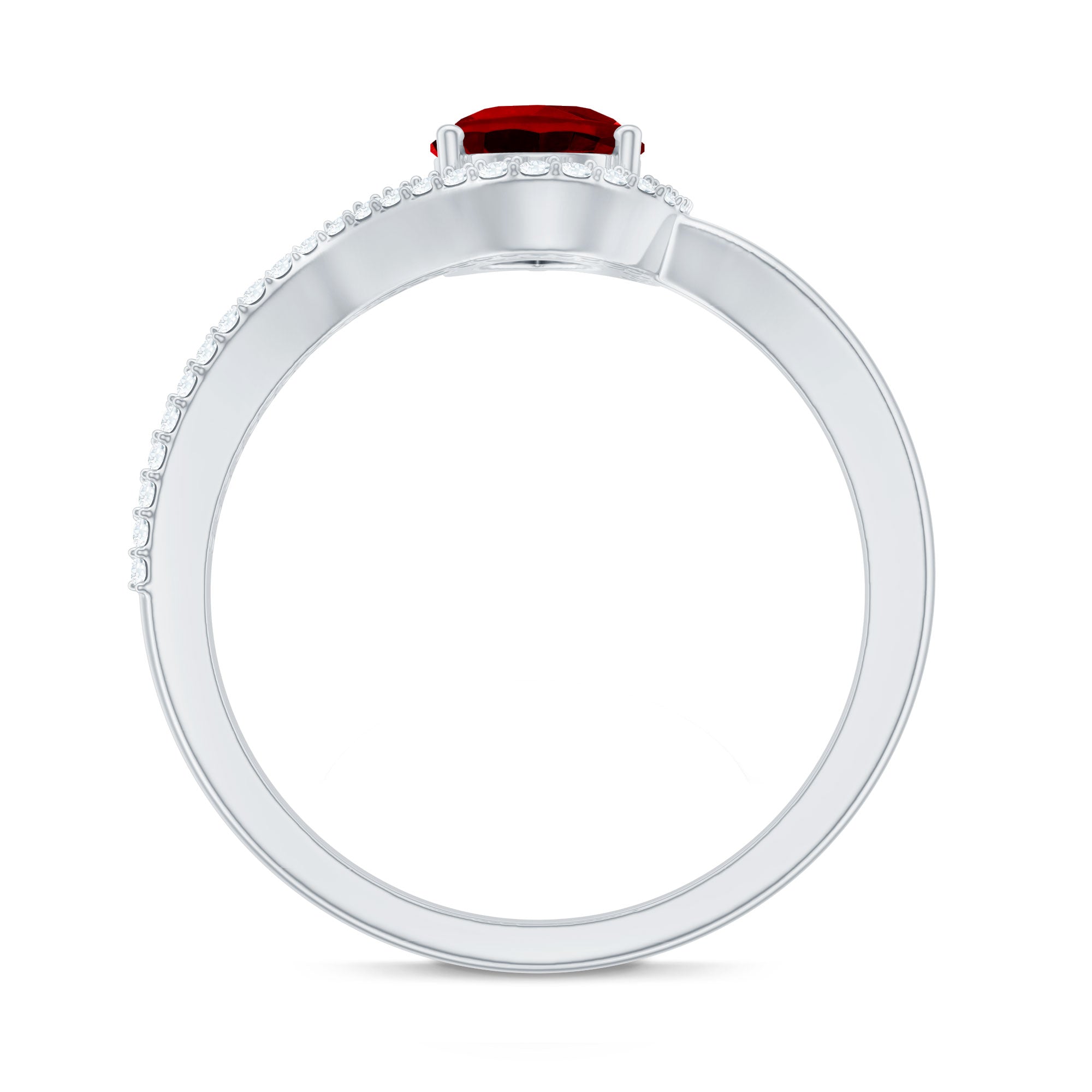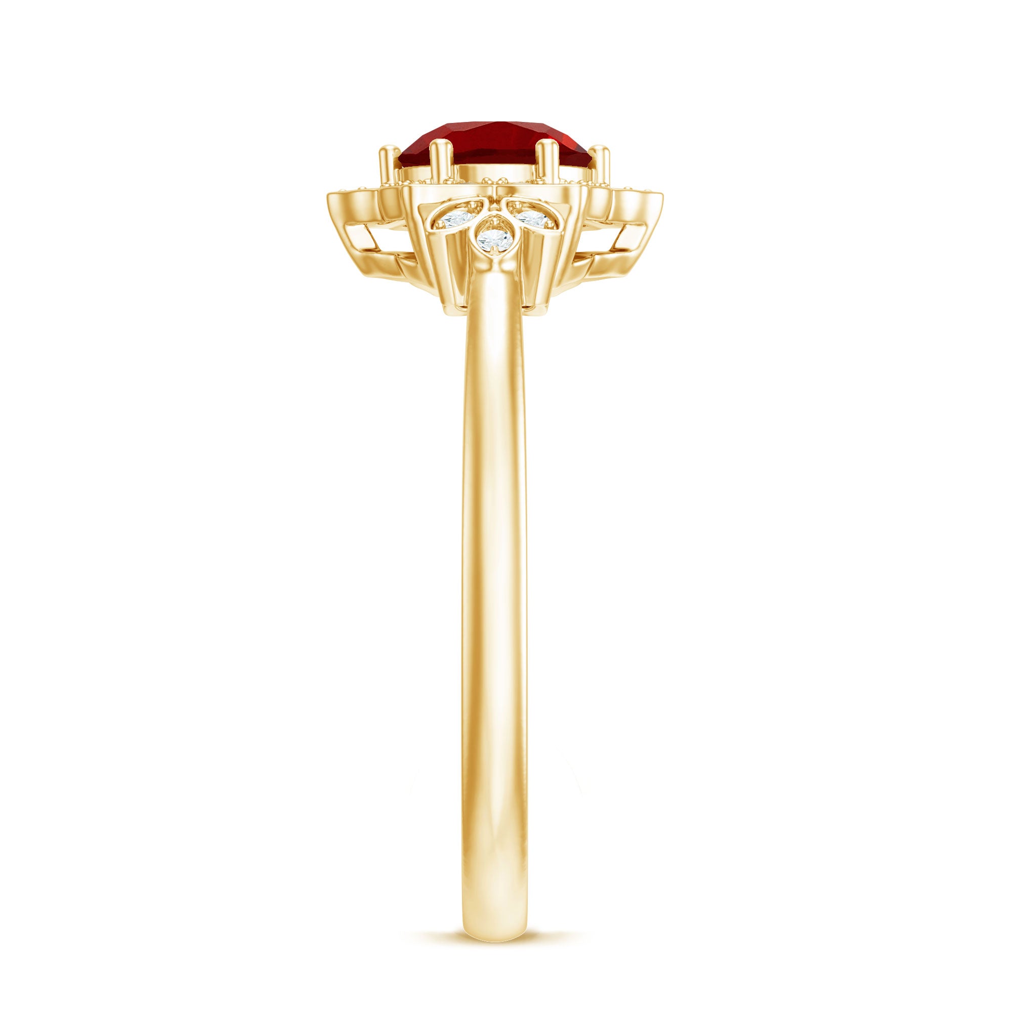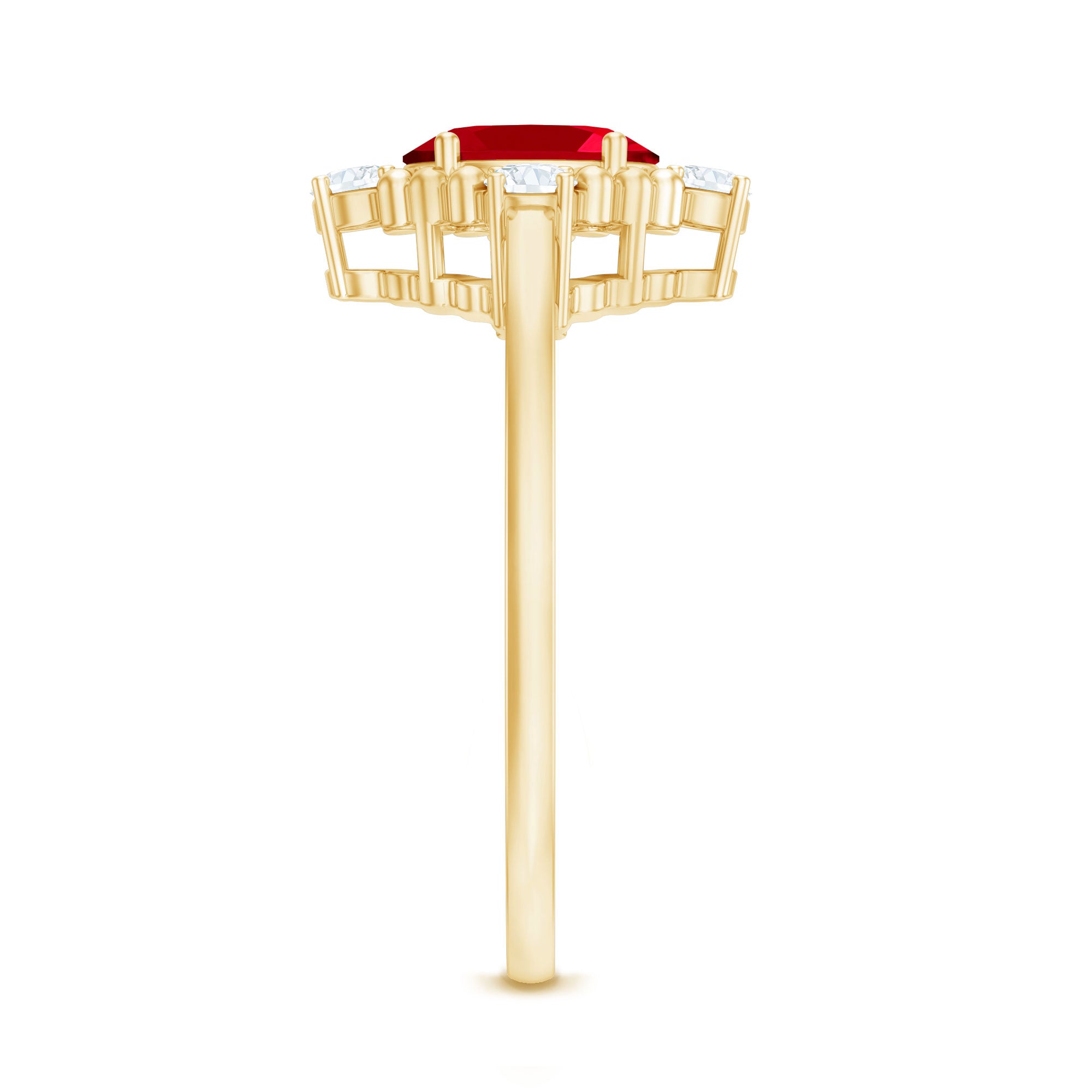 Halo Engagement Rings are beautiful designs for those looking for an affordable alternative to solitaire rings. Small solitaire ruby gemstones are placed between a circle of small gemstones, creating beautiful designs. The side stones may be rubies, diamond accents, or other gemstones, opening design options in artificial ruby rings.