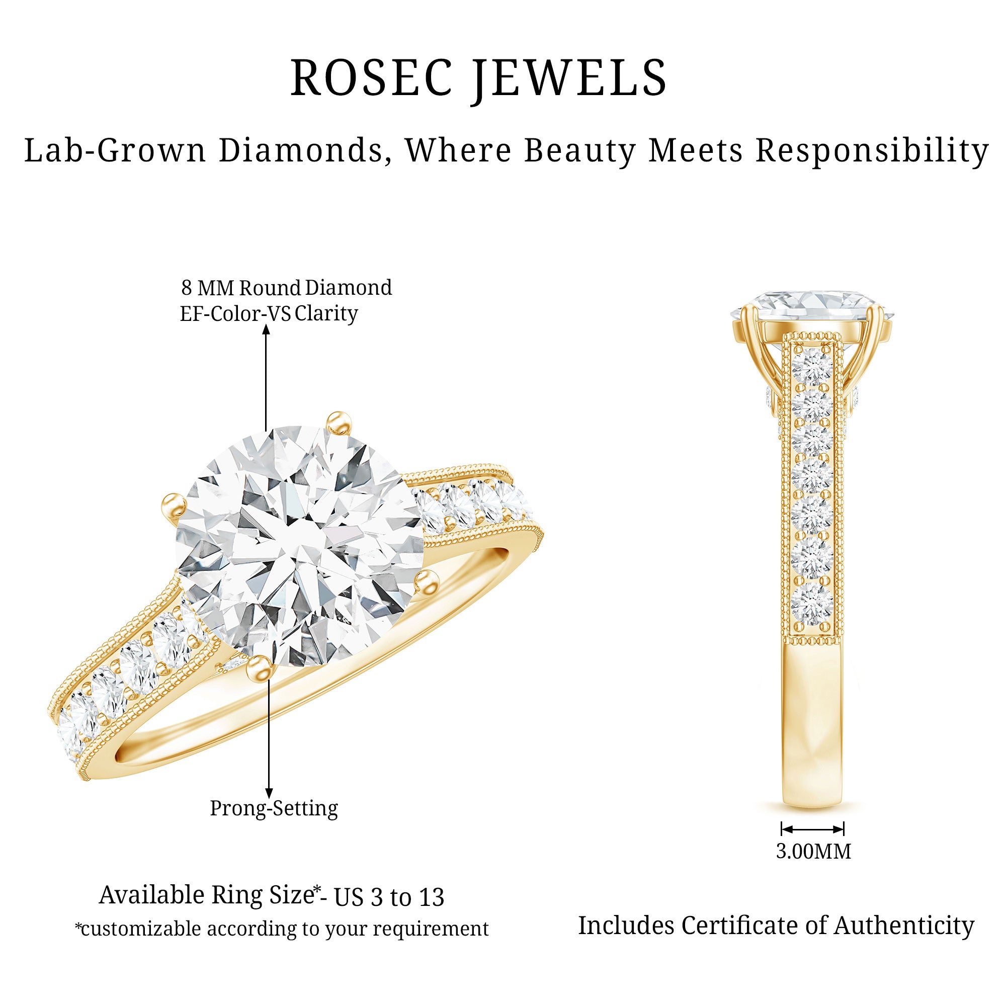 Vintage-Inspired Engagement Rings: Rosec Jewels is an expert in the craftsmanship of vintage-inspired rings. As we know, vintage rings feature filigree, beads, and other vintage designs on bands. Lab-created diamond rings feature engraved vine patterns, floral designs, or bead detailing inspired by vintage times.