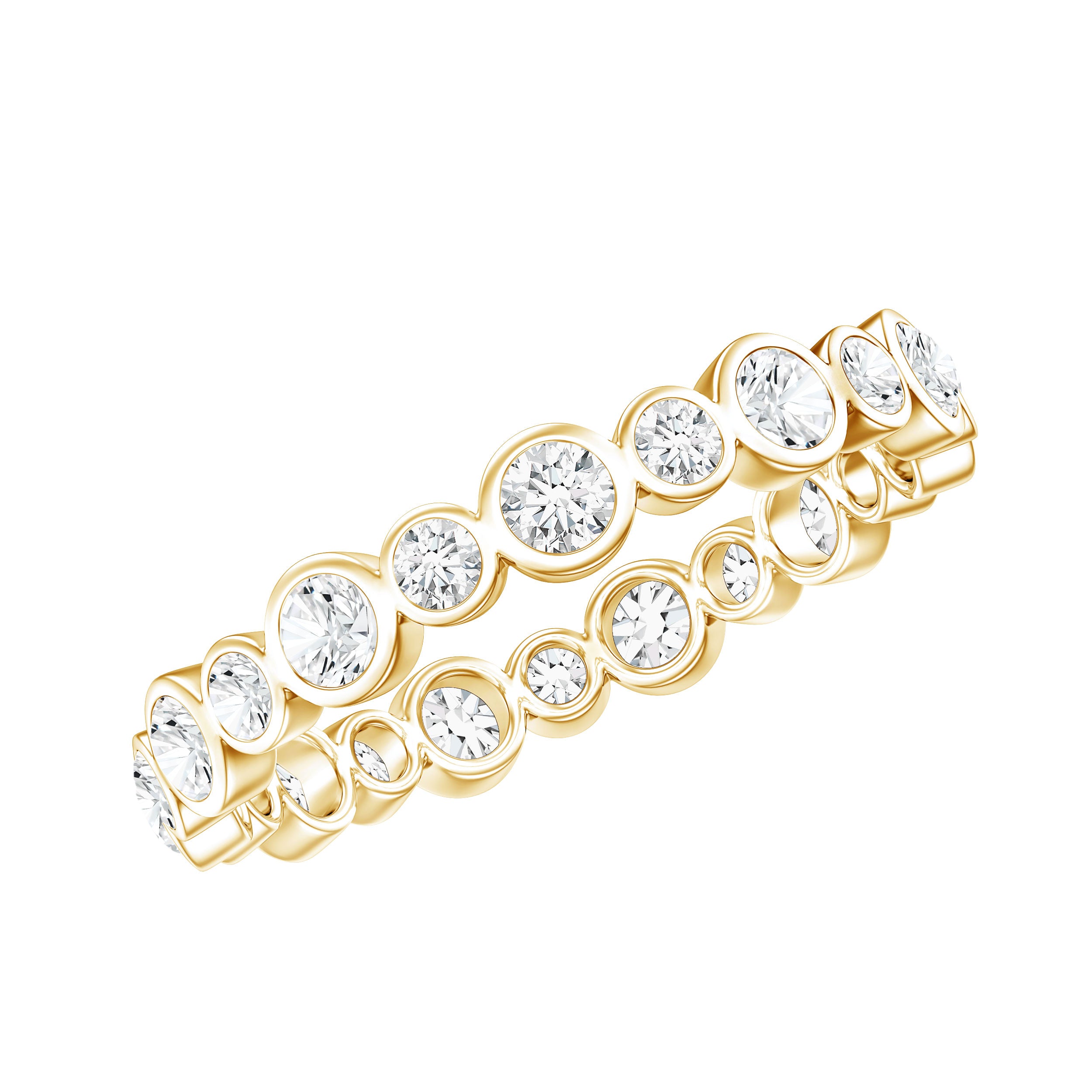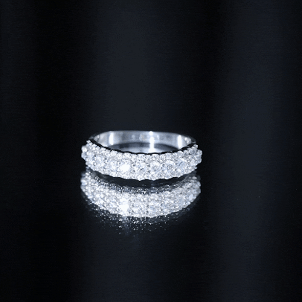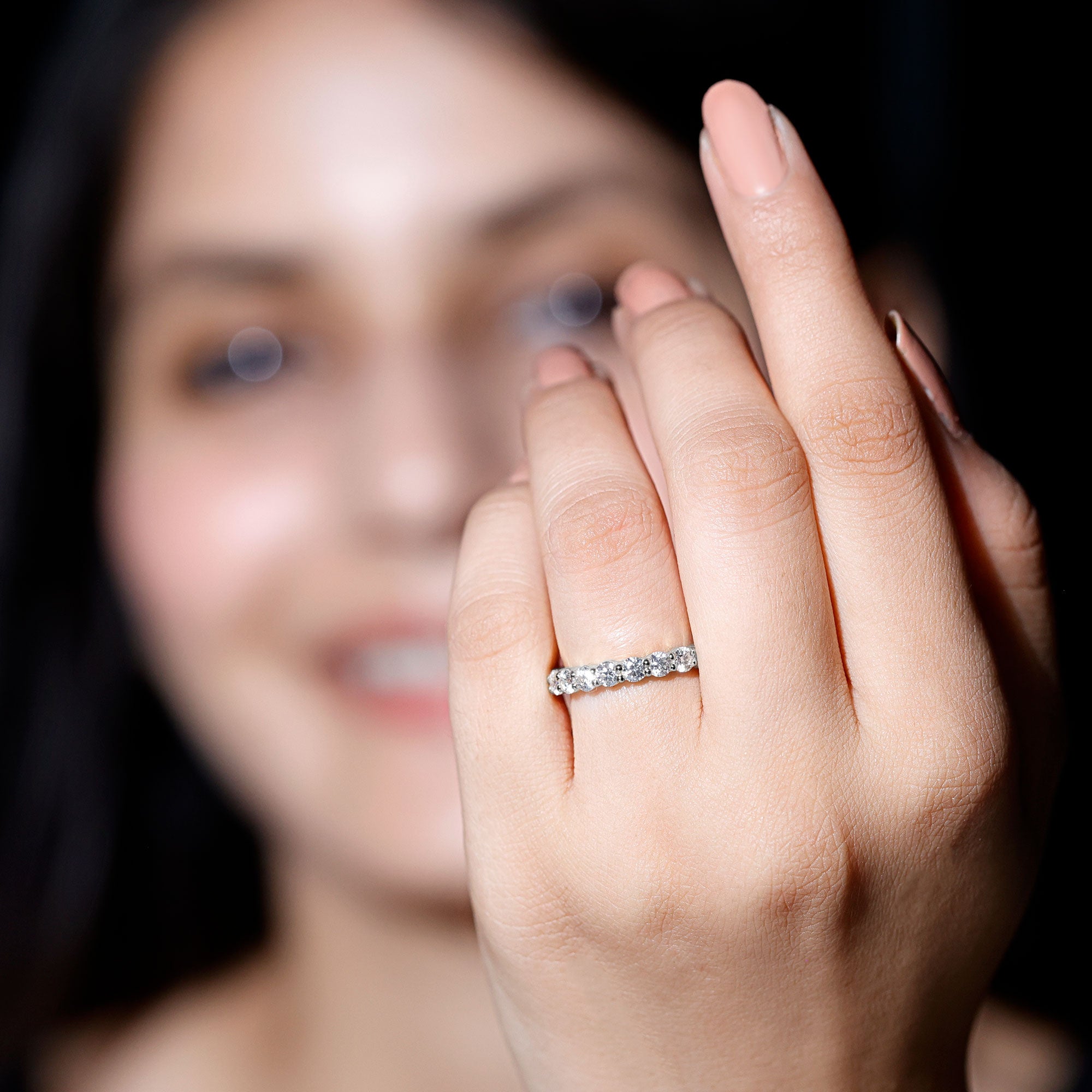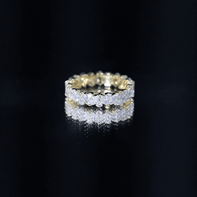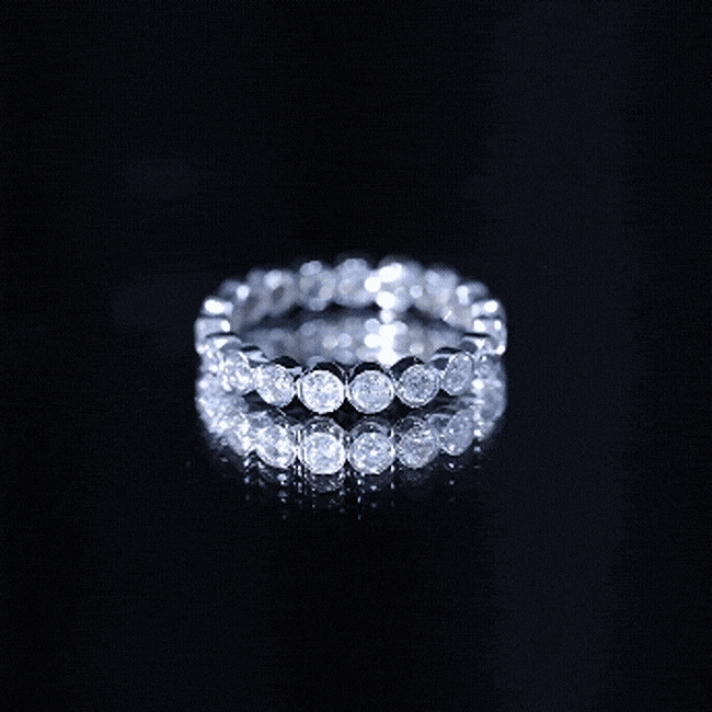Full eternity bands have diamonds set all the way around the ring. Half eternity bands place diamonds across the top portion, often offering more comfort and flexibility while keeping the same look from the top view.
