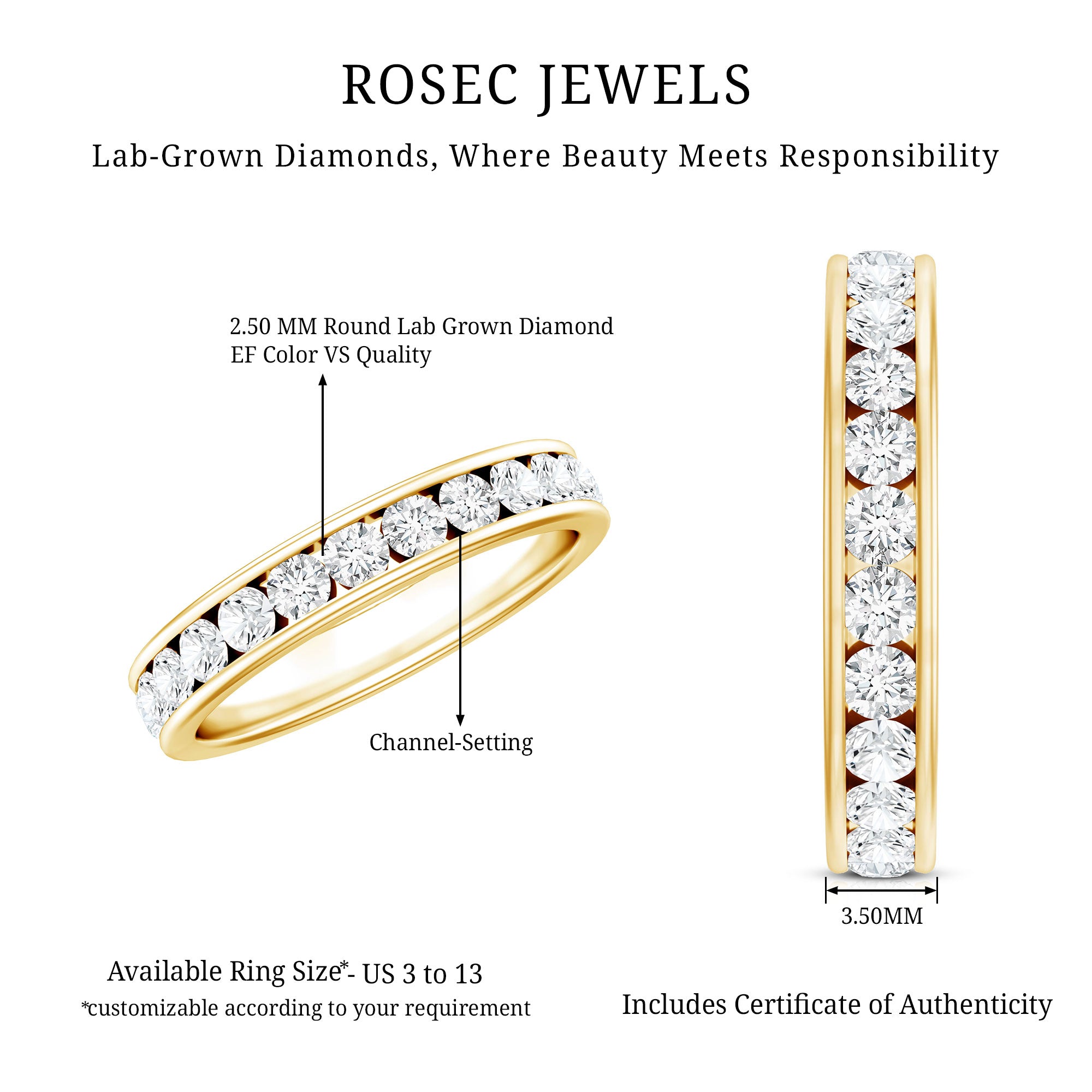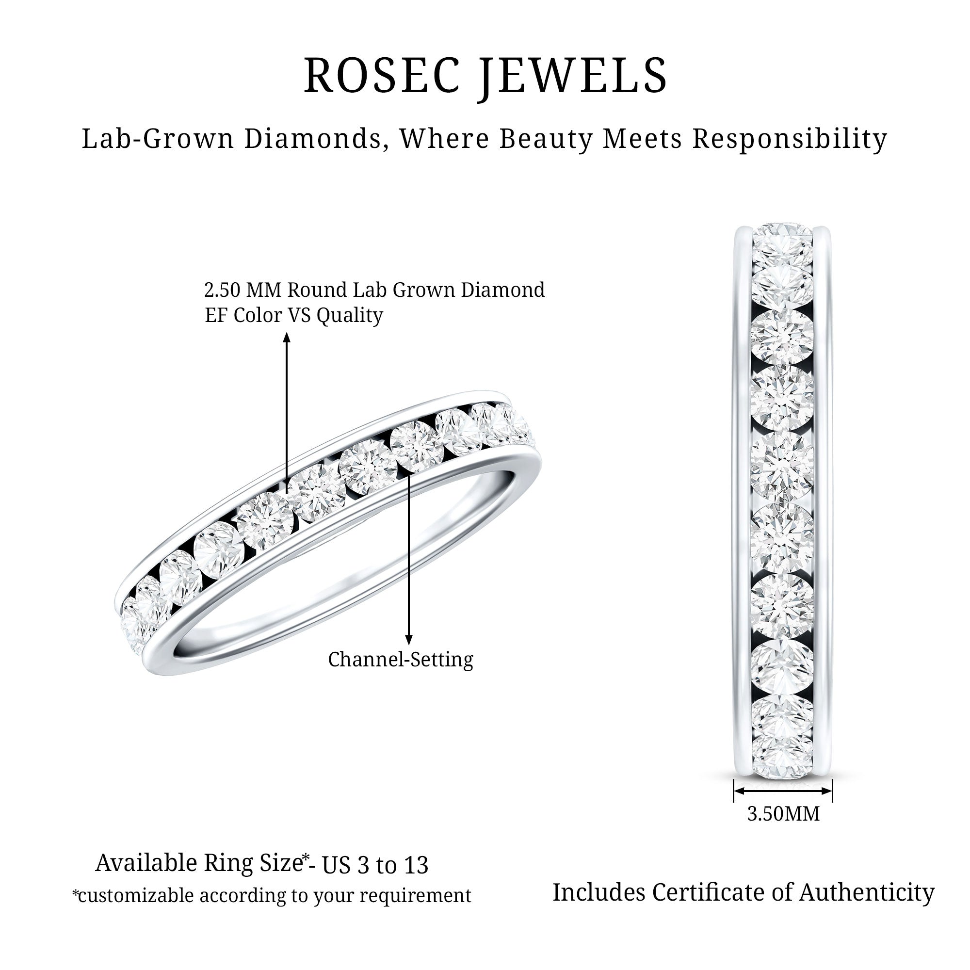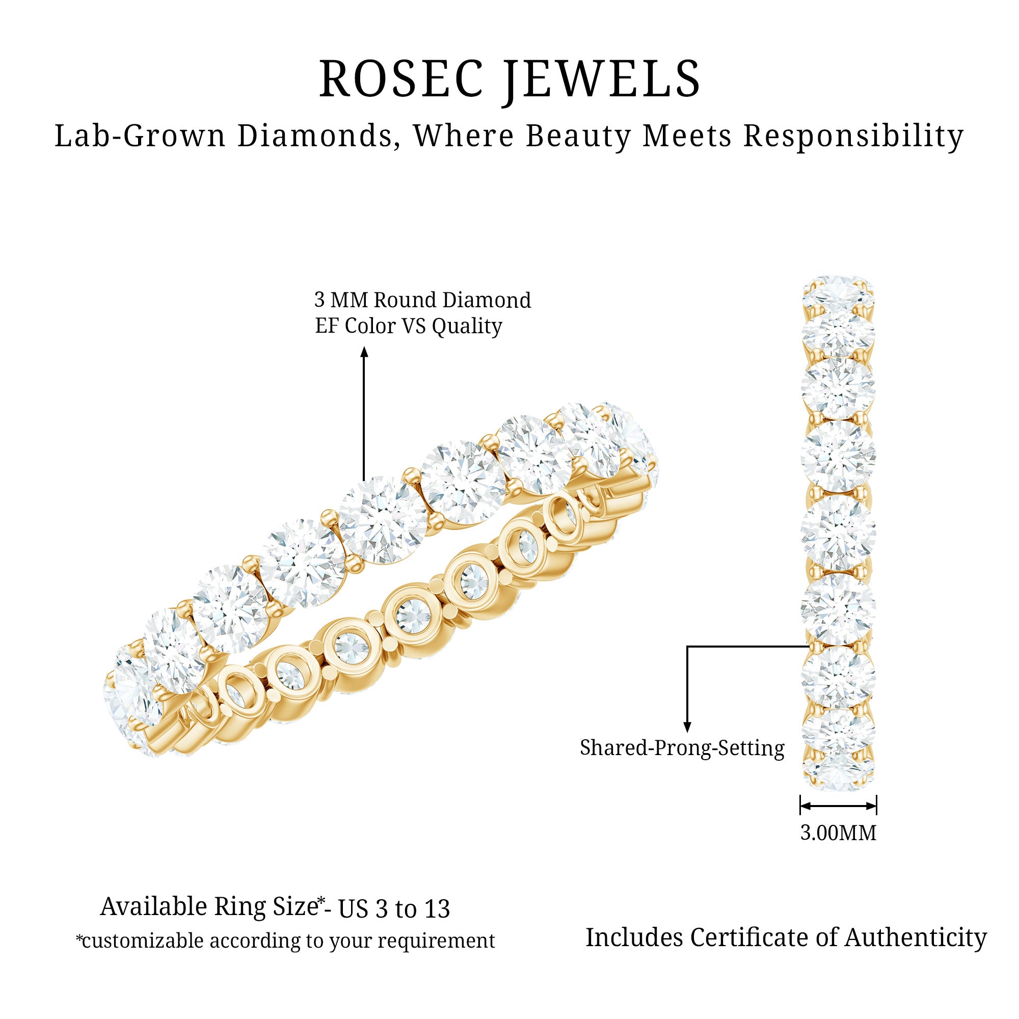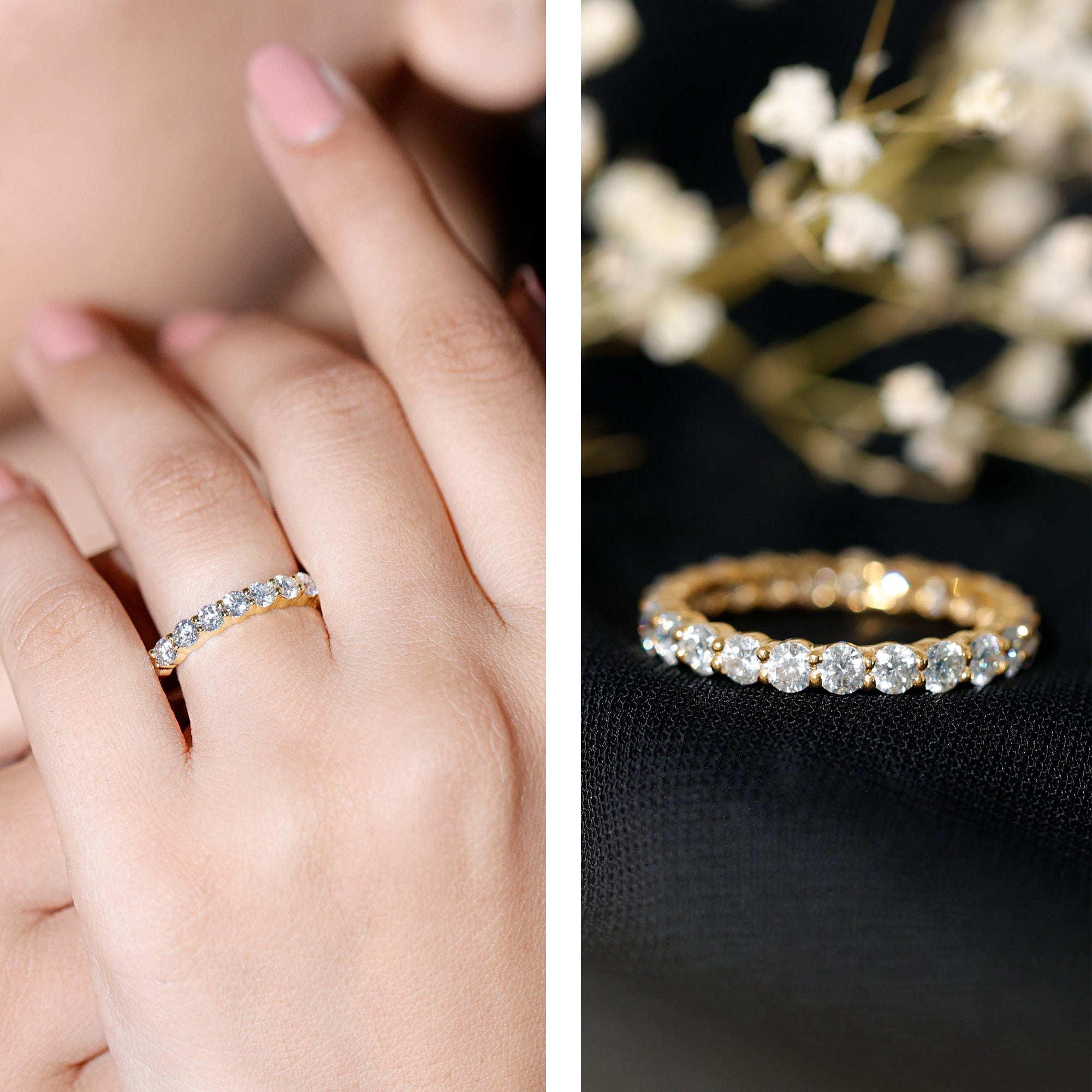 Choose half eternity for more comfort, easier sizing, and a lower price point—while keeping the same “diamond-forward” look on top.