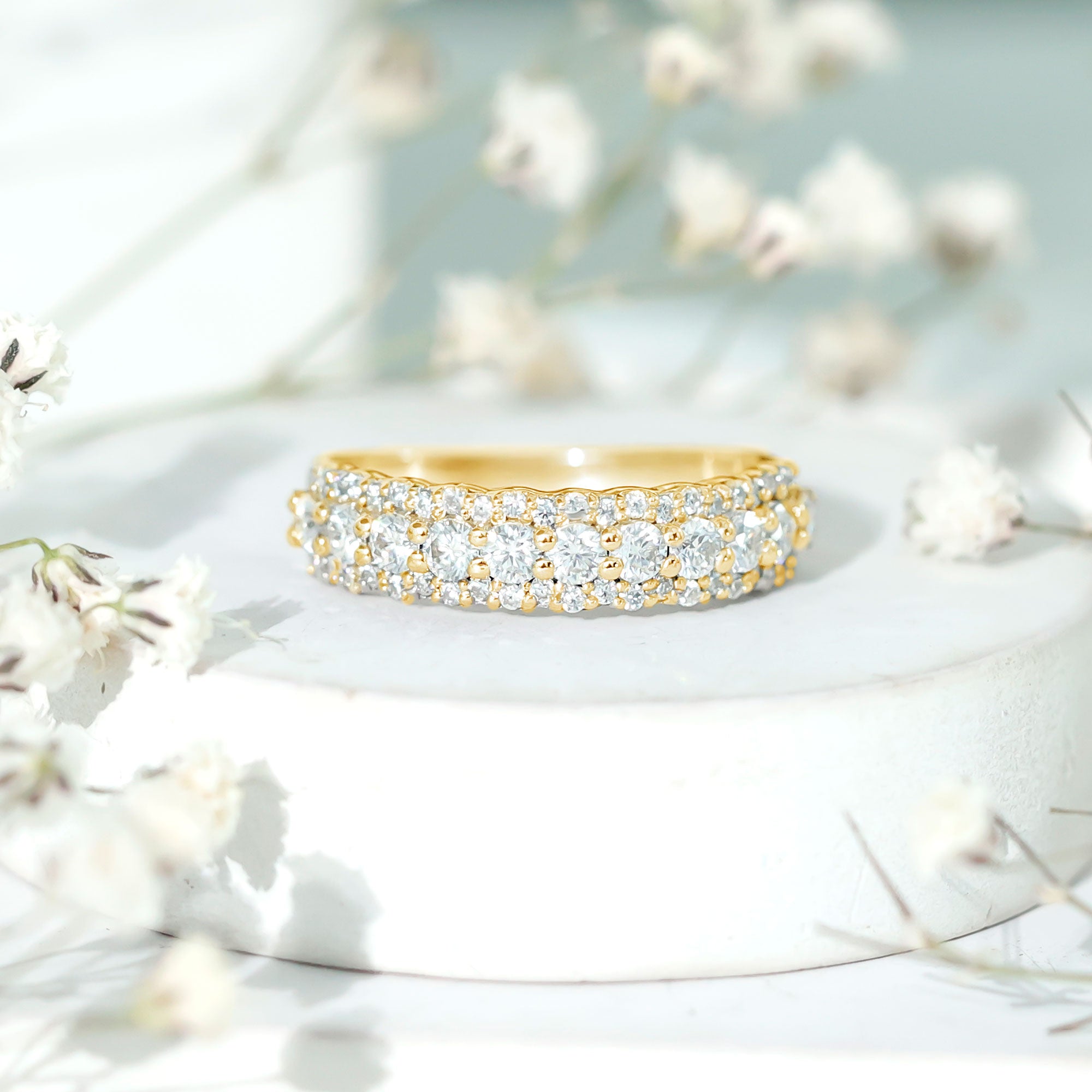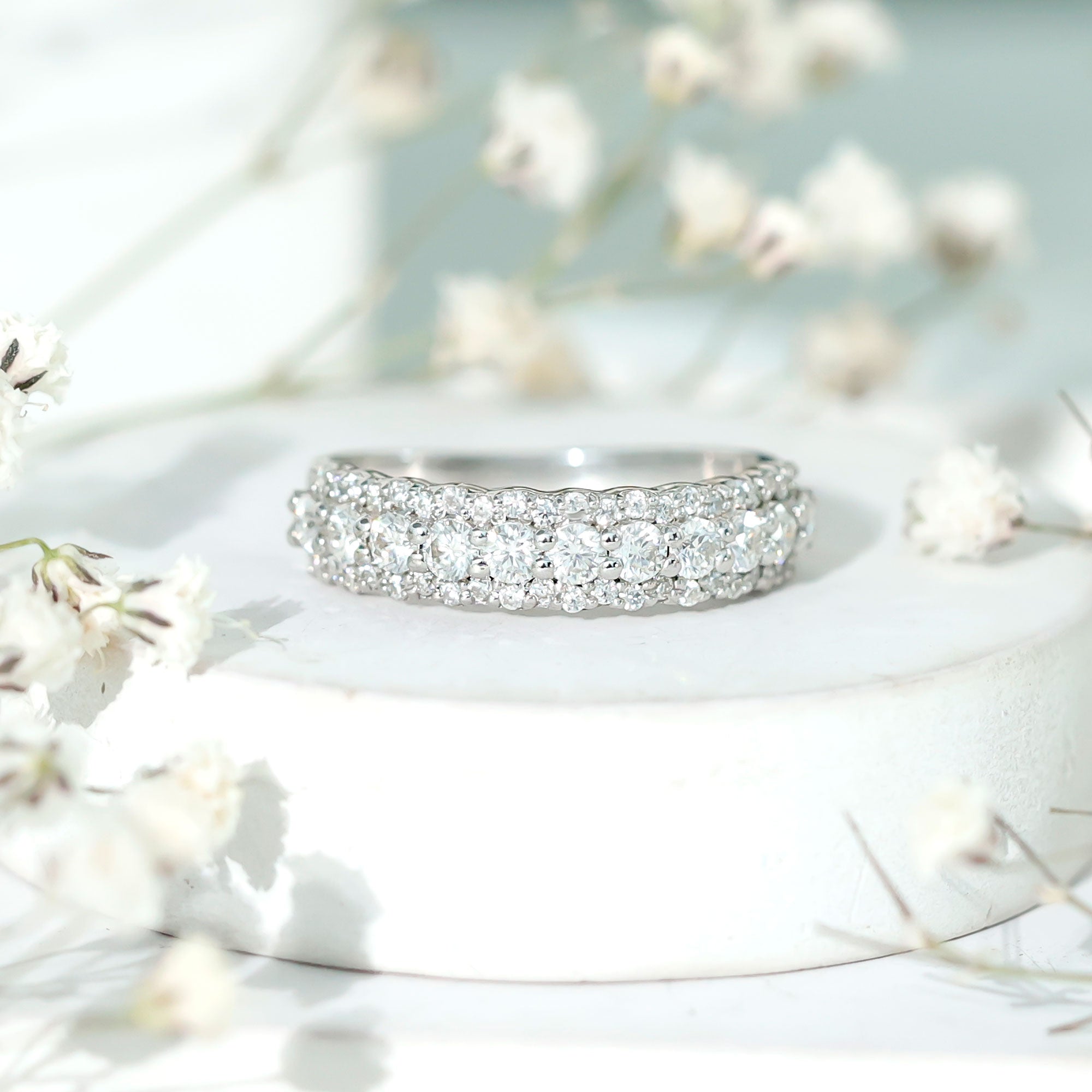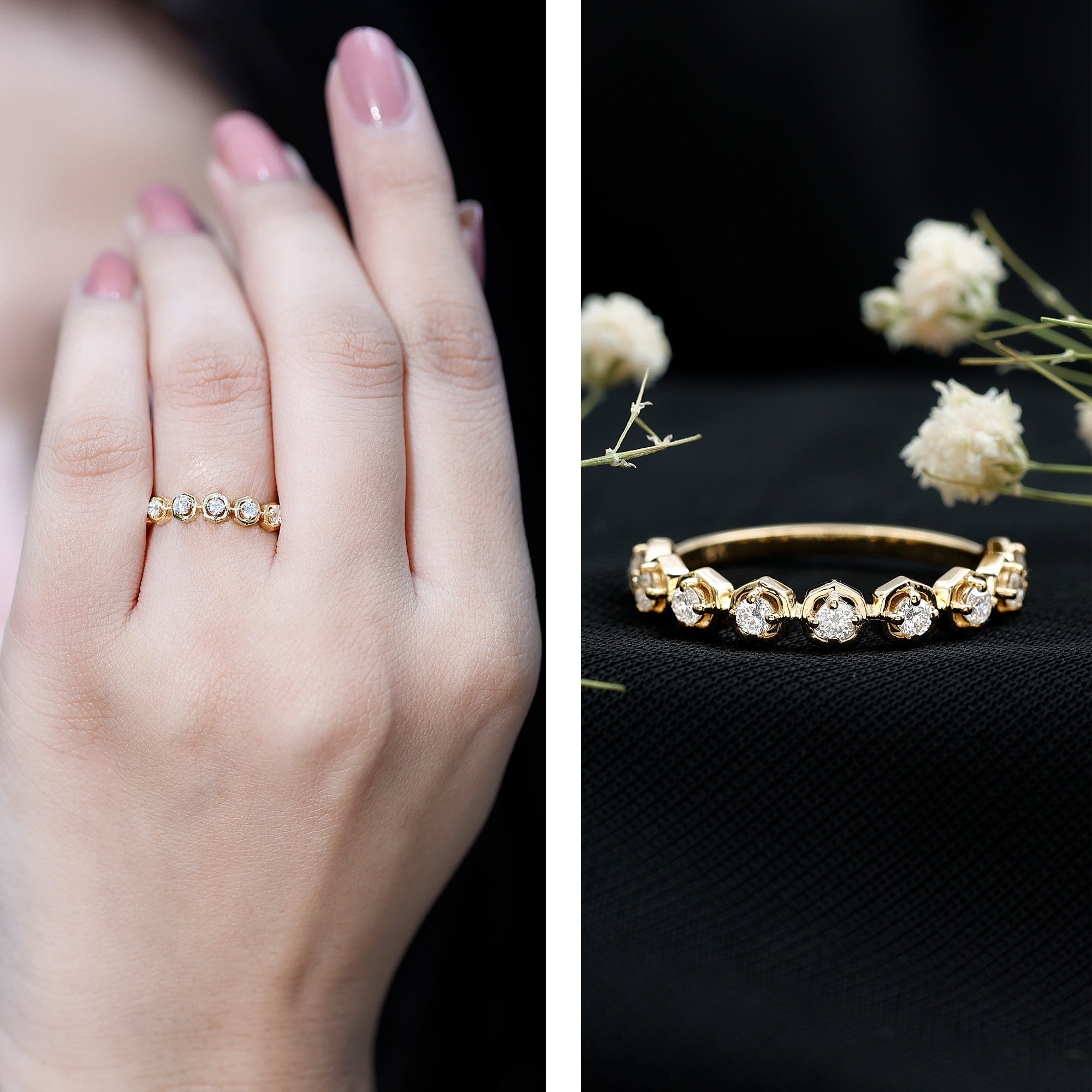 Eternity Bands: To express your eternal love in the most meaningful way choose a lab diamond eternity band. The design features mostly identical lab gemstones, placed closely together on the entire band. You can choose a full eternity or a half eternity band depending on the needed sparkle and occasion. Like a half eternity ring with gemstone only on the top is an ideal choice for everyday wear. While a full eternity loaded with gemstones around the entire band makes a luxurious statement.