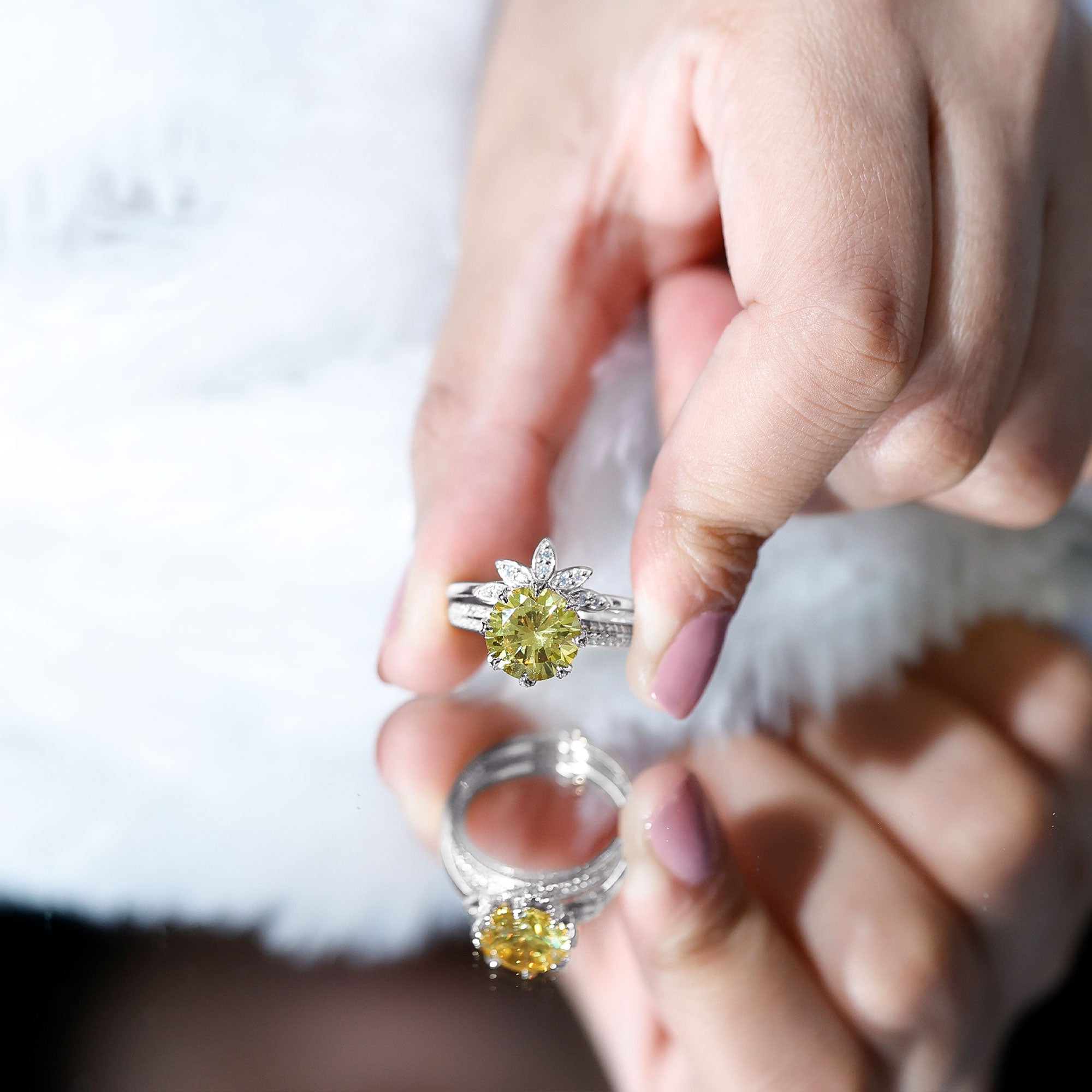 No, lab grown diamonds don’t fade or change color with time. If properly cared and treasured your lab grown gemstone ring can be a forever piece.