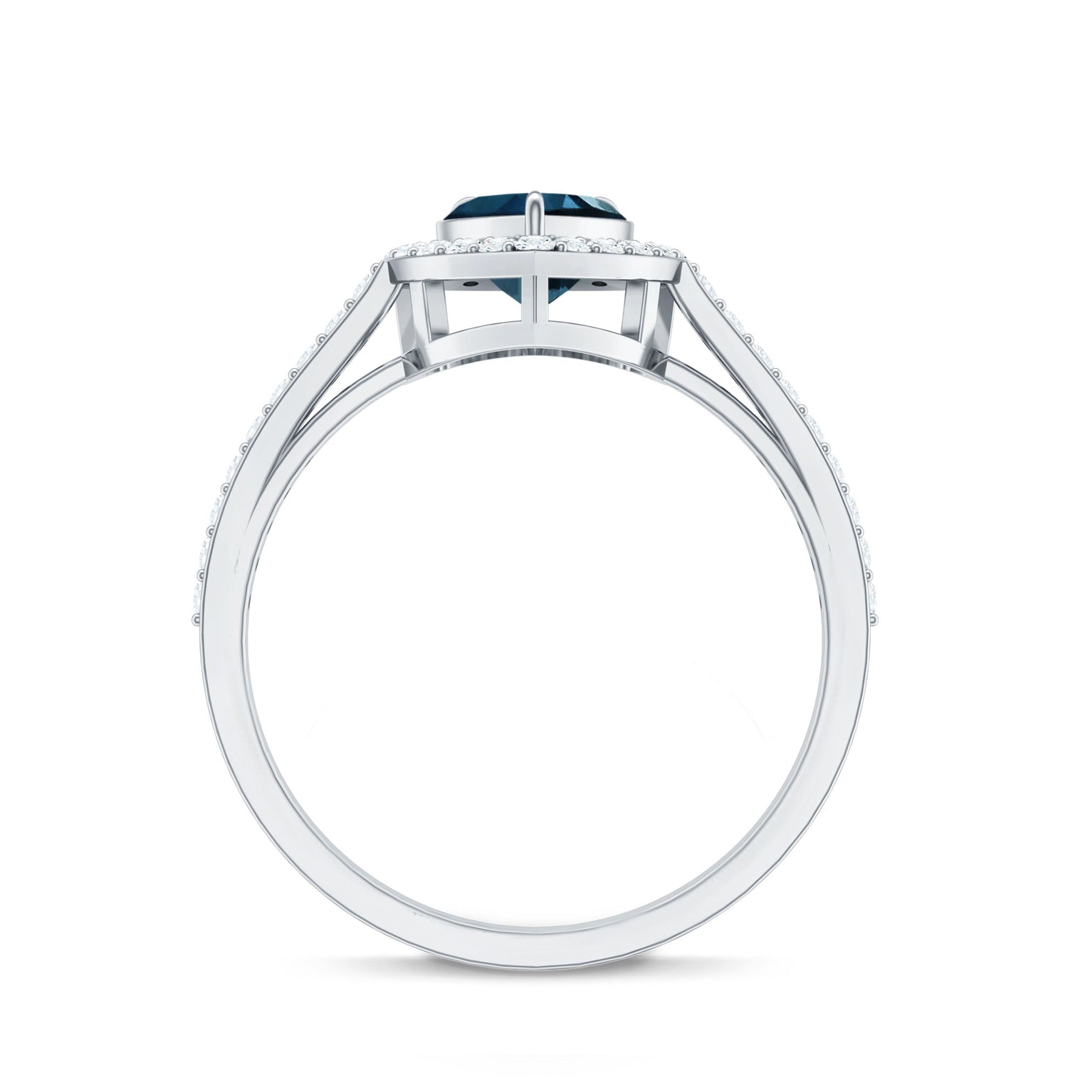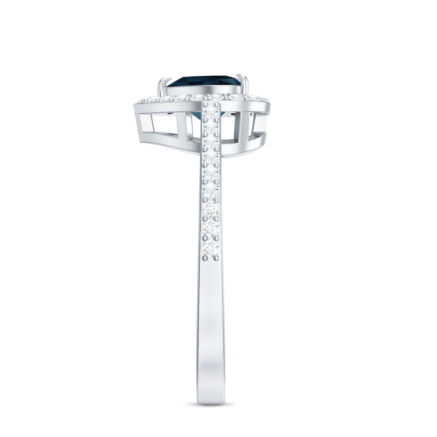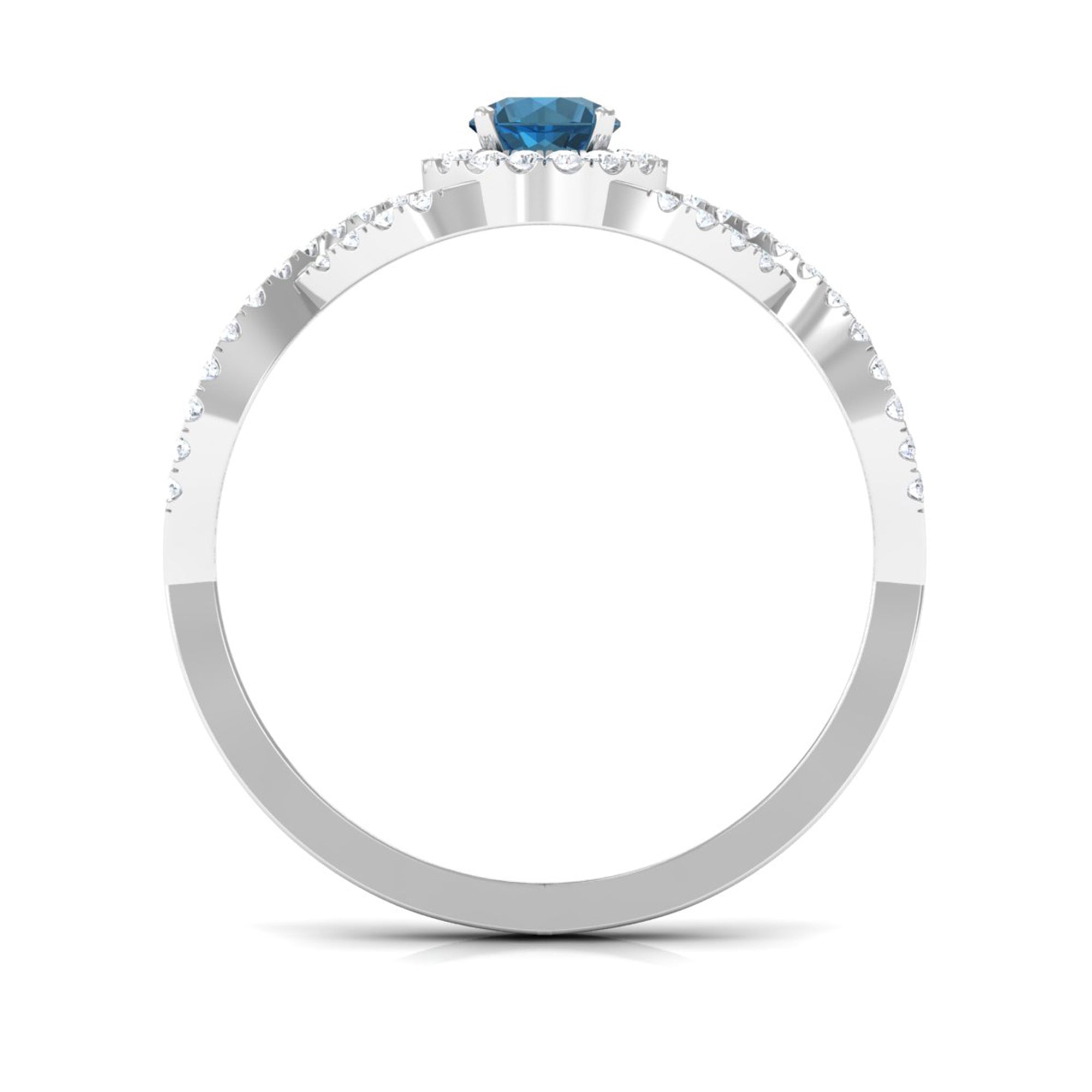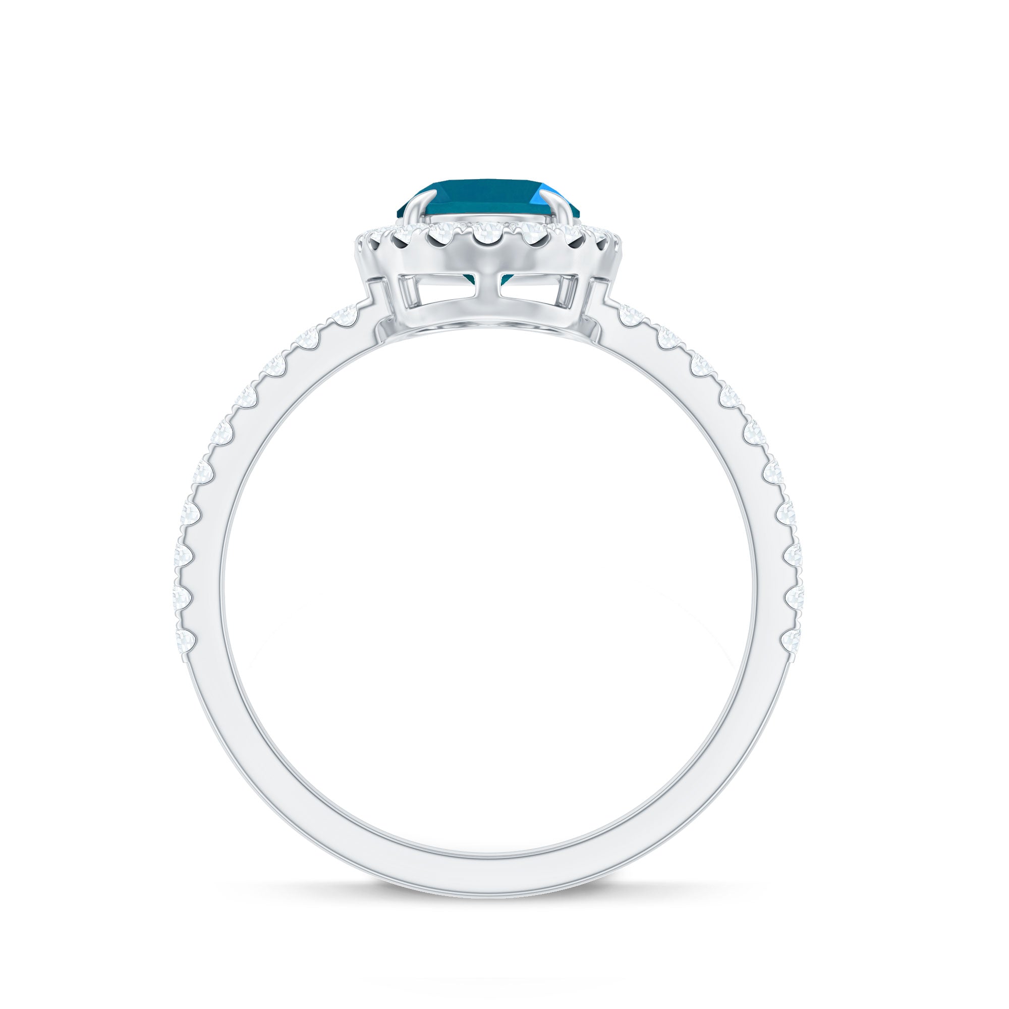 A unique and edgy take to the classic Solitaire style, the Center Stone of London Blue Topaz here is adorned by a shimmering row of Diamond/Moissanite all around. The Halo doesn’t just lend more character to the Blue Topaz Ring, but also deceives your eyes by making your Topaz appear slightly bigger in size. It is the go-to style for those who fancy a London Blue Topaz and Diamond Ring.