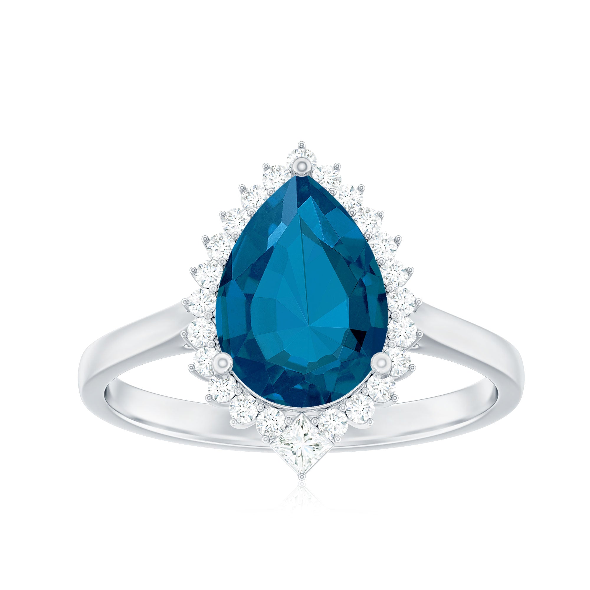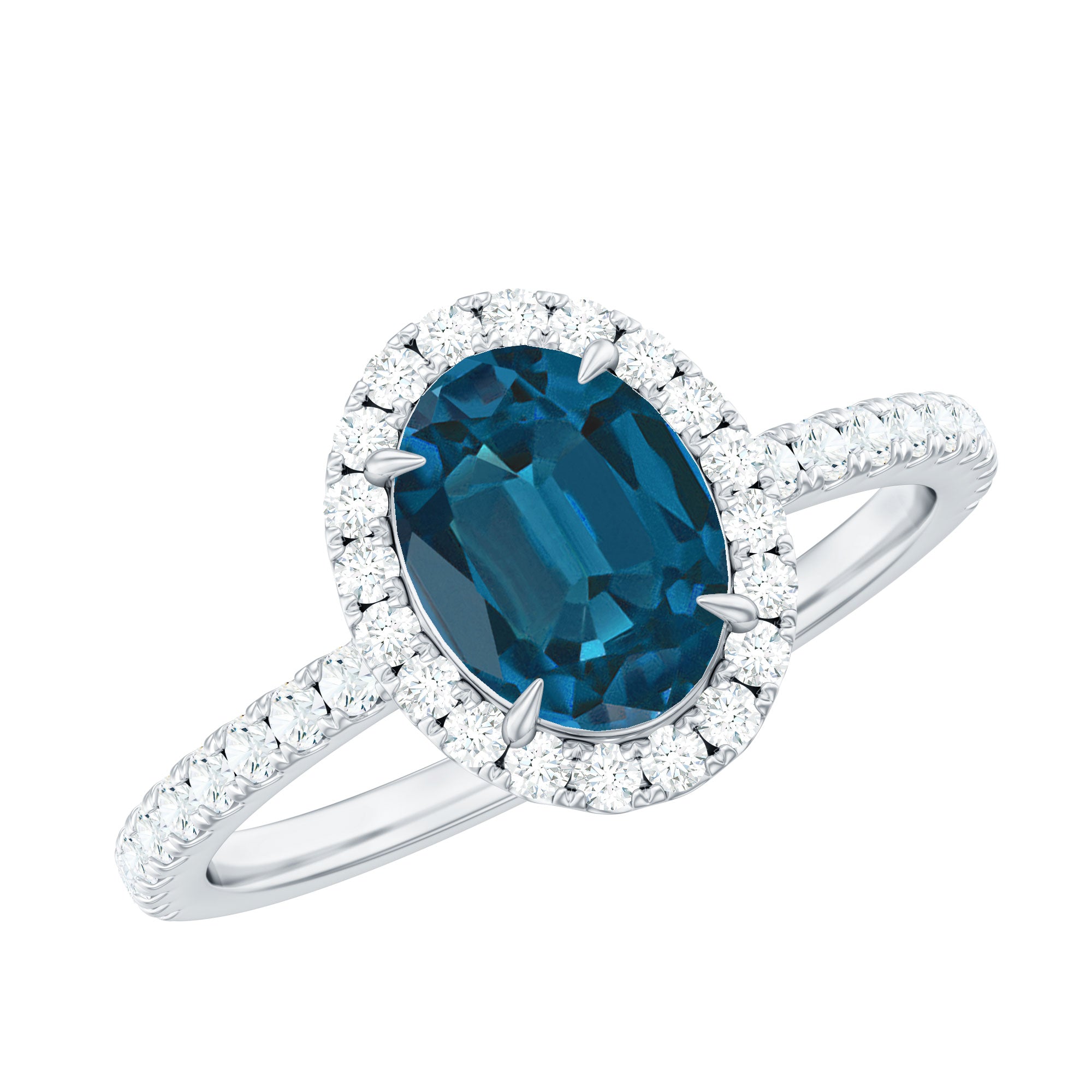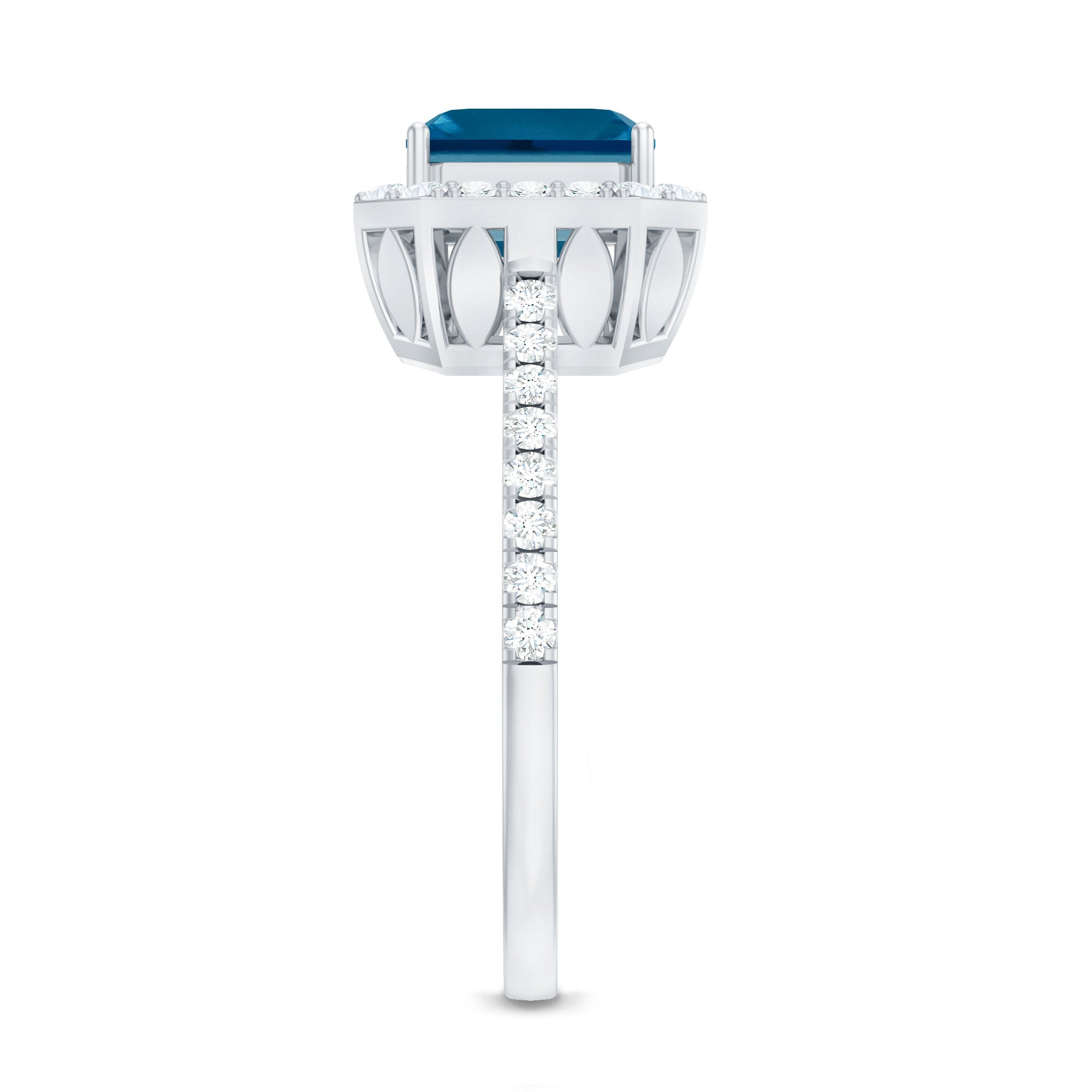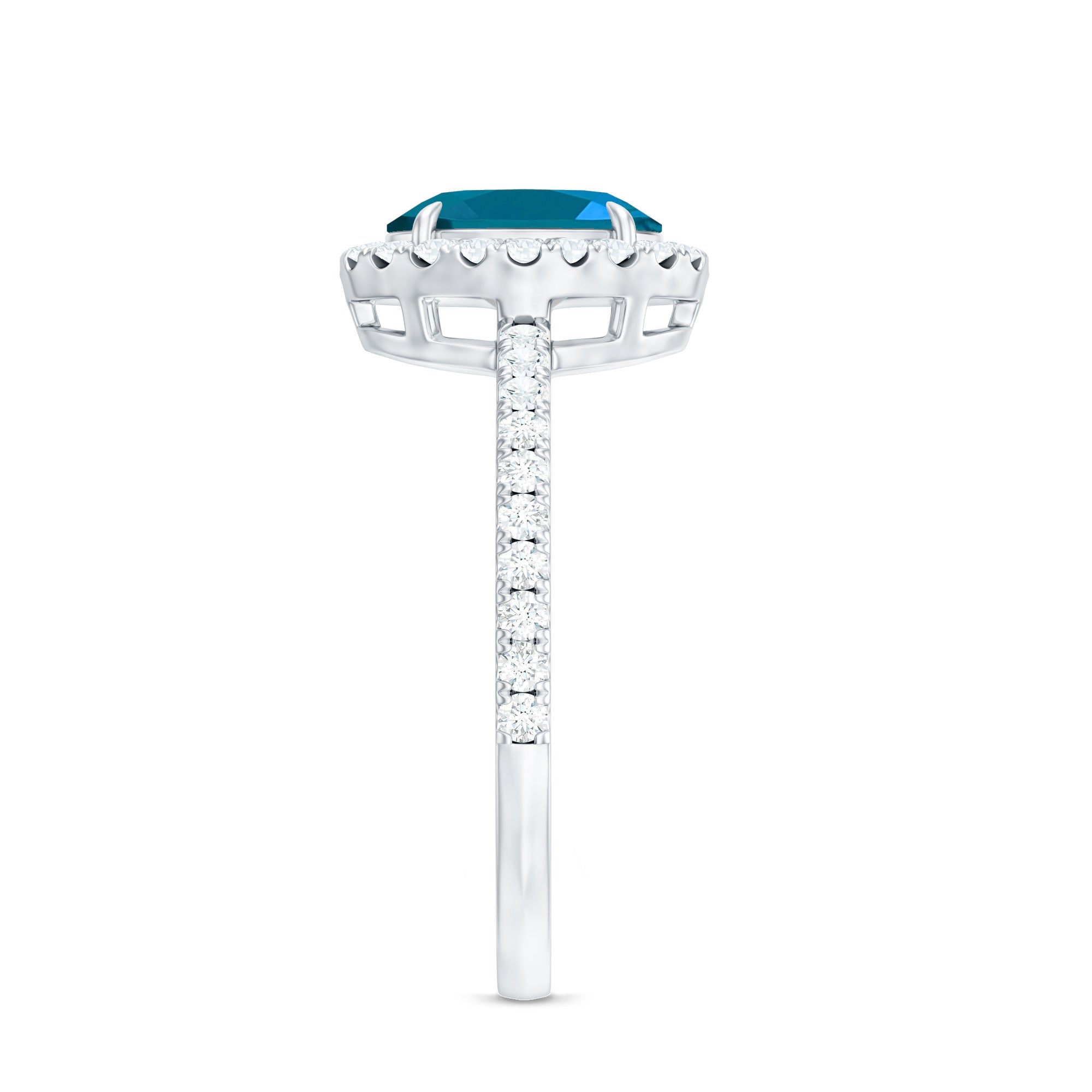 A unique and edgy take to the classic Solitaire style, the Center Stone of London Blue Topaz here is adorned by a shimmering row of Diamond/Moissanite all around. The Halo doesn’t just lend more character to the Blue Topaz Ring, but also deceives your eyes by making your Topaz appear slightly bigger in size. It is the go-to style for those who fancy a London Blue Topaz and Diamond Ring.