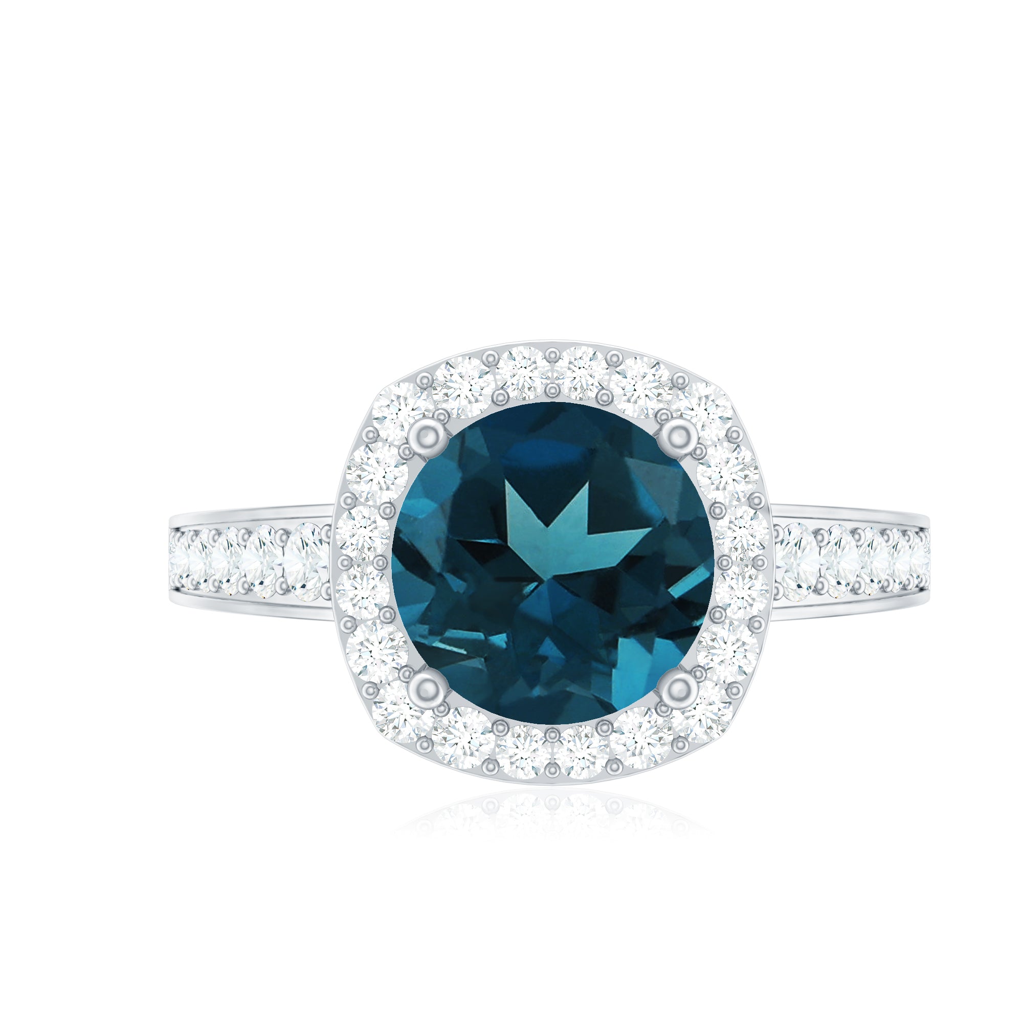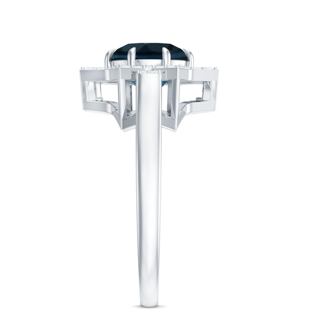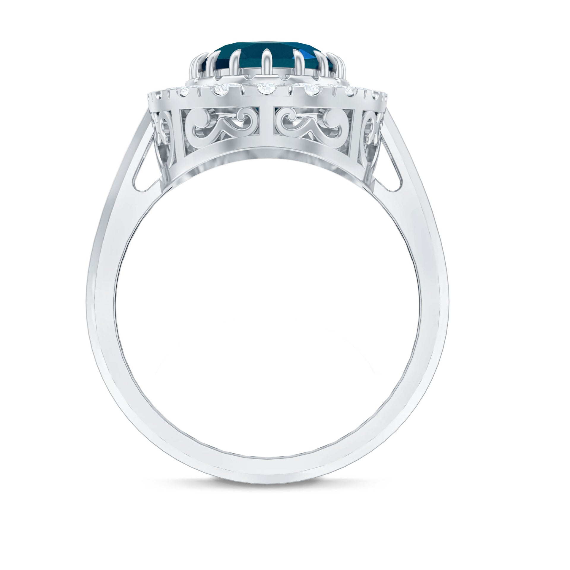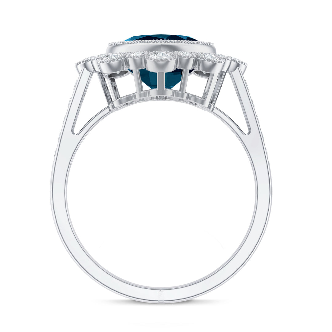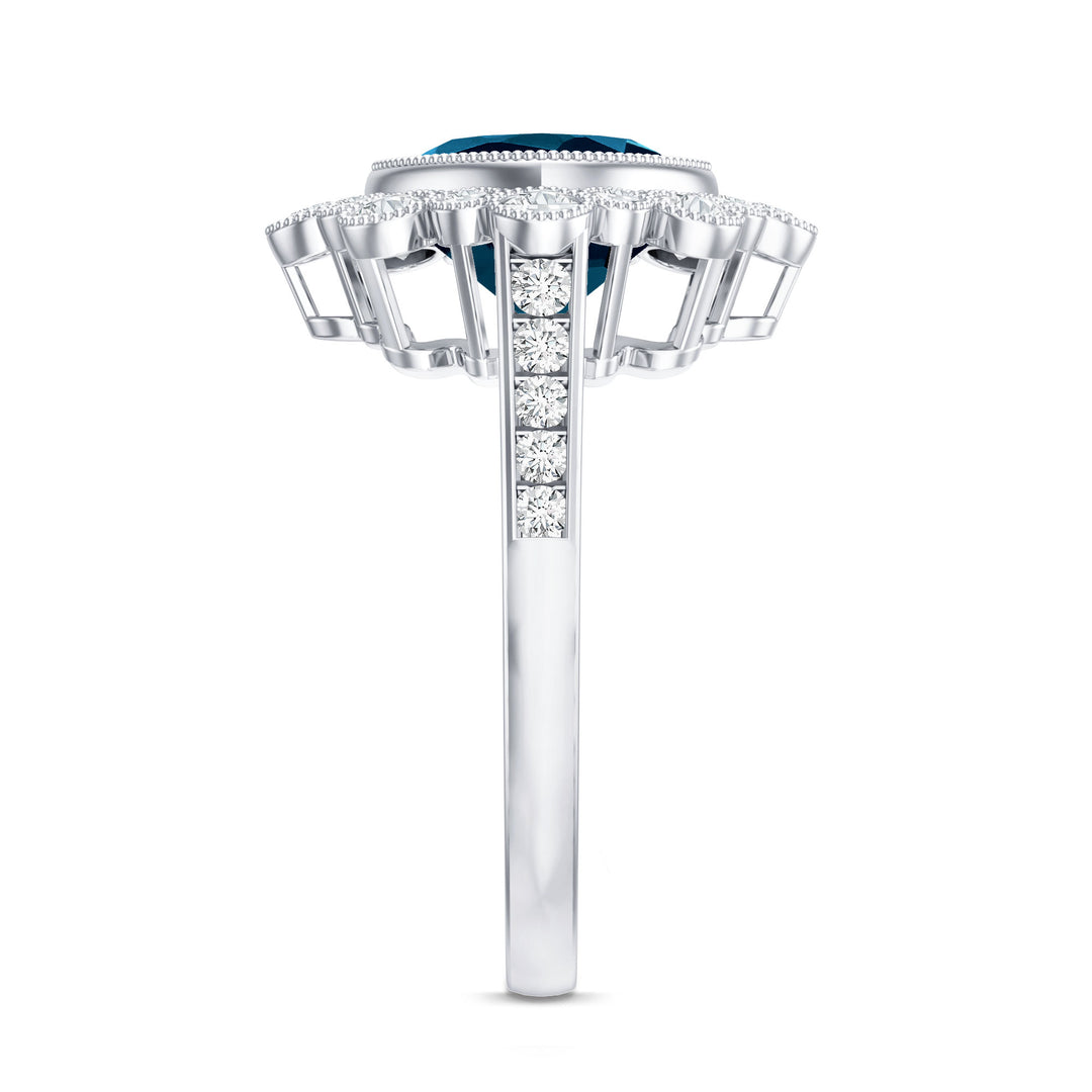 A unique and edgy take to the classic Solitaire style, the Center Stone of London Blue Topaz here is adorned by a shimmering row of Diamond/Moissanite all around. The Halo doesn’t just lend more character to the Blue Topaz Ring, but also deceives your eyes by making your Topaz appear slightly bigger in size. It is the go-to style for those who fancy a London Blue Topaz and Diamond Ring.