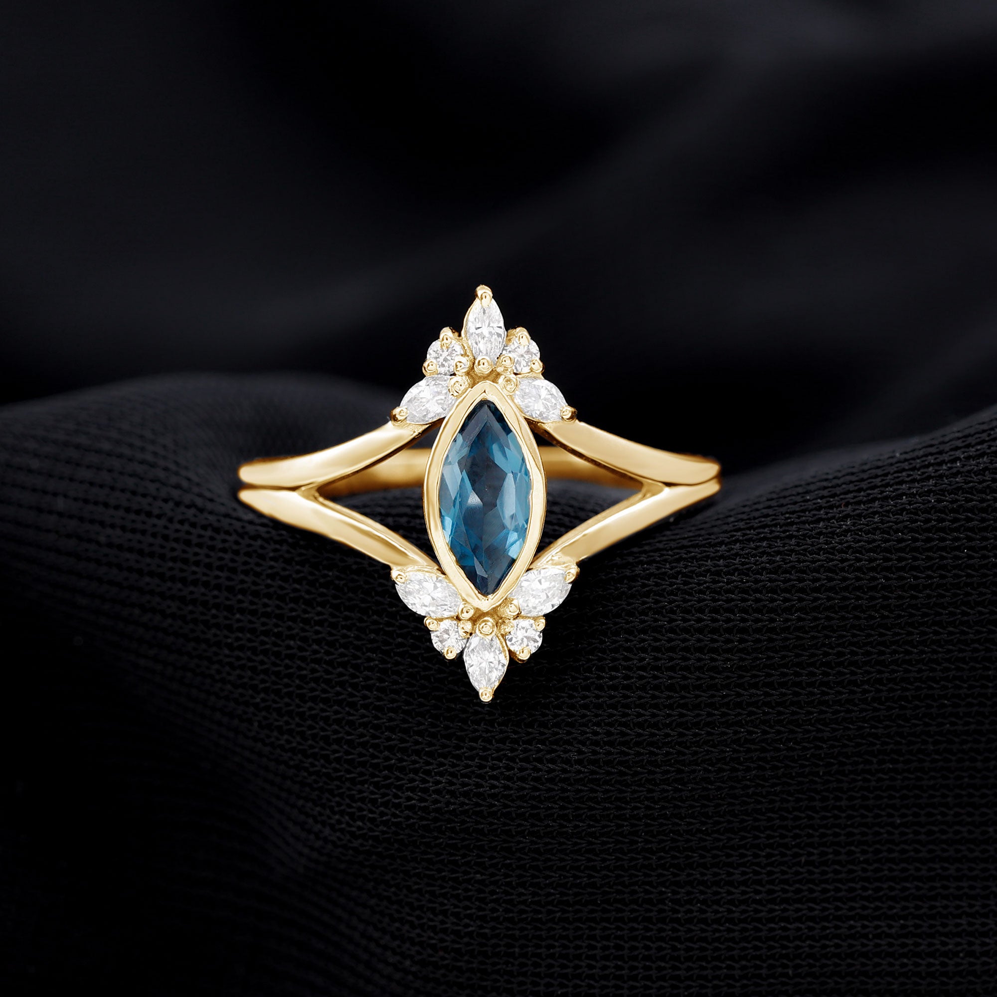 The fragile tips of marquise rings make it vulnerable to damages. So it's important to choose a setting wisely. Bezel, bar, pave and channel settings can be considered for marquise wedding rings, if you are choosing them for day to day wear. Prong or halo settings are preferred for good sparkle and brilliance.