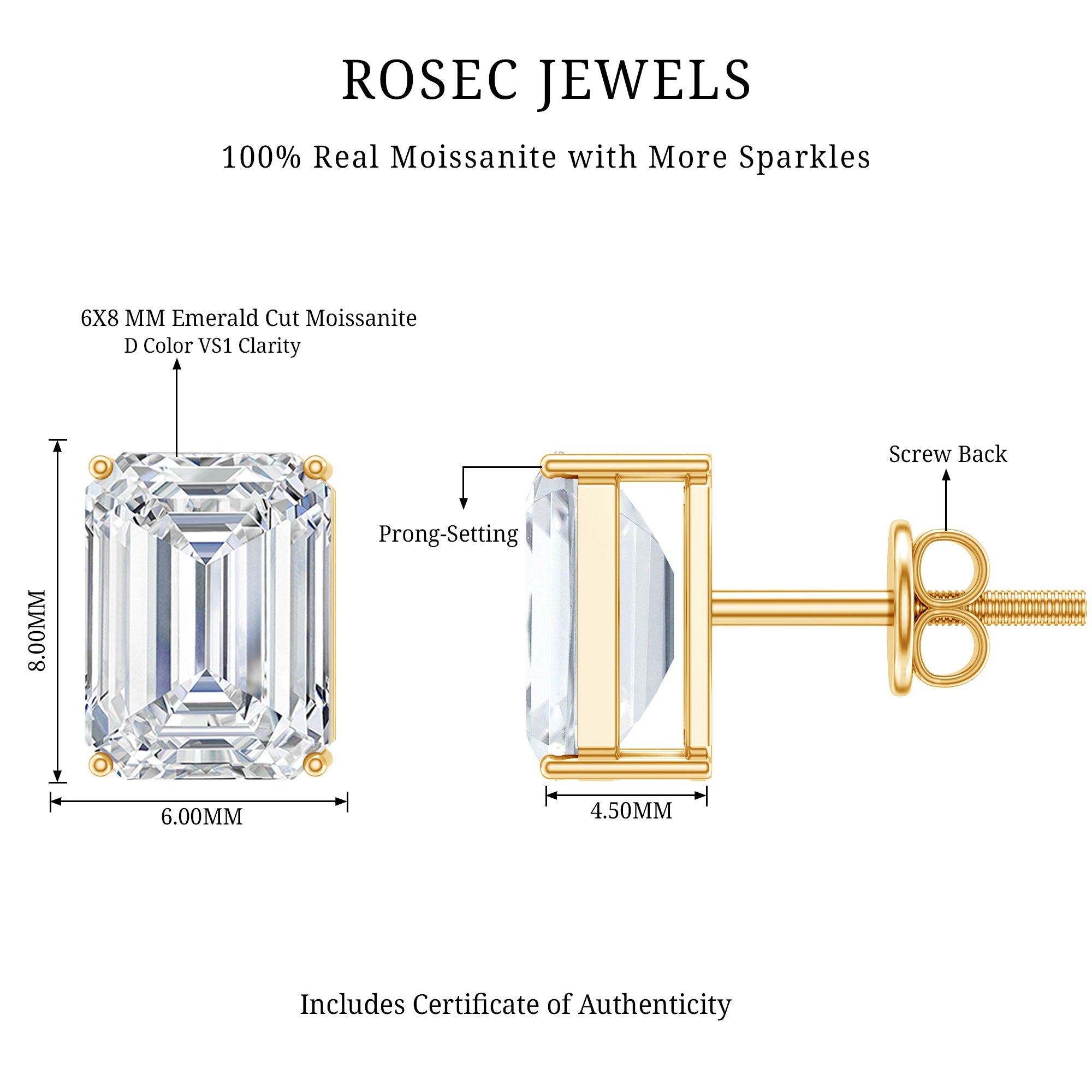 Our D color VS1 quality moissanite gems are of the highest quality, carefully selected for their amazing clarity and brilliance. Each pair of our high-quality moissanite earrings is crafted to ensure maximum fire and sparkle, providing a stunning look like the beauty of diamonds, but at a fraction of the cost.