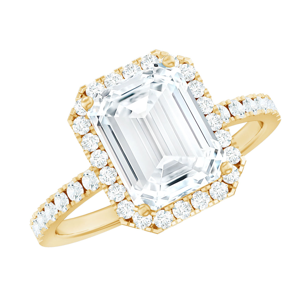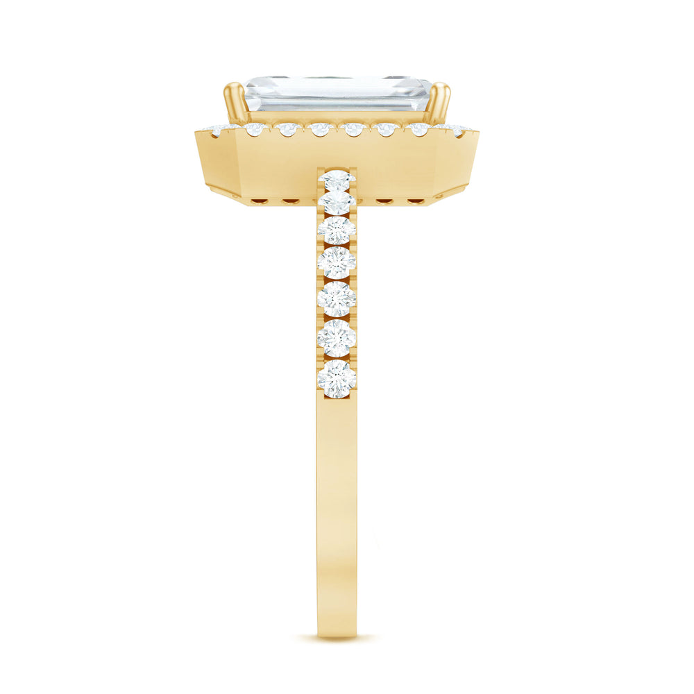 In the simplest terms, an Emerald Cut is characterized by a rectangular shape that stands out with cut-off beveled corners, thus exuding a vintage yet sophisticated aesthetic. On a more technical note, Moissanite Emerald Cut Engagement Rings are home to 57 step-like horizontal facets, a flat table, and long lines that (similar to the Asscher Cut) give off a hall of mirrors effect.
