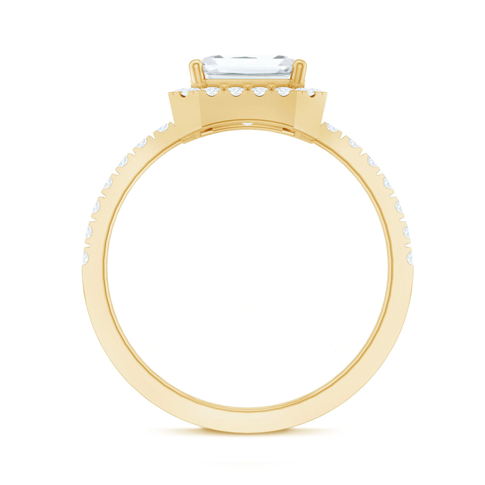 Oozing sparkles, this ring style incorporates a shimmering parade of Moissanite all around its Centerpiece. Apart from lending more character to your ring, this extra layer of sparkles (referred to as Halo) makes your Moissanite Solitaire appear bigger (for all the glitz and glam lovers out there). Needless to mention, it also adds some extra carats if you fancy one of those lofty-weighing engagement rings while sticking to a classic style (2 or 4-carat Moissanite Engagement Rings, for instance). On the other hand, if you want your Center Moissanite to shine all alone but still fancy the extra sparkles, a Hidden Halo Moissanite Ring seems like a perfect fit. That’s because the hidden halo here (unlike the usual halo) doesn’t encircle the Center Stone but is instead set beneath it to offer brilliance and character to your Moissanite without much effort.