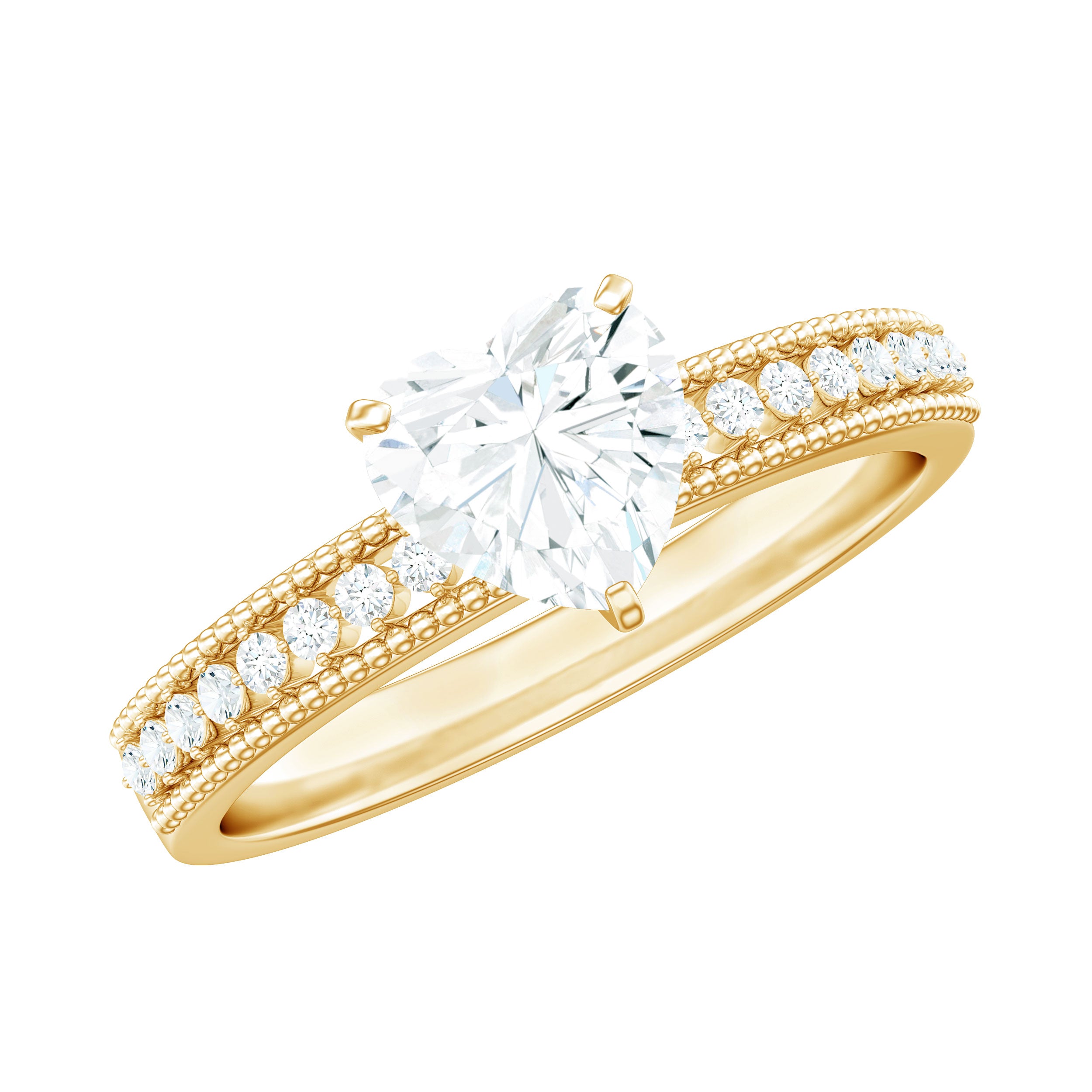 Meant to speak to old-school couples, Vintage Moissanite Engagement Rings feature ornate designs that are symbolic of the Art Deco, Edwardian, and Victorian Eras. Under this selection, you’re most likely to come across antique designs that incorporate milgrain and filigree detailing, ancient floral motifs, and abstract geometric patterns that complement the beauty of Moissanite. Besides that, be it a Floral or Art Deco Moissanite Engagement Ring, it speaks to the wearer by lending an heirloom feel to your emblem of love.