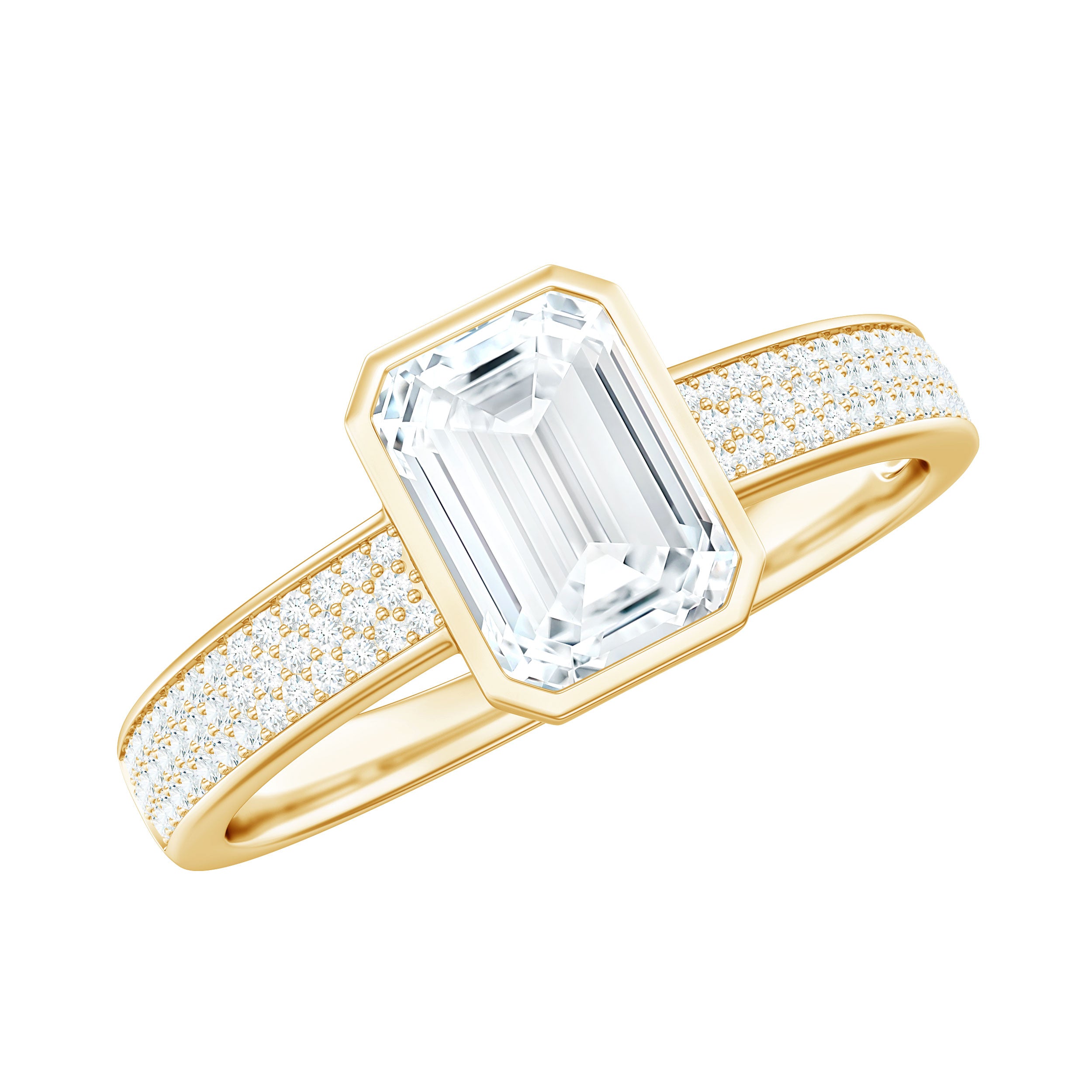 In the simplest terms, an Emerald Cut is characterized by a rectangular shape that stands out with cut-off beveled corners, thus exuding a vintage yet sophisticated aesthetic. On a more technical note, Moissanite Emerald Cut Engagement Rings are home to 57 step-like horizontal facets, a flat table, and long lines that (similar to the Asscher Cut) give off a hall of mirrors effect.