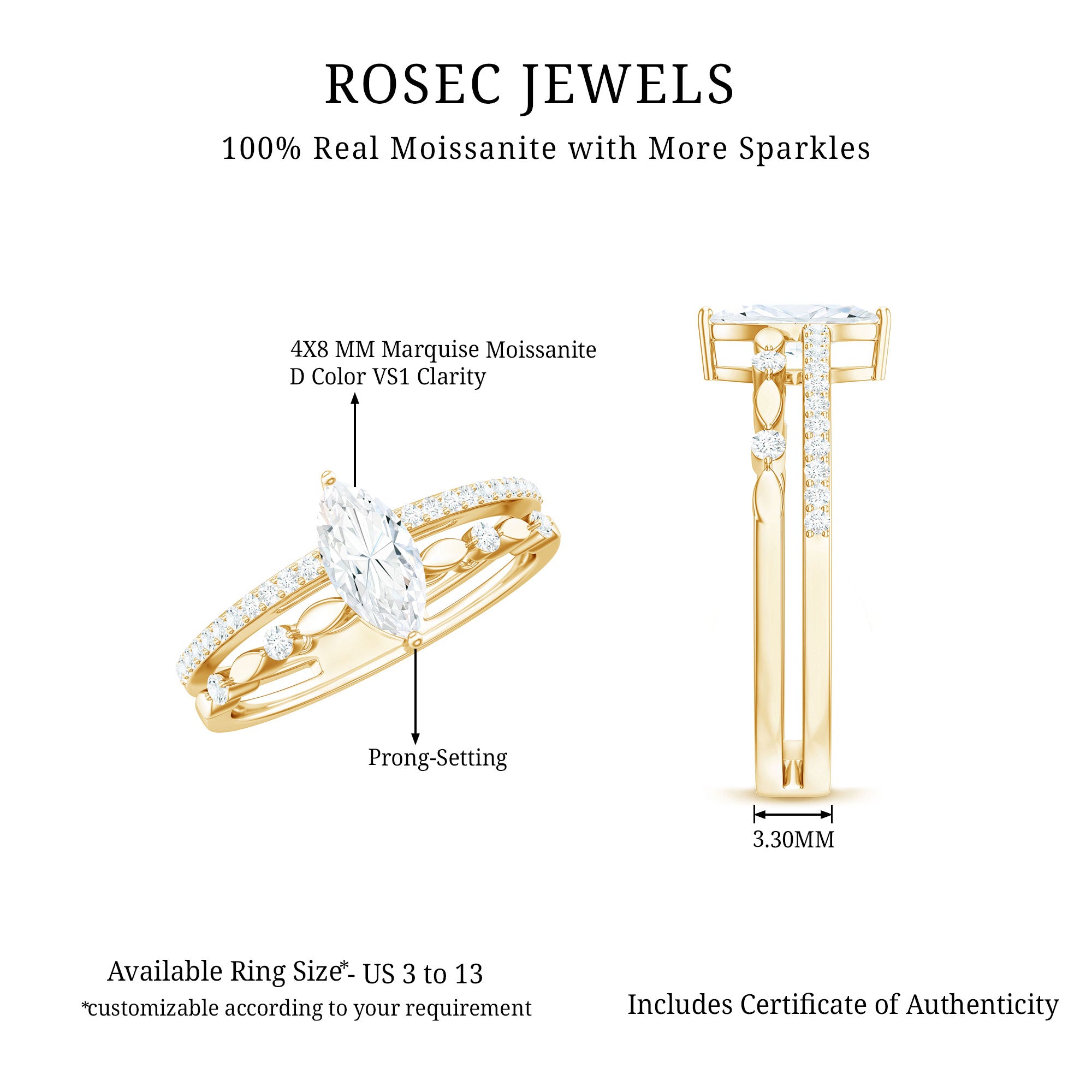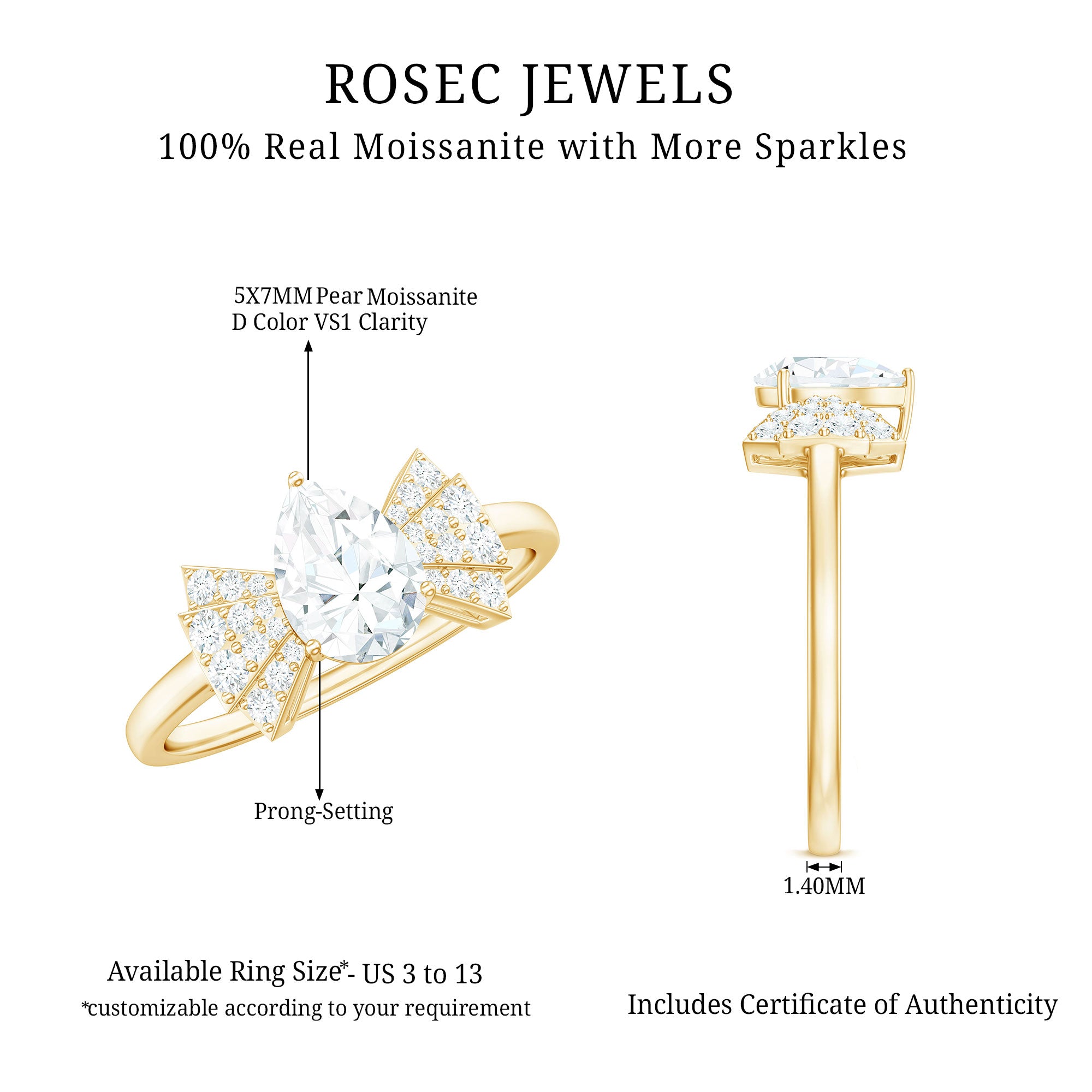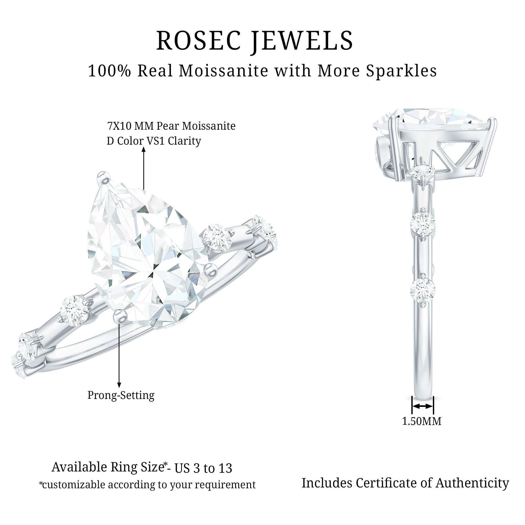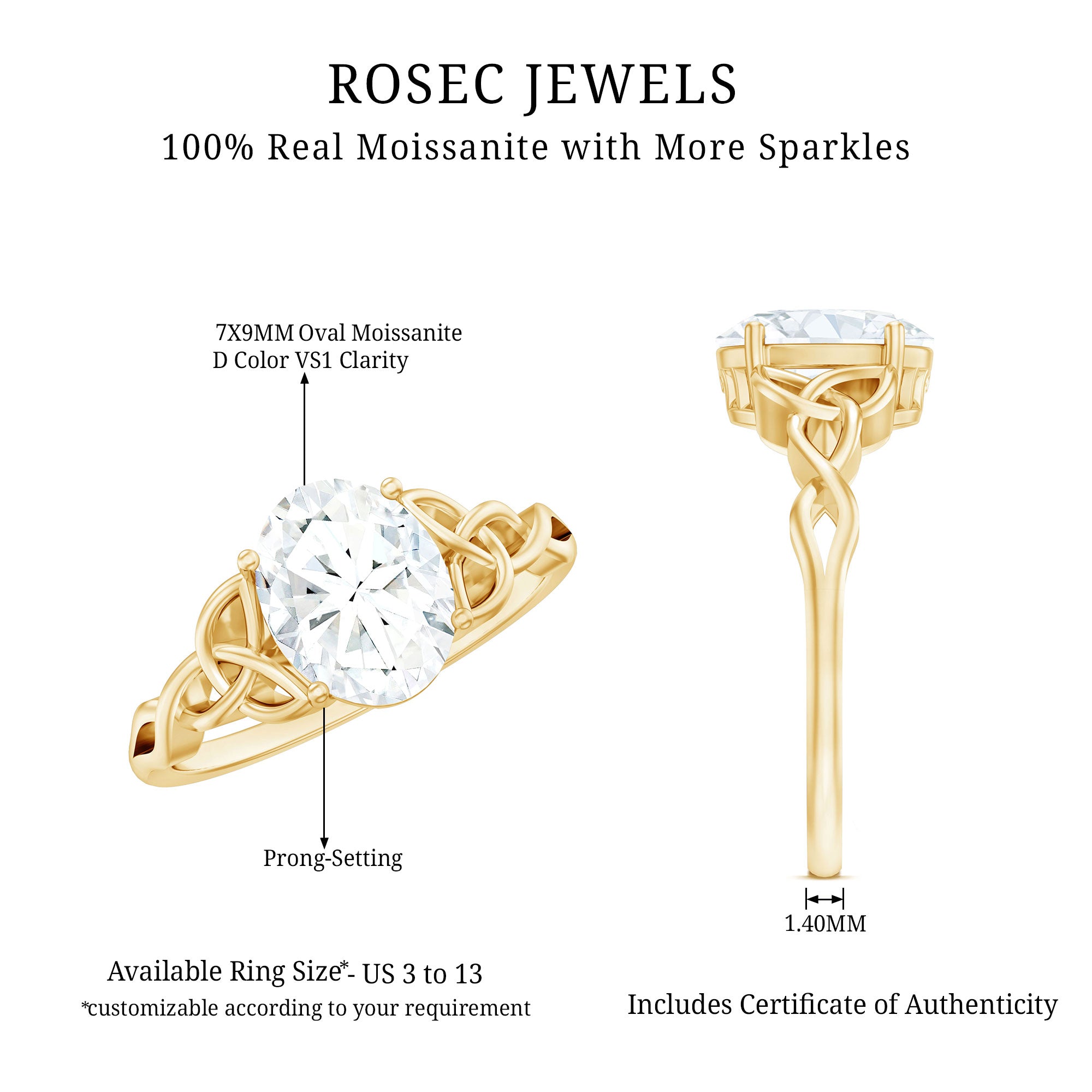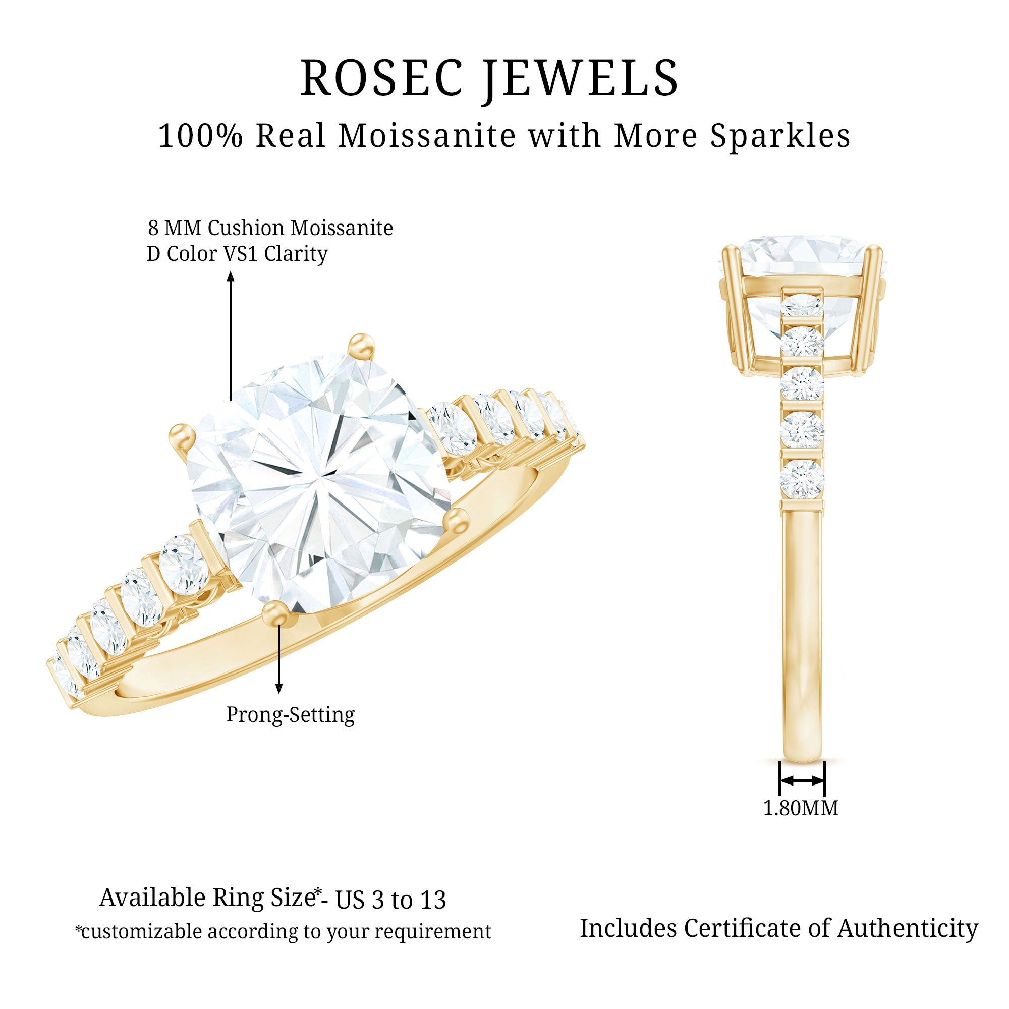 - Durable for everyday wear: With a hardness of 9.25 on the Mohs scale, moissanite is well suited for engagement rings.