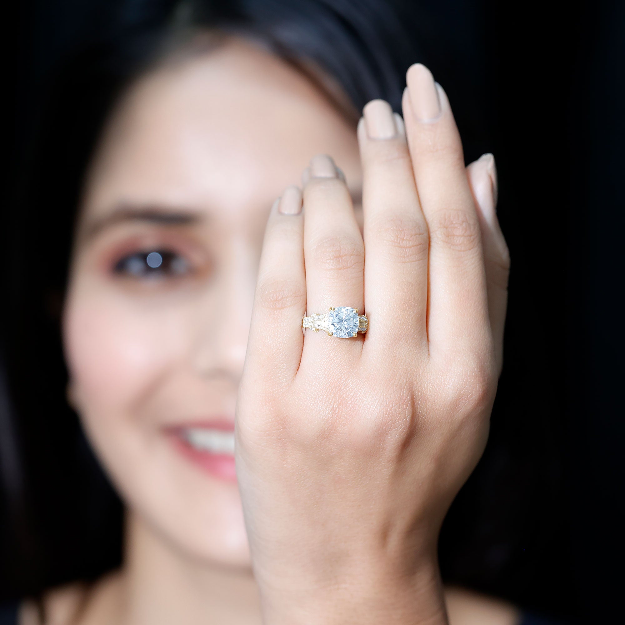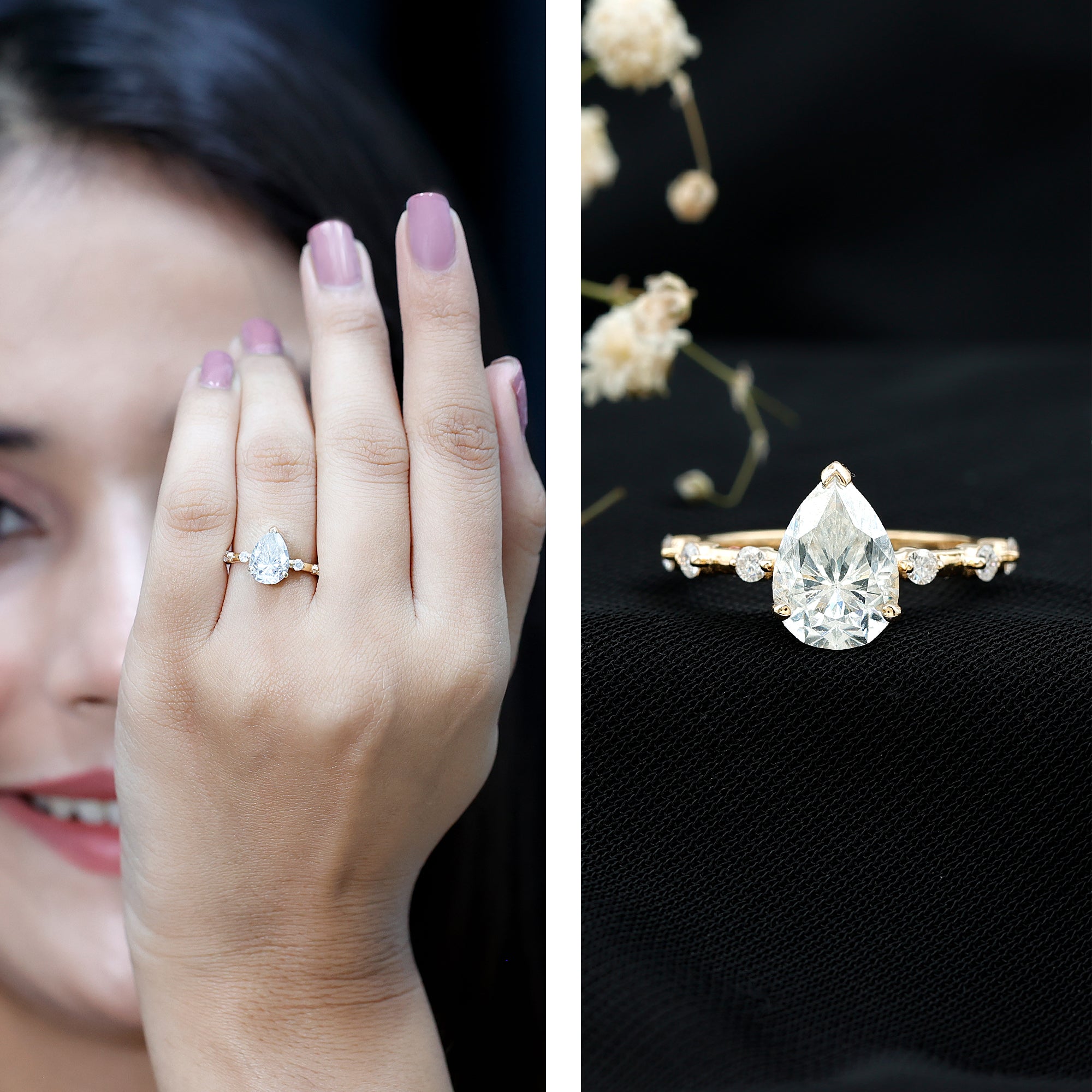 Moissanite and diamond engagement rings share a similar luxurious appearance, but moissanite is known for producing even more fire and colorful sparkle in certain lighting conditions. Many couples choose moissanite because it offers exceptional brilliance while remaining significantly more affordable than traditional diamonds.