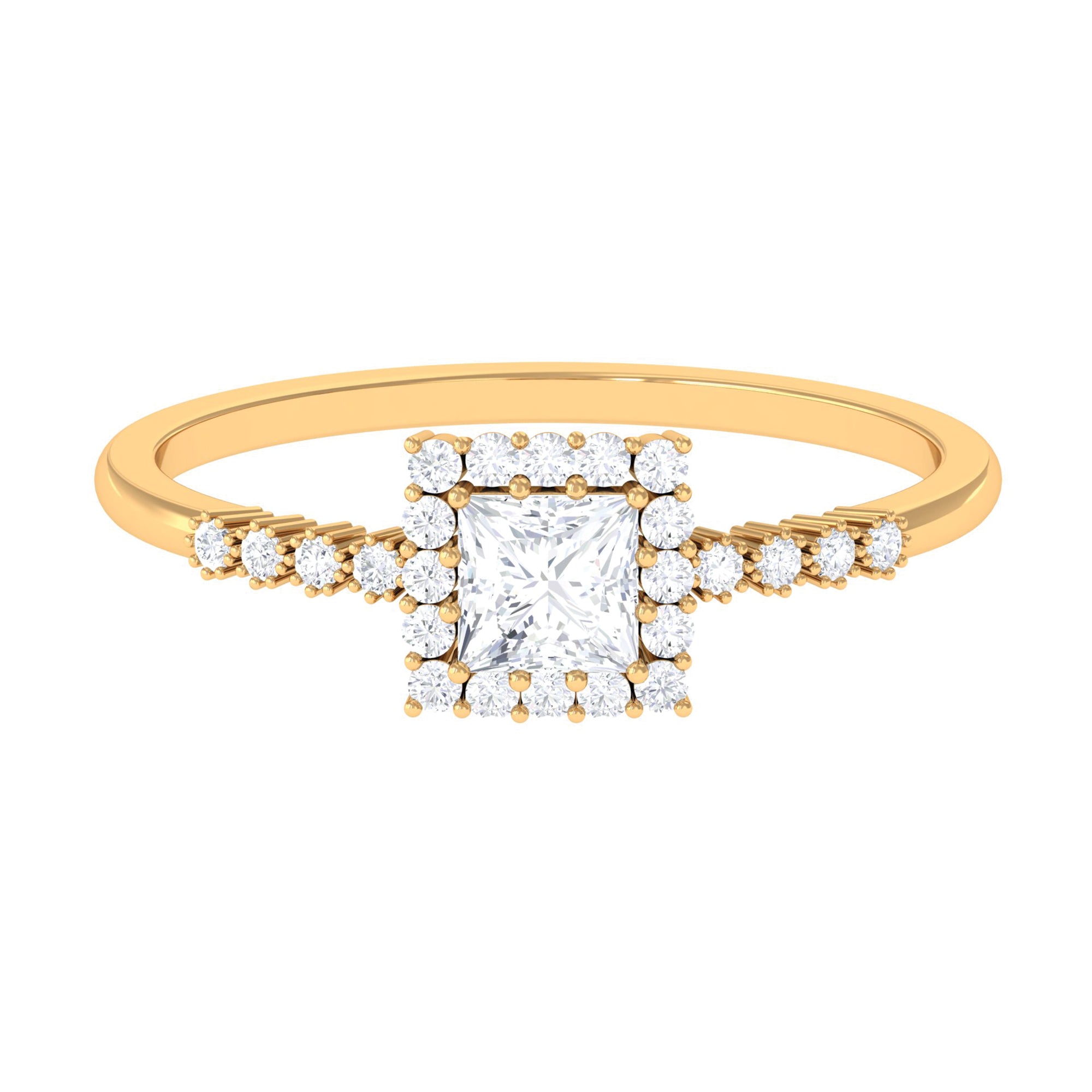 Meant to catch the eye with its vintage appeal, an Asscher Cut Moissanite is more or less square but with cut corners that make it appear octagonal. If we talk more precisely, a Moissanite Asscher Cut Engagement Ring features a flat table, a high crown, and 72 step-like facets that exude an eye-striking ‘hall of mirrors' effect.