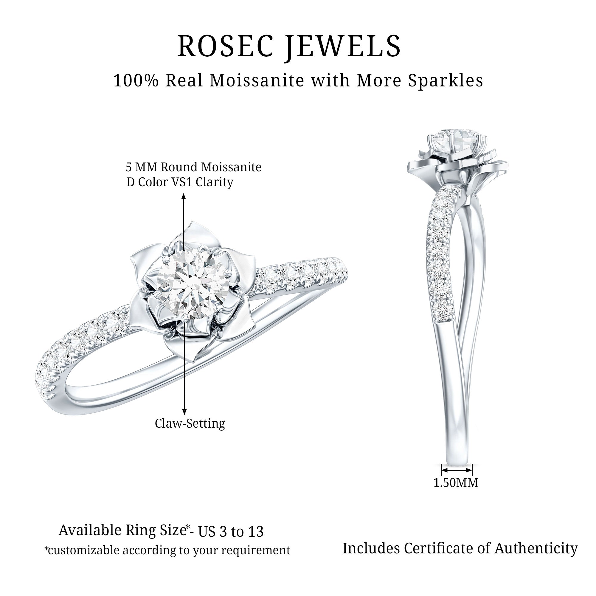 Prized as the boldest, most trendy, and flamboyant Moissanite Engagement Ring for Women, this Cocktail Style puts the spotlight on an enormous centerpiece of Moissanite set in an elaborate design. To add to its extravagant appeal, the Center Stone is often complemented with Moissanite in eye-striking patterns (as side-stones, Halo, or visually appealing clusters). While you’re most likely to come across flashy Moissanite Flower Engagement Rings in this category, those fashioned with nature-inspired detailing as well as vintage engravings also appear quite statement-making.