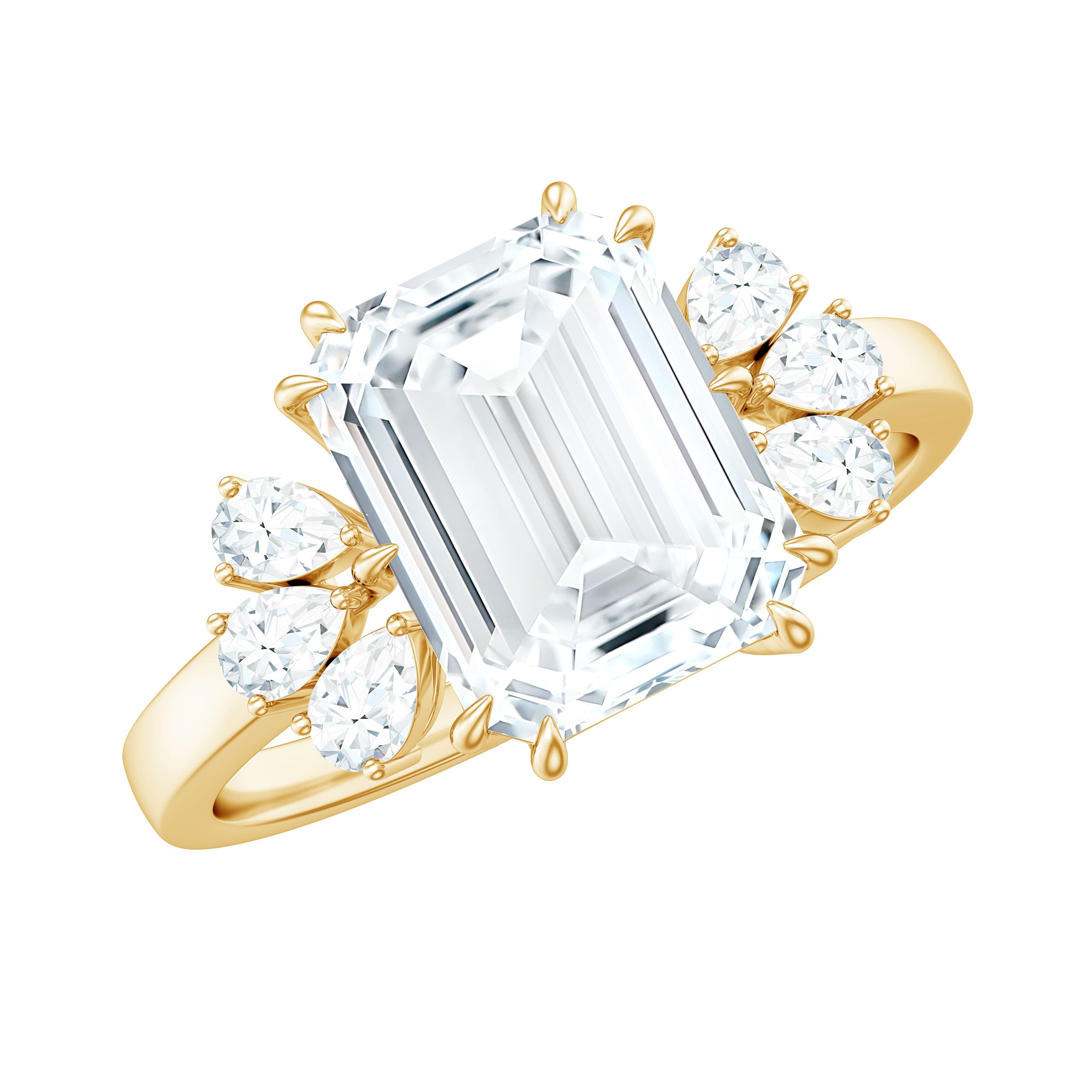 A Moissanite Solitaire Engagement Ring is defined by a Sparkling Centerpiece of Moissanite that is meant to stand out all solo (with an enormous size of 6 MM or more). While it may be the most classic and timeless token of love for any bride-to-be, it also speaks to many senses of style. A Round or Oval Moissanite Engagement Ring resonates with an understated and conventional aesthetic, while one fashioned with a Pear, Marquise, or Princess Cut Moissanite is more on the fancier side of the spectrum. On the other hand, if you wish for a grand yet old-school emblem of love, there is nothing better than an Asscher, Emerald, or Cushion Cut Moissanite.