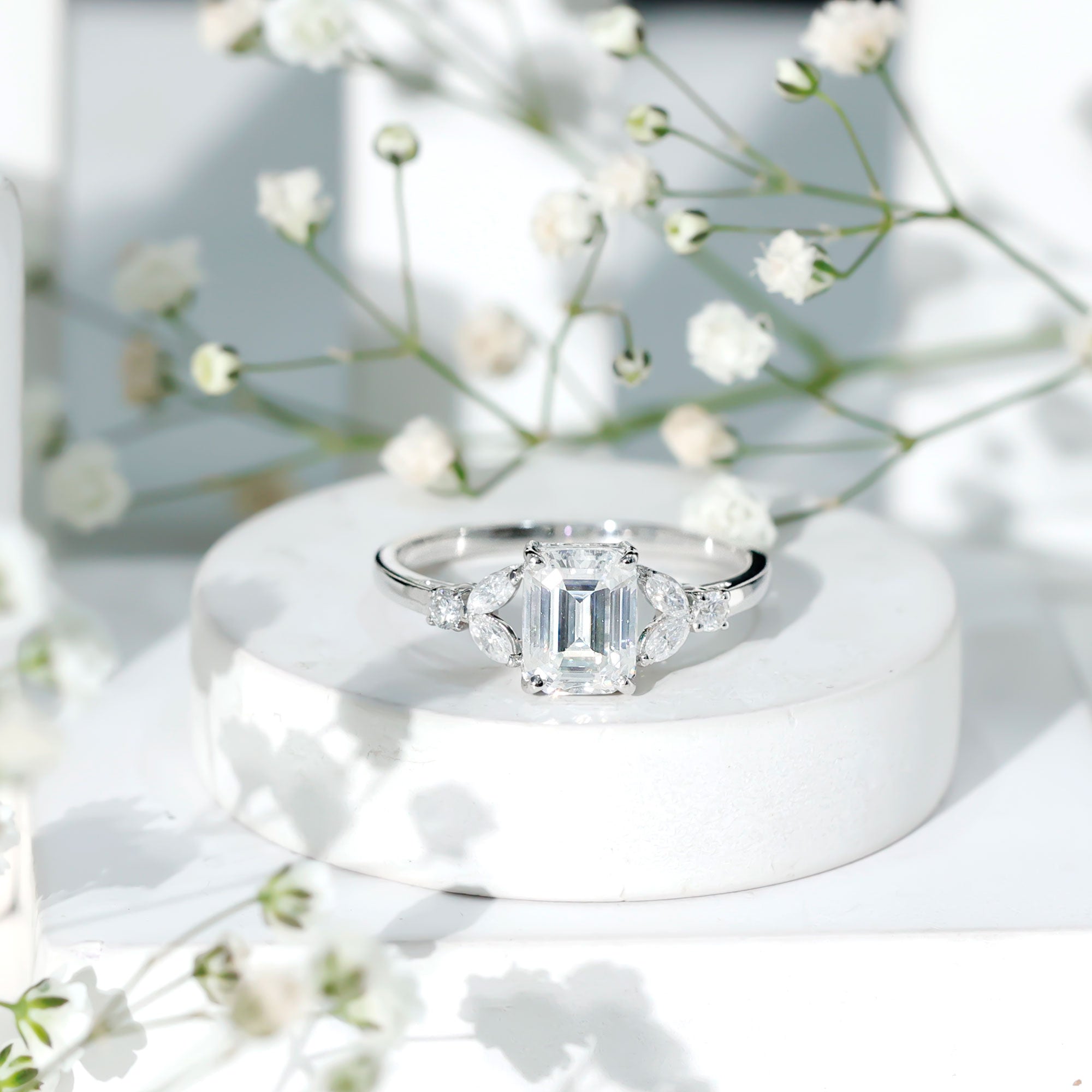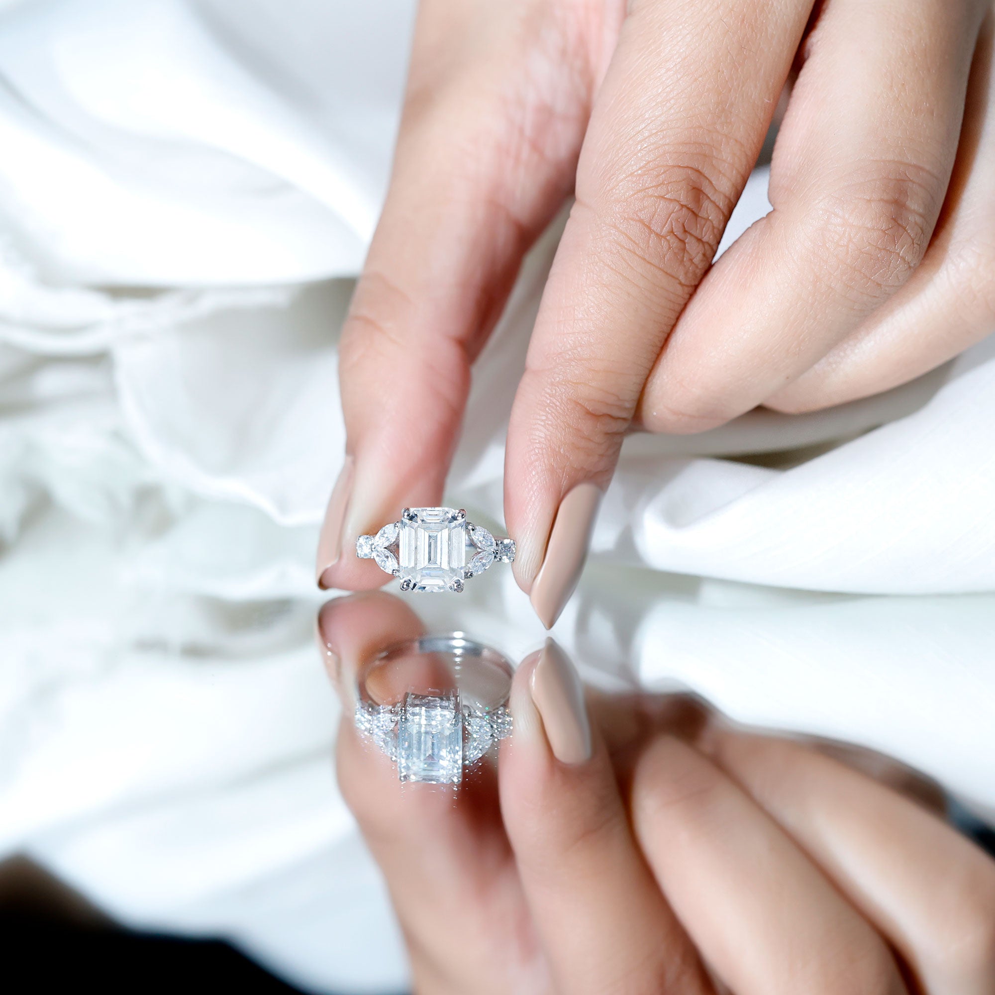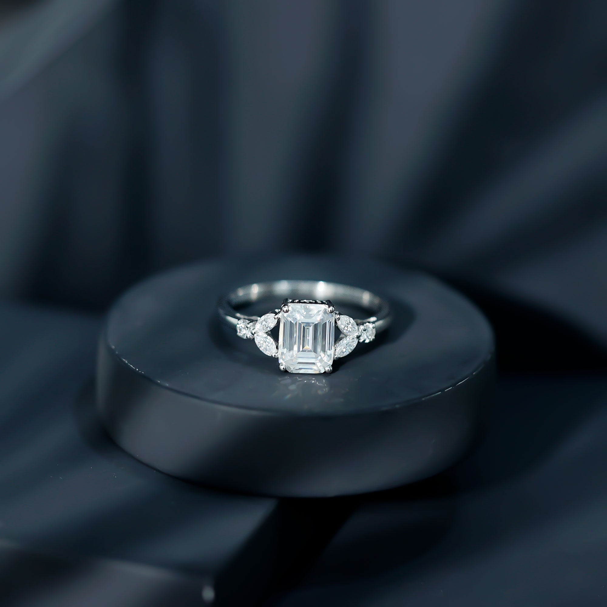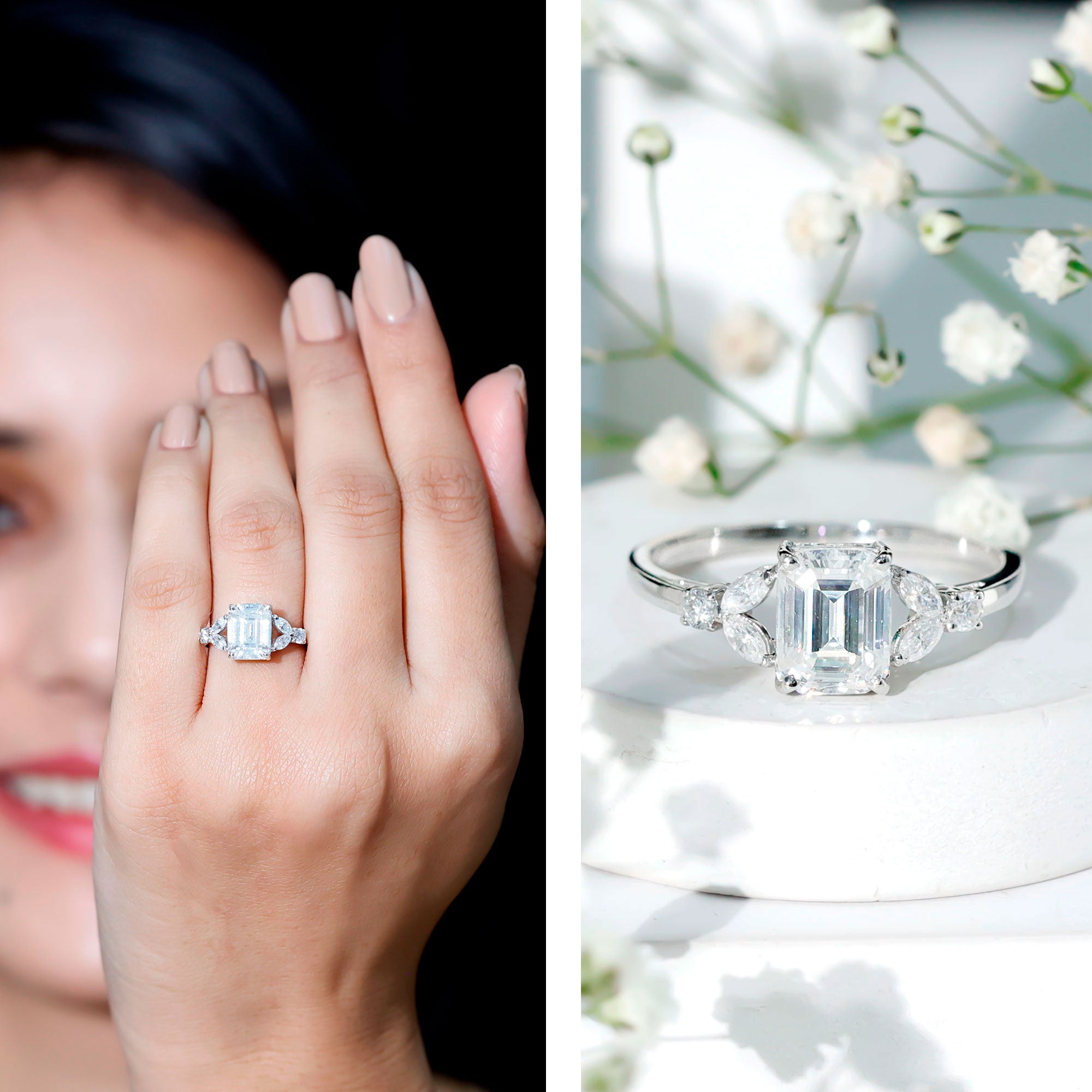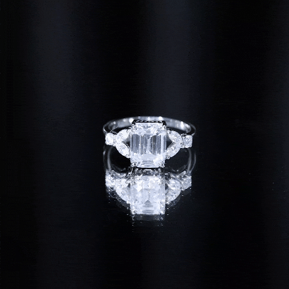 In the simplest terms, an Emerald Cut is characterized by a rectangular shape that stands out with cut-off beveled corners, thus exuding a vintage yet sophisticated aesthetic. On a more technical note, Moissanite Emerald Cut Engagement Rings are home to 57 step-like horizontal facets, a flat table, and long lines that (similar to the Asscher Cut) give off a hall of mirrors effect.