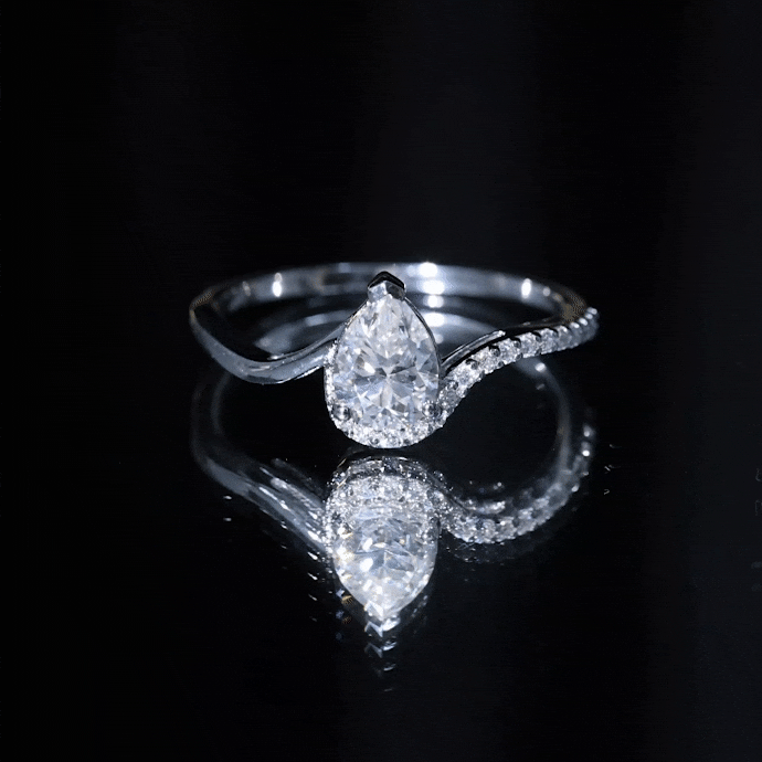 Resembling drops of water or tears in shape, a Pear Cut Moissanite boasts a pointy top and a curved bottom. Not only does a Pear Shaped Moissanite Engagement Ring drive great appeal for its feminine aesthetic, but it also offers a distinctive sparkle (by being home to 56 facets that imitate the arrangement found in a Round Cut)