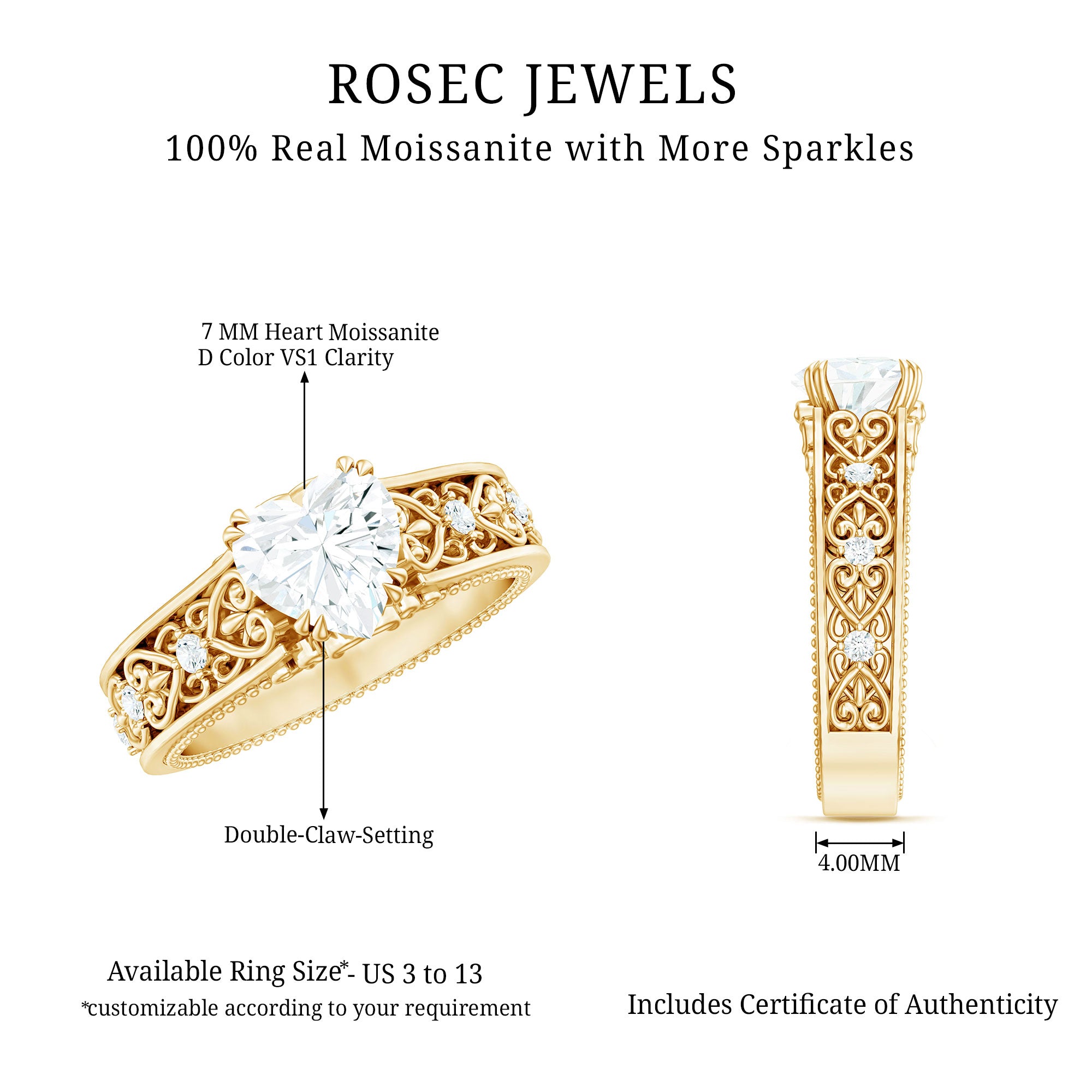 Meant to speak to old-school couples, Vintage Moissanite Engagement Rings feature ornate designs that are symbolic of the Art Deco, Edwardian, and Victorian Eras. Under this selection, you’re most likely to come across antique designs that incorporate milgrain and filigree detailing, ancient floral motifs, and abstract geometric patterns that complement the beauty of Moissanite. Besides that, be it a Floral or Art Deco Moissanite Engagement Ring, it speaks to the wearer by lending an heirloom feel to your emblem of love.