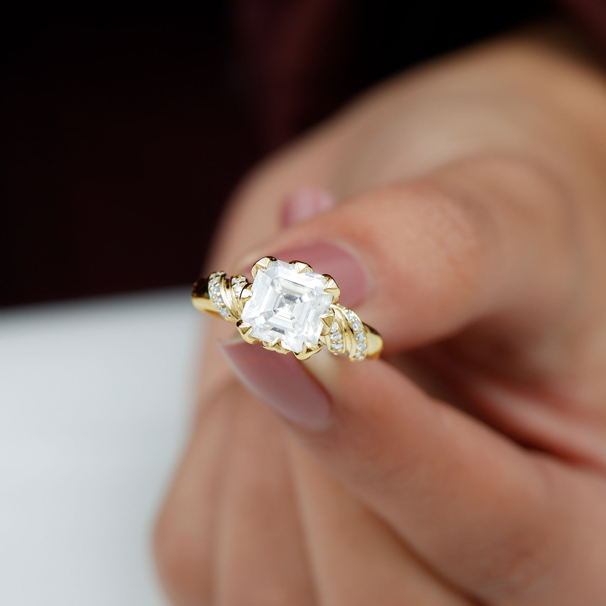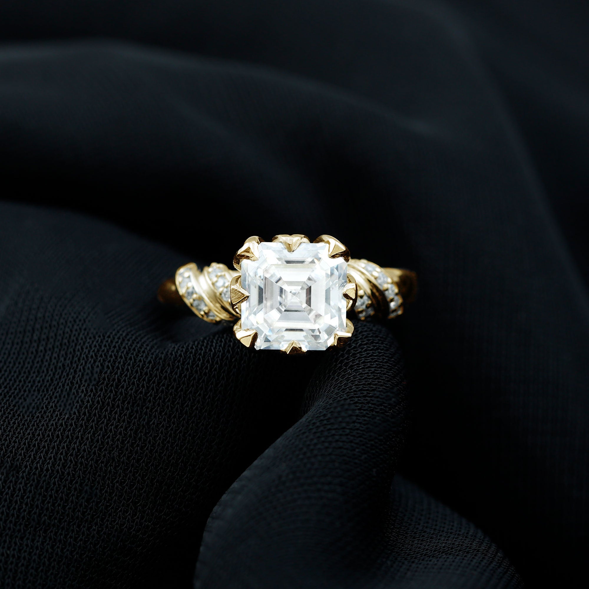 Meant to catch the eye with its vintage appeal, an Asscher Cut Moissanite is more or less square but with cut corners that make it appear octagonal. If we talk more precisely, a Moissanite Asscher Cut Engagement Ring features a flat table, a high crown, and 72 step-like facets that exude an eye-striking ‘hall of mirrors' effect.