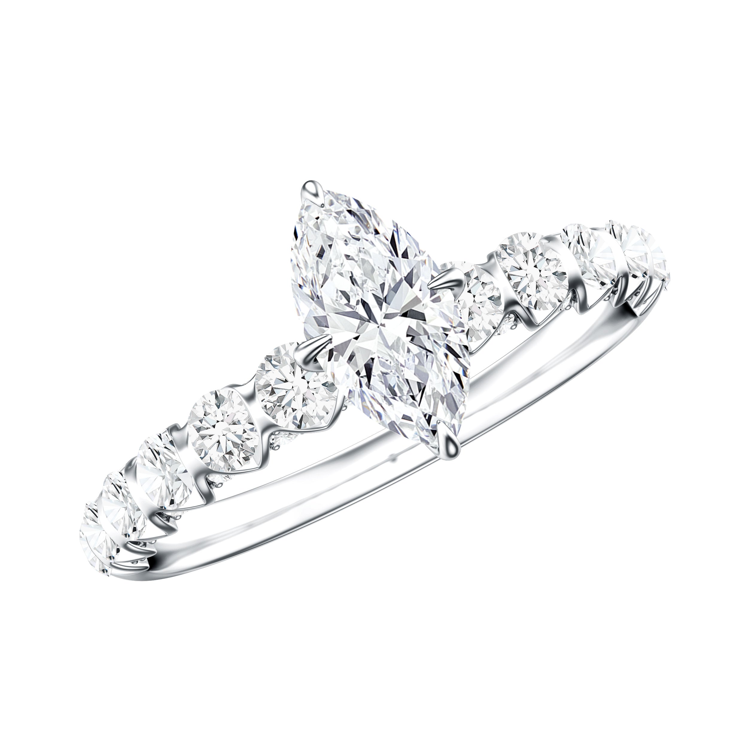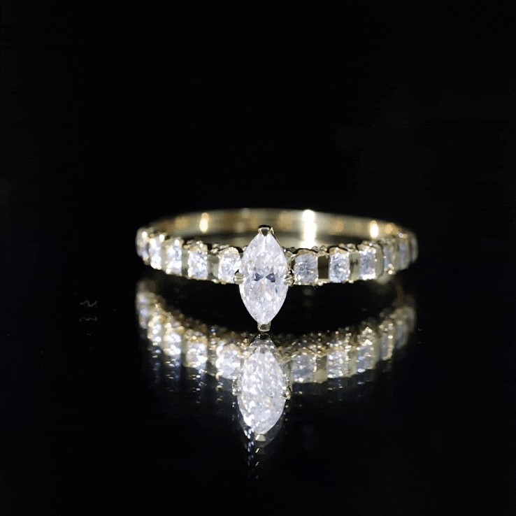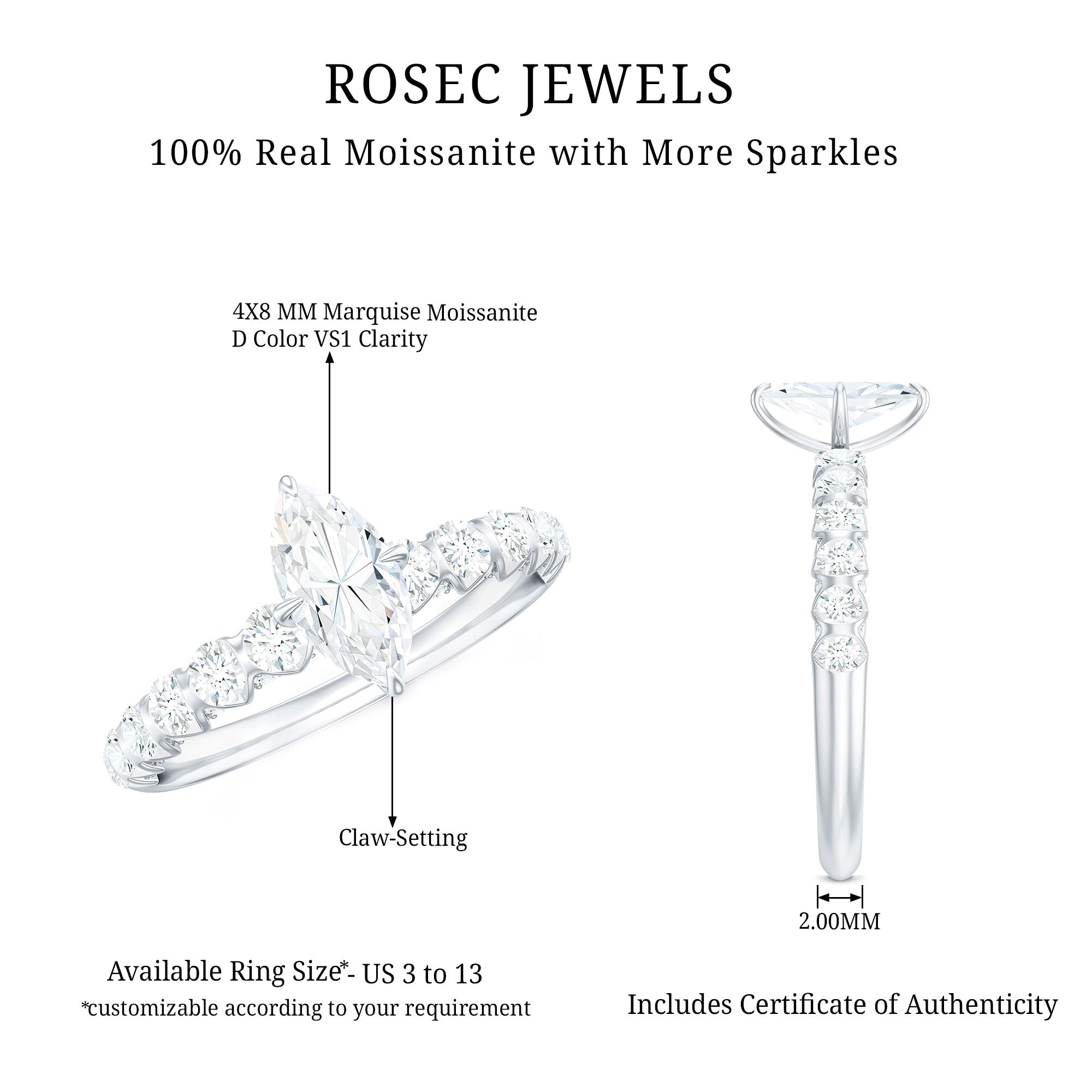 Hailed as a standout for its unique and fancy aesthetic, a Marquise Moissanite Engagement Ring features pointy ends and curved sides (making it look close to a football). Featuring 58 facets, it appeals with its unique bow-tie effect (that you’ll notice at the center of the Moissanite).